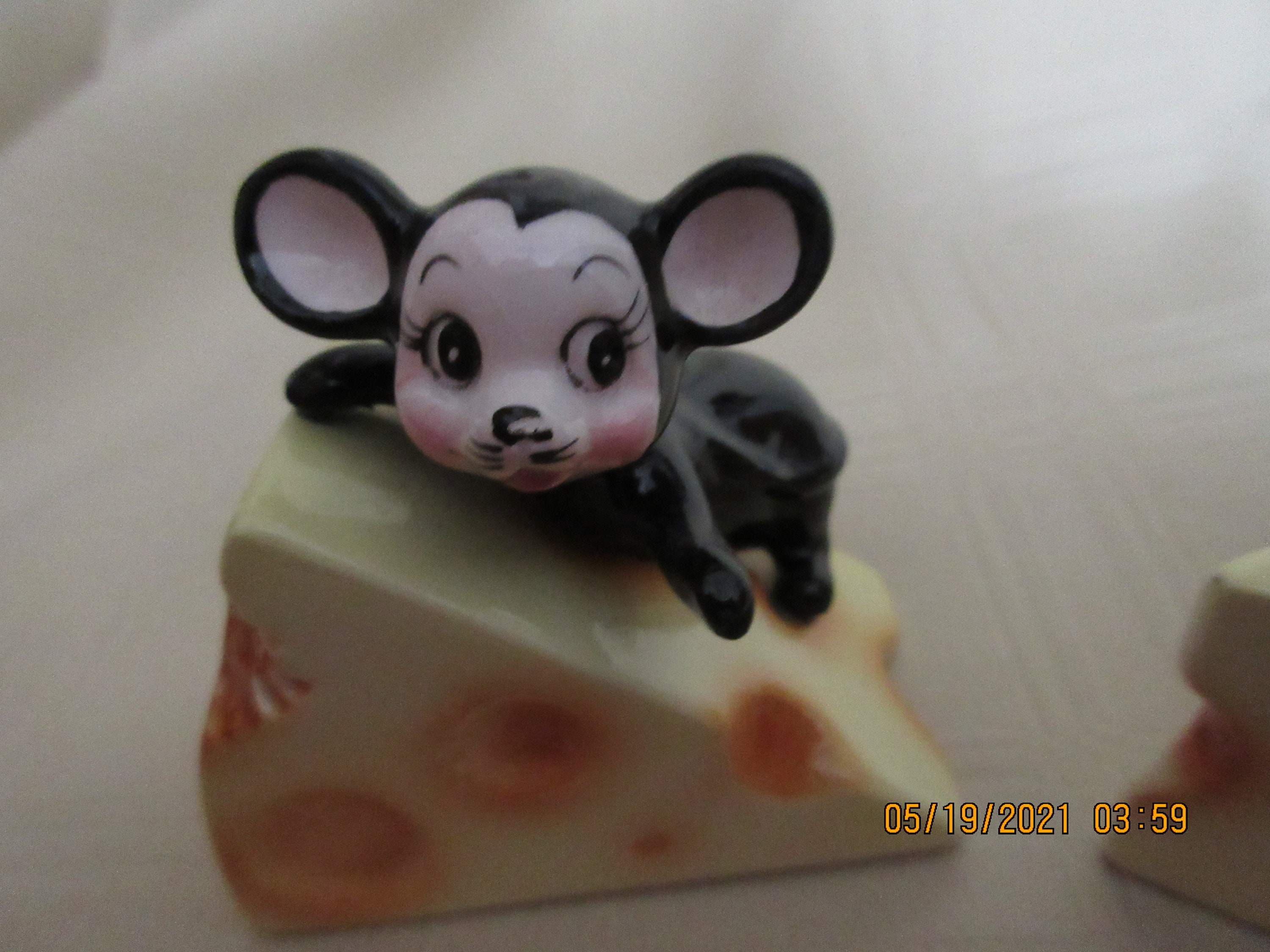 The mice are black with pink faces and ears. There eyes, nose and whiskers are black and the mouth is red. The cheese is yellow with light brown spots.