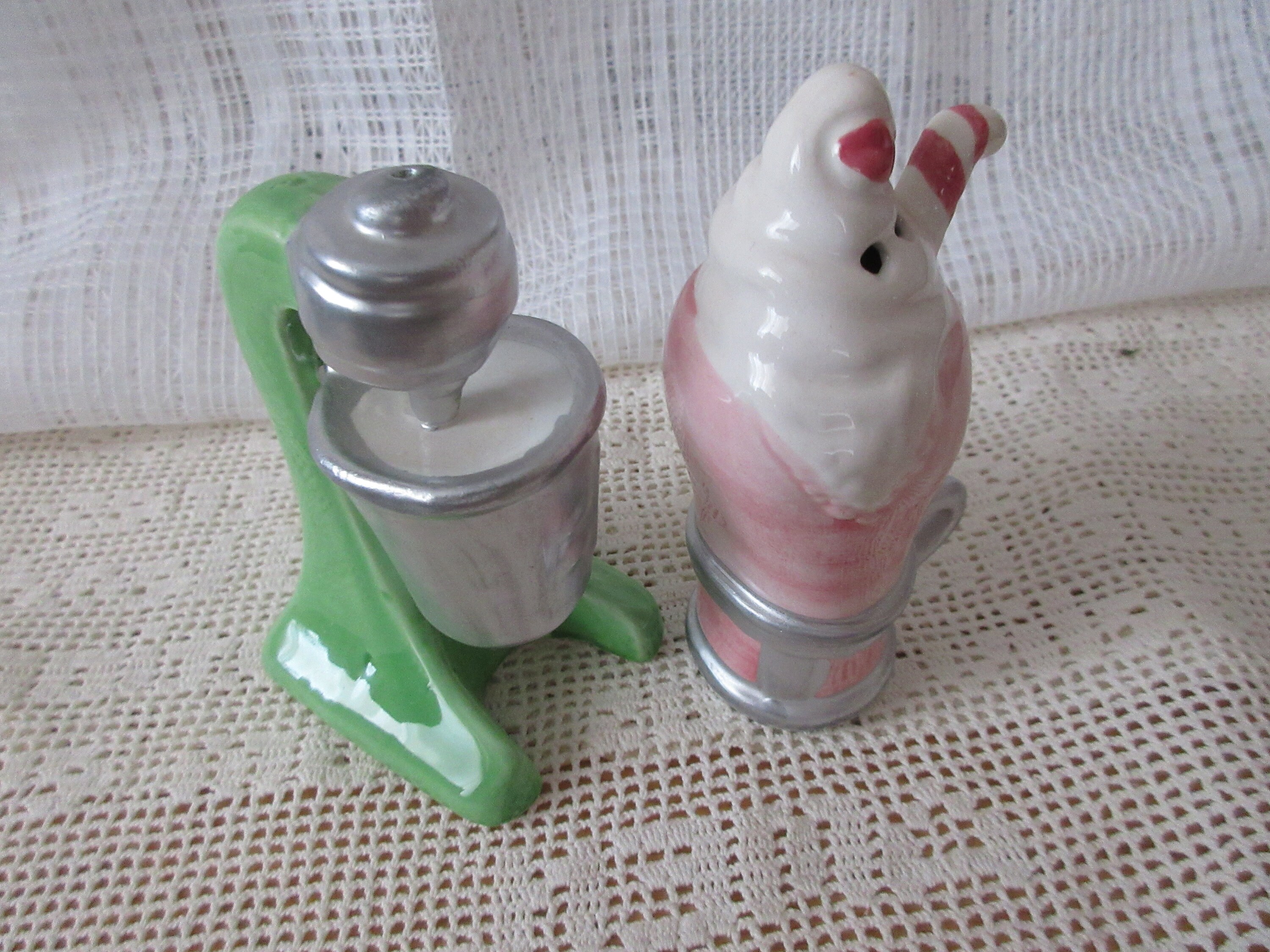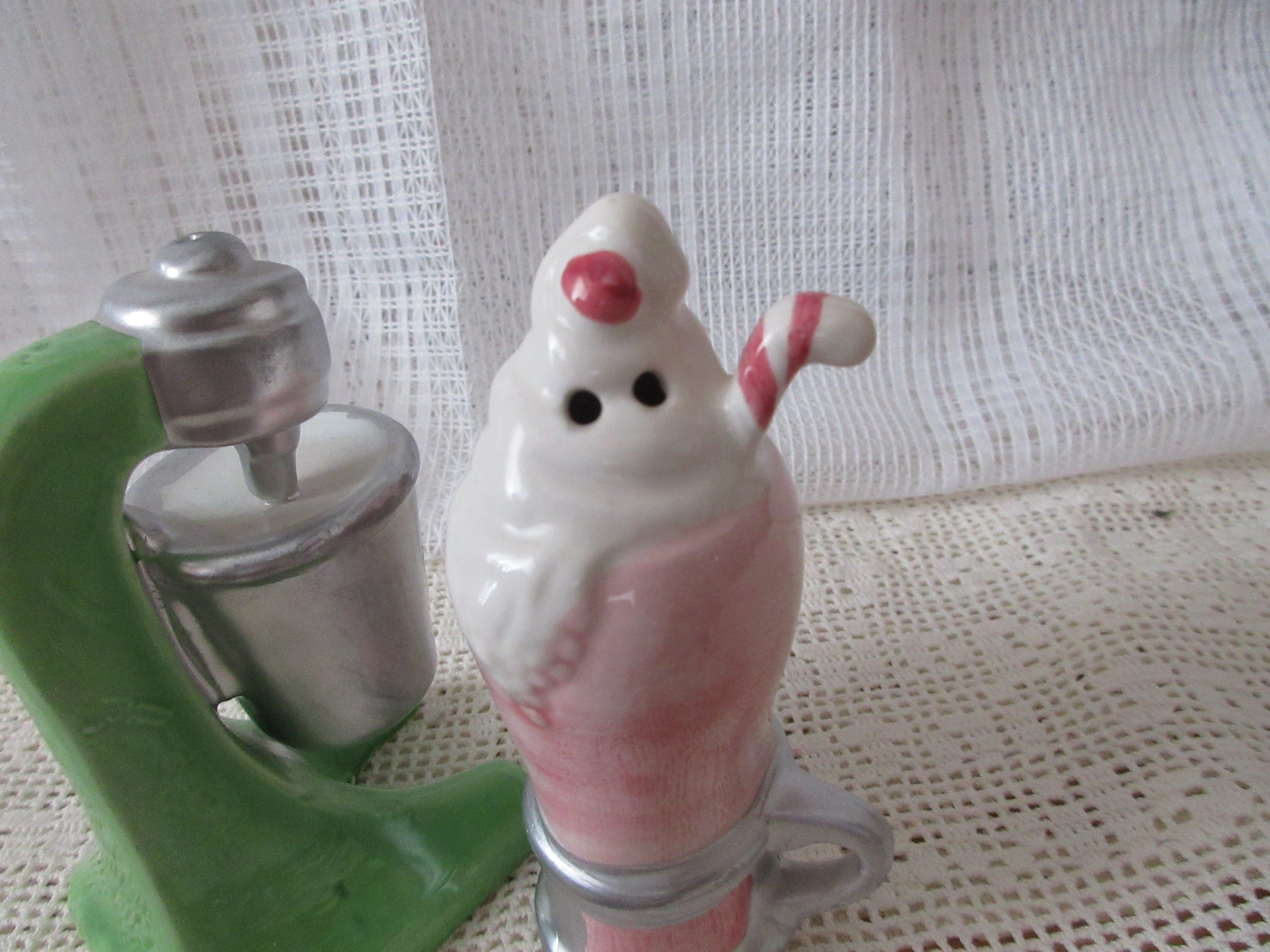 The malt is pink with white whipped topping, a red cherry and a white and red striped straw. The malt is sitting in a silver base. This shaker is 4 inches tall, has a plastic stopper and is not marked.
