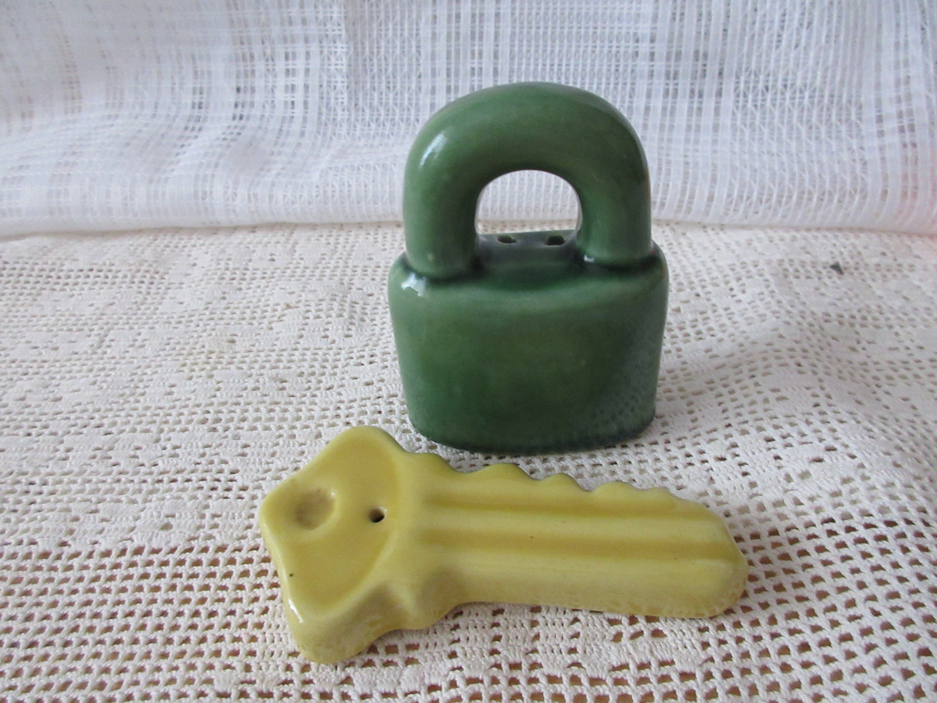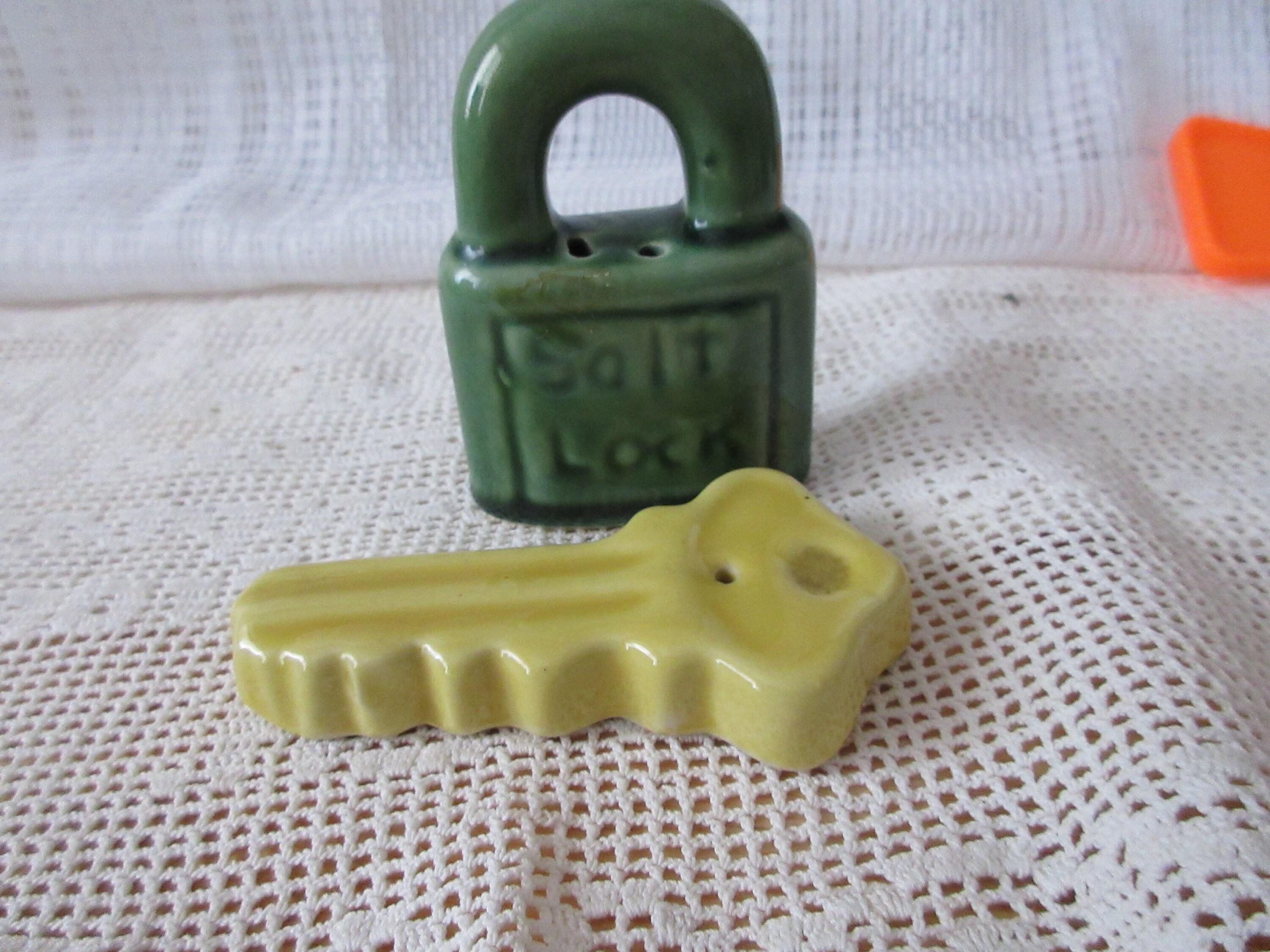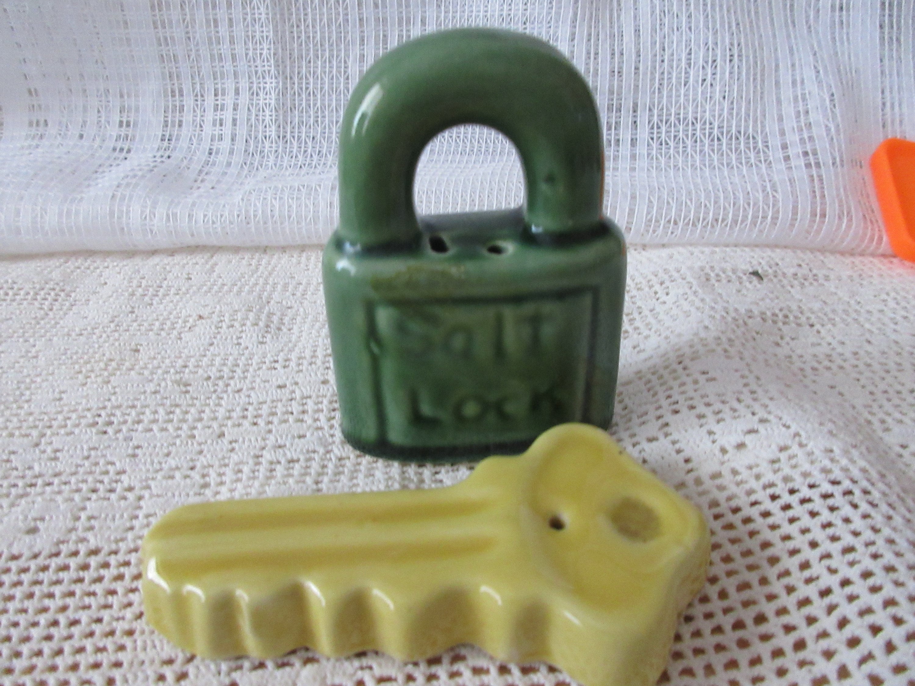 The lock is green with "Salt Lock" on the front. This shaker is 3 1/8 inches tall, has no stopper or markings.