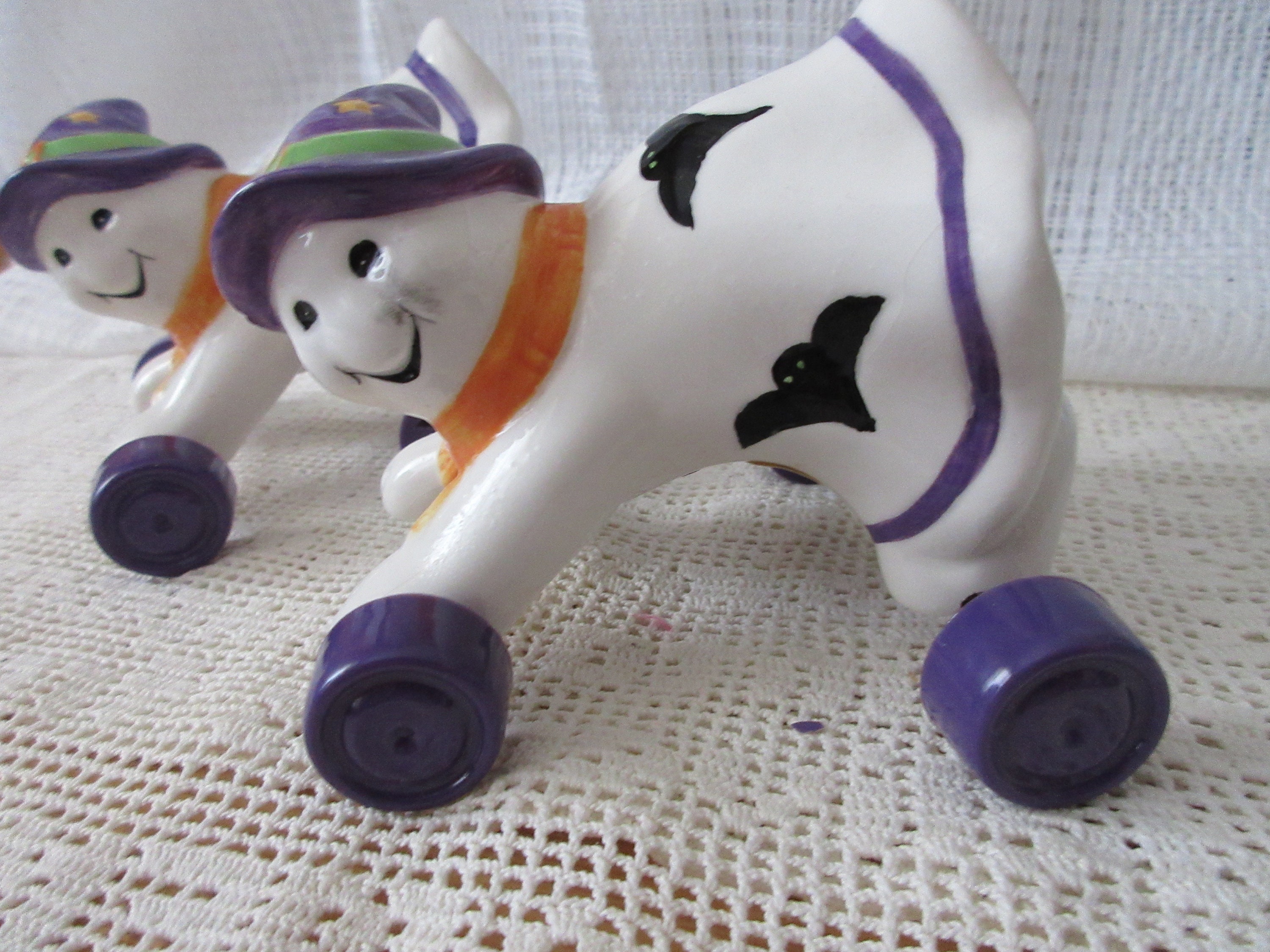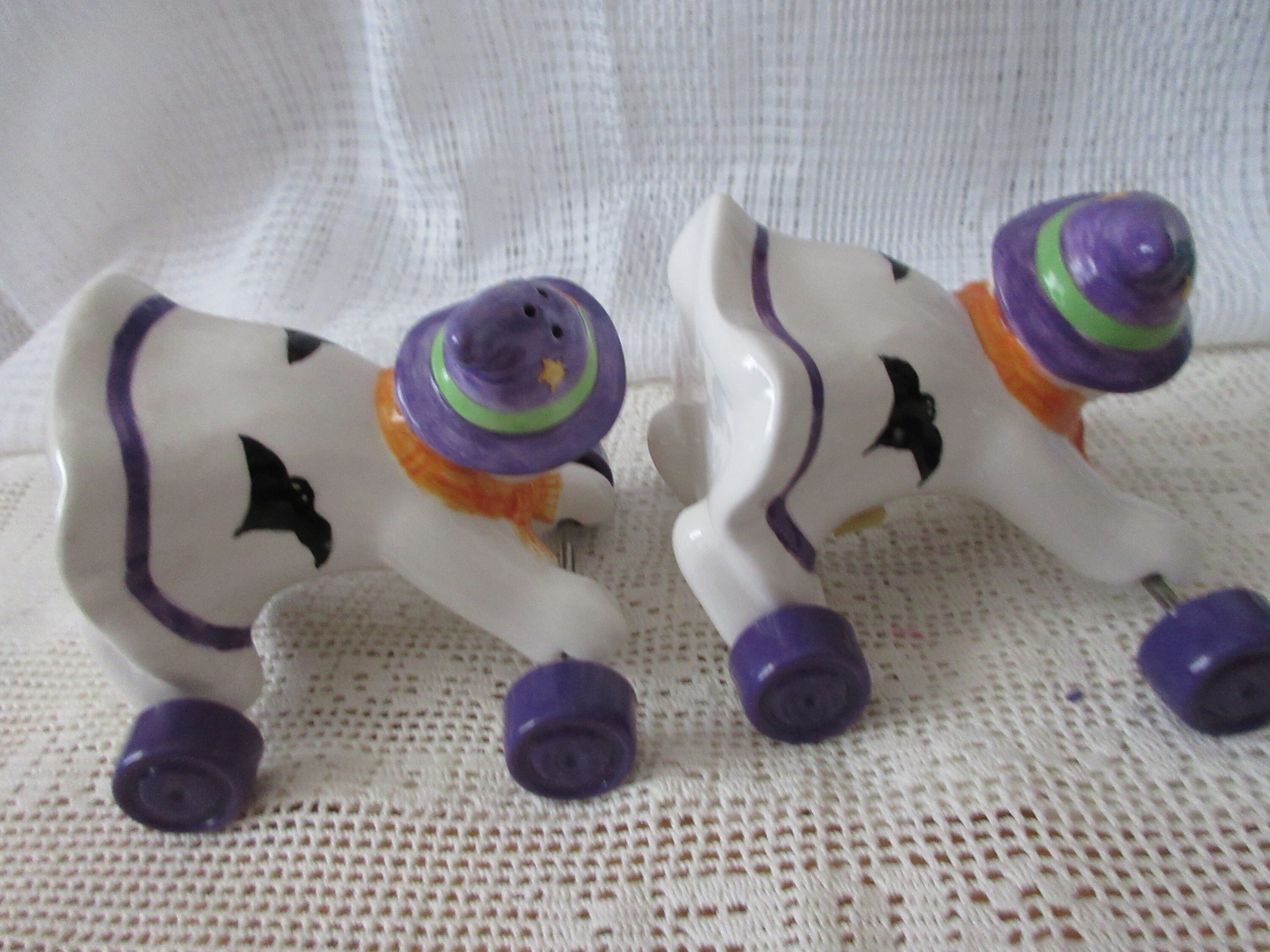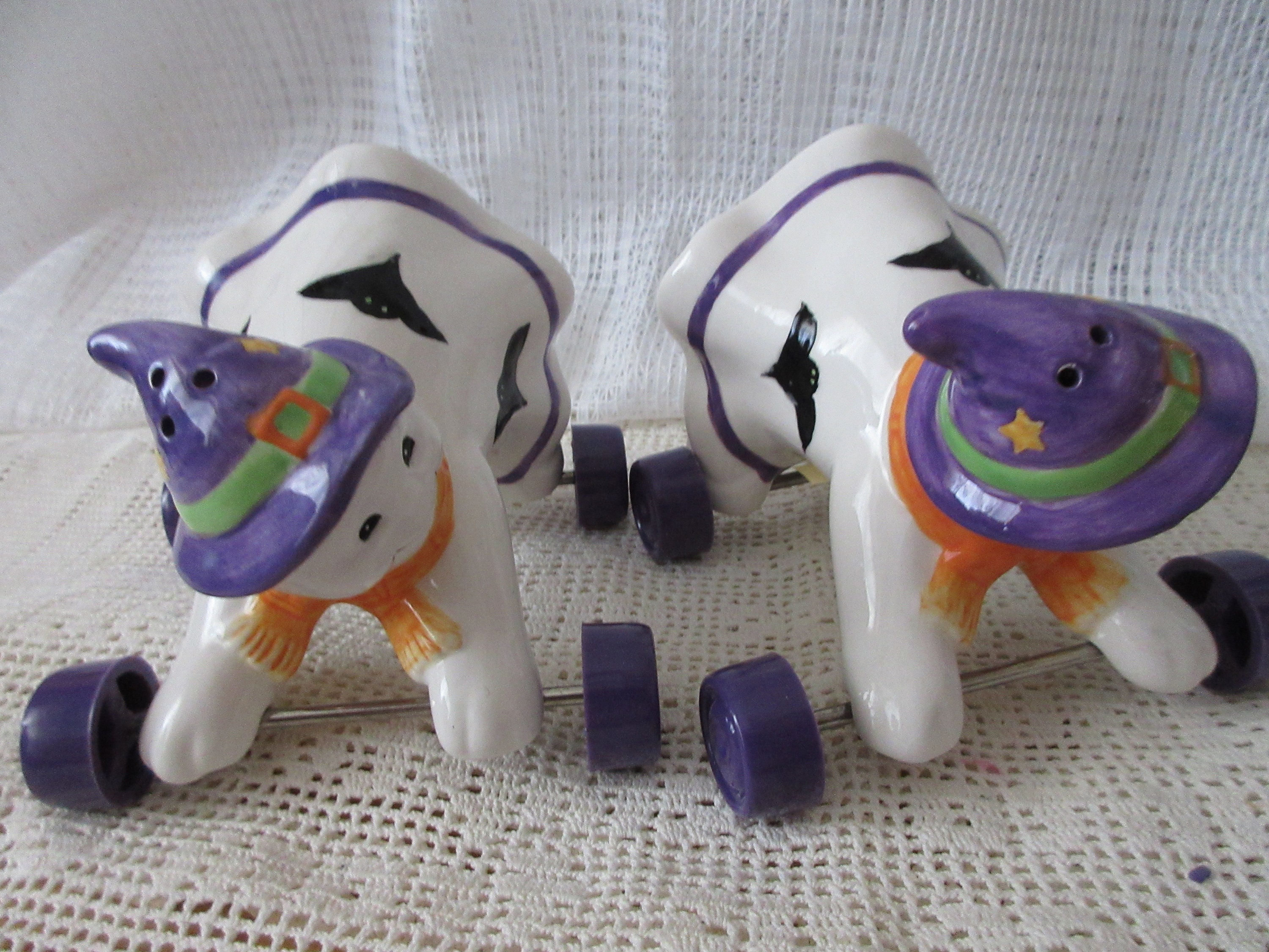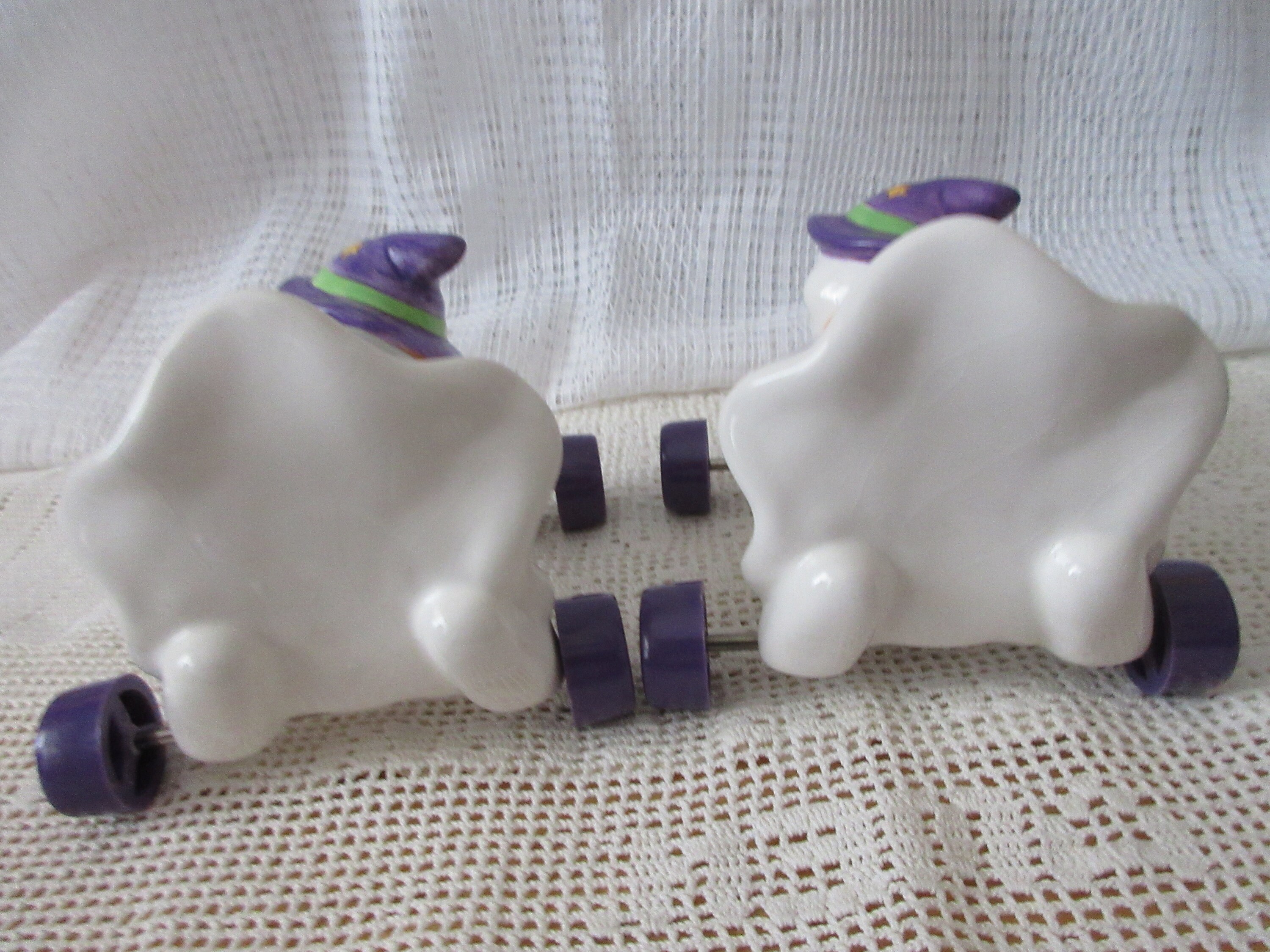 Both ghosts are white with a bat design on their clothes. They are wearing a purple hat with a gold star, green band and gold buckle. They have an orange scarf around their neck. Both are coating along on a set of 4 wheels which do roll. They are very happy with big smiles on their faces. These salt and pepper shakers are 3 1/4 inches tall to the highest part of the shaker, and 3 1/2 inches long. They both have plastic stoppers and a gold seal "Made in China".