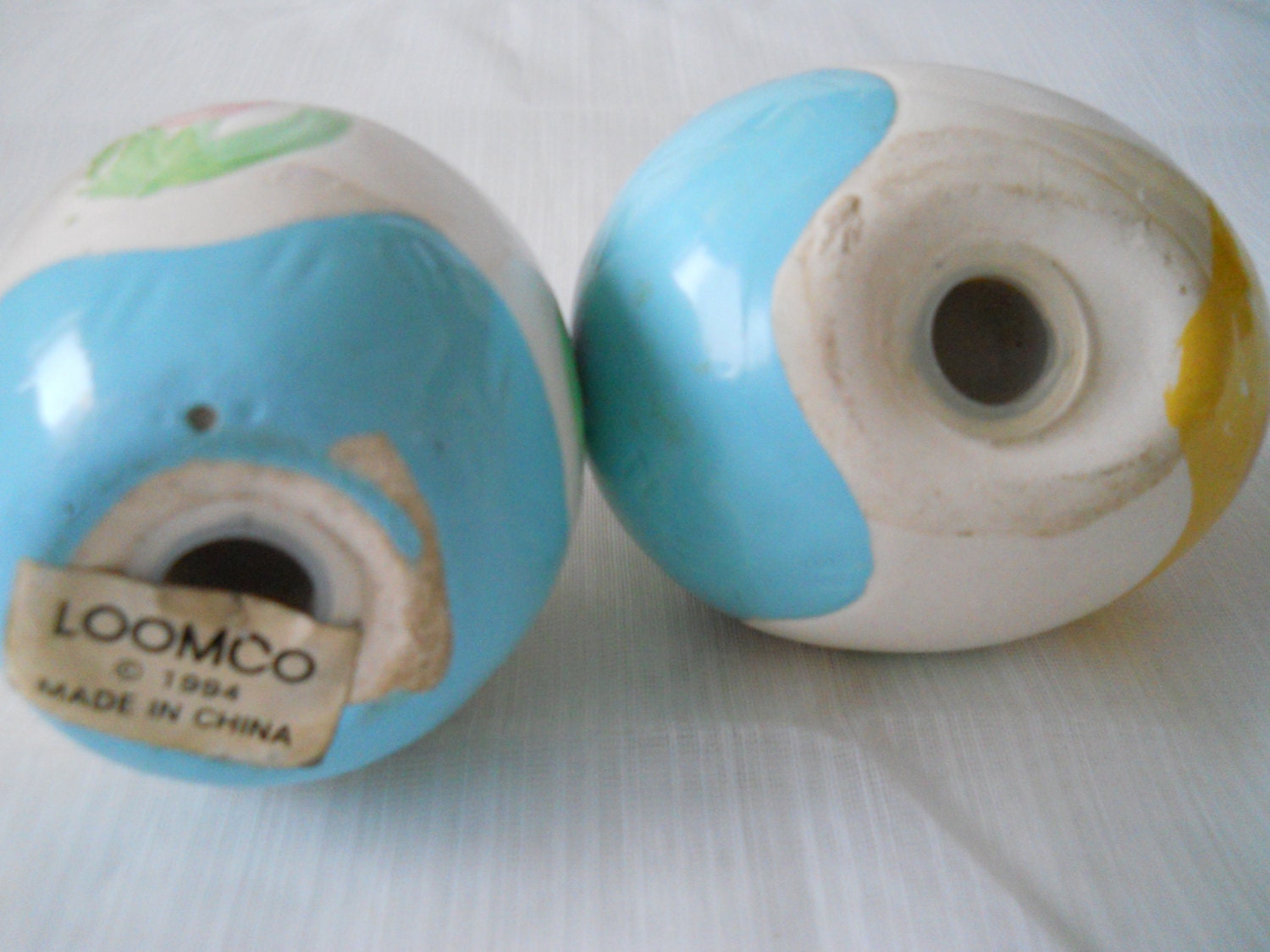 The shakers are eggs painted in blues, pinks and green. One egg is standing (3 inches tall) and the other is on its side with a bunny sitting on top. The bunny is white and there is a chip on his left ear (see photos). This shaker is 3 1/2 inches tall and 3 inches long. There is some chipping of pain on this shaker.