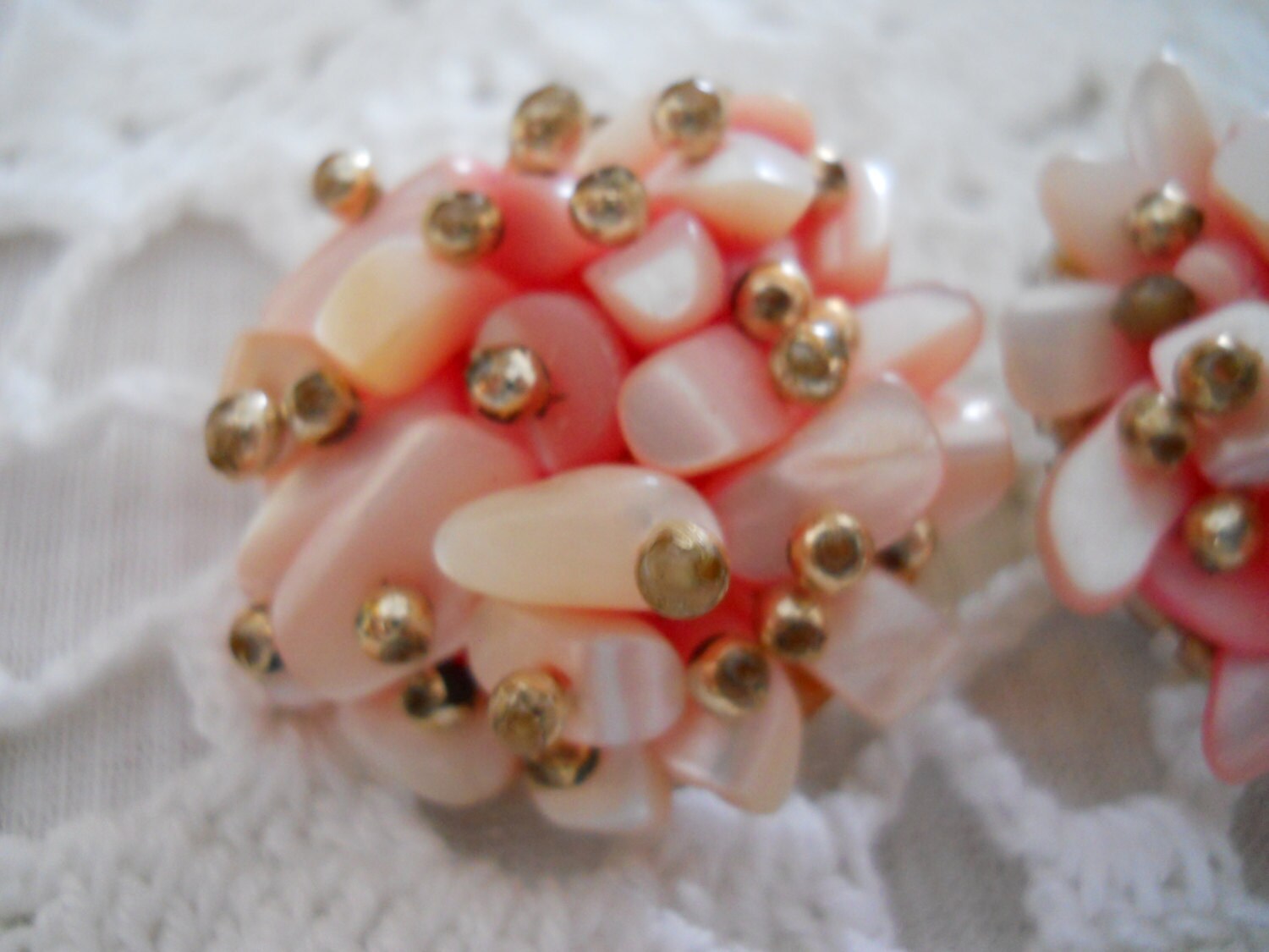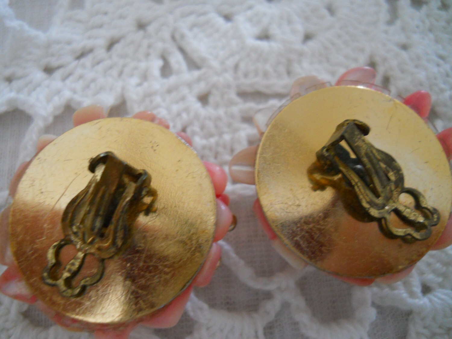 These clip on earrings are pink stones and gold beads. The stones are made of plastic and the set is in good condition. They were purchased at a local estate.