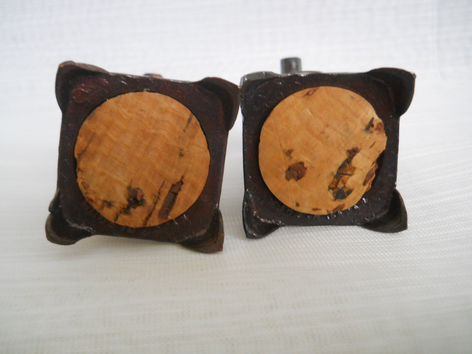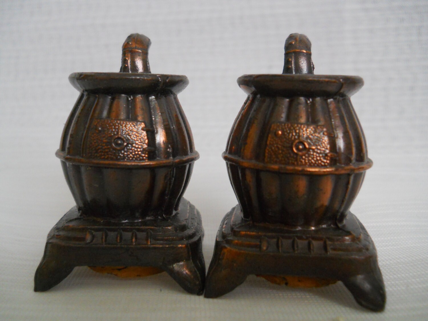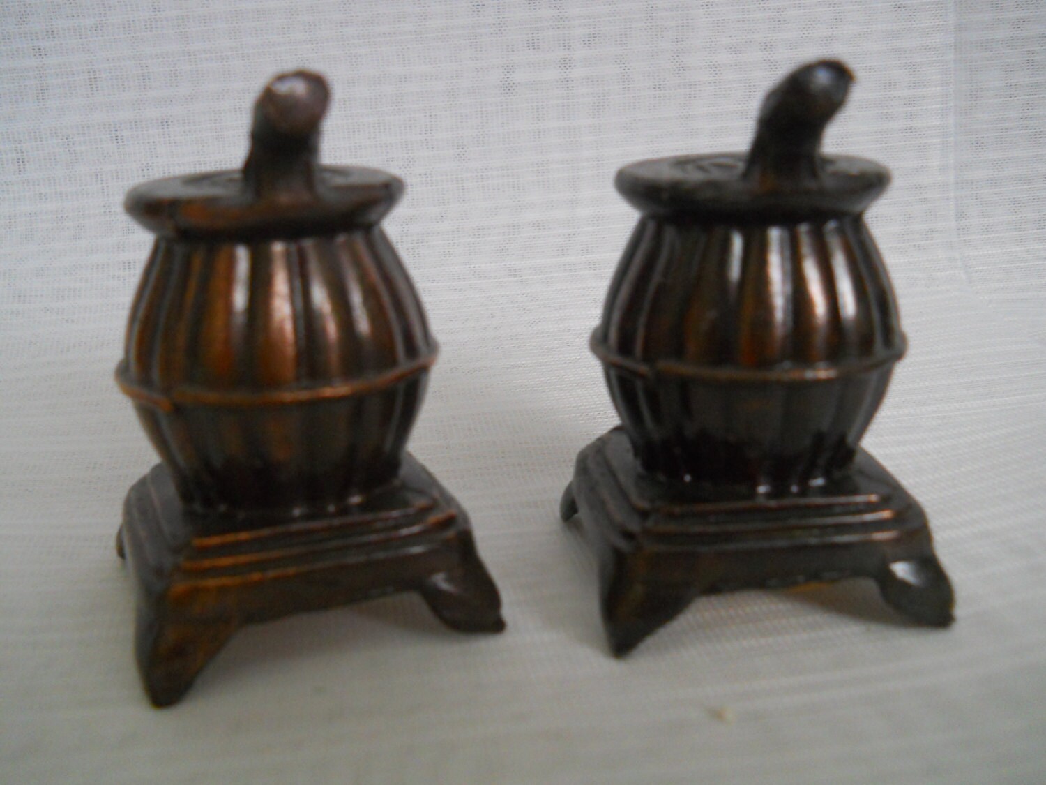 Both stoves are bronze in color and are 2 1/4 inches tall. Both have large cork stoppers and marked "Made in Japan" on the bottom.