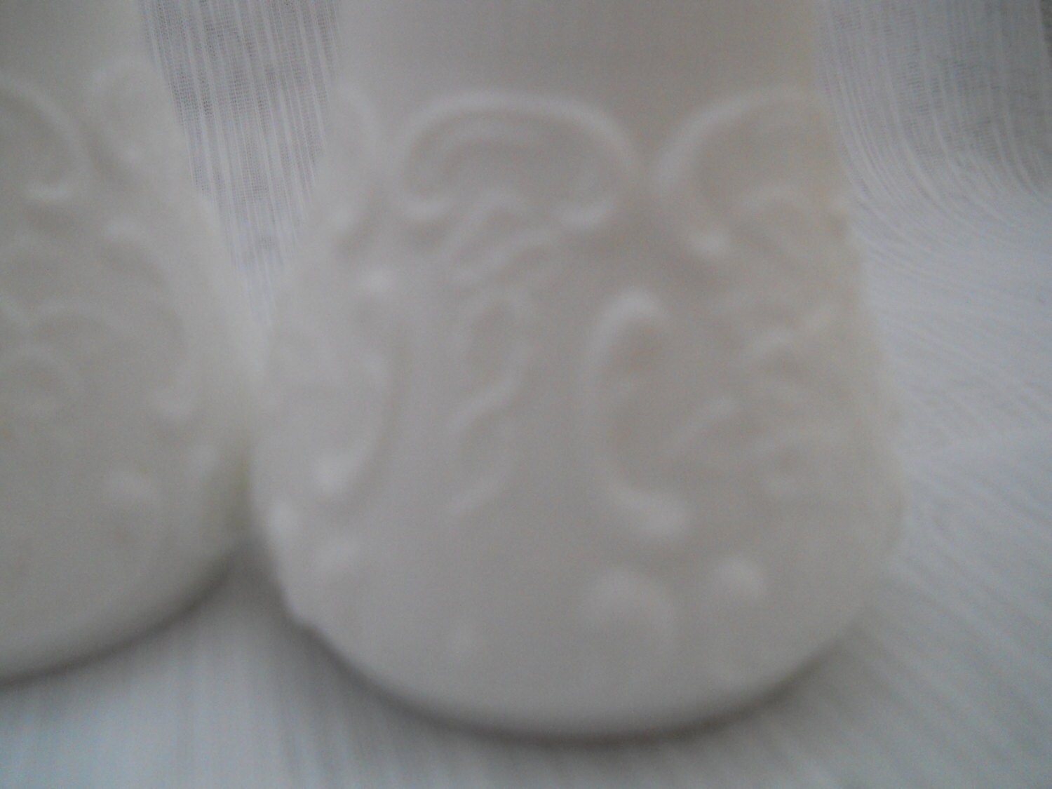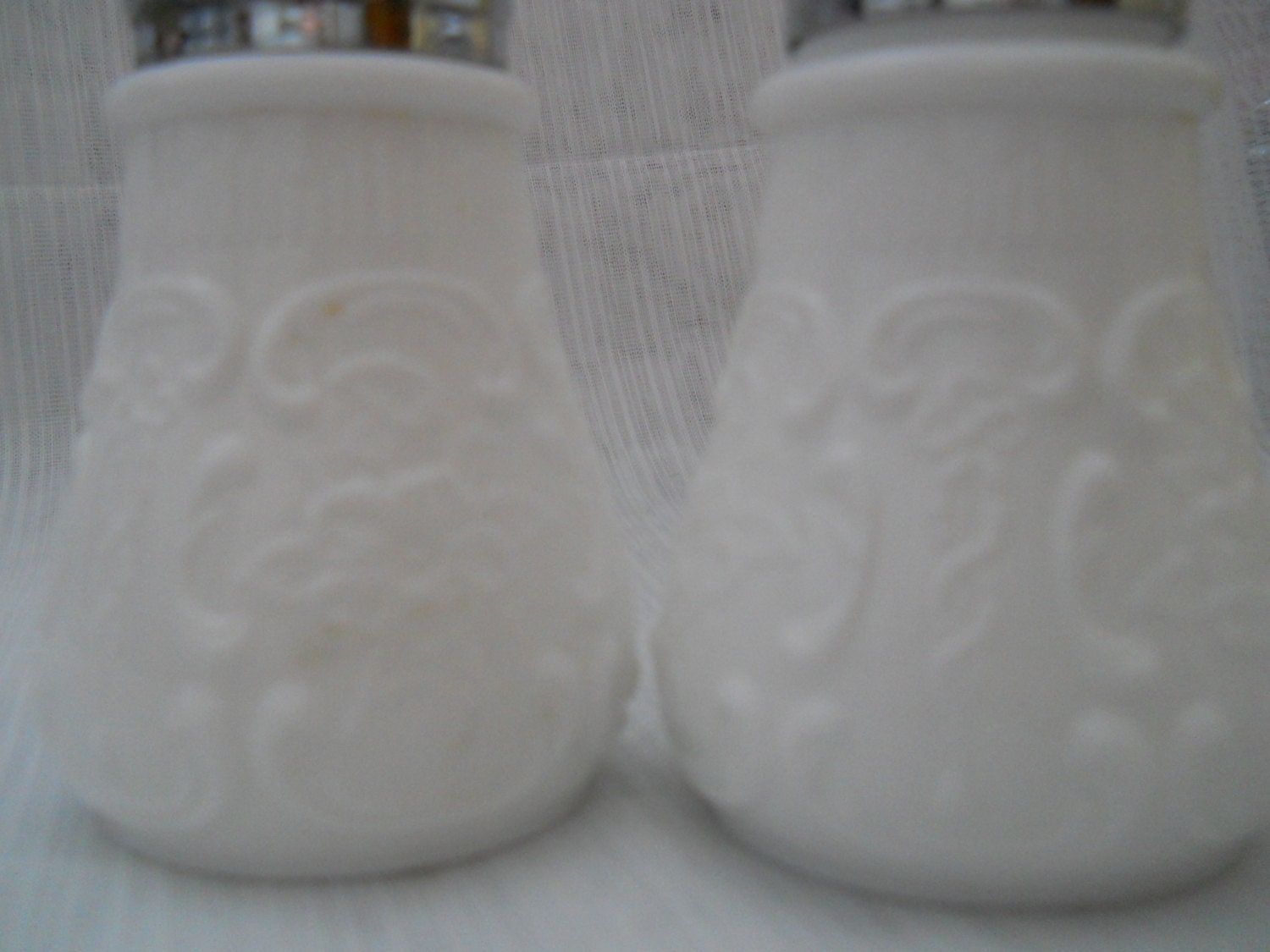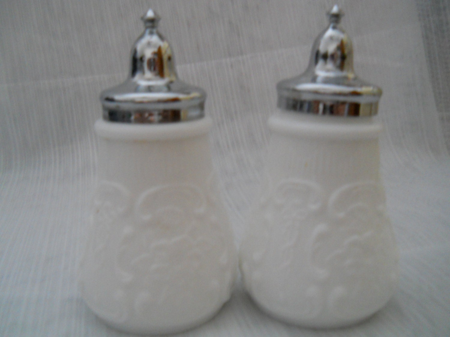 The set has shiny silver lids for filling and at the very top is a point. The white milk glass has a floral design. There are no chips or cracks. Each shaker is 4 inches tall and has no markings.