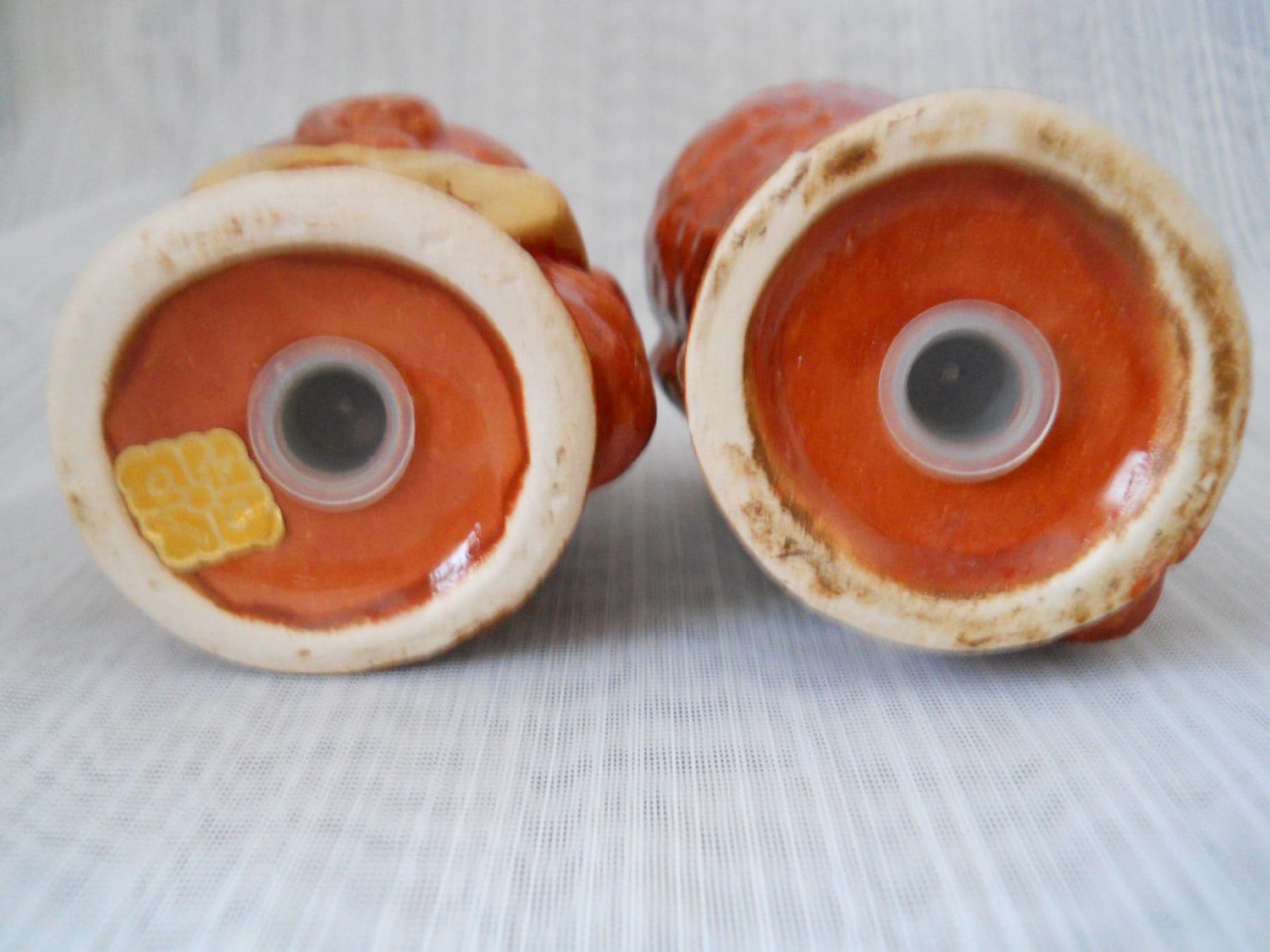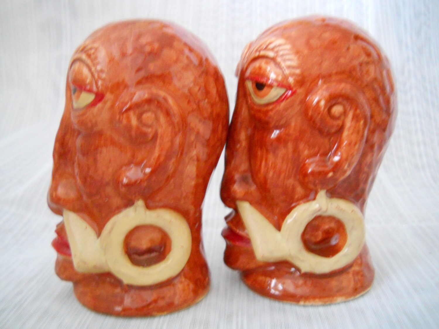 The salt and pepper shakers are brown with large earrings and bones in the noses. Their eyes are droopy and they have long large noses and red lips. Each shaker is 3 1/2 inches tall, have plastic stoppers and gold stickers "OMC Japan".