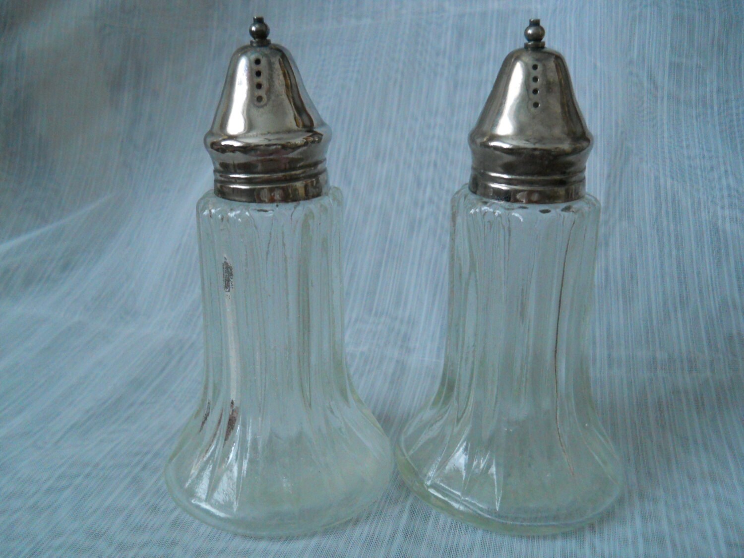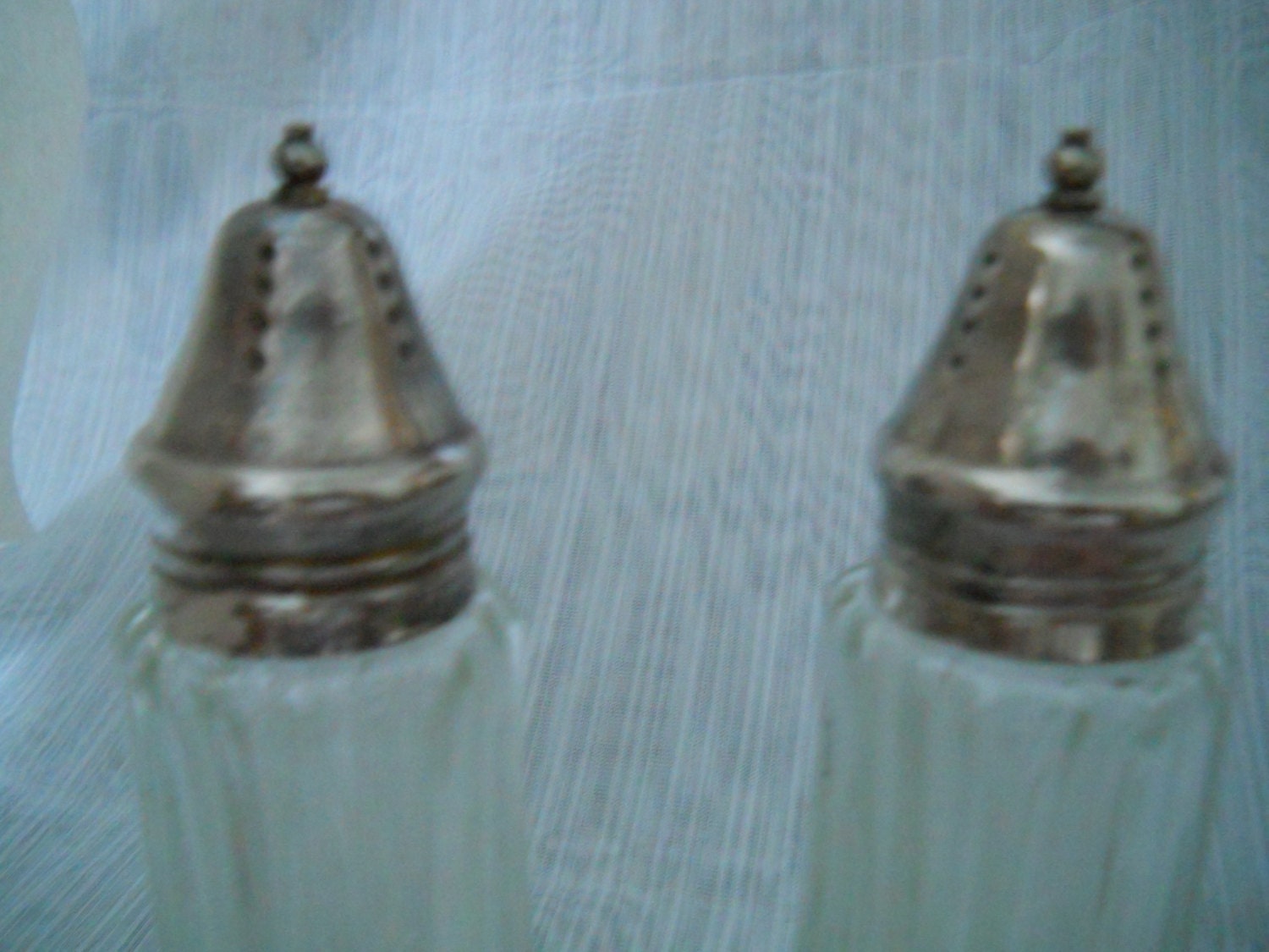 1914 - These shakers were purchased at a collector's estate in Florida. They are used and in good condition with some tarnishing on the silver plated caps.