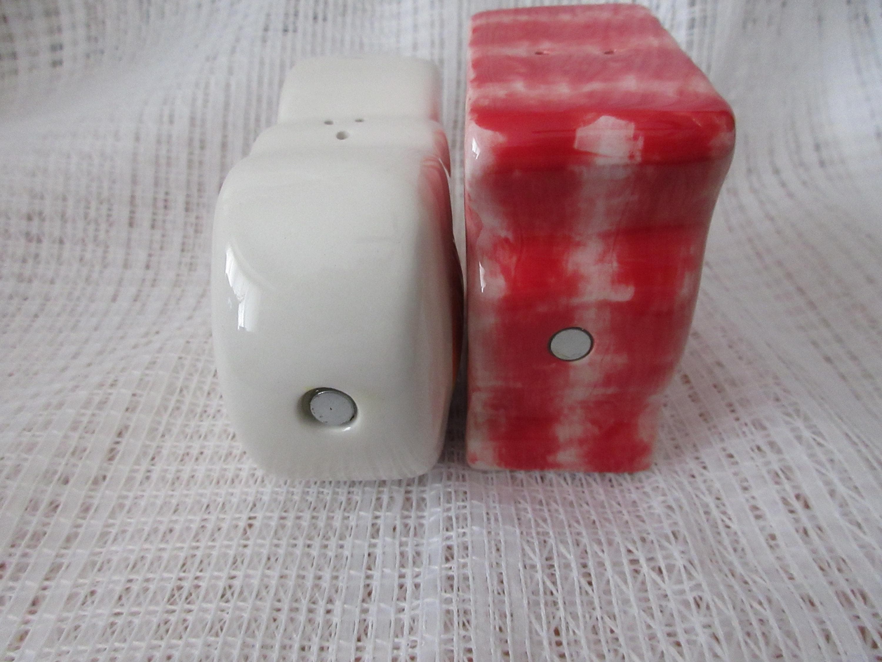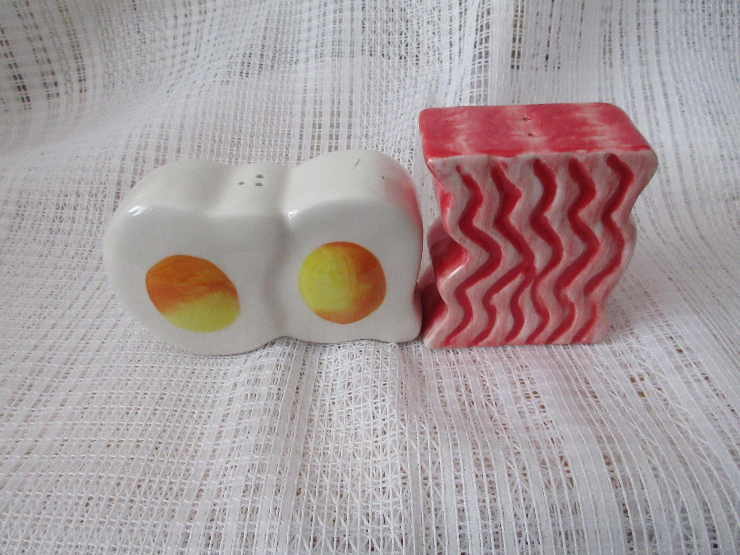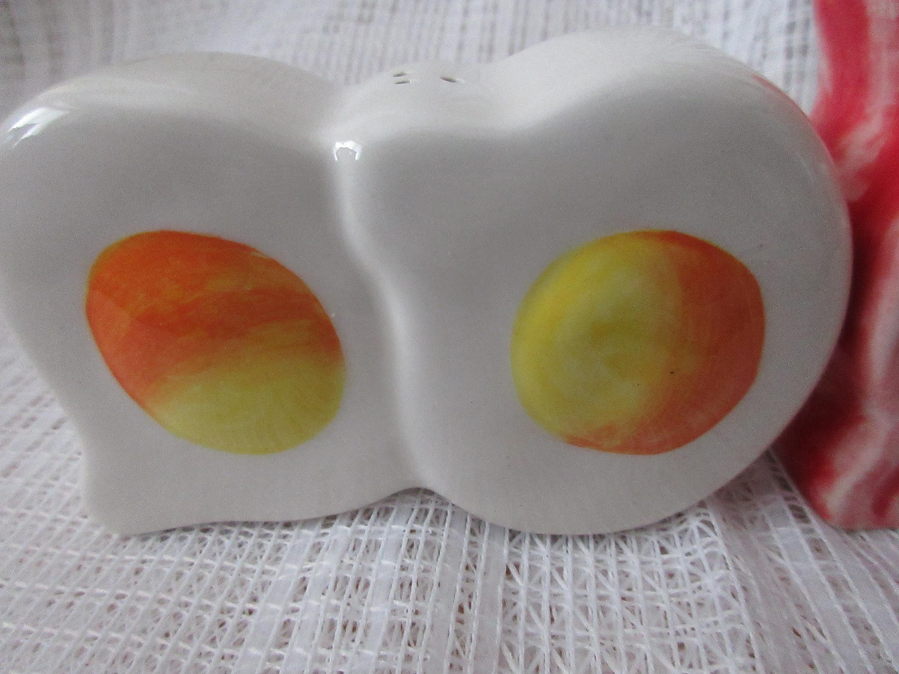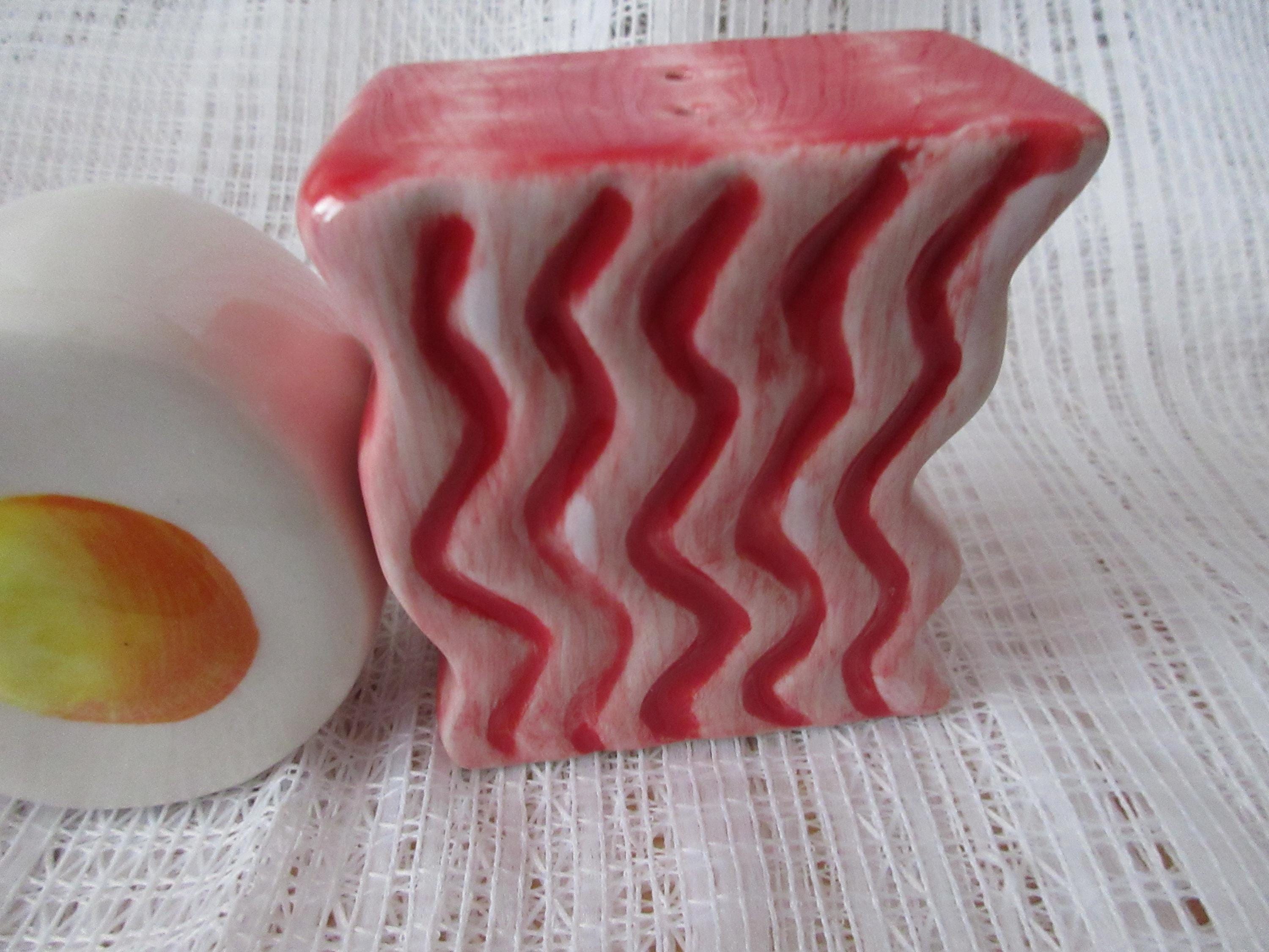 861 - This set of salt and pepper shakers are used but in very good condition. They are magnetic. There is a manufacturer's scratch on the top of the egg shaker (see photo). The bacon is red with white wavy lines. The eggs are white with the yellow and orange yoke. The bacon measures 2.5 inches tall and 2.0 wide. The eggs are 3.5 inches wide and 2.25 inches tall. Both have plastic stoppers and one has a sticker marked "pacific giftware".