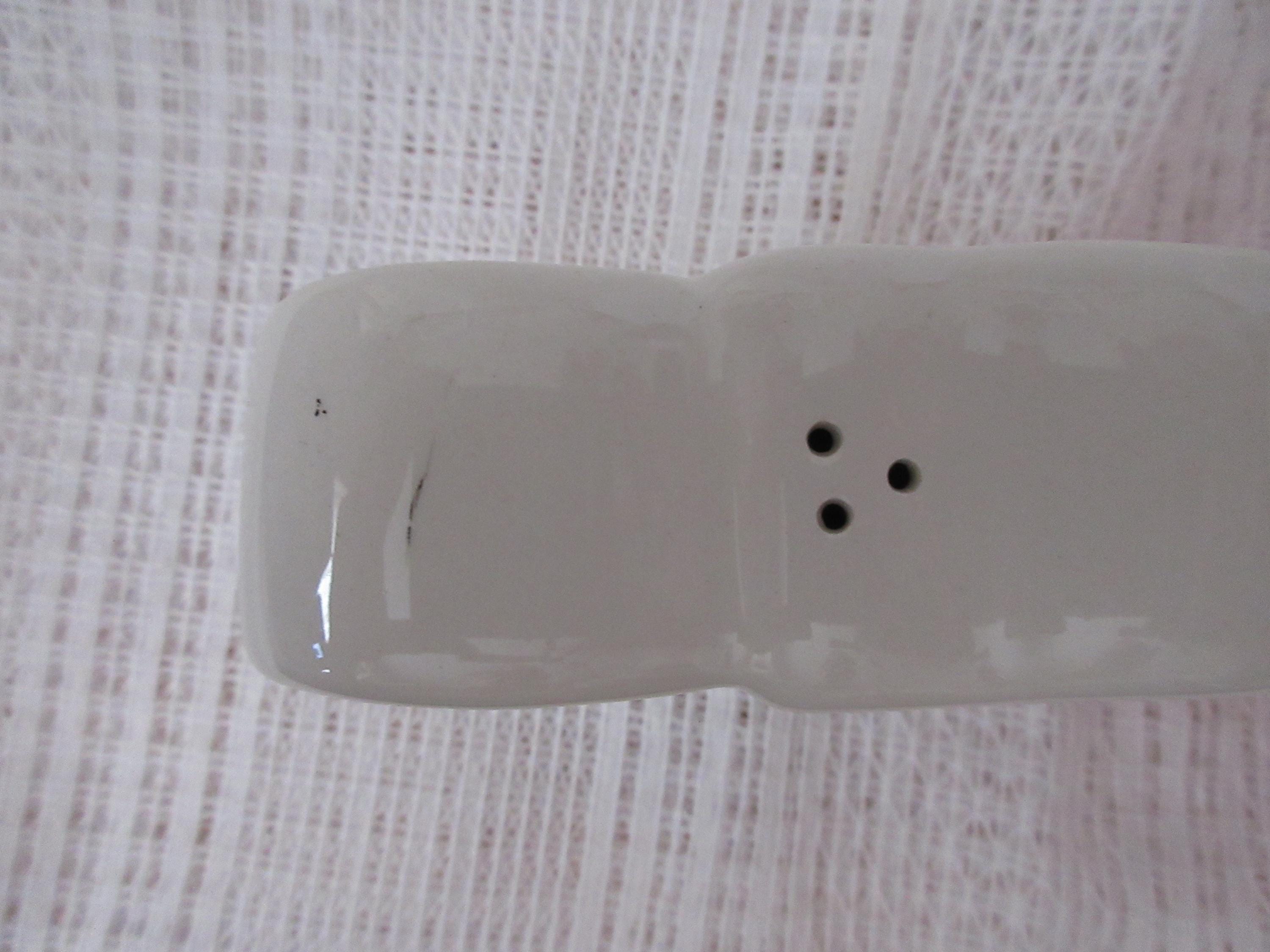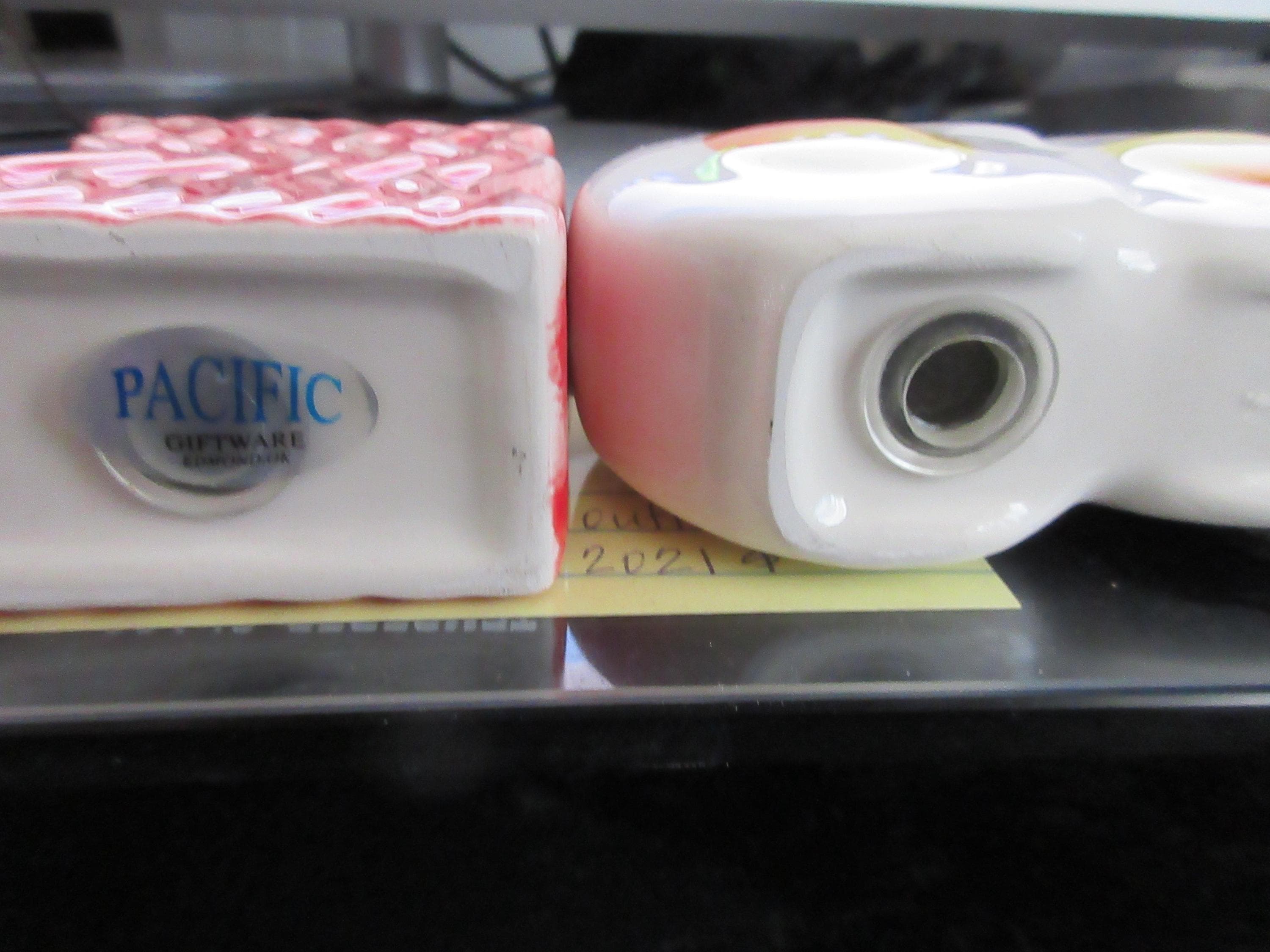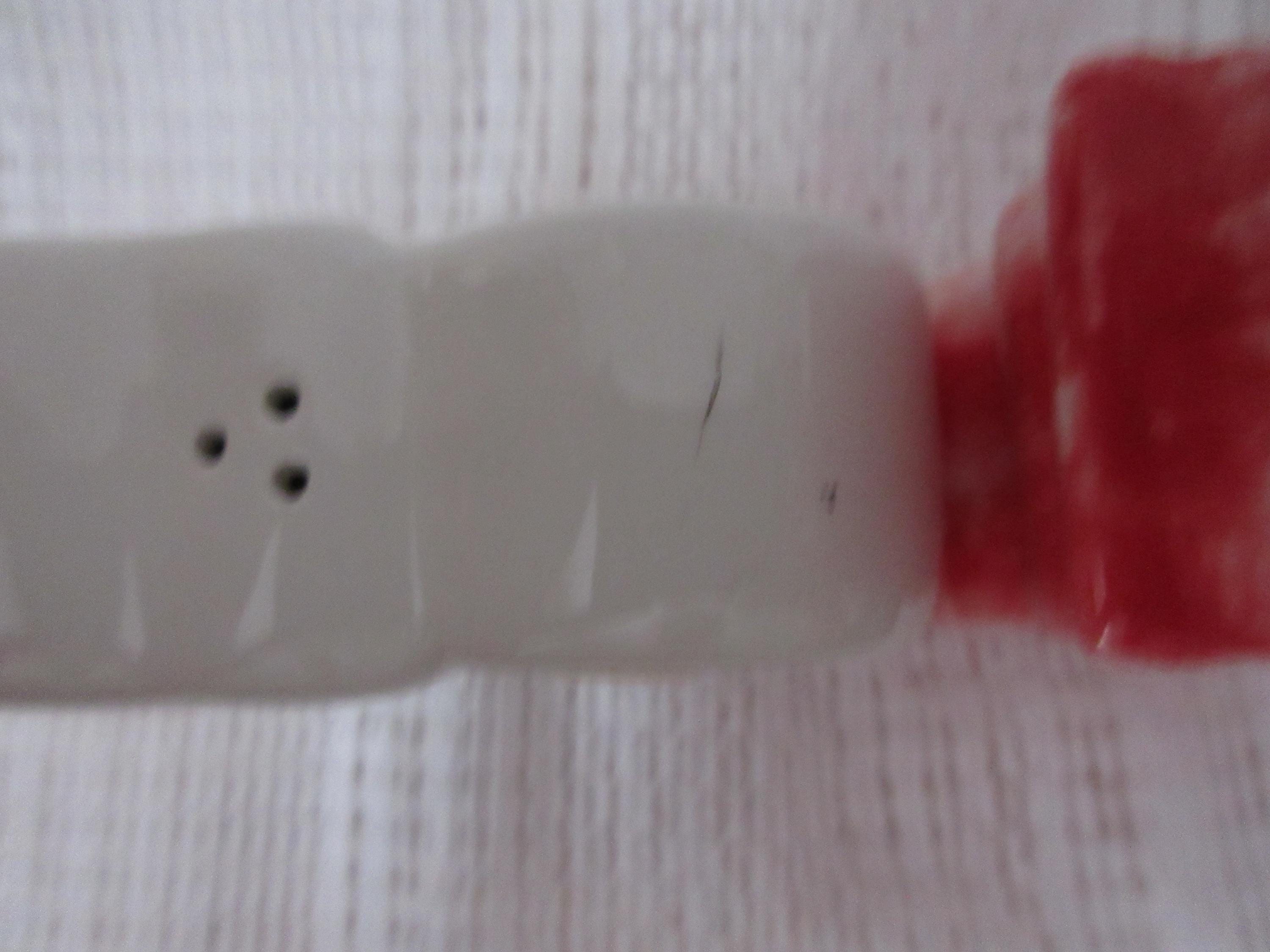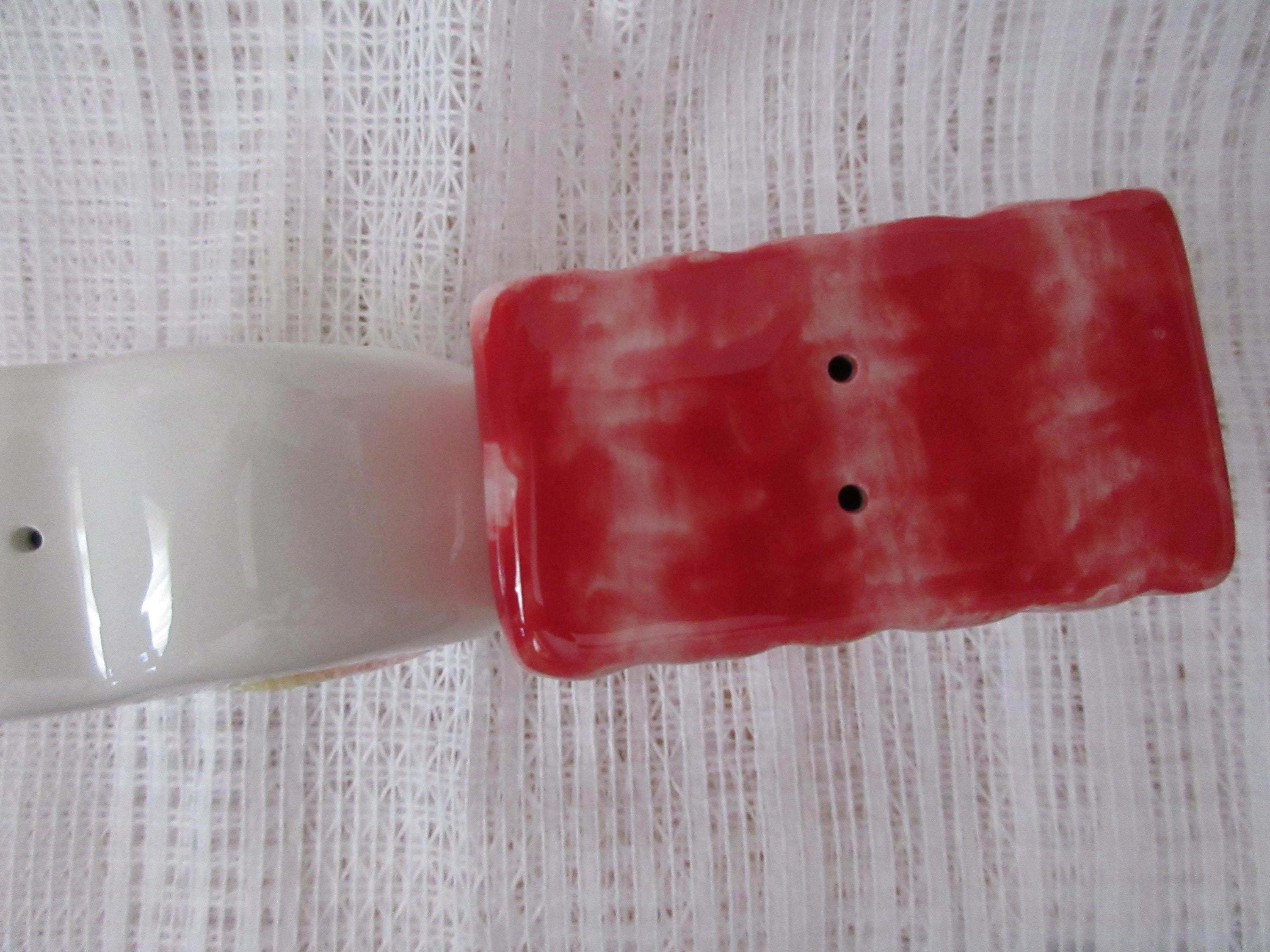861 - This set of salt and pepper shakers are used but in very good condition. They are magnetic. There is a manufacturer's scratch on the top of the egg shaker (see photo). The bacon is red with white wavy lines. The eggs are white with the yellow and orange yoke. The bacon measures 2.5 inches tall and 2.0 wide. The eggs are 3.5 inches wide and 2.25 inches tall. Both have plastic stoppers and one has a sticker marked "pacific giftware".