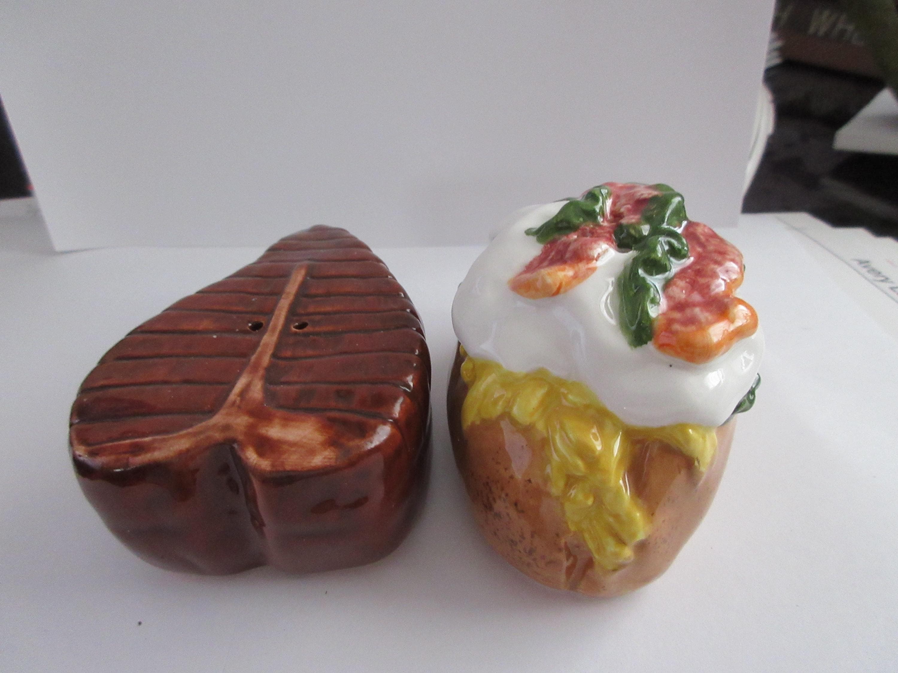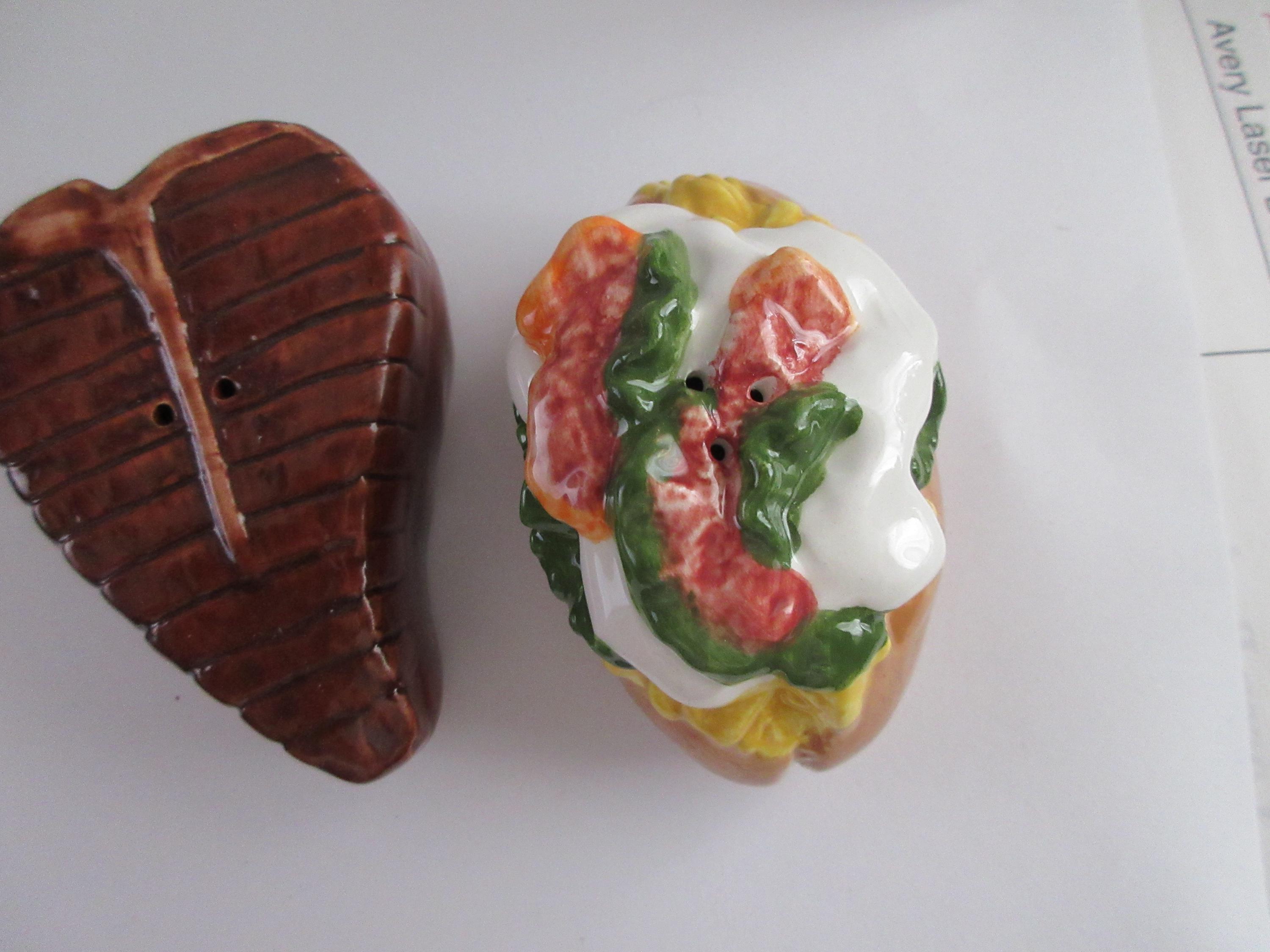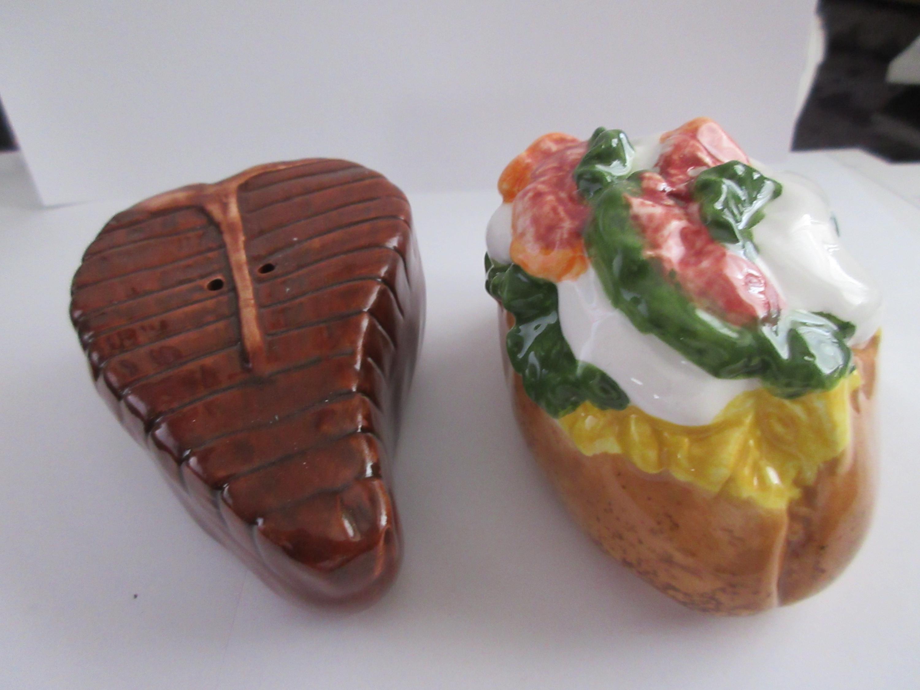 1916 - This set of shakers are representing a favorite food "group". The steak is brown with a lighter T-Bone down the middle. This shaker has a plastic stopper and is not marked. It is 3.25 inches long by 2.25 inches wide (at the widest point). The potato is a brown casing with yellow for the cheese, red for the bacon, white for the sour cream and green for the guacamole. This shaker has a plastic stopper and also is not marked. It measures 3.25 inches long and 2 inches tall.