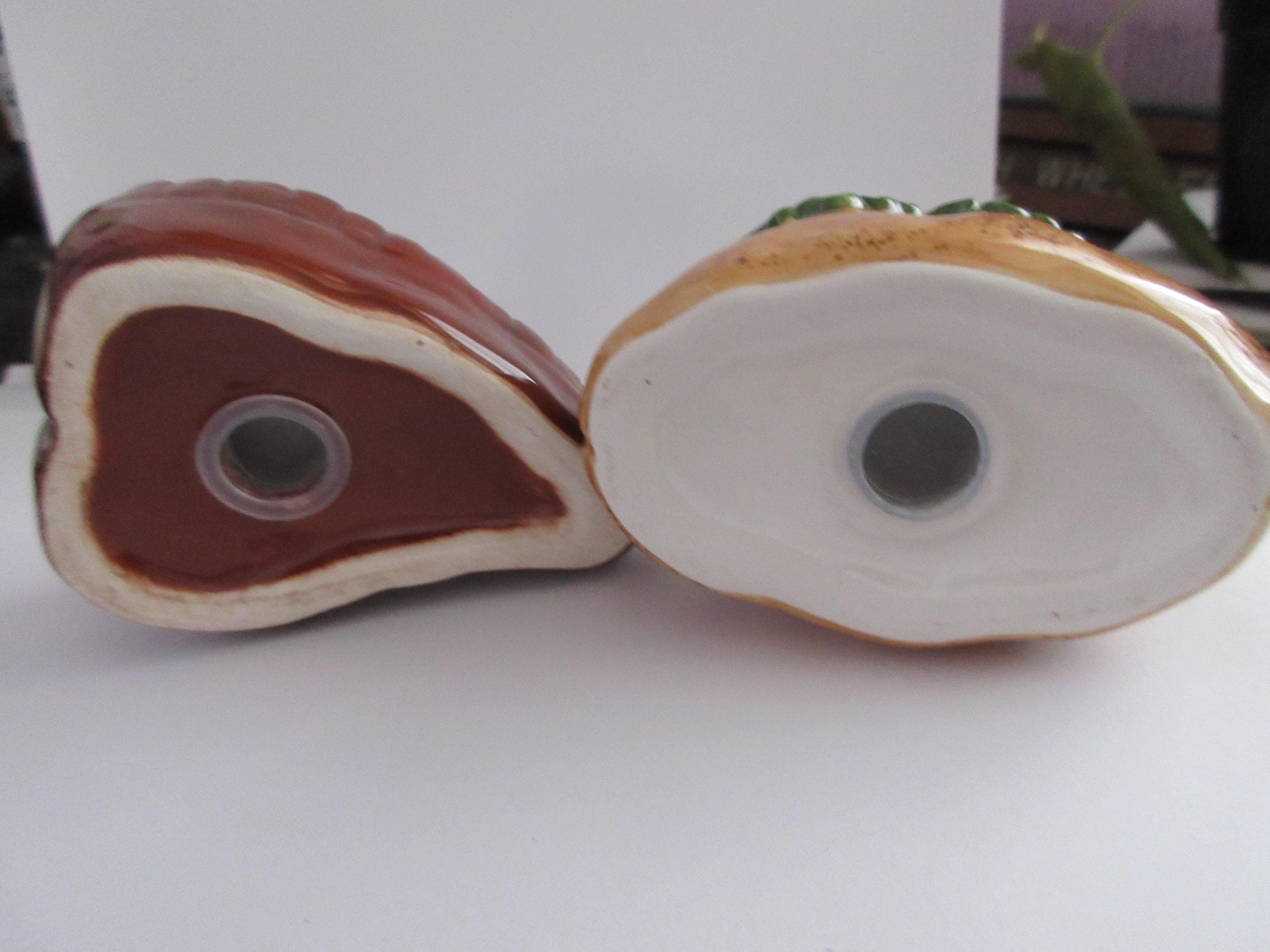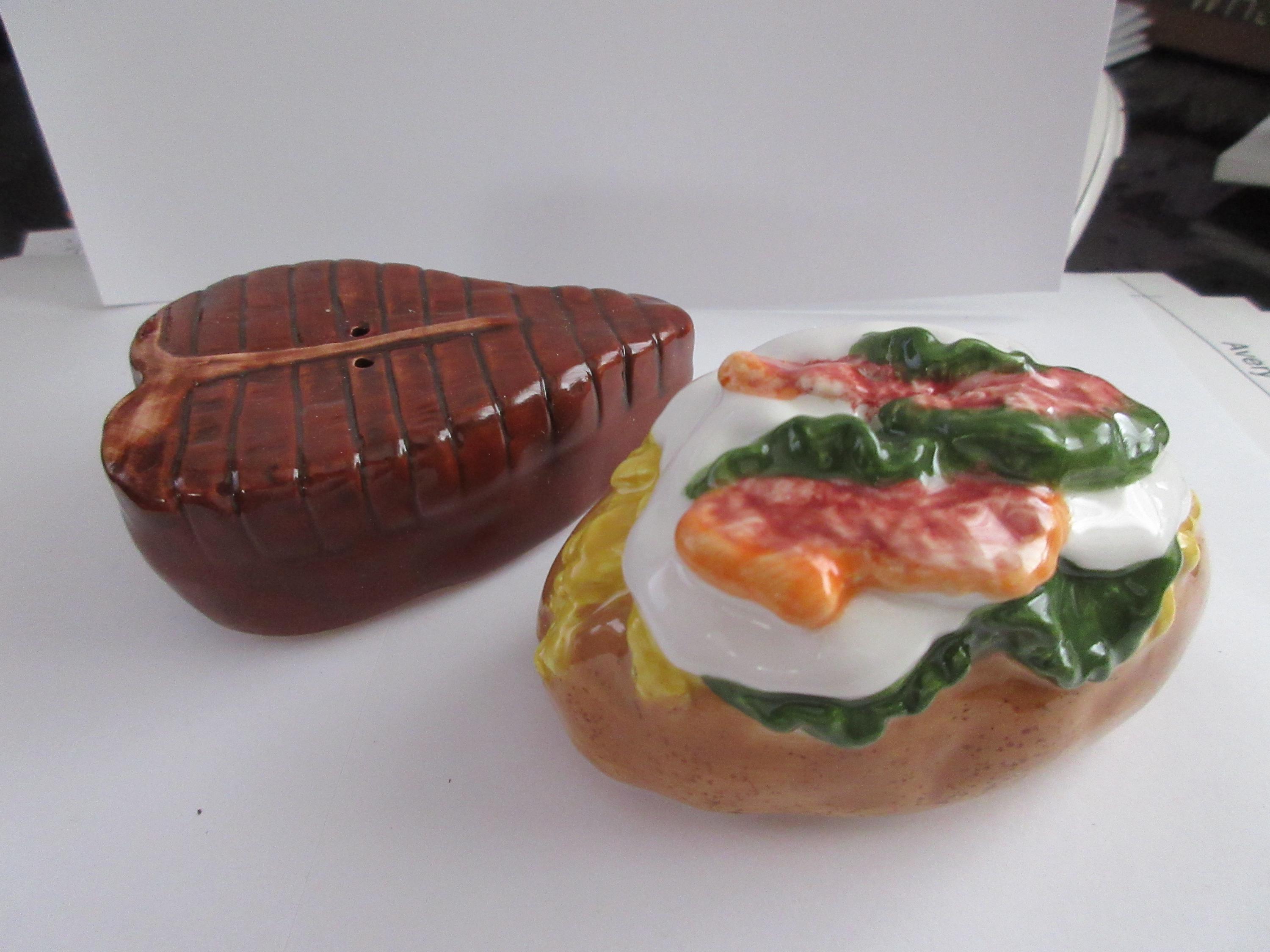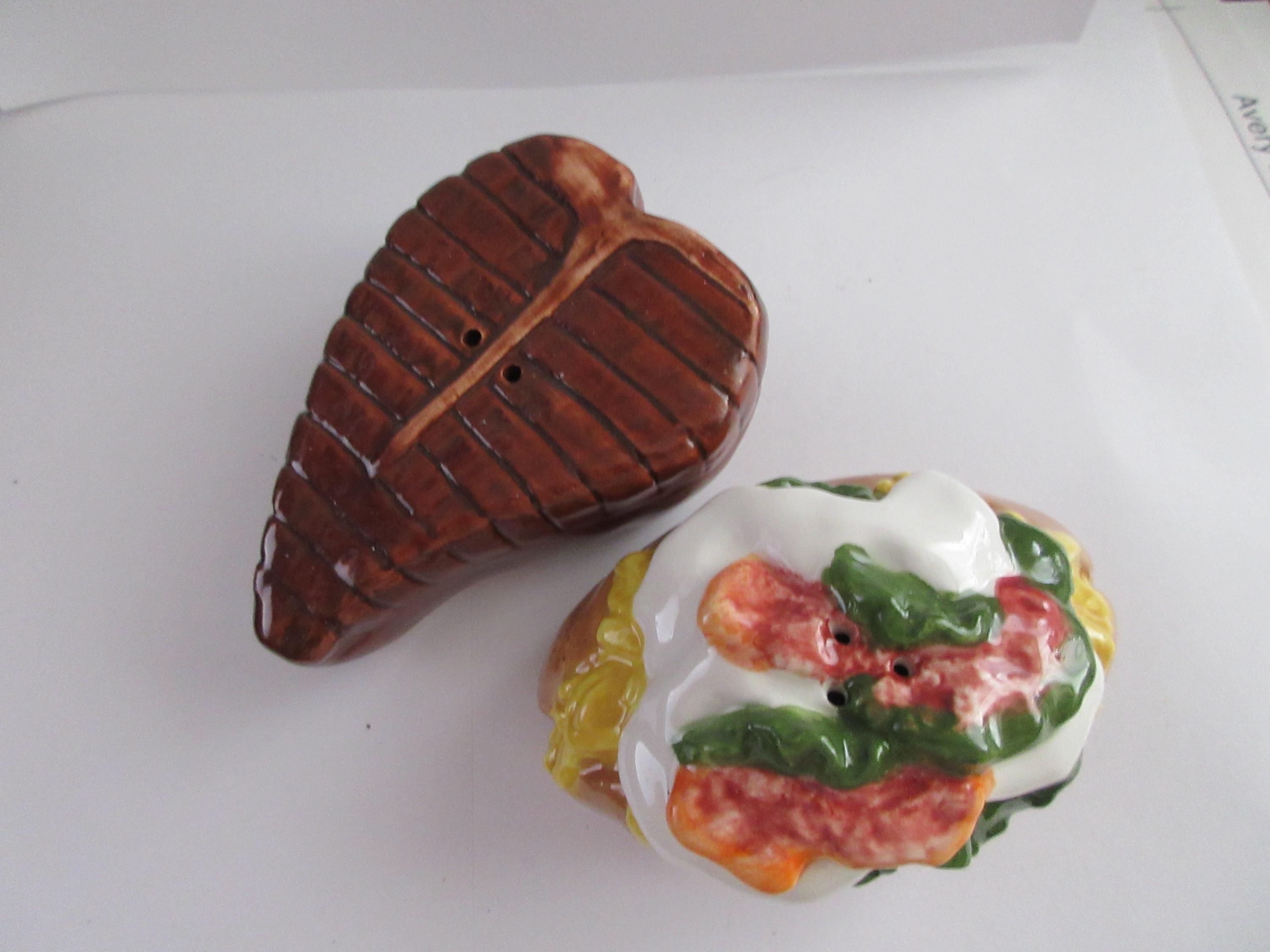 1916 - This set of shakers are representing a favorite food "group". The steak is brown with a lighter T-Bone down the middle. This shaker has a plastic stopper and is not marked. It is 3.25 inches long by 2.25 inches wide (at the widest point). The potato is a brown casing with yellow for the cheese, red for the bacon, white for the sour cream and green for the guacamole. This shaker has a plastic stopper and also is not marked. It measures 3.25 inches long and 2 inches tall.