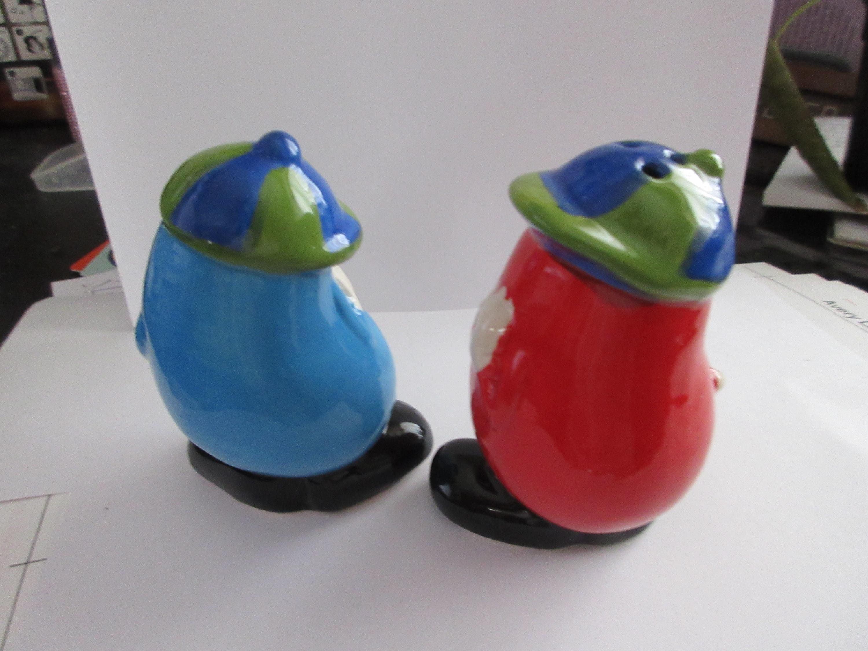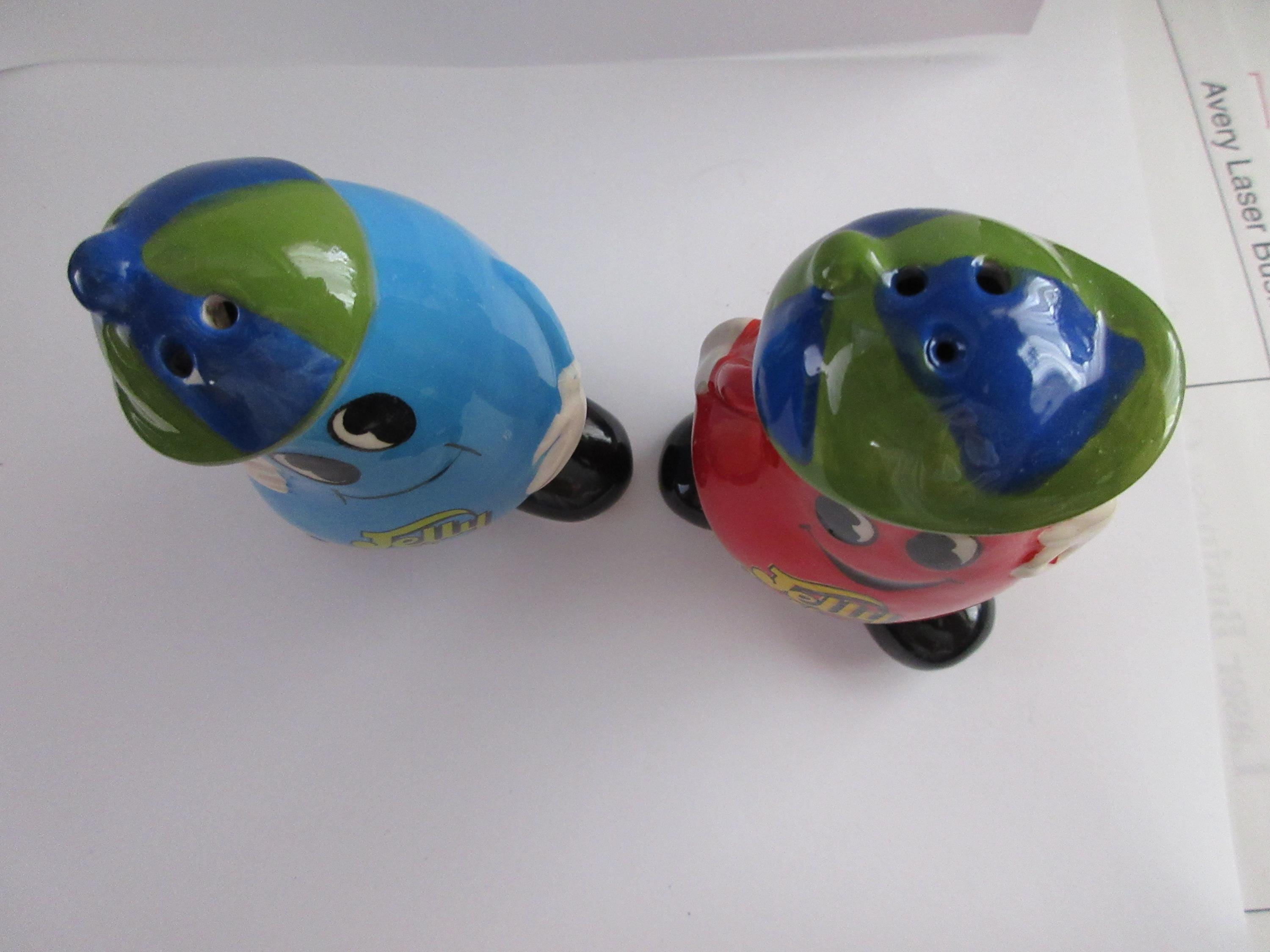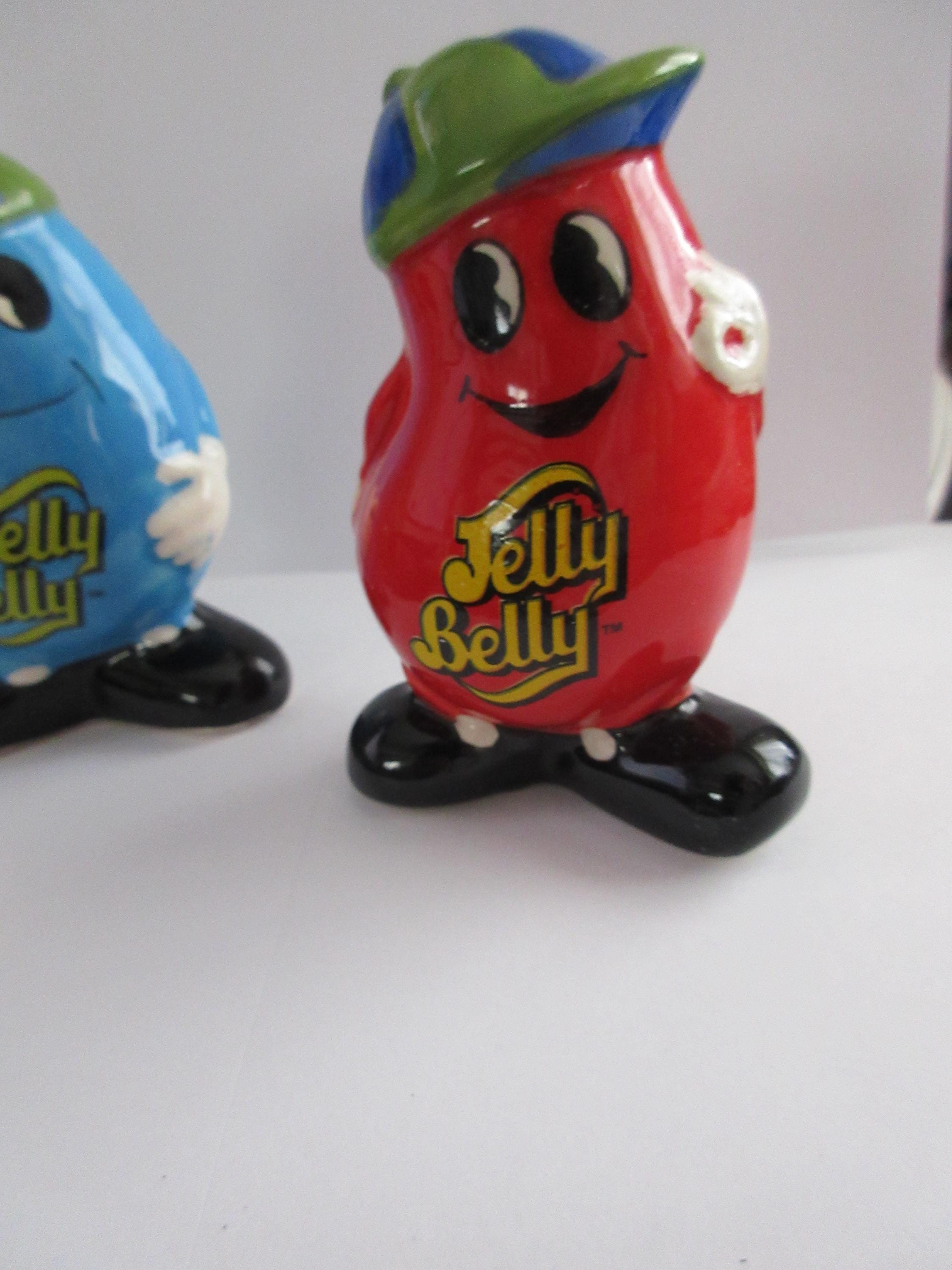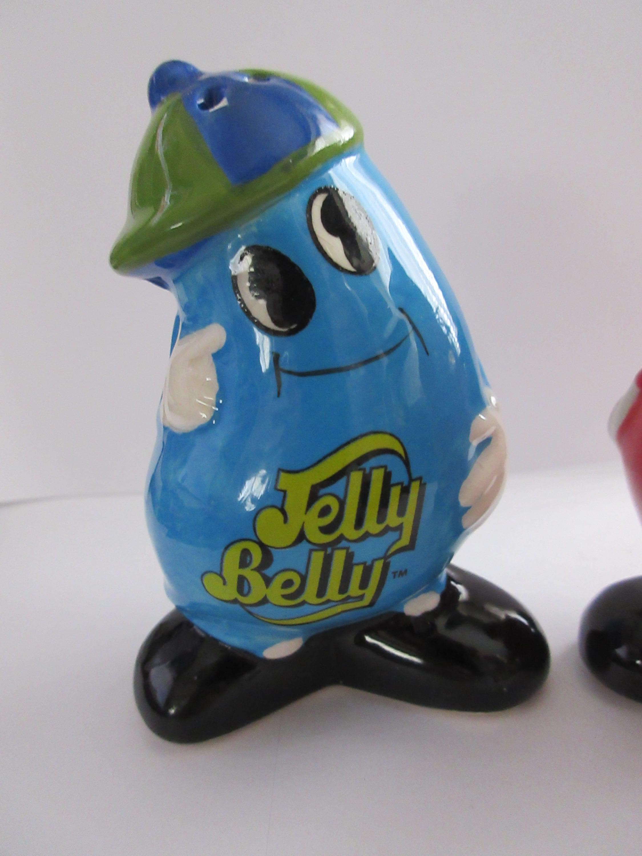 1214 - This set of Jelly Belly salt and pepper shakers are in very good condition with a flea chip on the blue shaker on one of the pour holes (see picture). One of the shakers is blue with white hands, a blue and green hat, black shoes and "Jelly Belly" across his stomach. This shaker is 3.75 inches tall, has a plastic stopper and sticker "Jelly Belly" on the bottom. The red shaker has white hands, a green and blue hat, black shoes with "Jelly Belly" a cross his stomach. It also has a plastic stopper with a sticker "Jelly Belly" on the bottom.