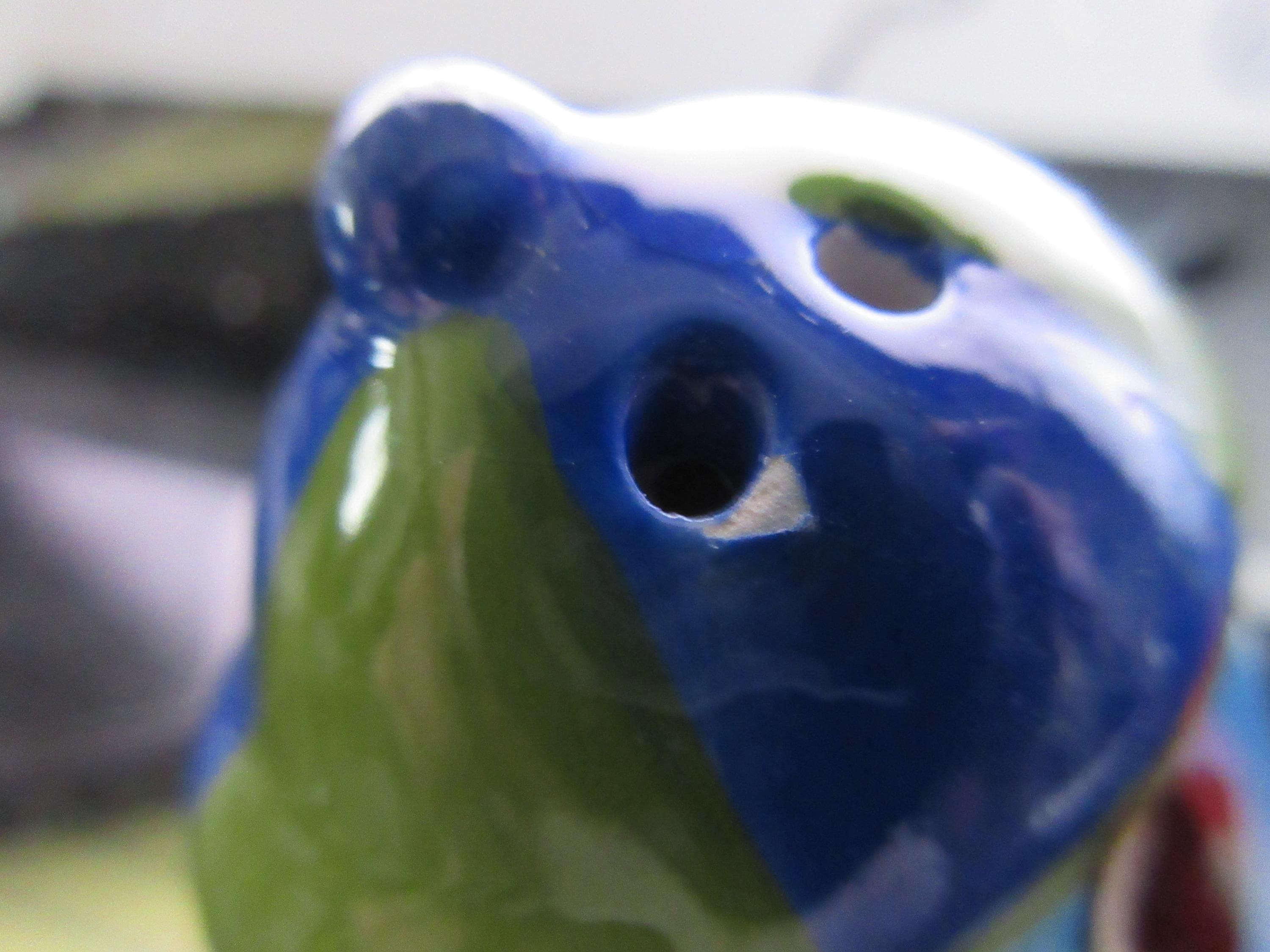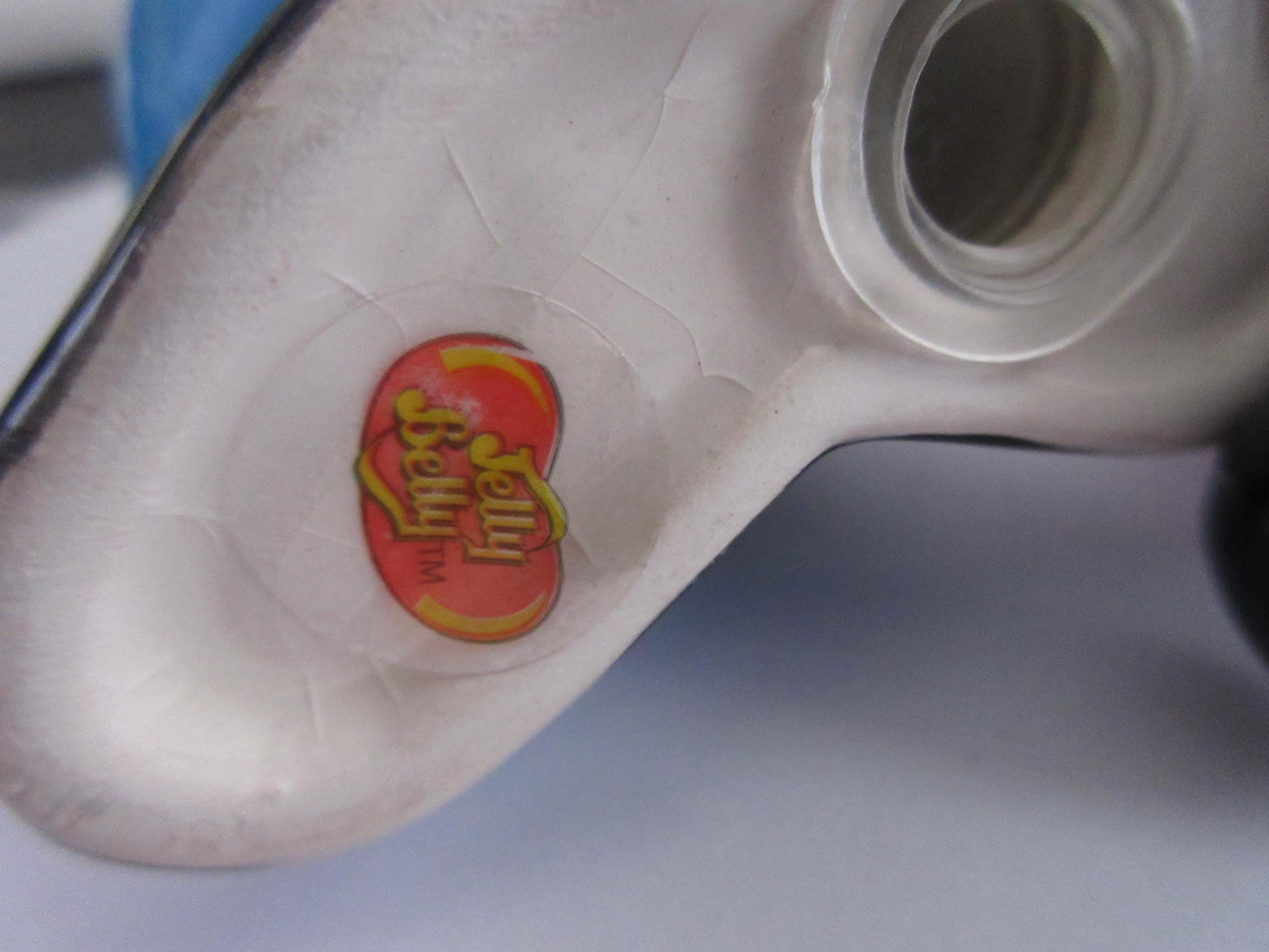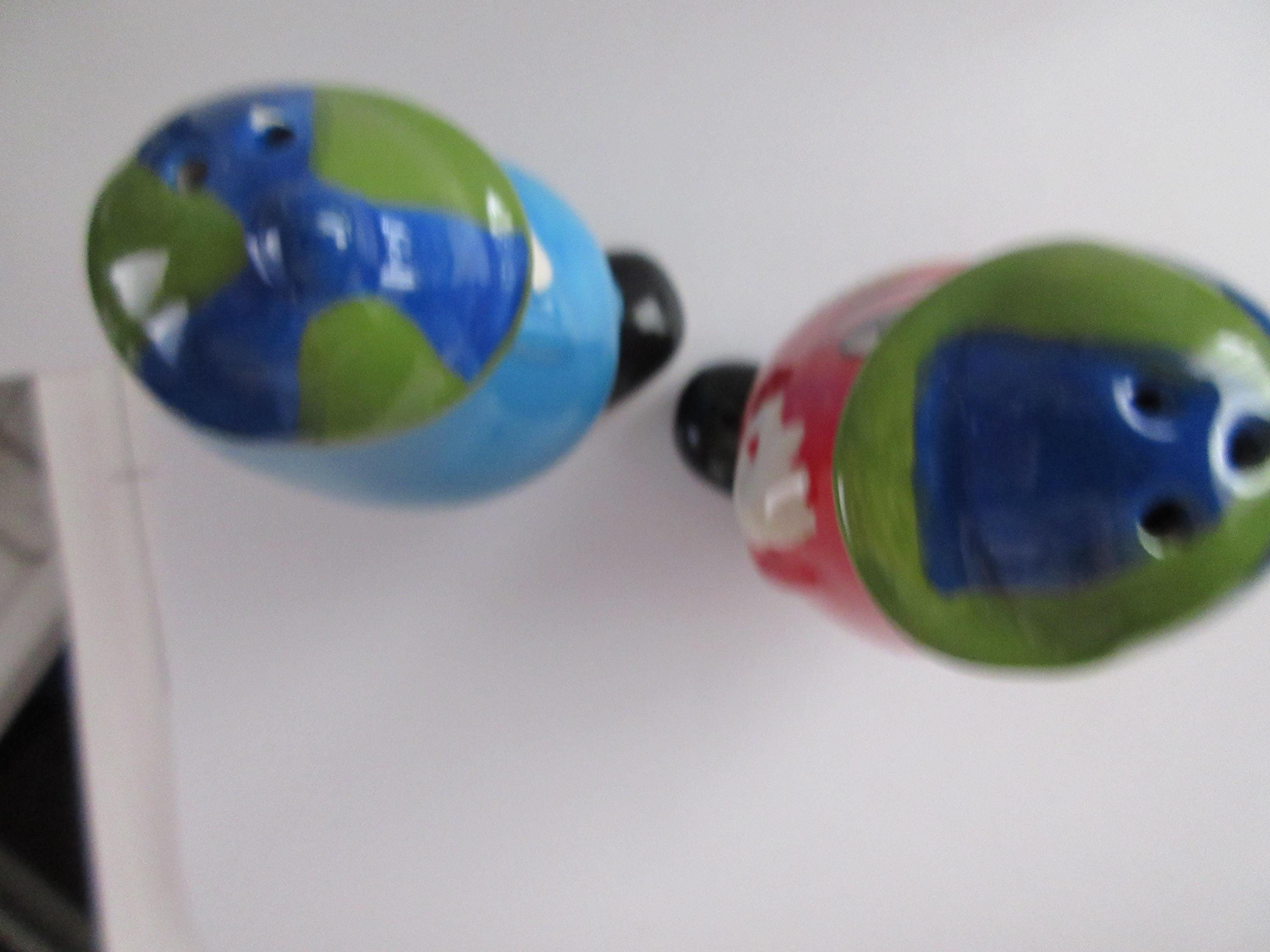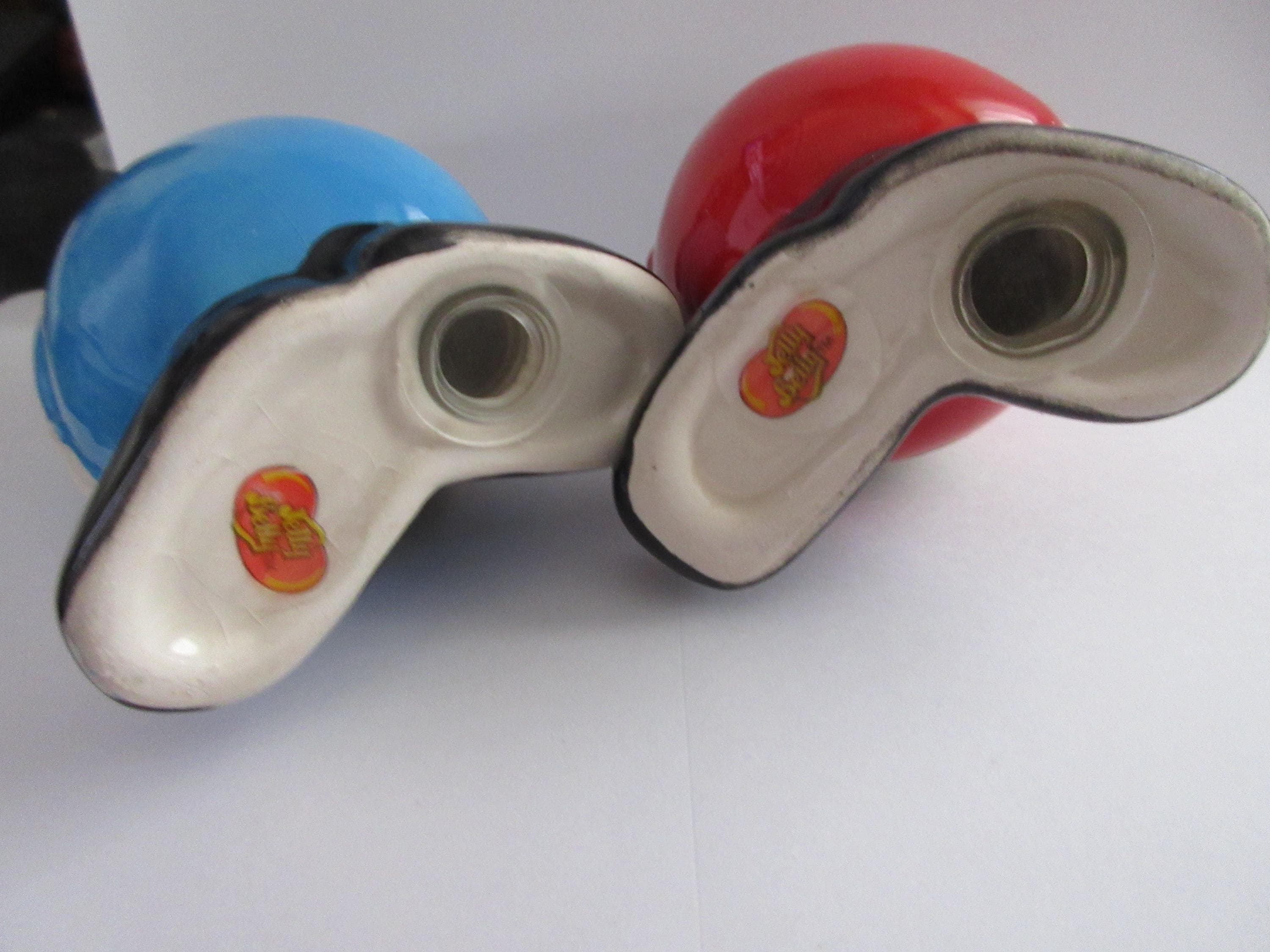 1214 - This set of Jelly Belly salt and pepper shakers are in very good condition with a flea chip on the blue shaker on one of the pour holes (see picture). One of the shakers is blue with white hands, a blue and green hat, black shoes and "Jelly Belly" across his stomach. This shaker is 3.75 inches tall, has a plastic stopper and sticker "Jelly Belly" on the bottom. The red shaker has white hands, a green and blue hat, black shoes with "Jelly Belly" a cross his stomach. It also has a plastic stopper with a sticker "Jelly Belly" on the bottom.