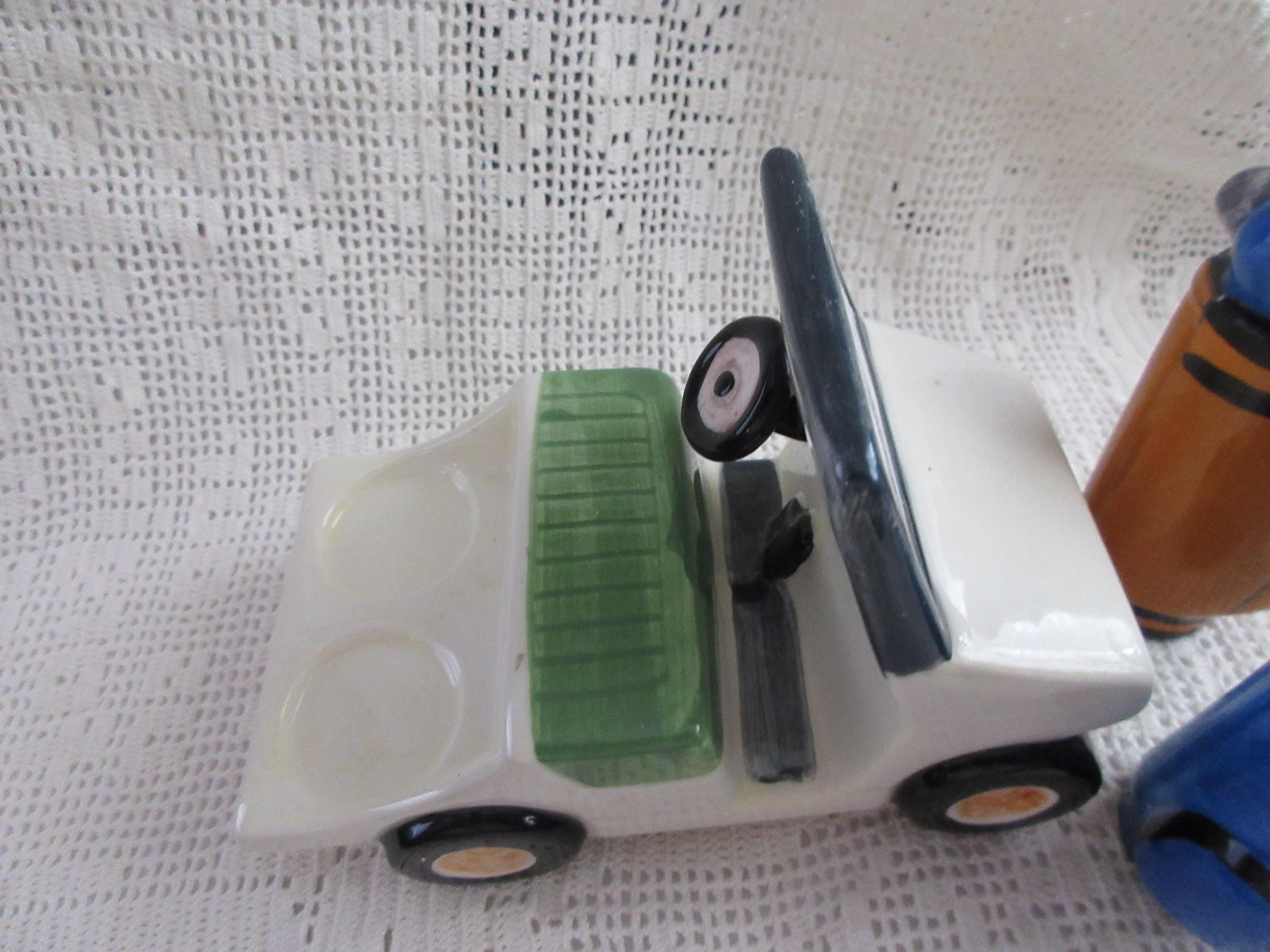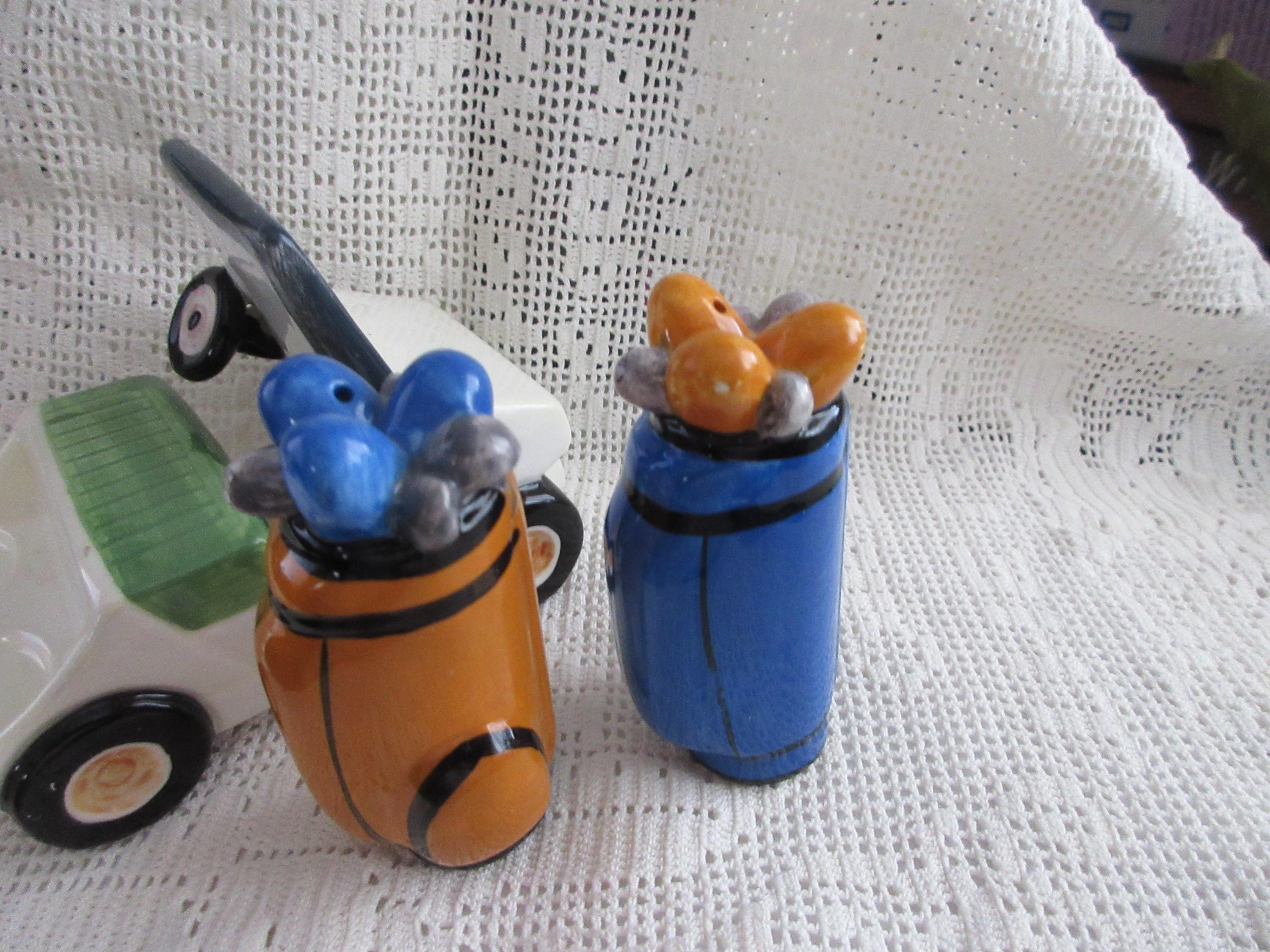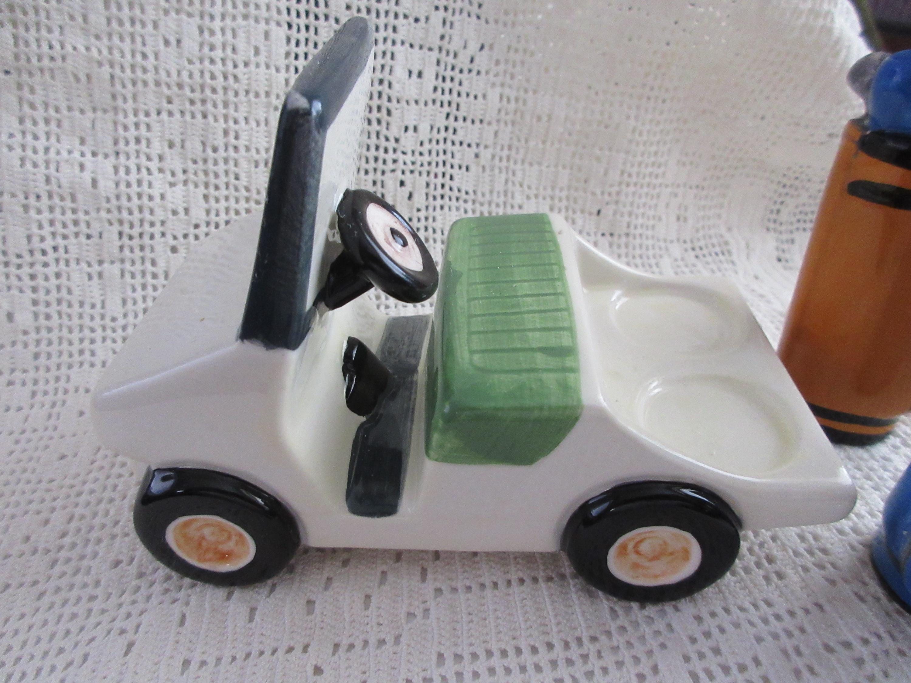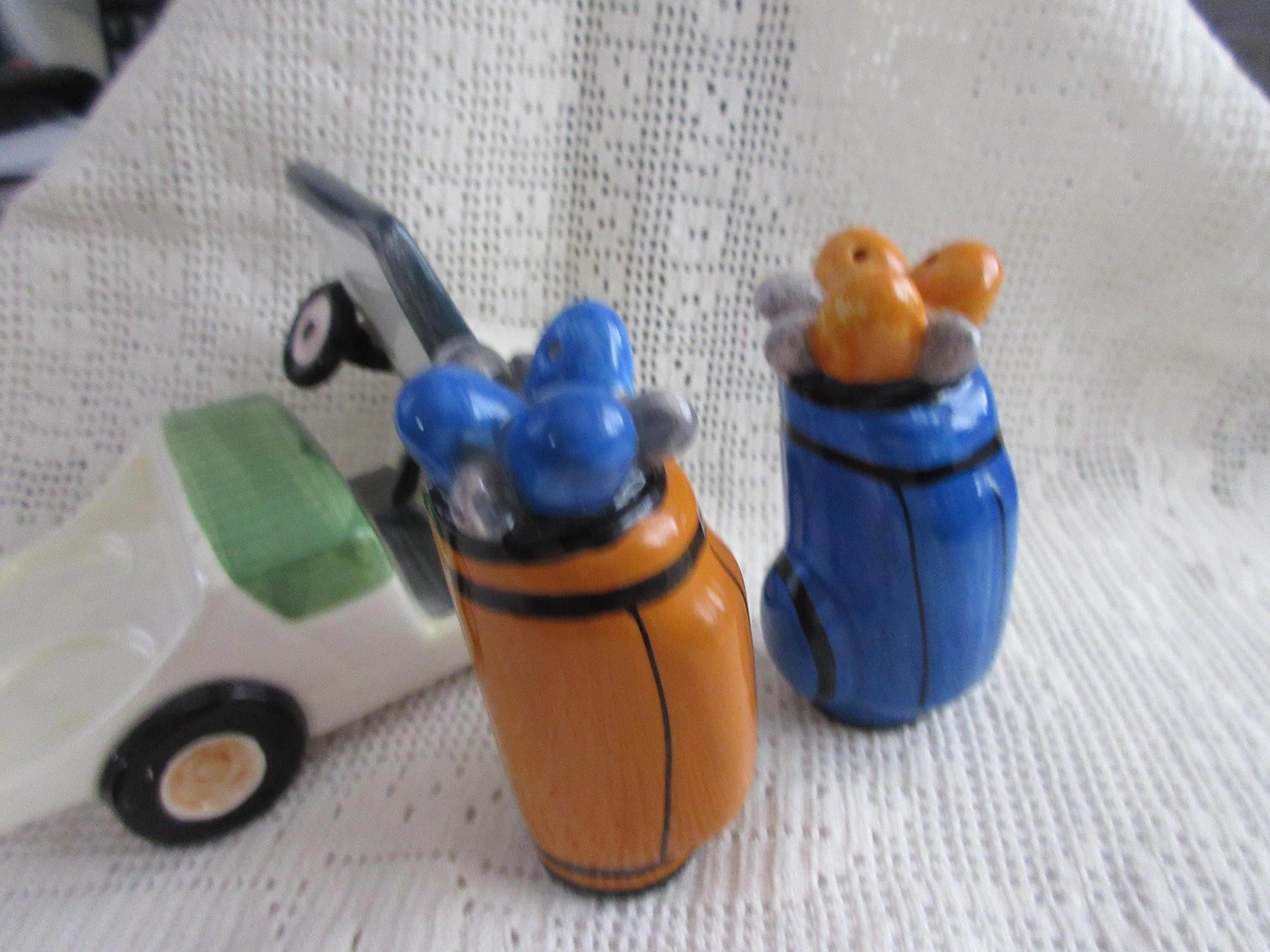 1911 - This set of salt and pepper shakers include a golf cart and two bags with clubs. The golf cart is white with a green seat, black steering wheel, black and gray rim around a white windshield, black tires with beige rims. On the back is a place to put the bags. The length of the golf cart is 4.5 inches and it is 3.0 inches tall. The golf bags are tan with blue clubs and a blue bag with tan clubs. Both bags are outlined in black. The golf cart is marked "FIGI made in China". The bags are the shakers and are marked the same as the cart.
