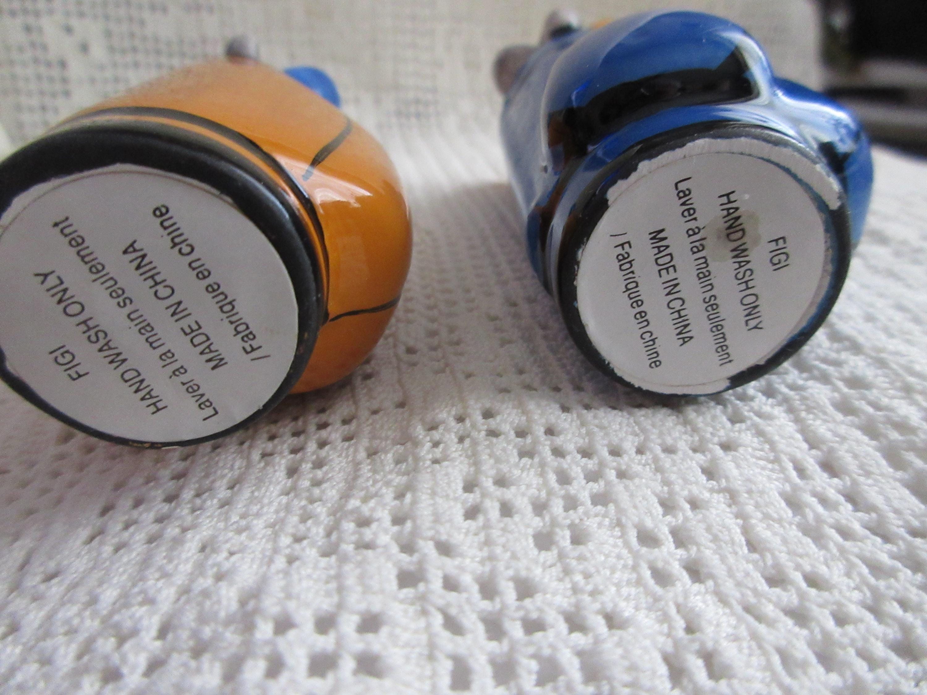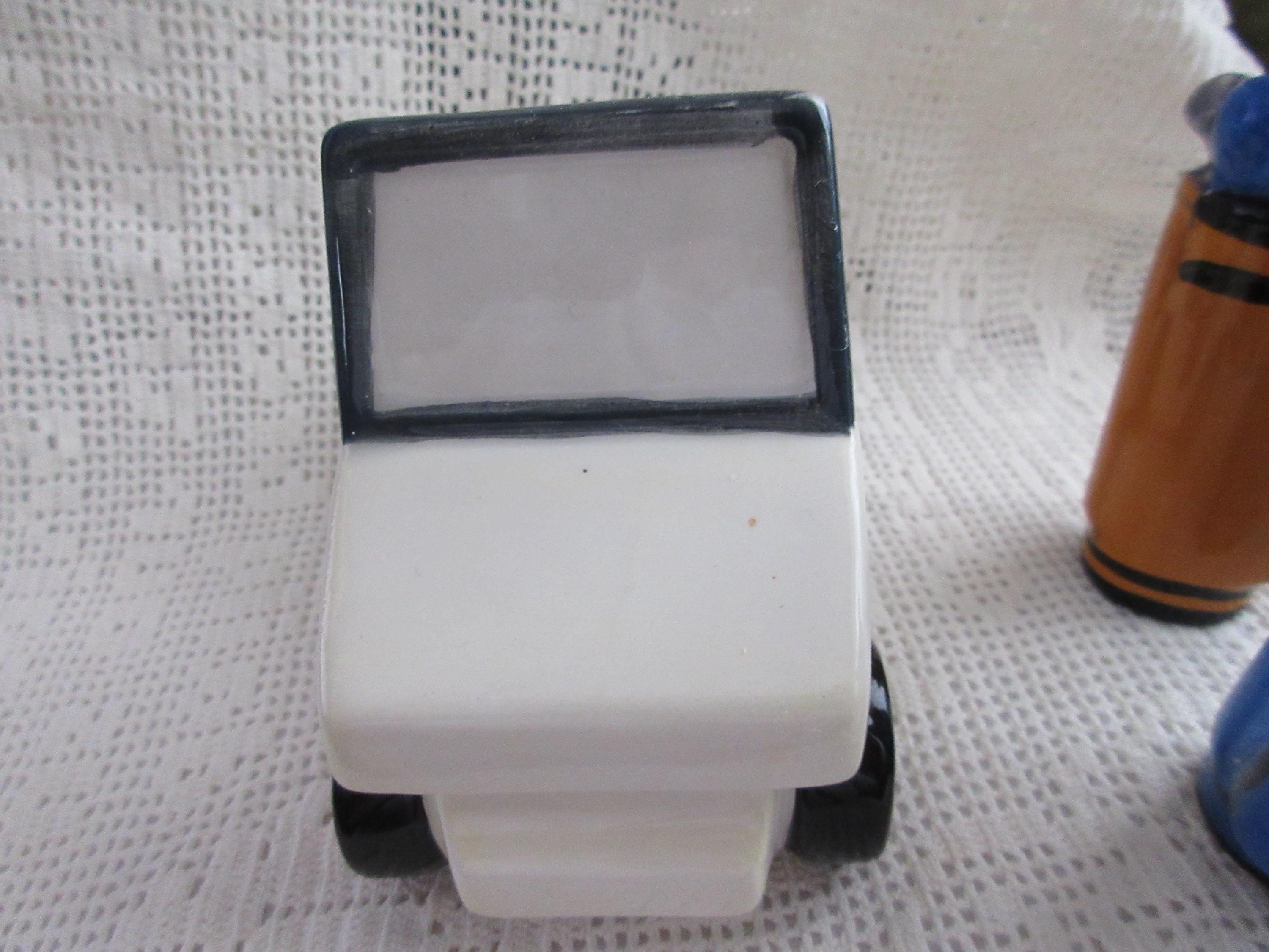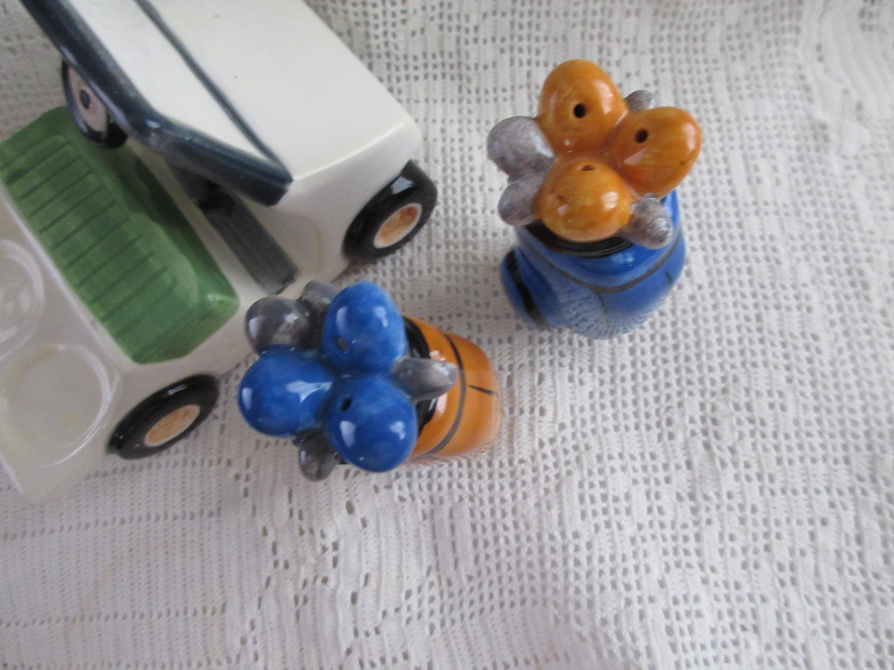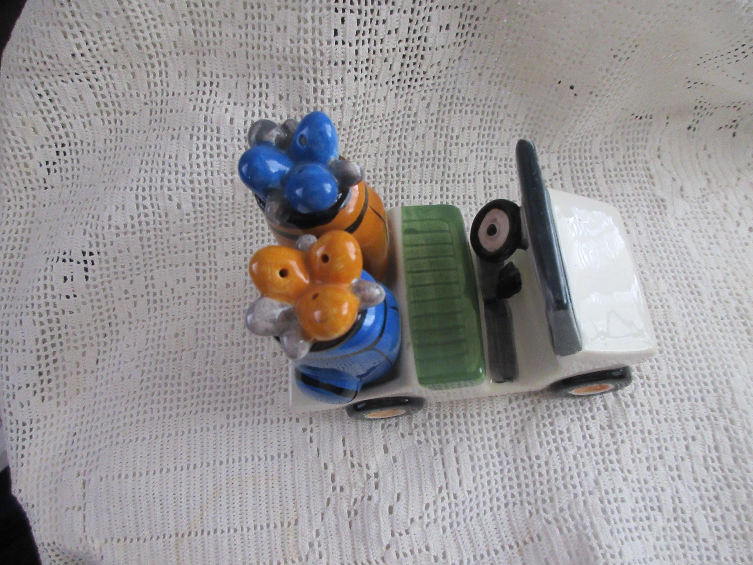1911 - This set of salt and pepper shakers include a golf cart and two bags with clubs. The golf cart is white with a green seat, black steering wheel, black and gray rim around a white windshield, black tires with beige rims. On the back is a place to put the bags. The length of the golf cart is 4.5 inches and it is 3.0 inches tall. The golf bags are tan with blue clubs and a blue bag with tan clubs. Both bags are outlined in black. The golf cart is marked "FIGI made in China". The bags are the shakers and are marked the same as the cart.