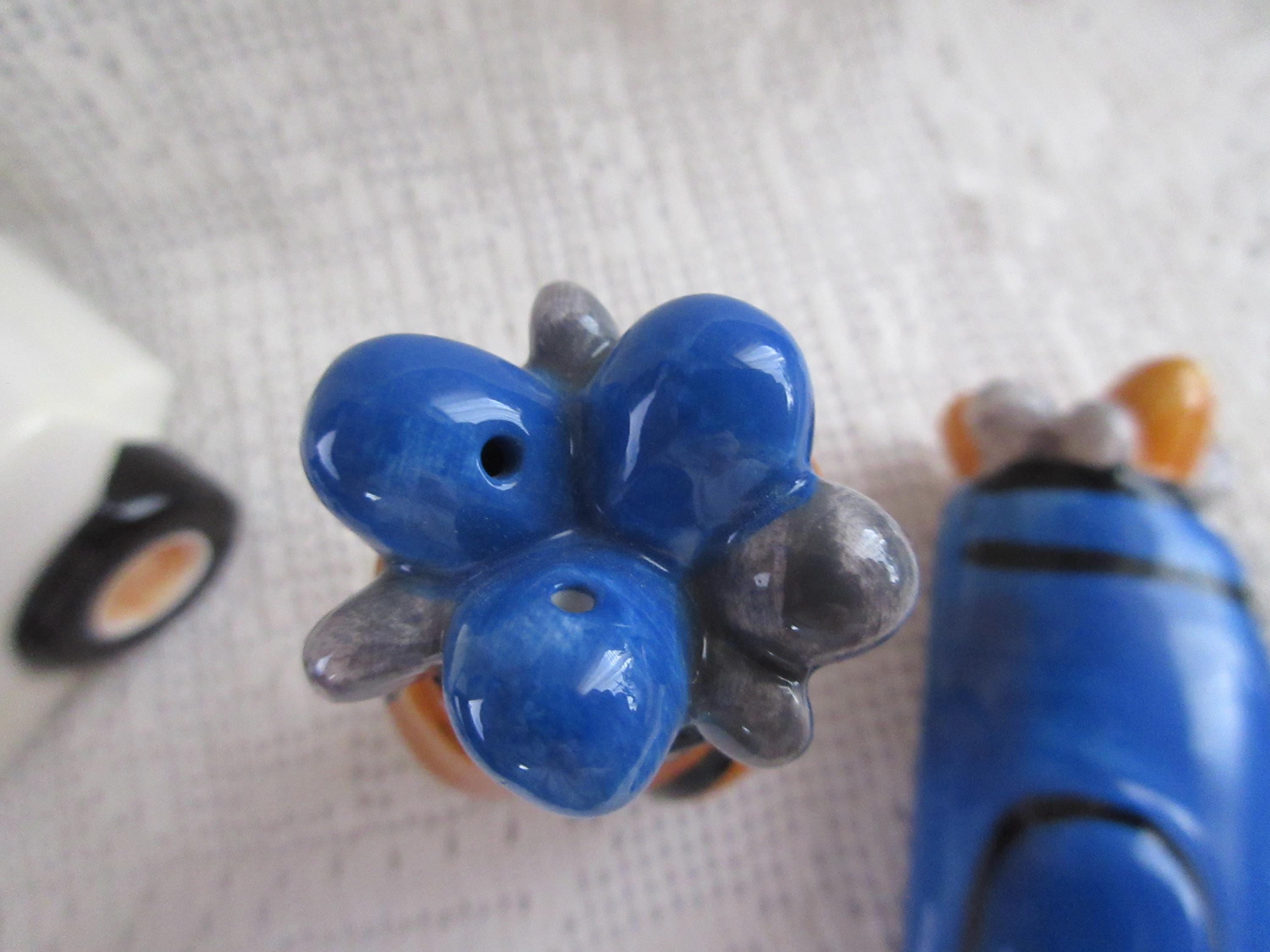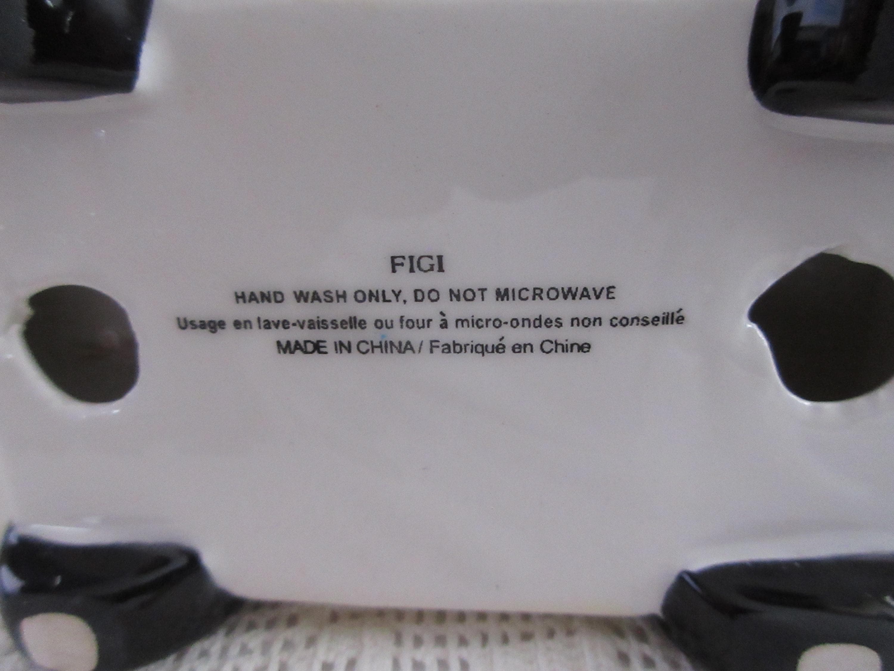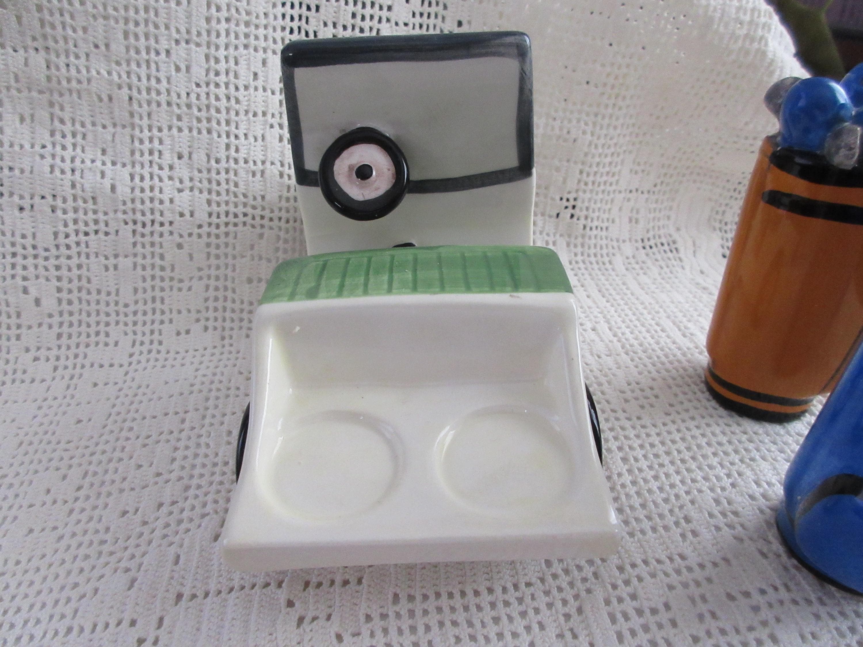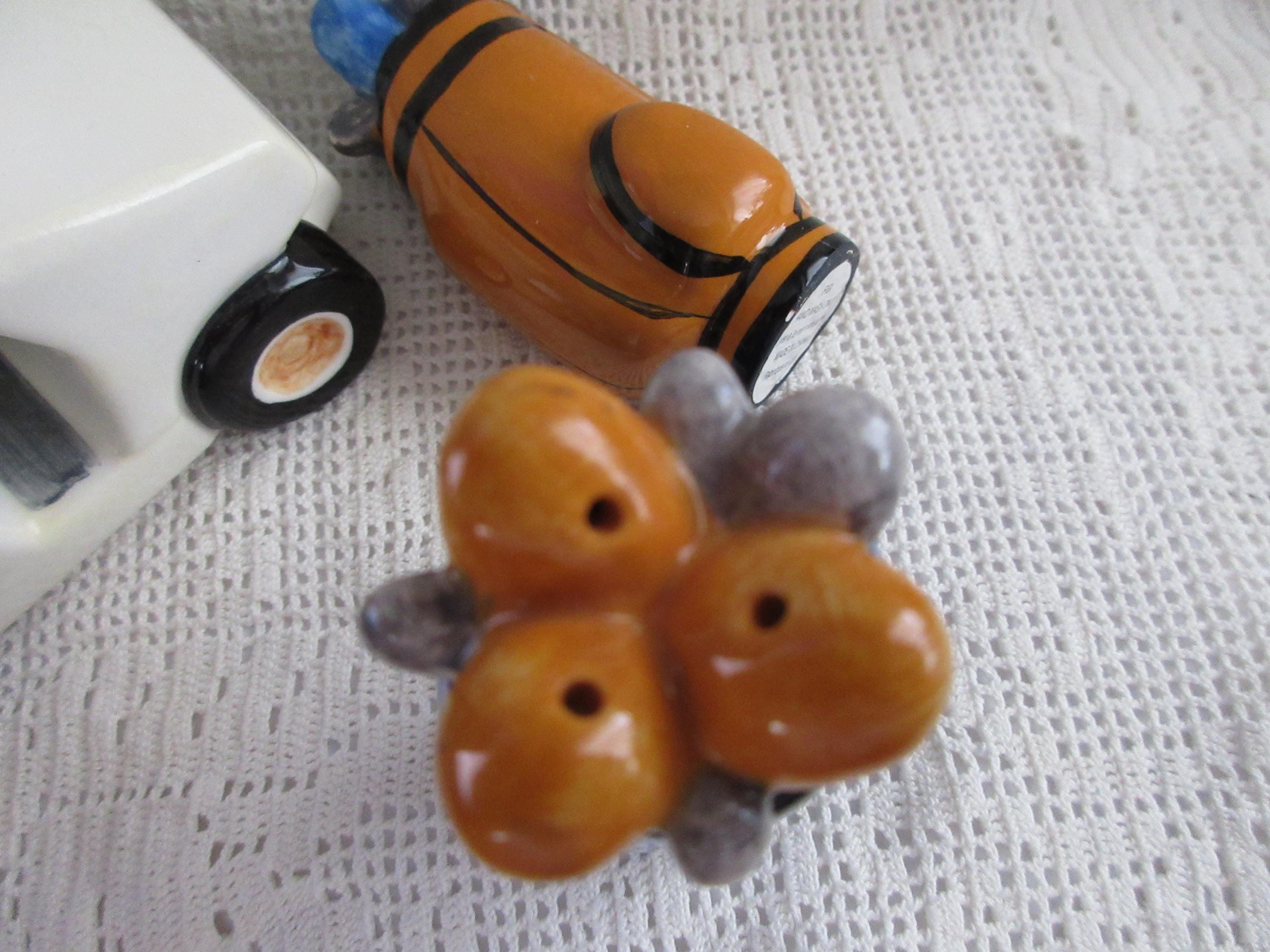 1911 - This set of salt and pepper shakers include a golf cart and two bags with clubs. The golf cart is white with a green seat, black steering wheel, black and gray rim around a white windshield, black tires with beige rims. On the back is a place to put the bags. The length of the golf cart is 4.5 inches and it is 3.0 inches tall. The golf bags are tan with blue clubs and a blue bag with tan clubs. Both bags are outlined in black. The golf cart is marked "FIGI made in China". The bags are the shakers and are marked the same as the cart.