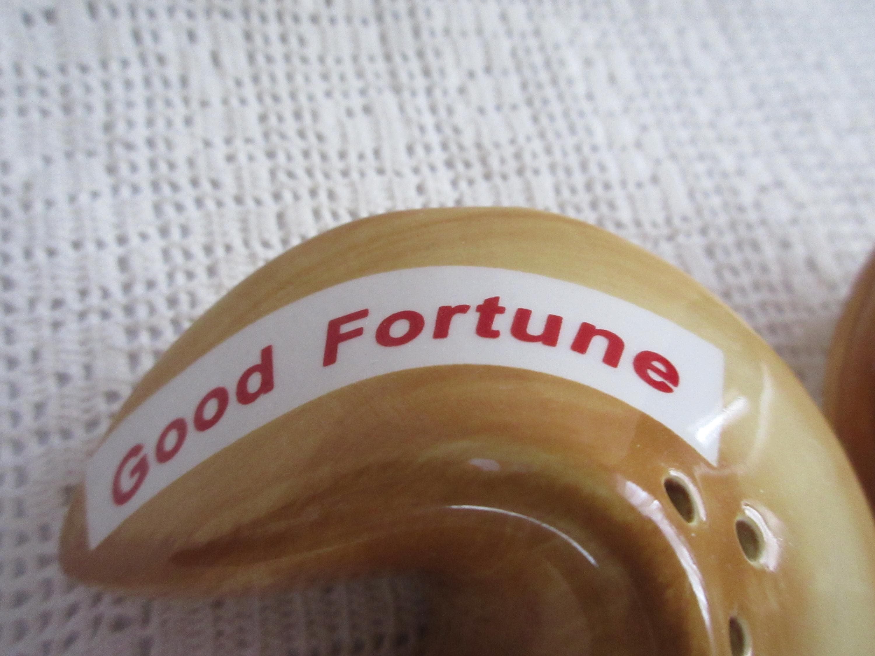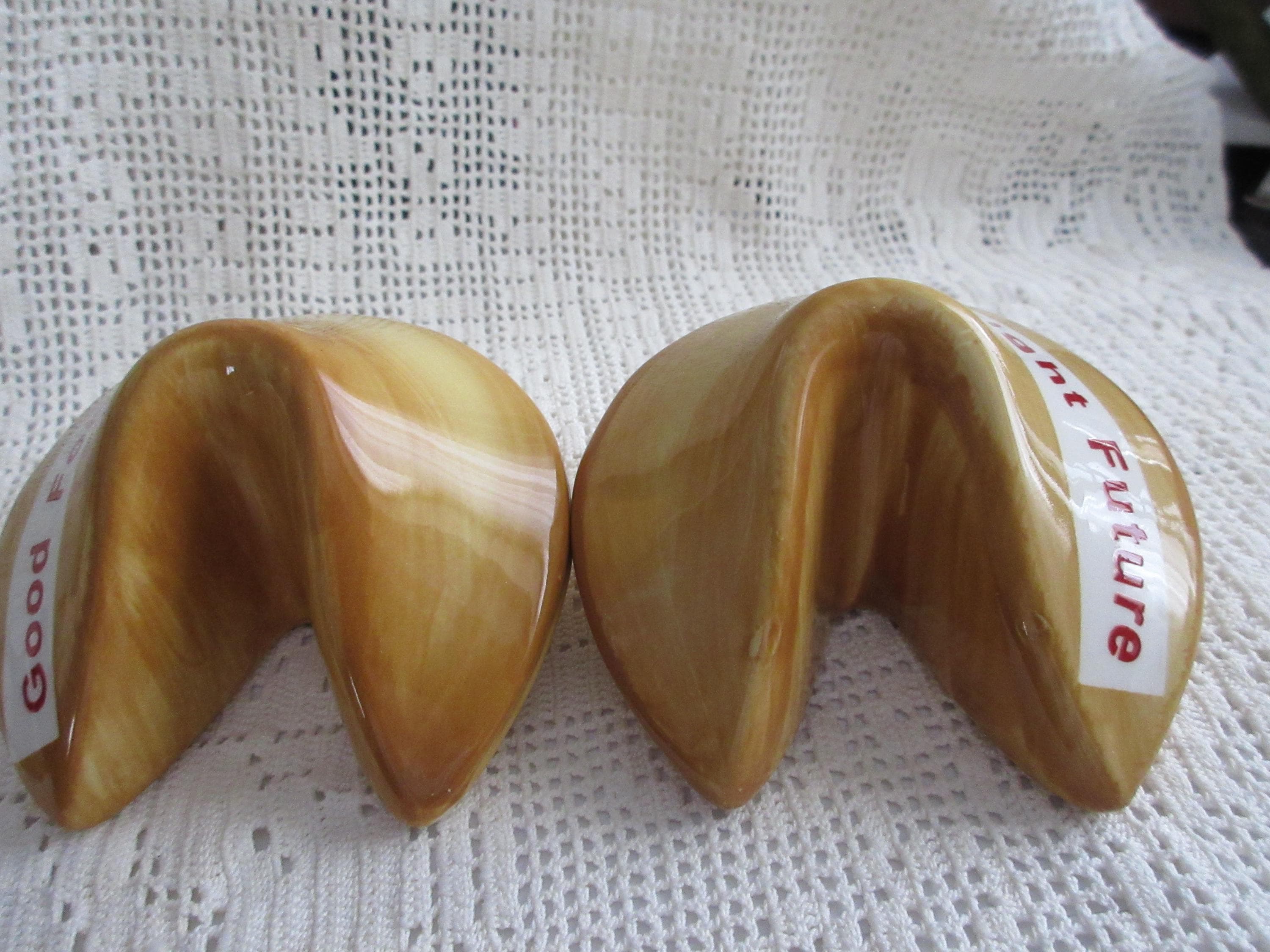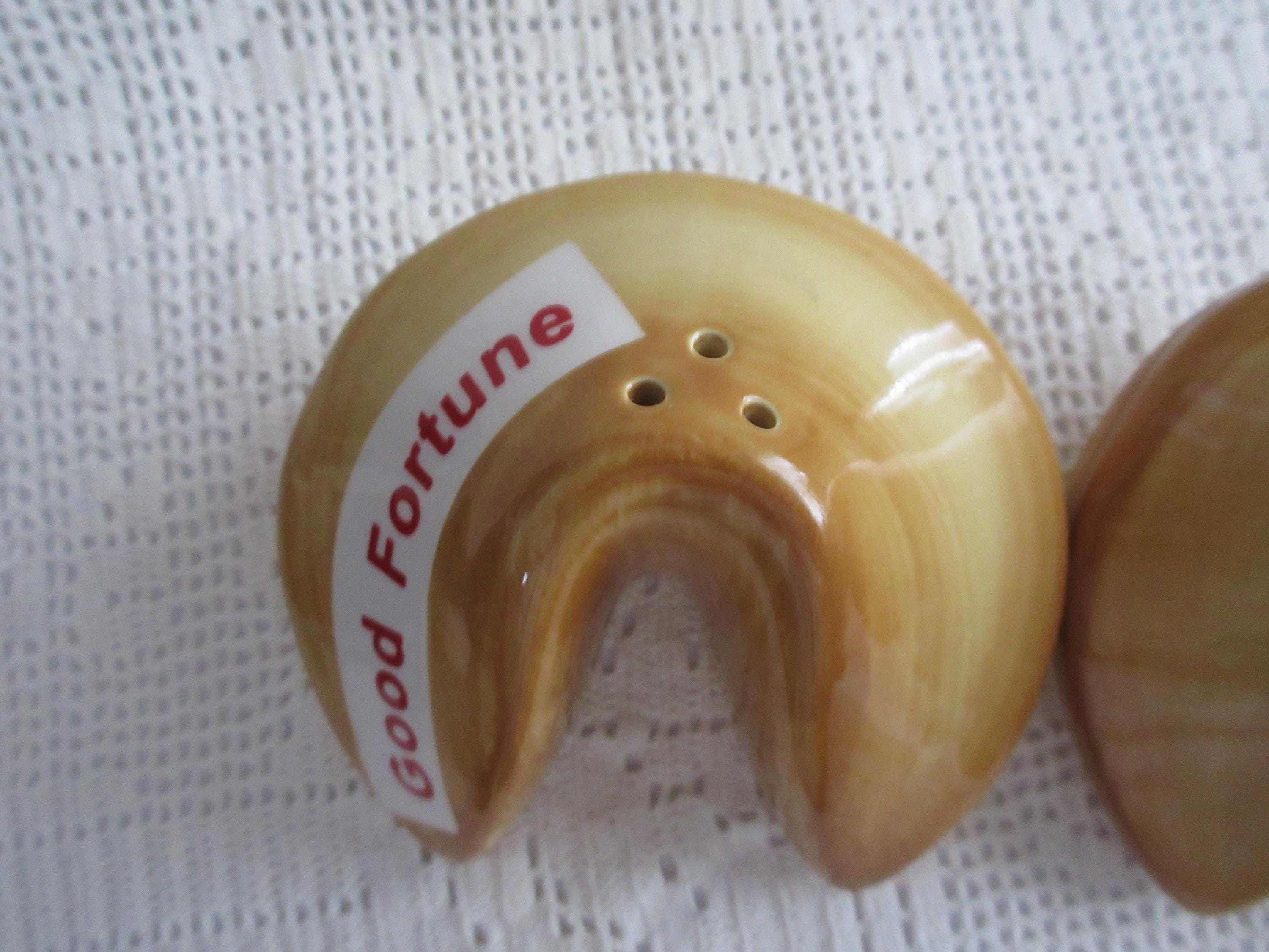 915 - These shakers are designed to look like fortune cookies. They are in excellent condition. One shaker has the words "Bright Future" and the other "Good Fortune". The shakers are brown/light brown with the banners white and the words in red. The shakers are 3 inches wide and 2 inches tall. They both have rubber stopper and are not marked.
