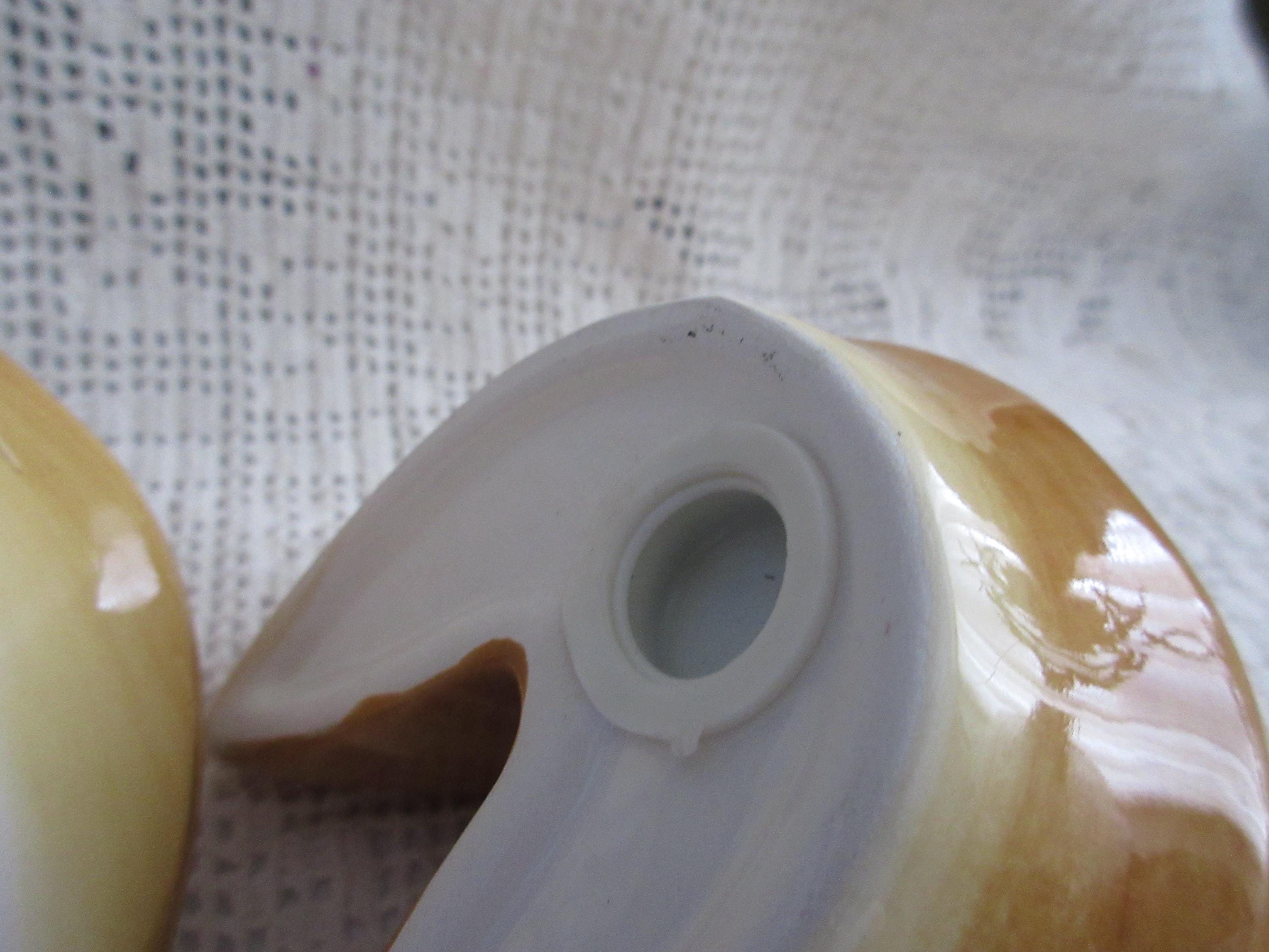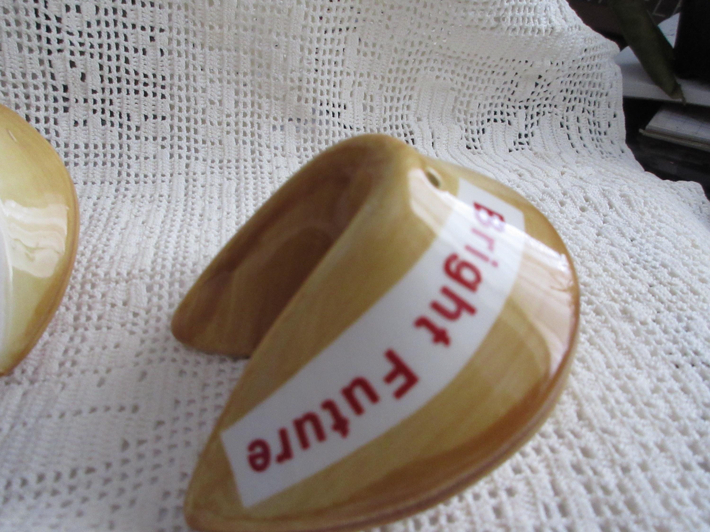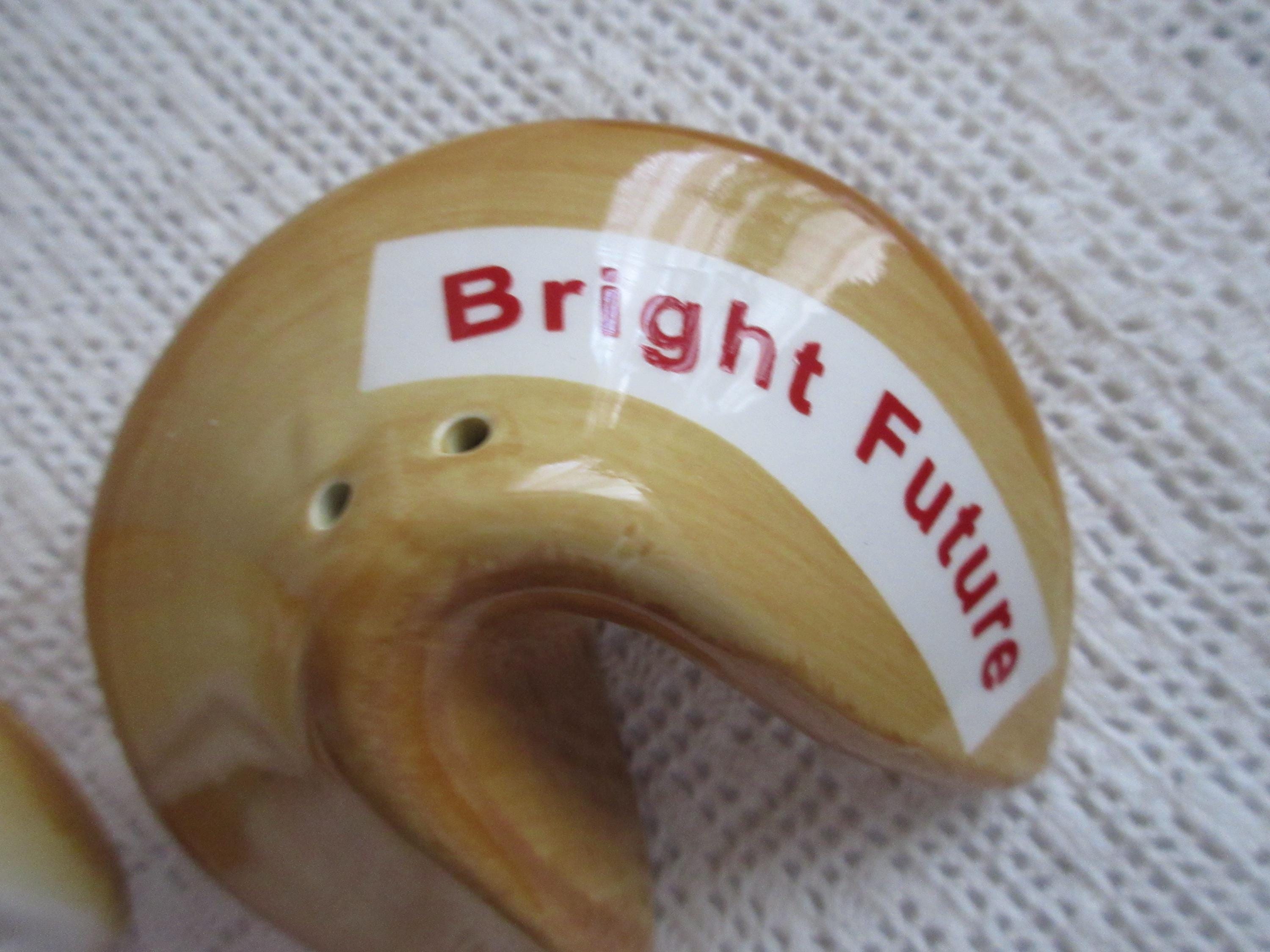 915 - These shakers are designed to look like fortune cookies. They are in excellent condition. One shaker has the words "Bright Future" and the other "Good Fortune". The shakers are brown/light brown with the banners white and the words in red. The shakers are 3 inches wide and 2 inches tall. They both have rubber stopper and are not marked.