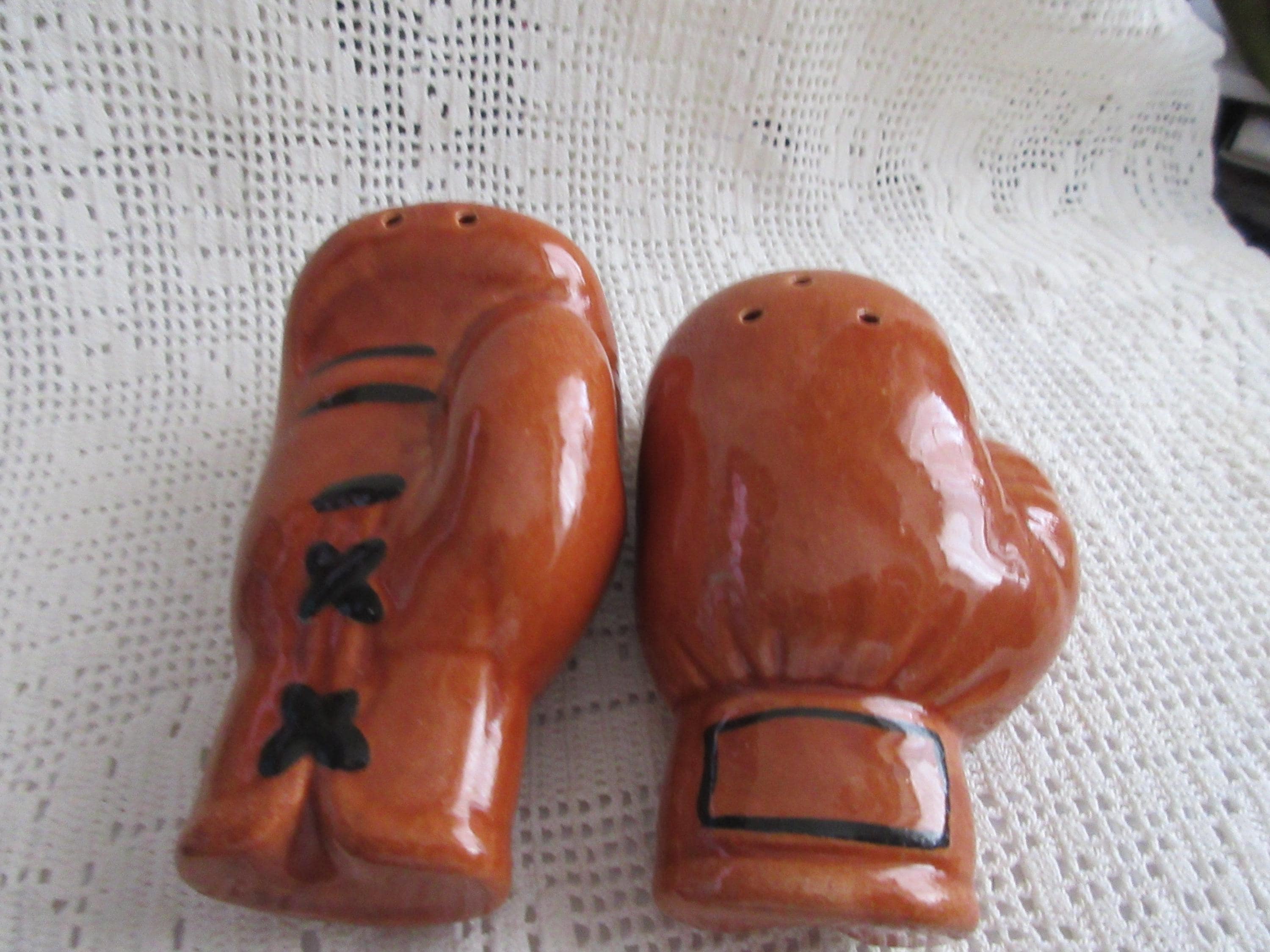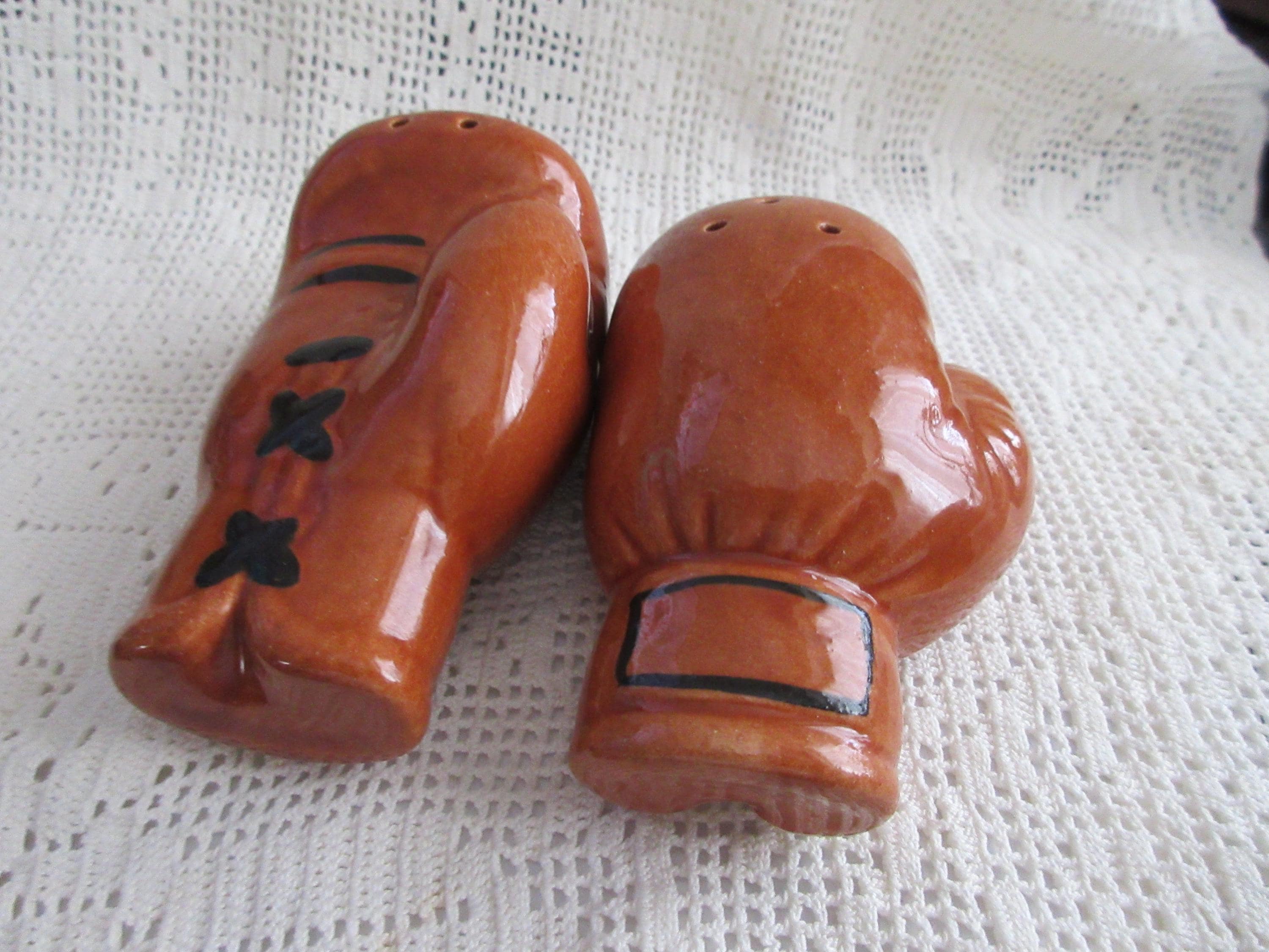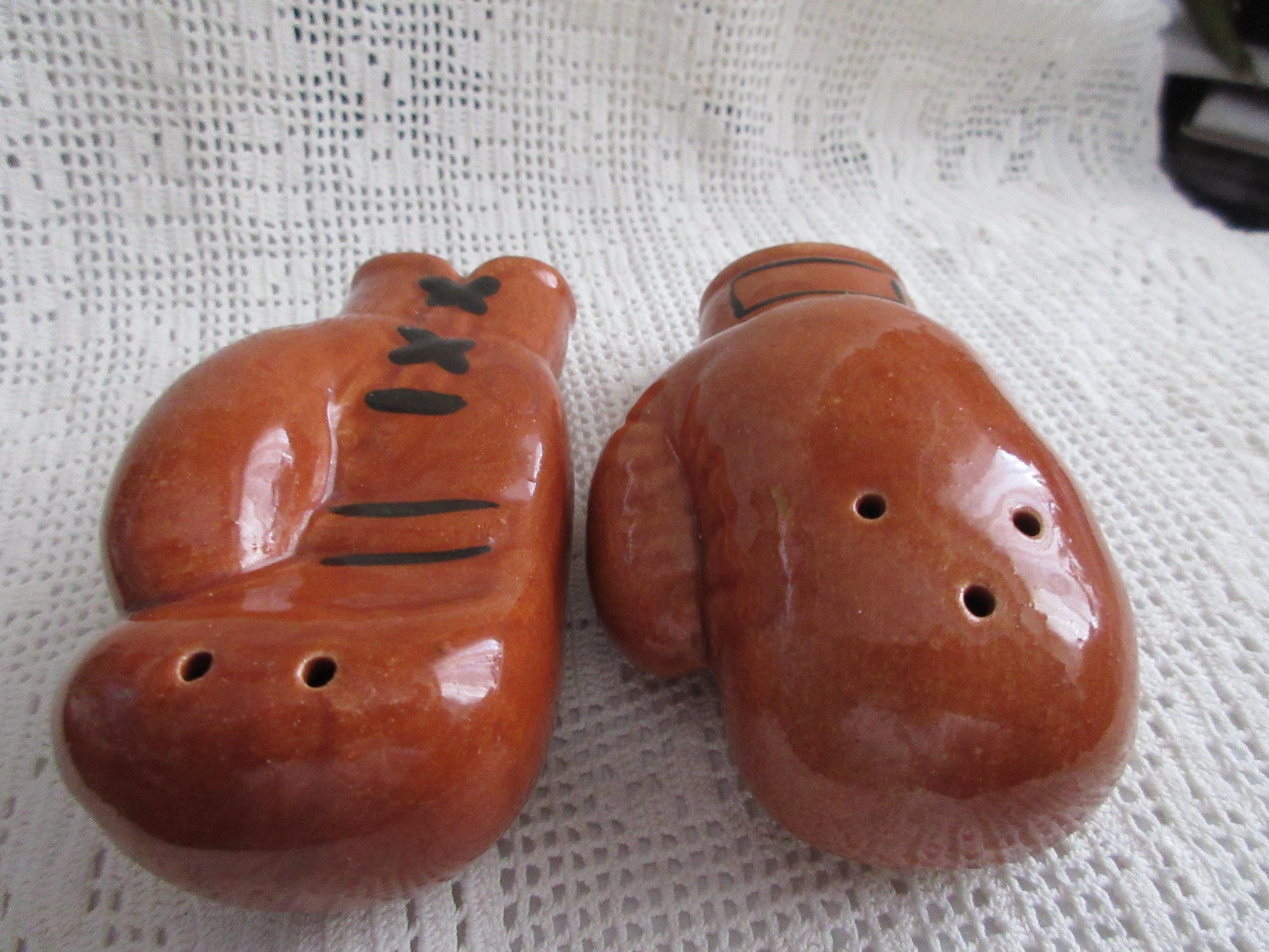 125 - This set of salt and pepper shakers are like new. The gloves are brown with dark brown laces. There are no cracks or chips on the shakers. These shaker are 3.25 inches tall, have no stoppers or markings.