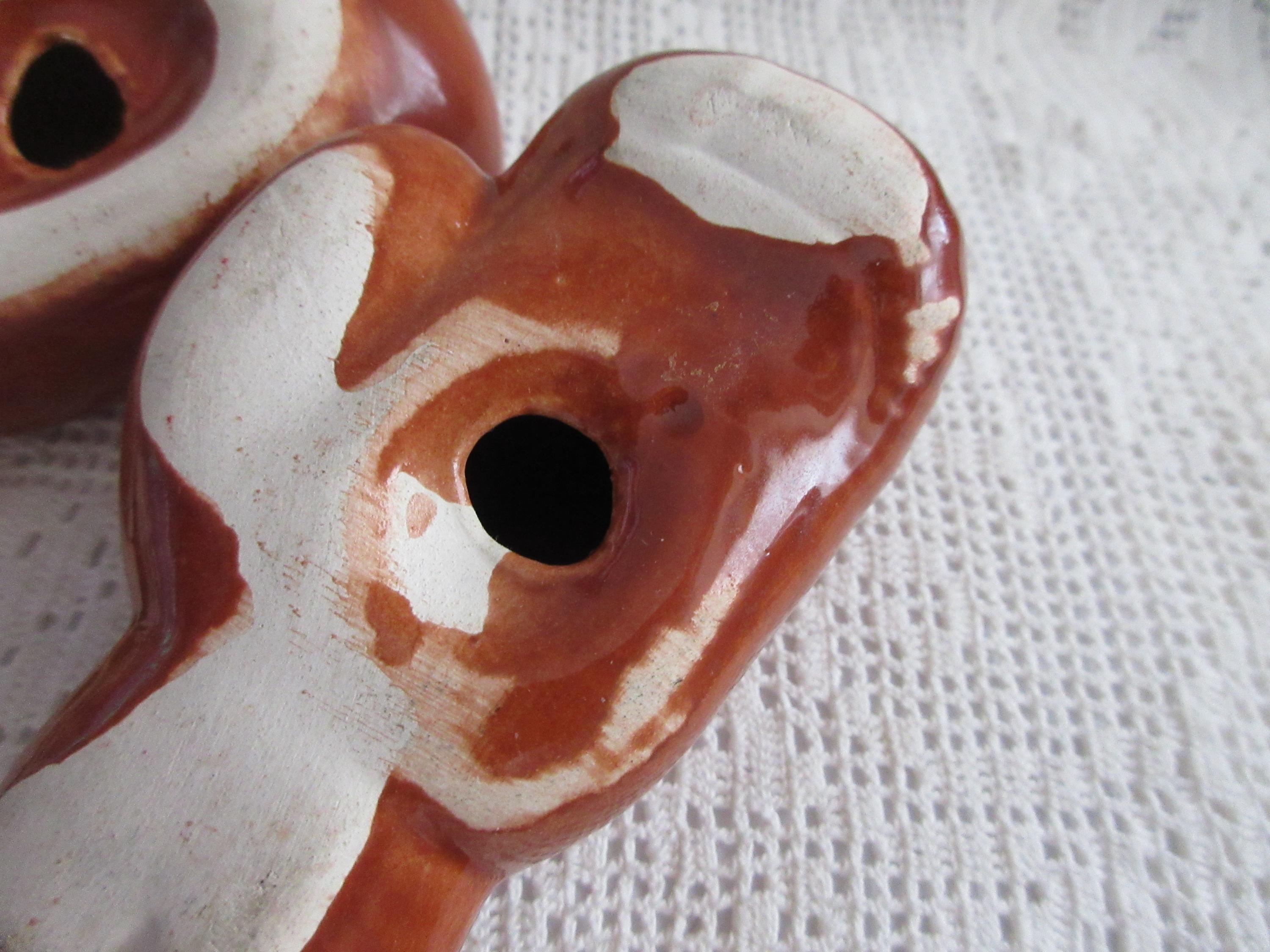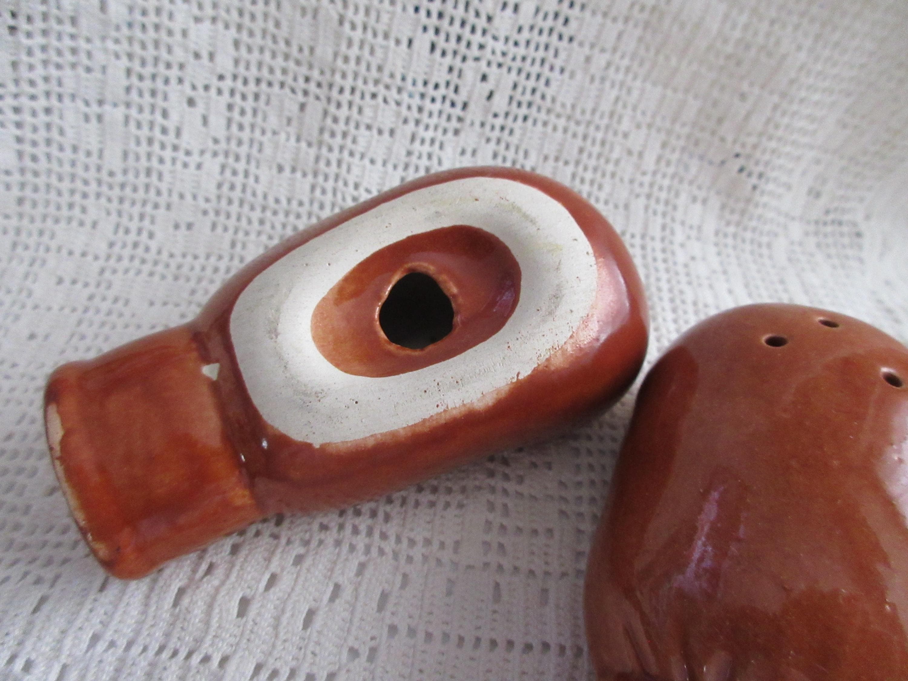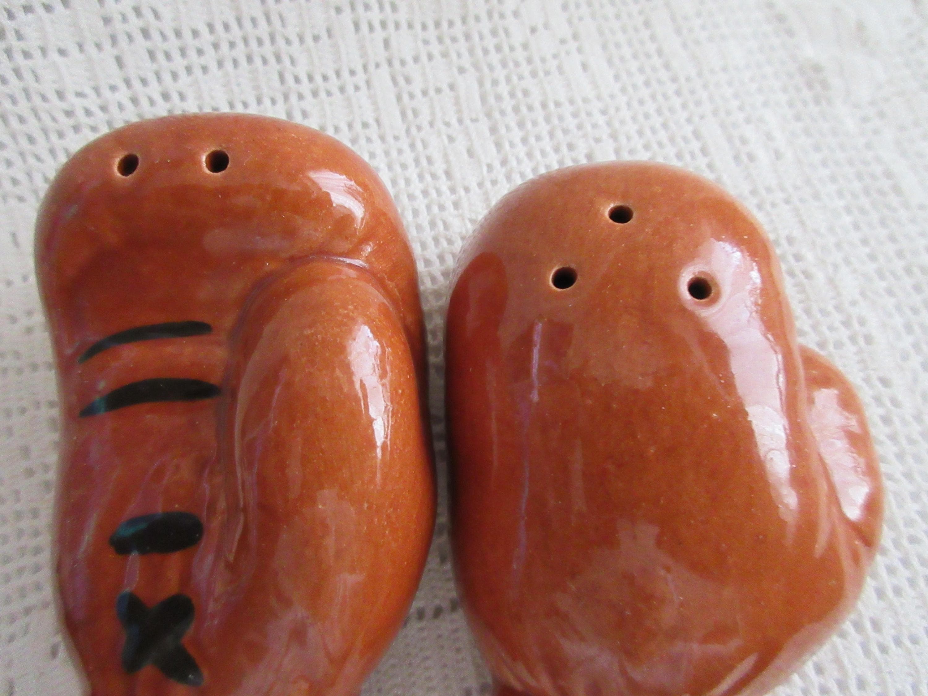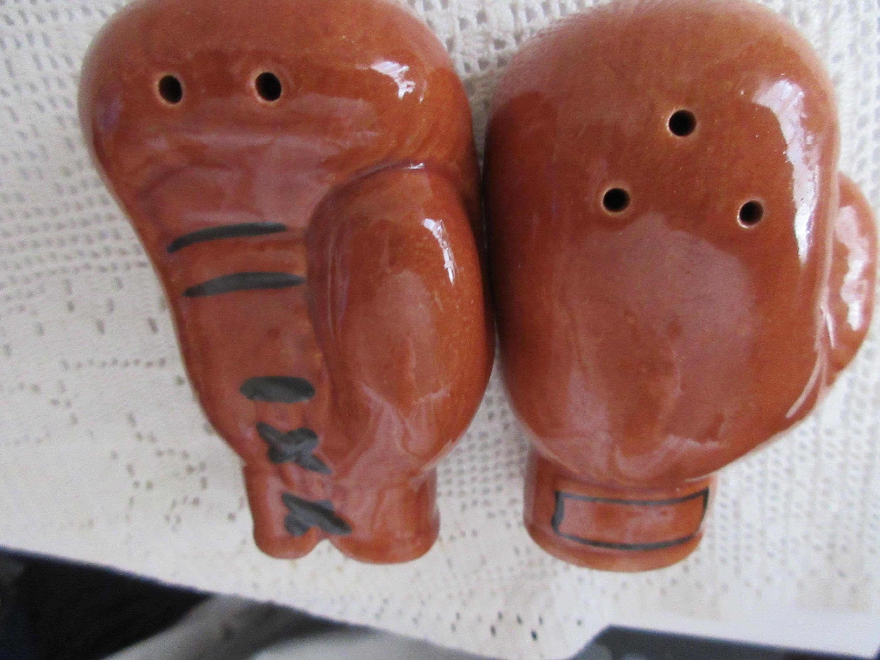 125 - This set of salt and pepper shakers are like new. The gloves are brown with dark brown laces. There are no cracks or chips on the shakers. These shaker are 3.25 inches tall, have no stoppers or markings.