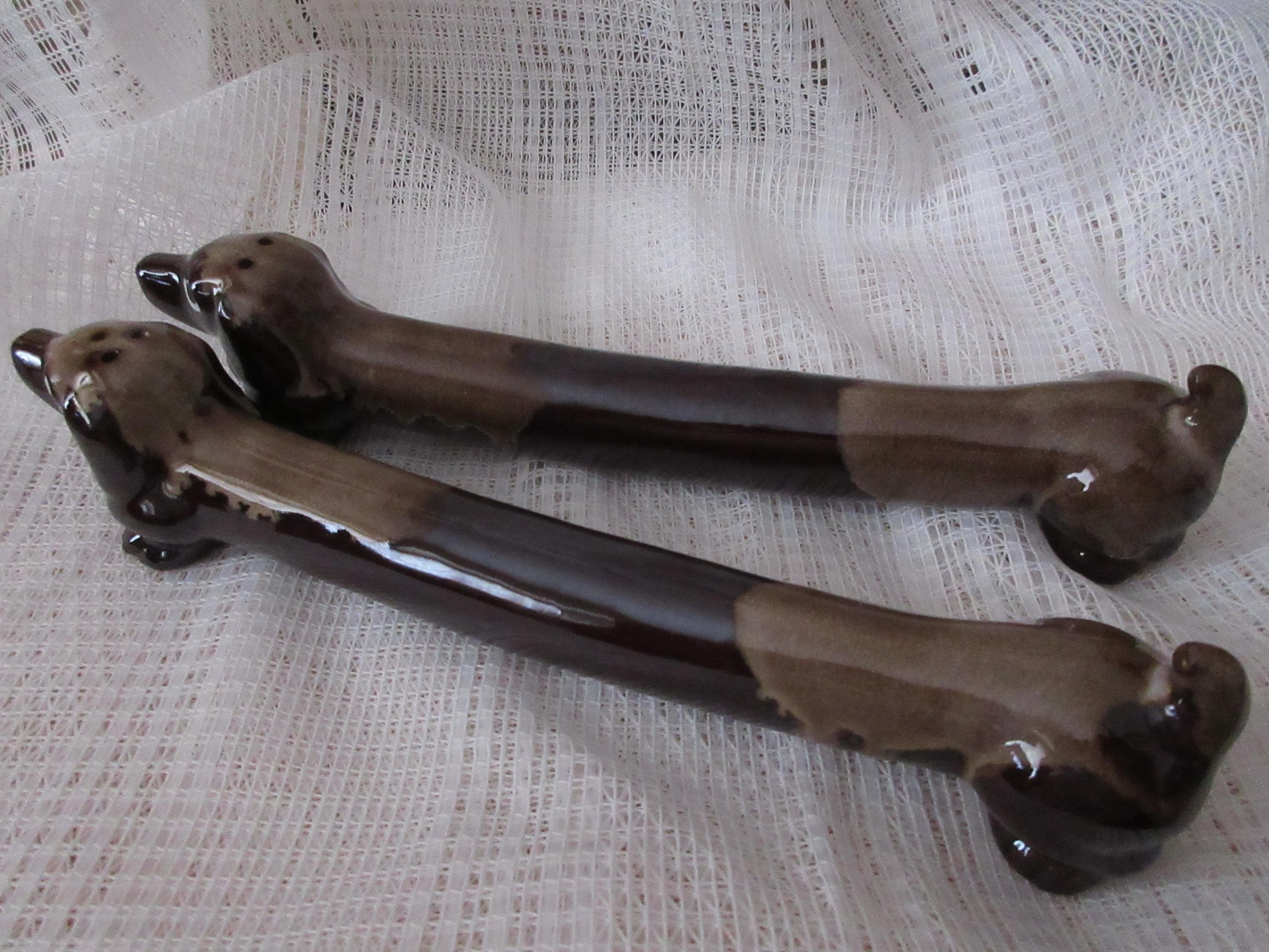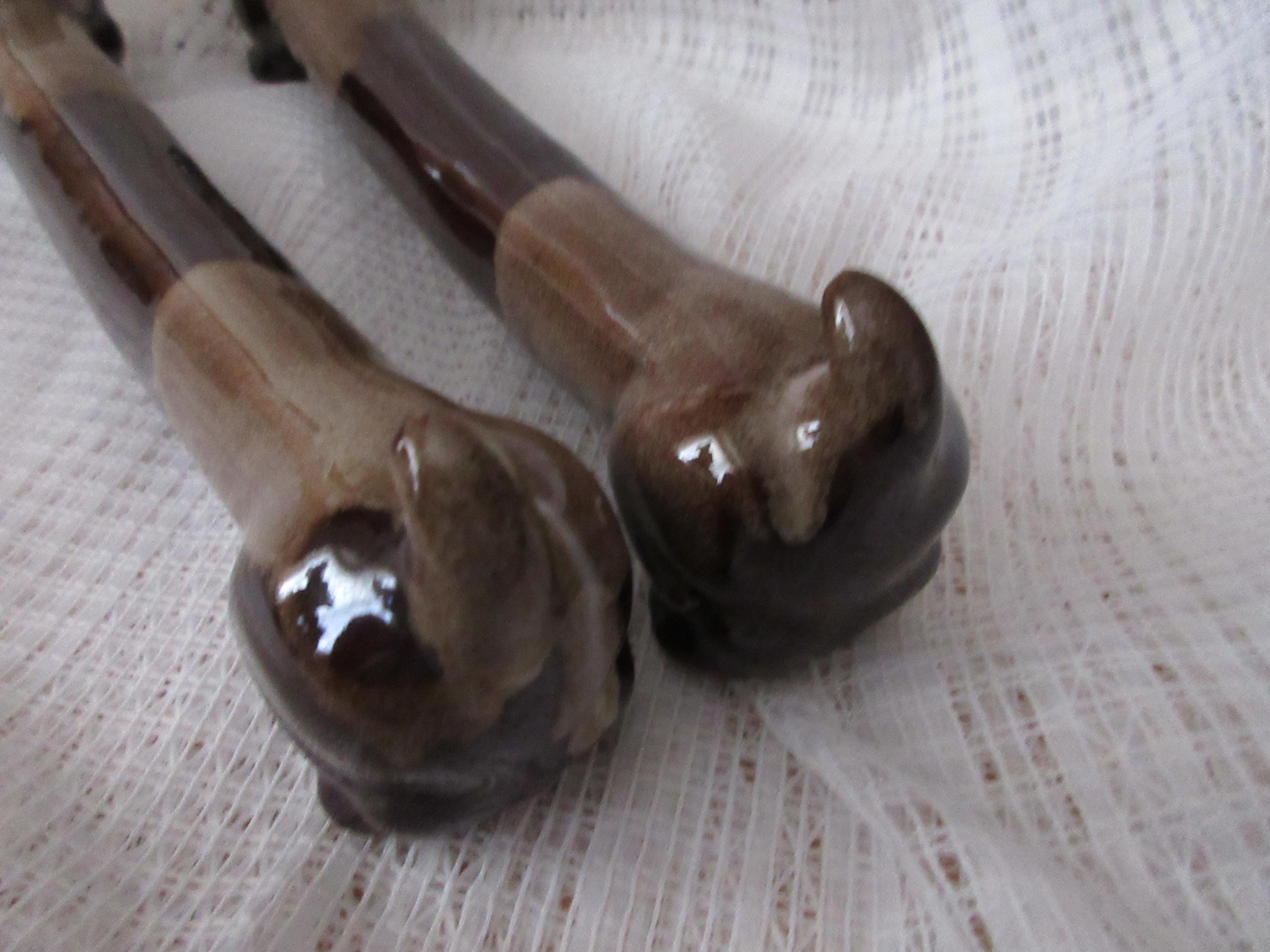 The dogs are brown with lighter color on the backs and hind end. Their eyes are white and black and they both look very curious. Each dog is 9.25 inches long.