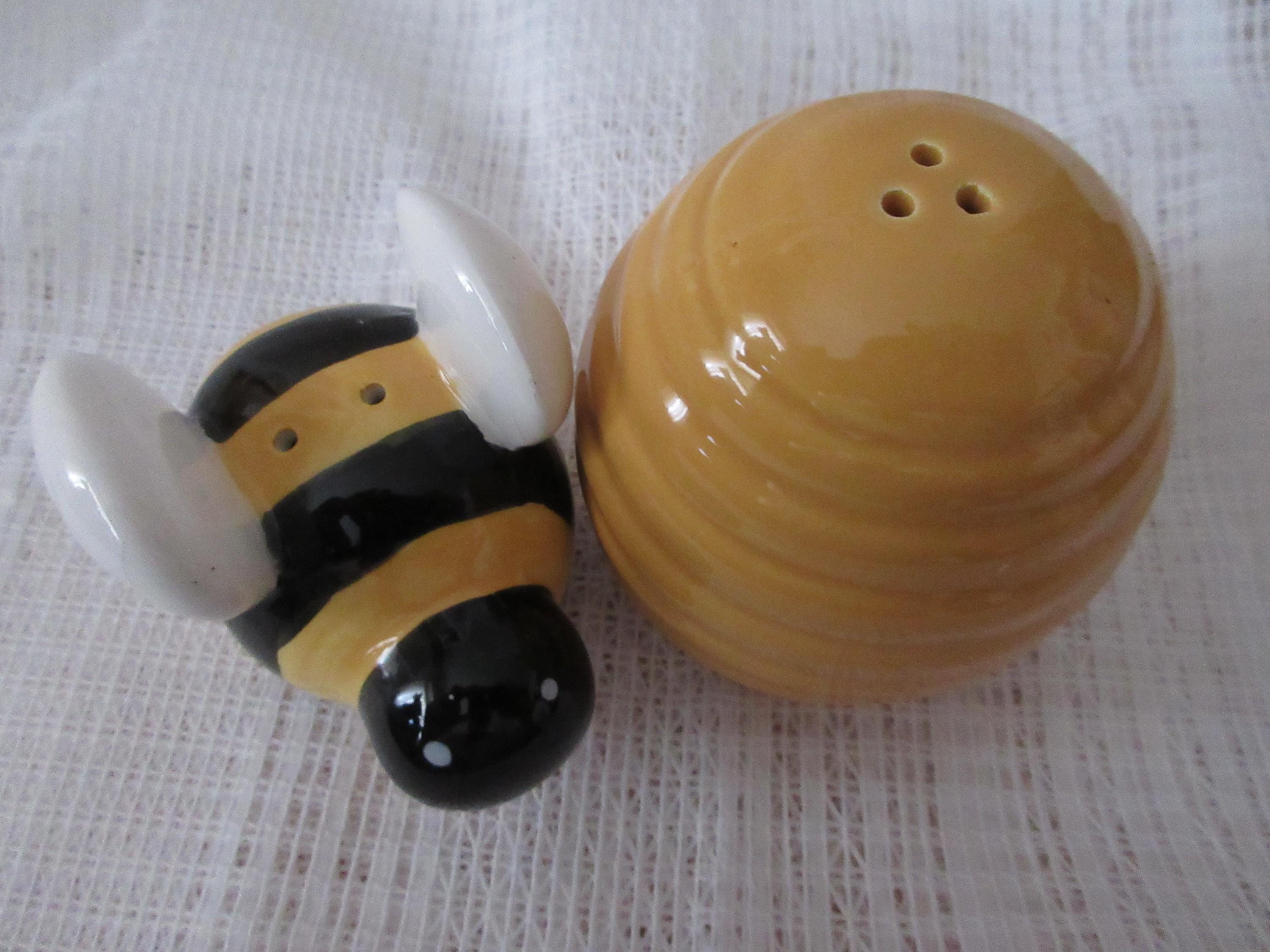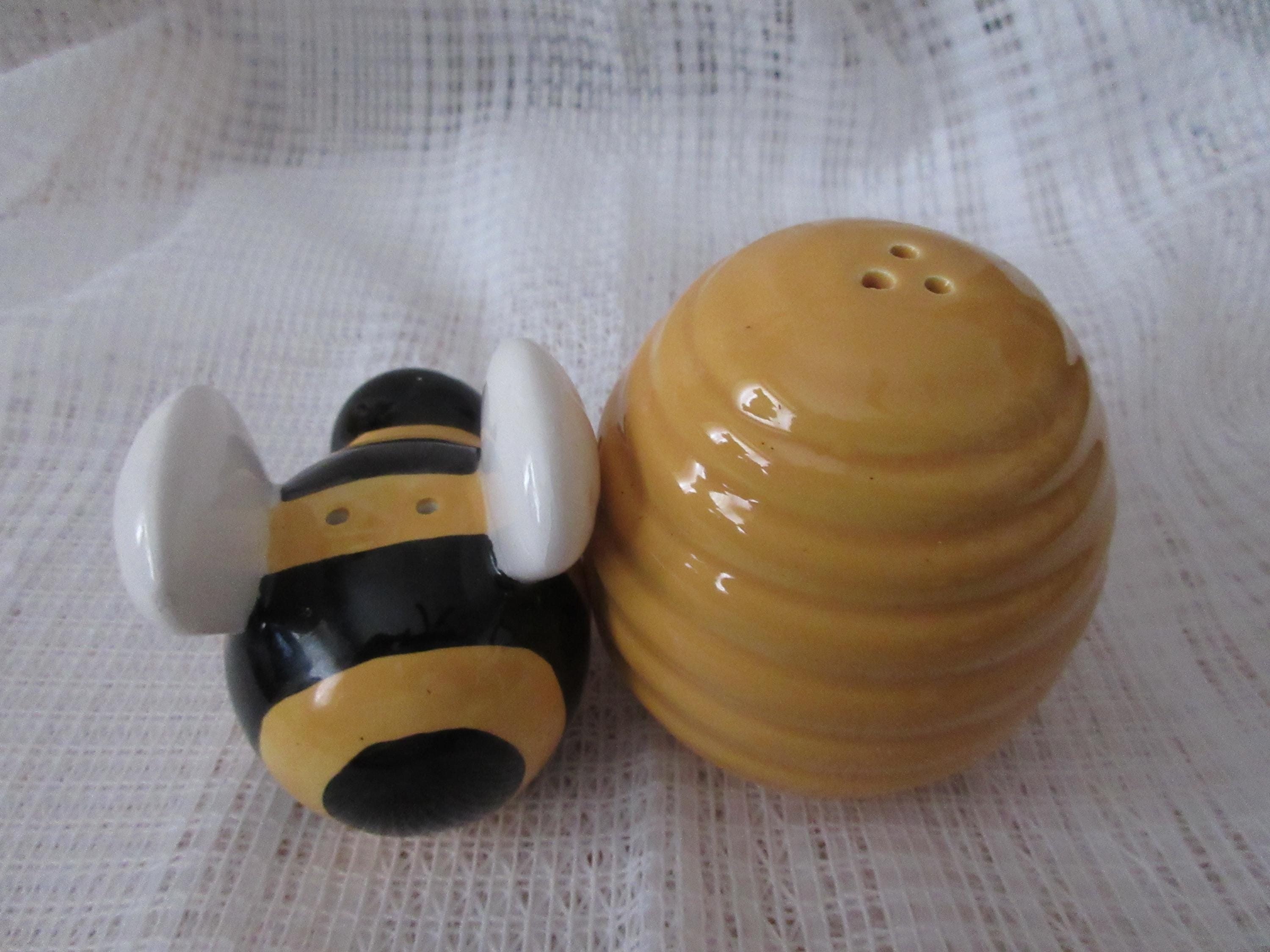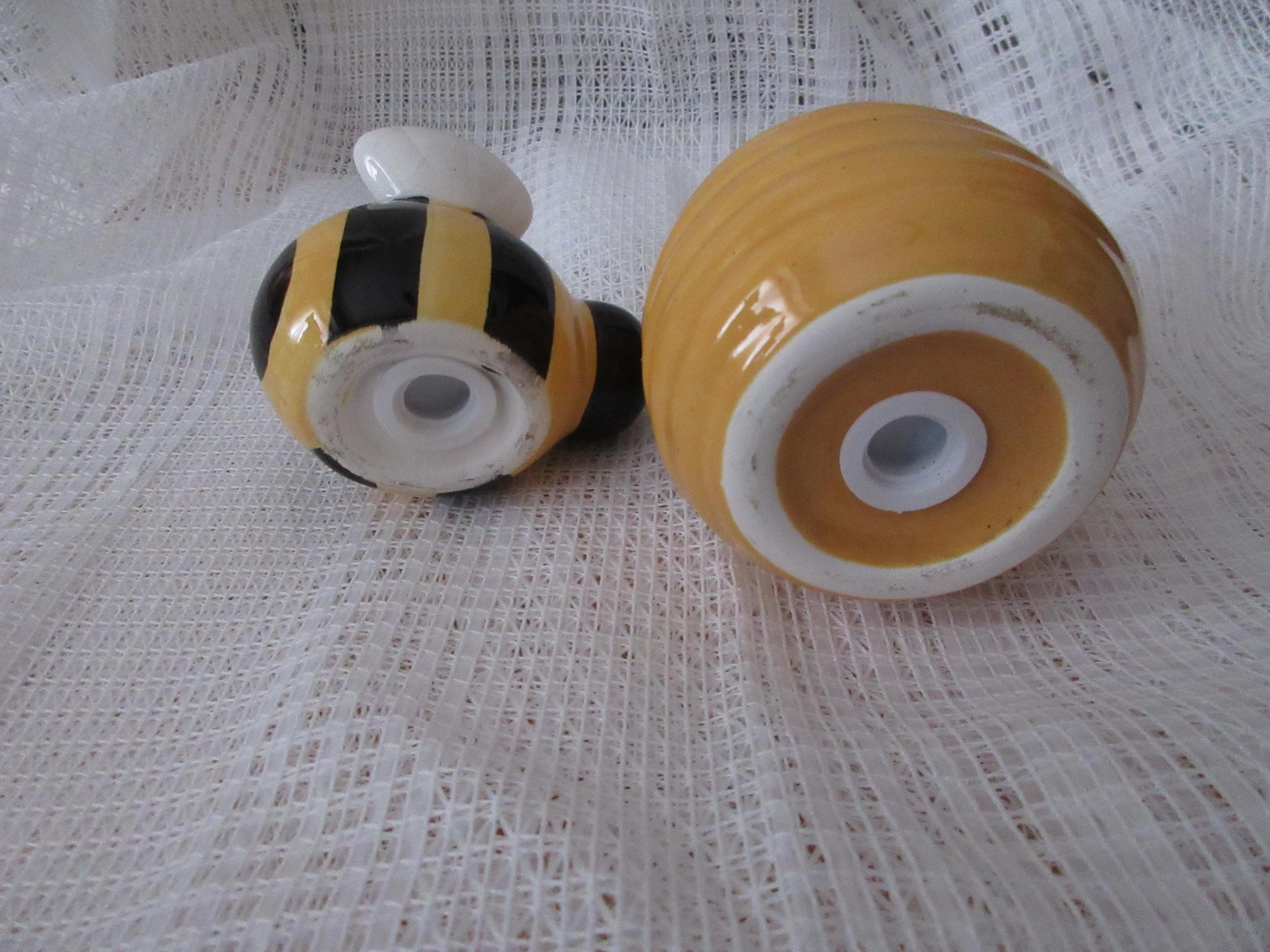1306 - This set of salt and pepper shakers are in very good condition. The bee is yellow and black striped with white wings. There are no chips or cracks on this shaker. It measures 2.25 inches tall, has a plastic stopper but no markings. The hive is yellow. This shaker also has no chips or cracks. It measures 2.75 inches tall and has a rubber stopper but no markings.