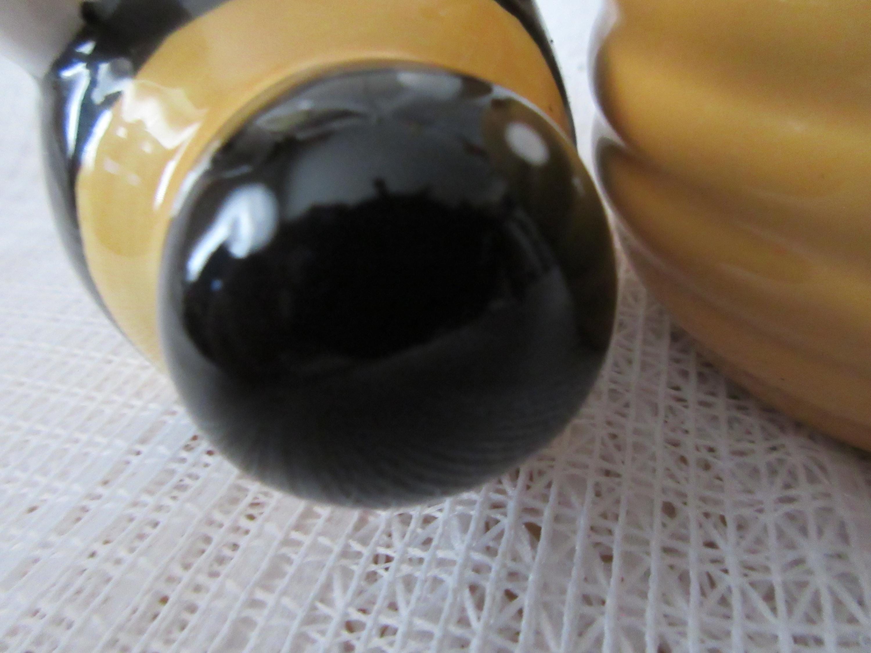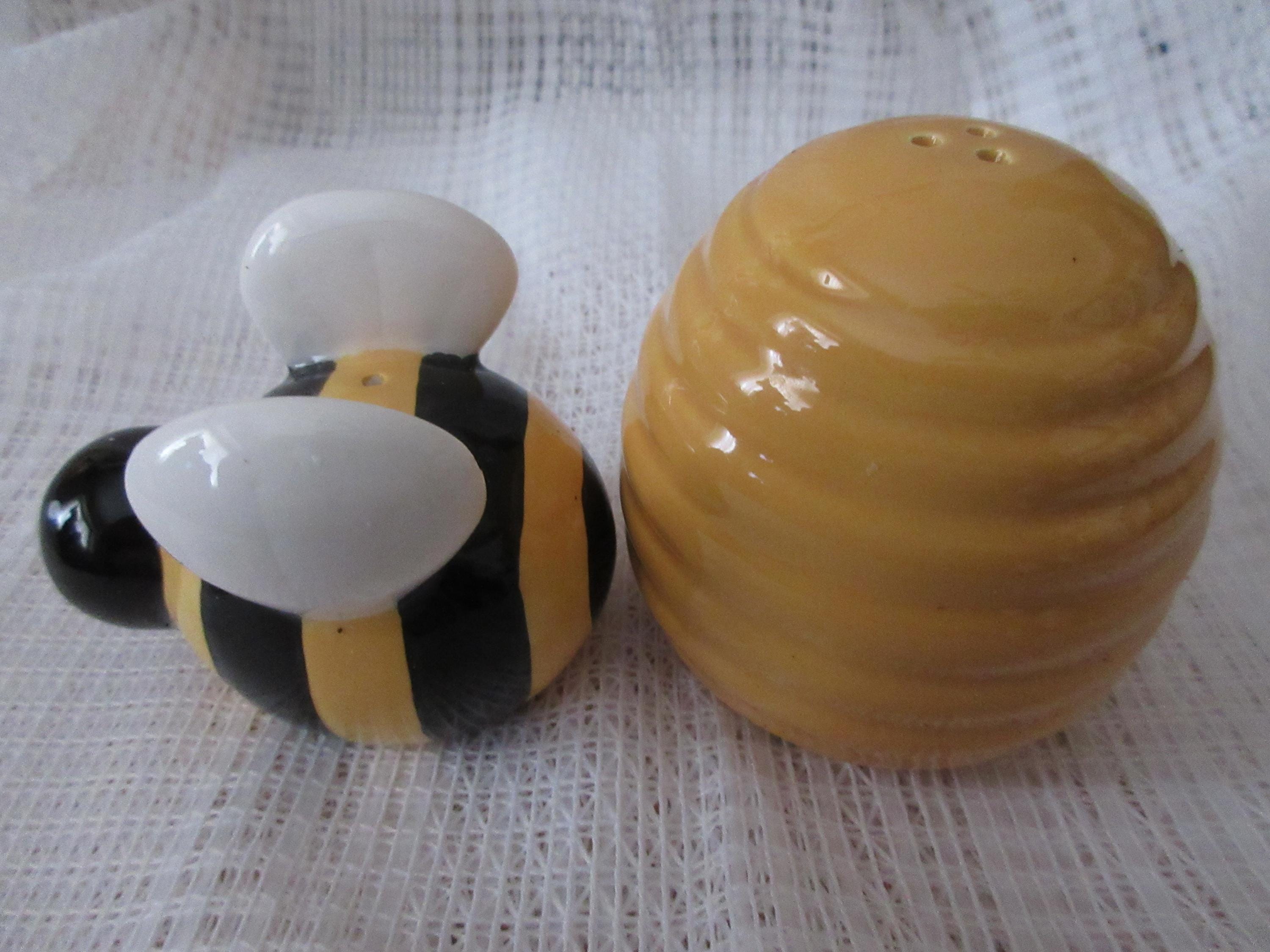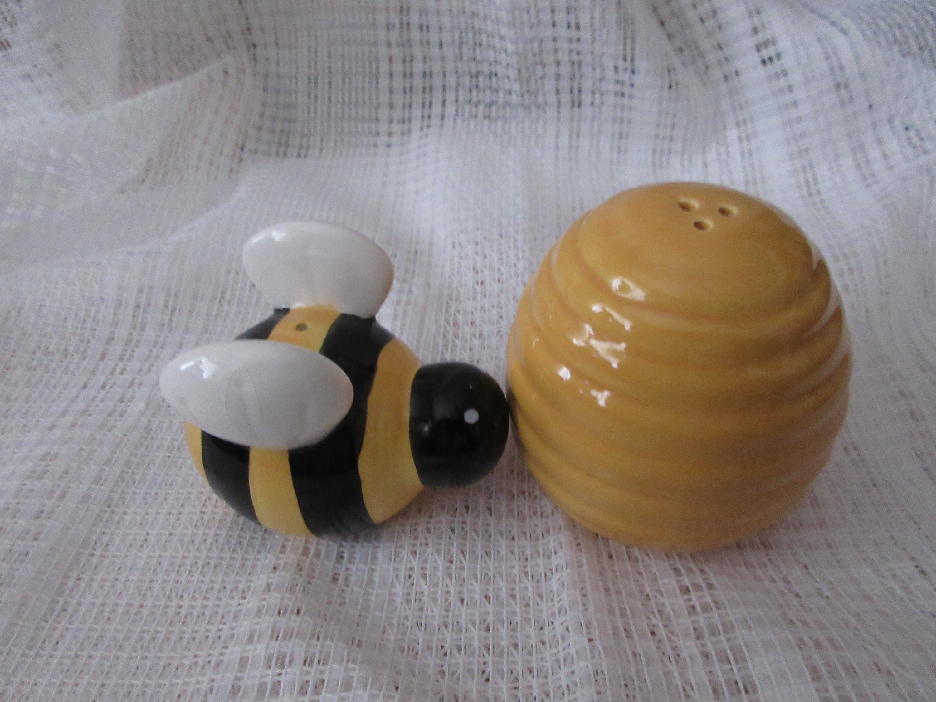 1306 - This set of salt and pepper shakers are in very good condition. The bee is yellow and black striped with white wings. There are no chips or cracks on this shaker. It measures 2.25 inches tall, has a plastic stopper but no markings. The hive is yellow. This shaker also has no chips or cracks. It measures 2.75 inches tall and has a rubber stopper but no markings.