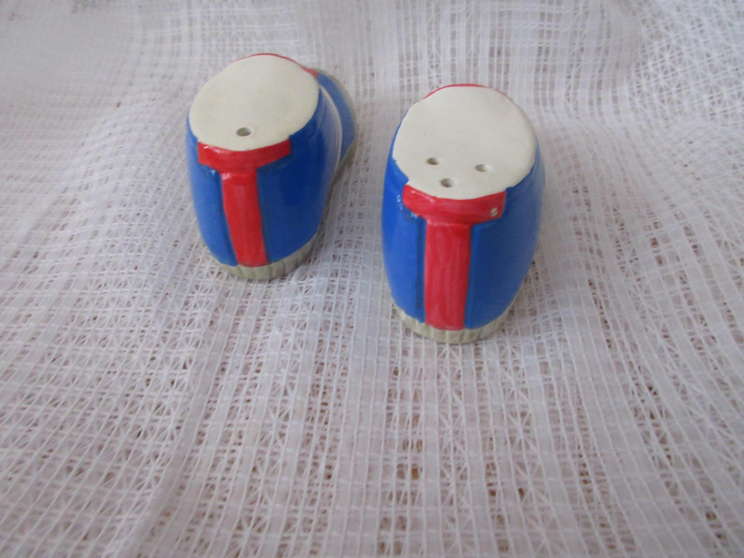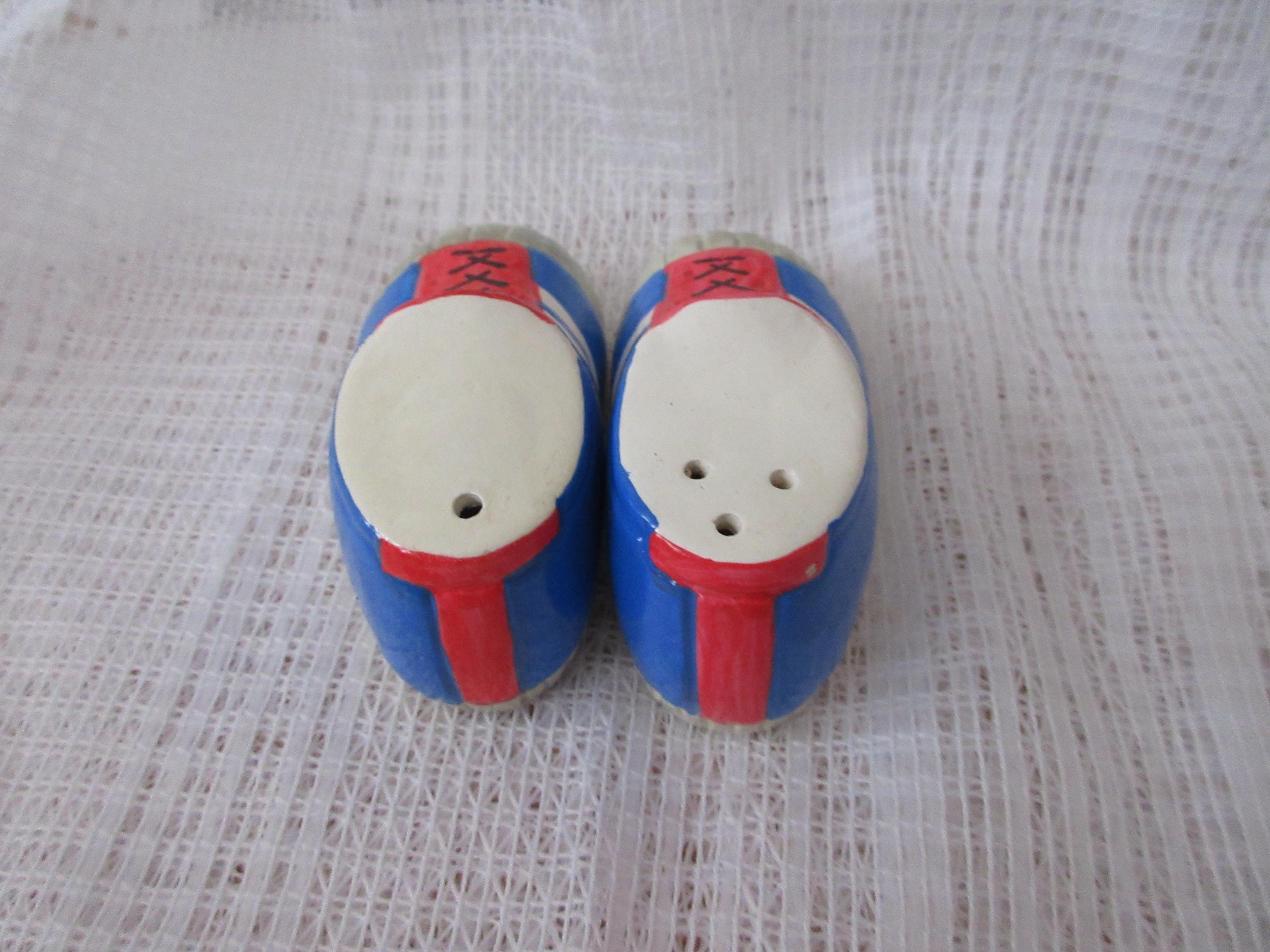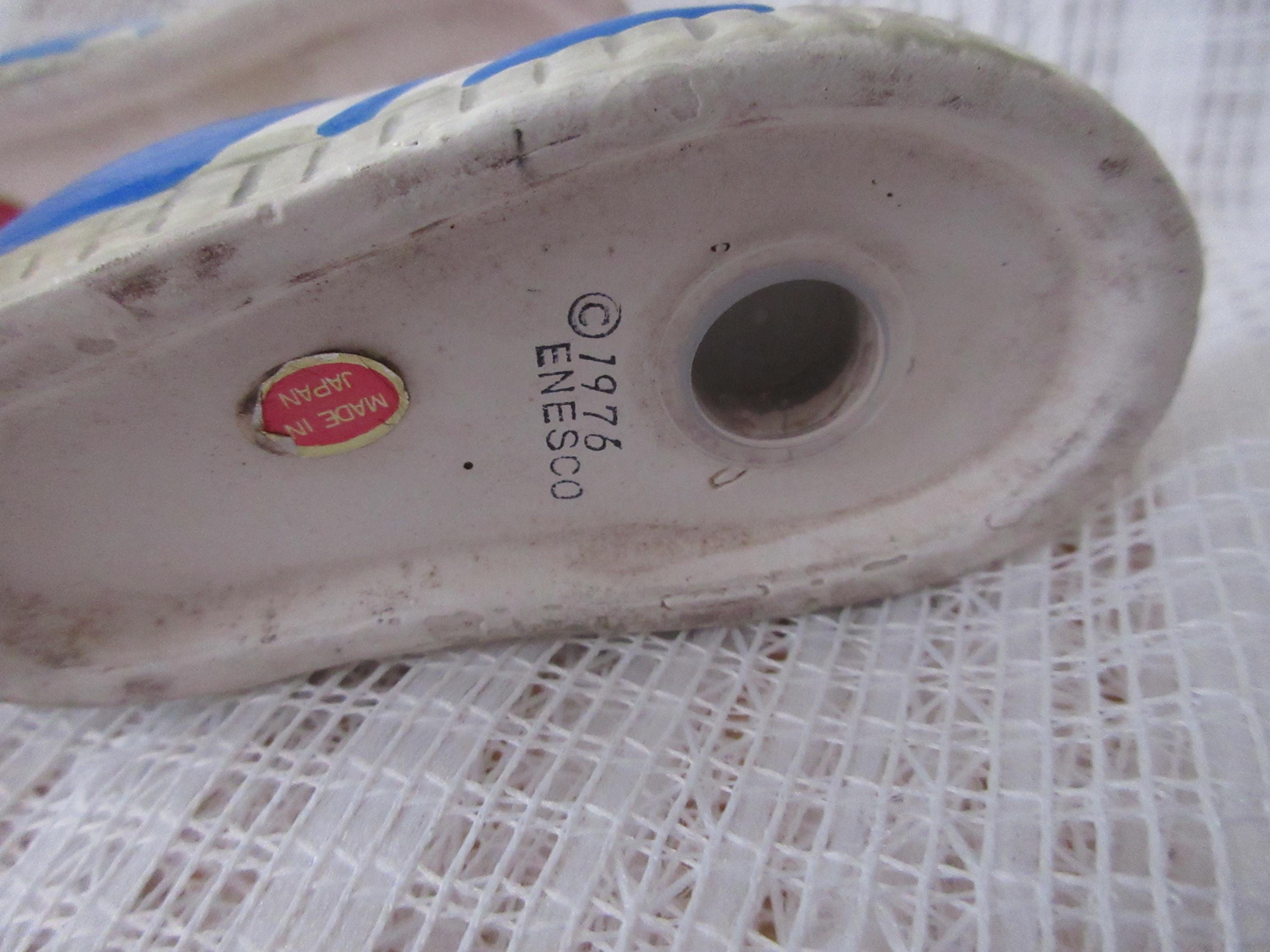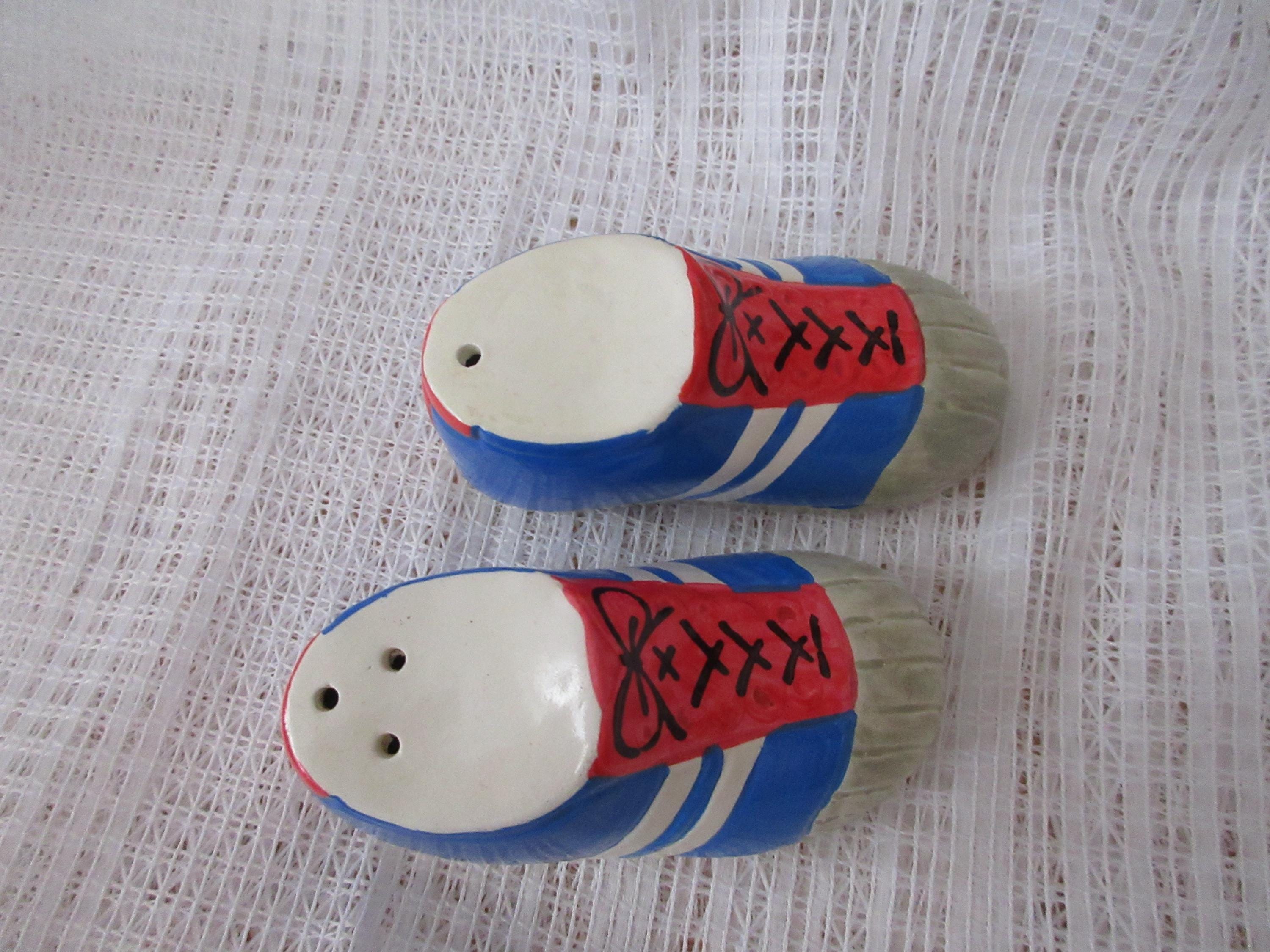 524 - These shakers are used but in good condition. The shoes have a gray toe, orange panel with black laces. The main part of the shoe is blue with white stripes. These shakers are made by Enesco dated 1976. Each shoe is 1.75 inches tall and 3.25 inches long. They are marked Enesco.