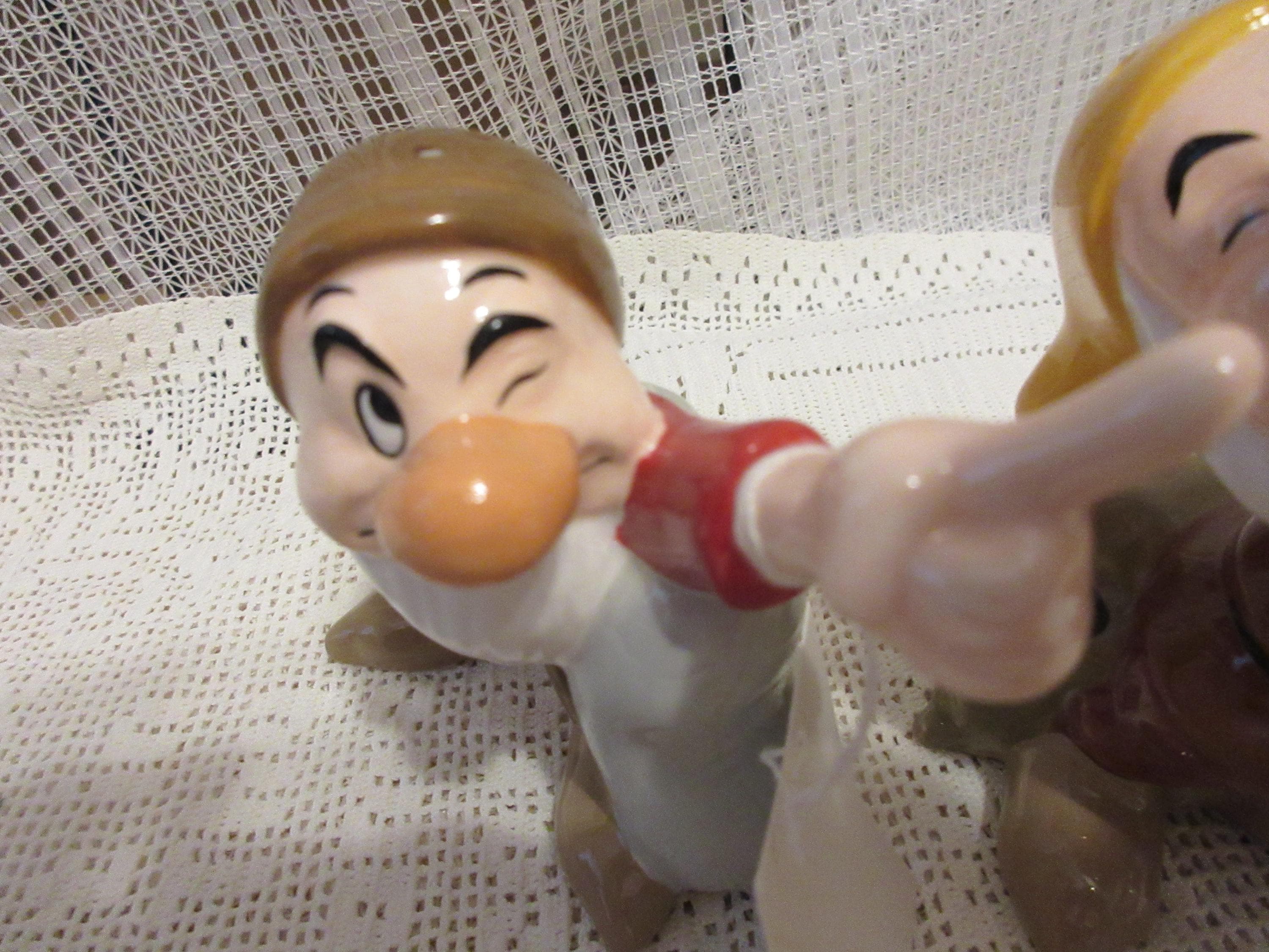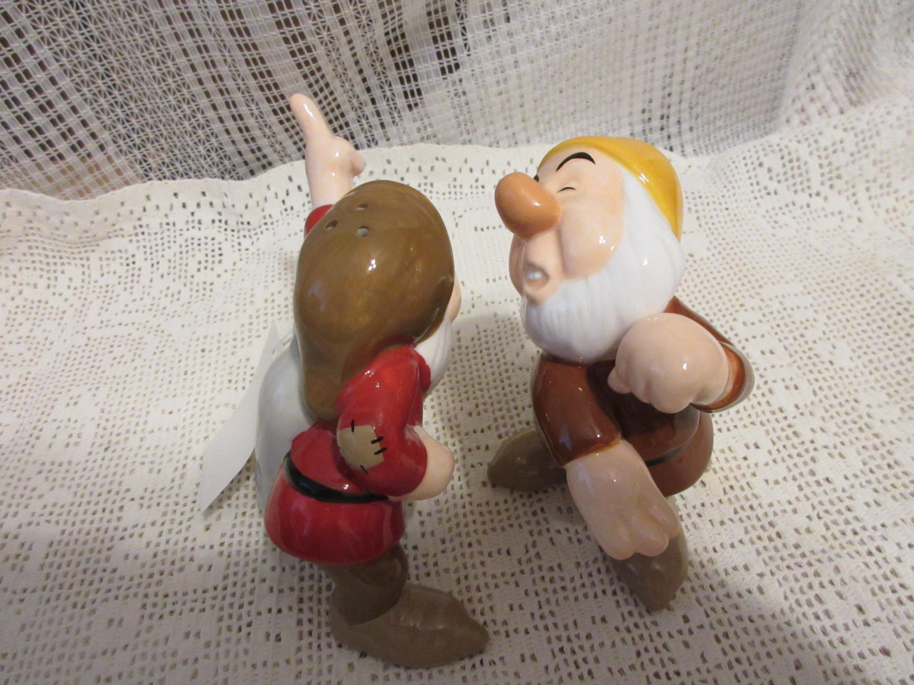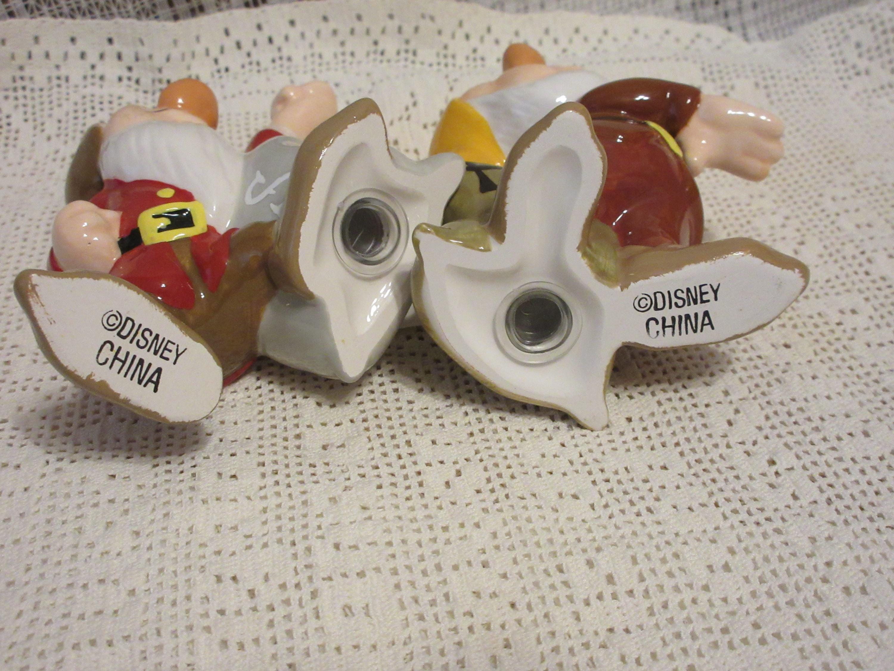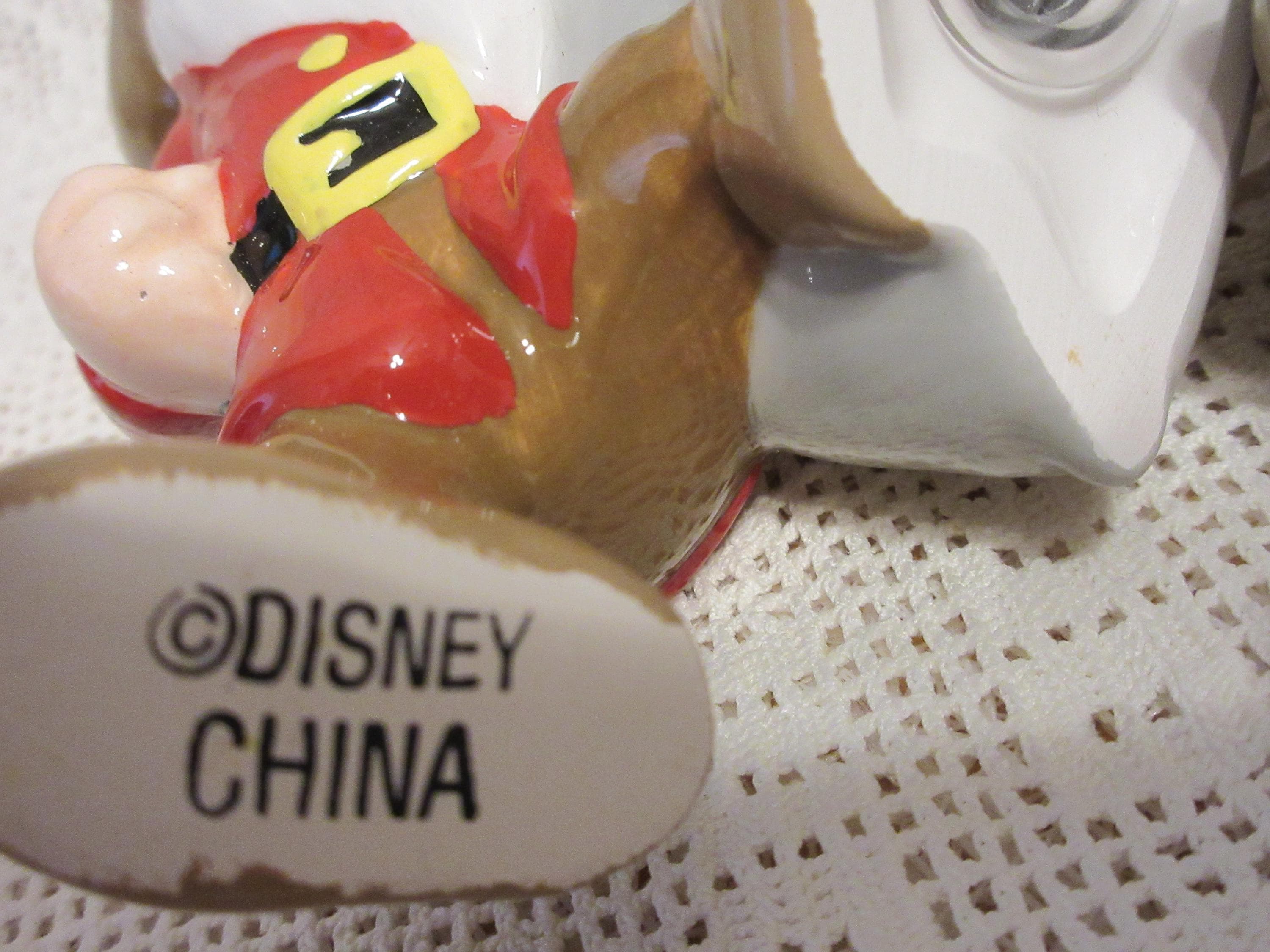 Grumpy is wearing a brown hat, red jacket and brown pants and shoes. He has a white beard and the bag he has under his arm has a "S" on it. He has a big frown on his face and has his finger under Sneezy's nose. This shaker is 4 inches tall from the bottom to the tip of his finger. He has a cork stopper and the shaker is marked ©Disney China.