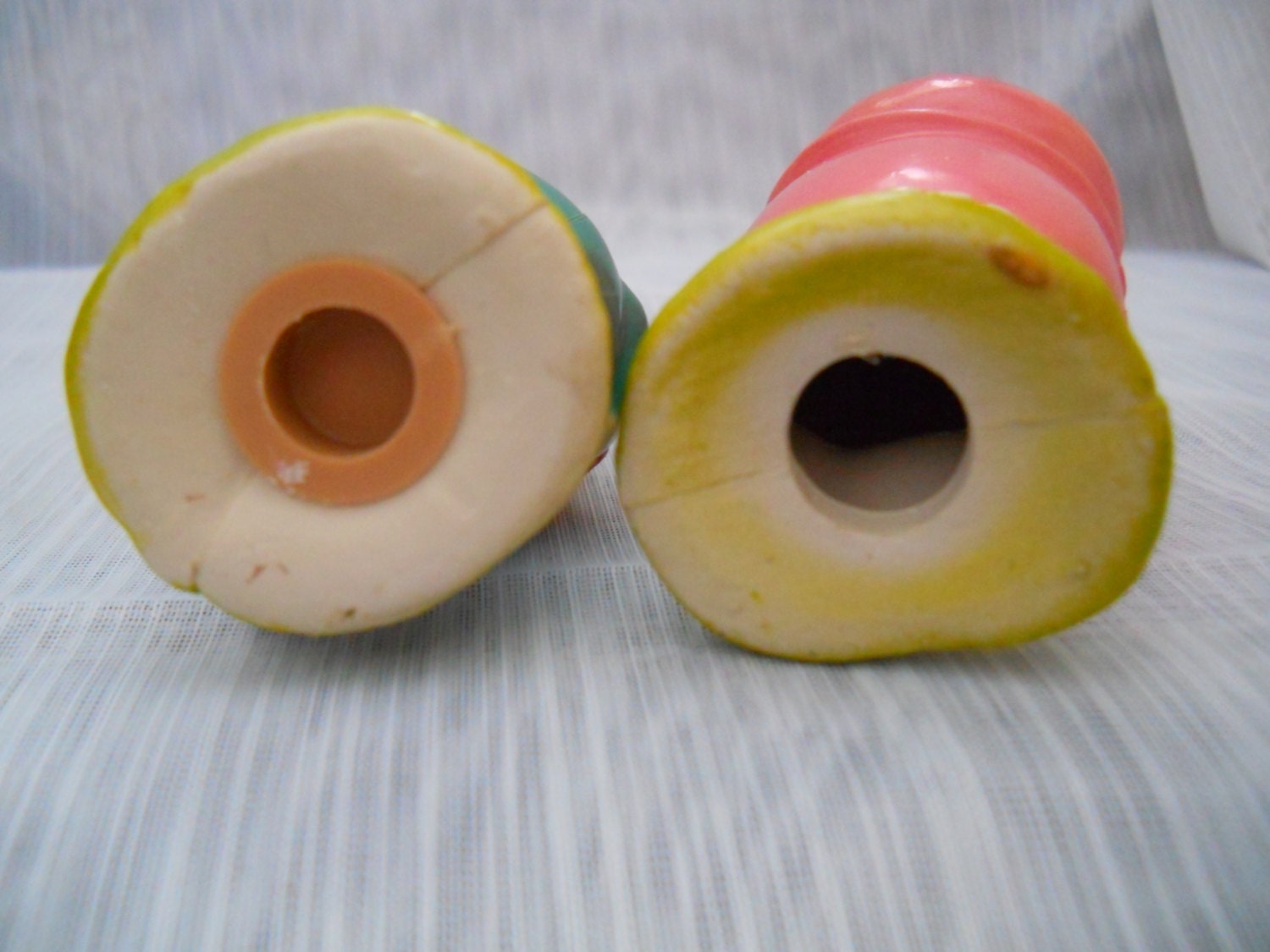 The other shaker has on a pink bonnet with green bow. She is wearing a pink dress with pink shoes. In her right hand she is carrying a red purse. This shaker is also 3 1/4 inches tall, has NO stopper and NO markings.