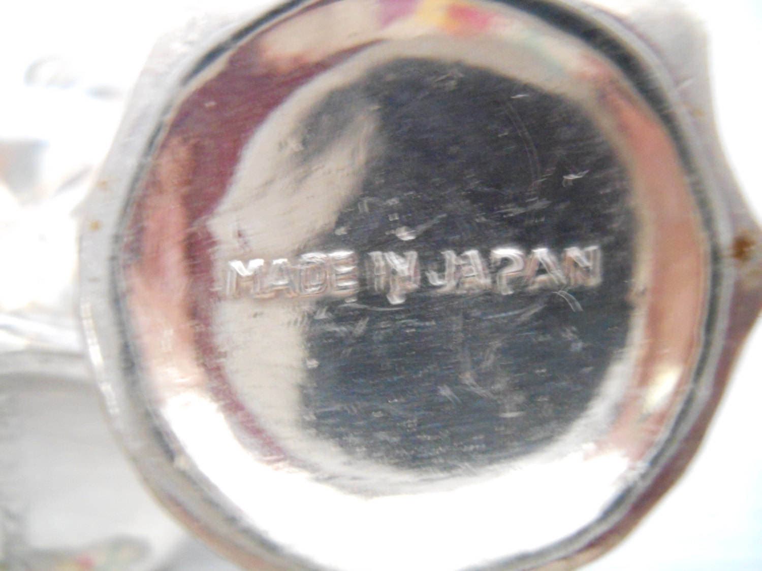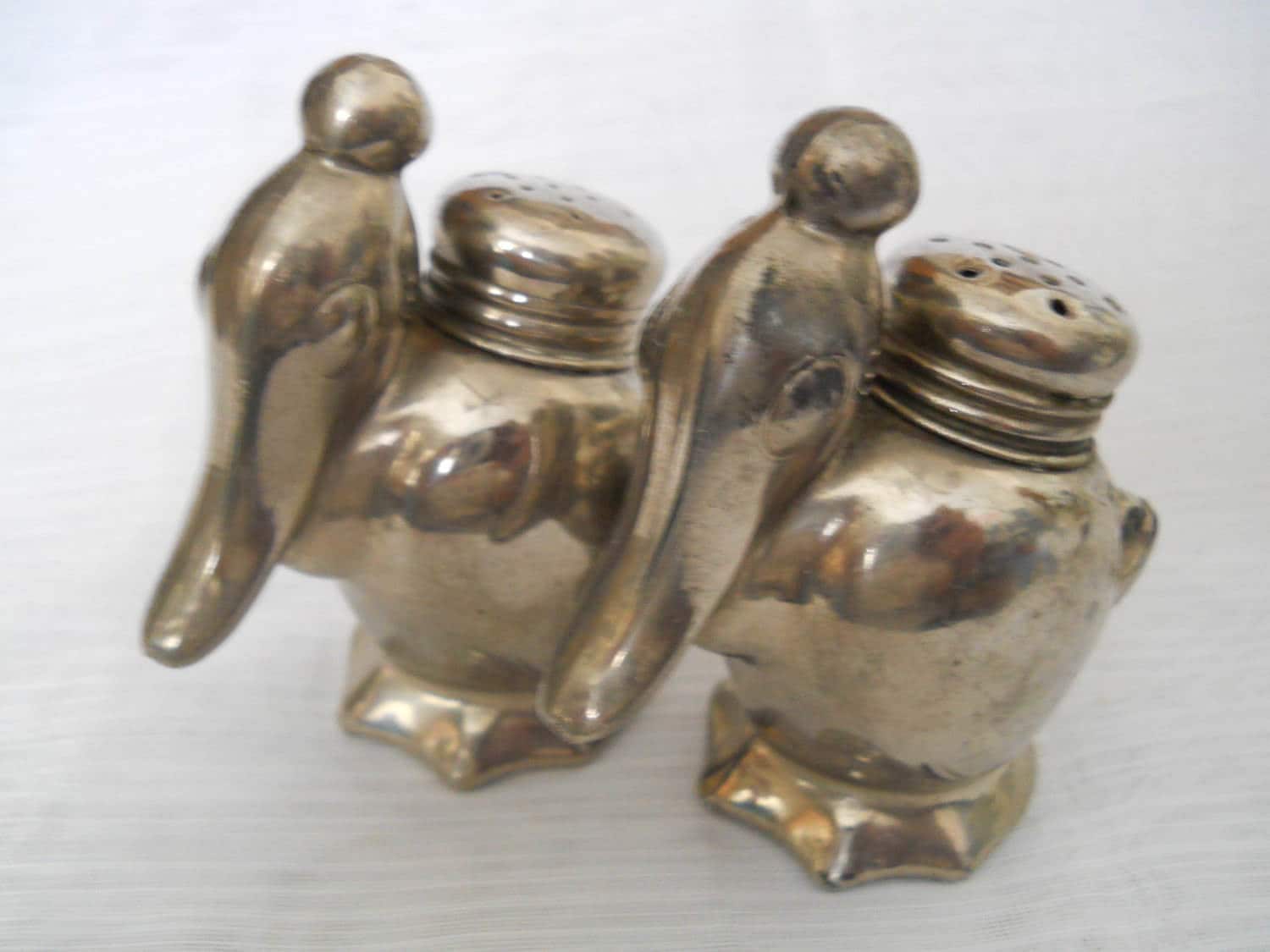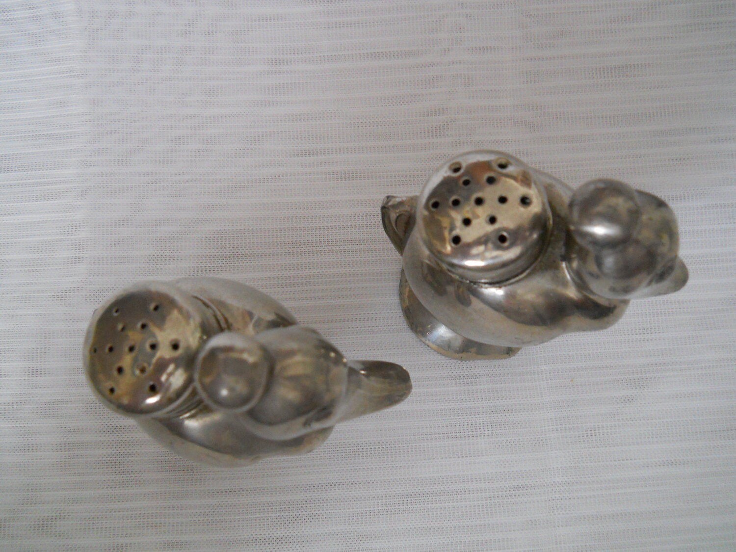 Both birds are silver with the shaker top on the back of each bird. The tops of the shaker unscrew for filling. Both birds are 2 3/4 inches tall and are marked on the bottom "Made in Japan."