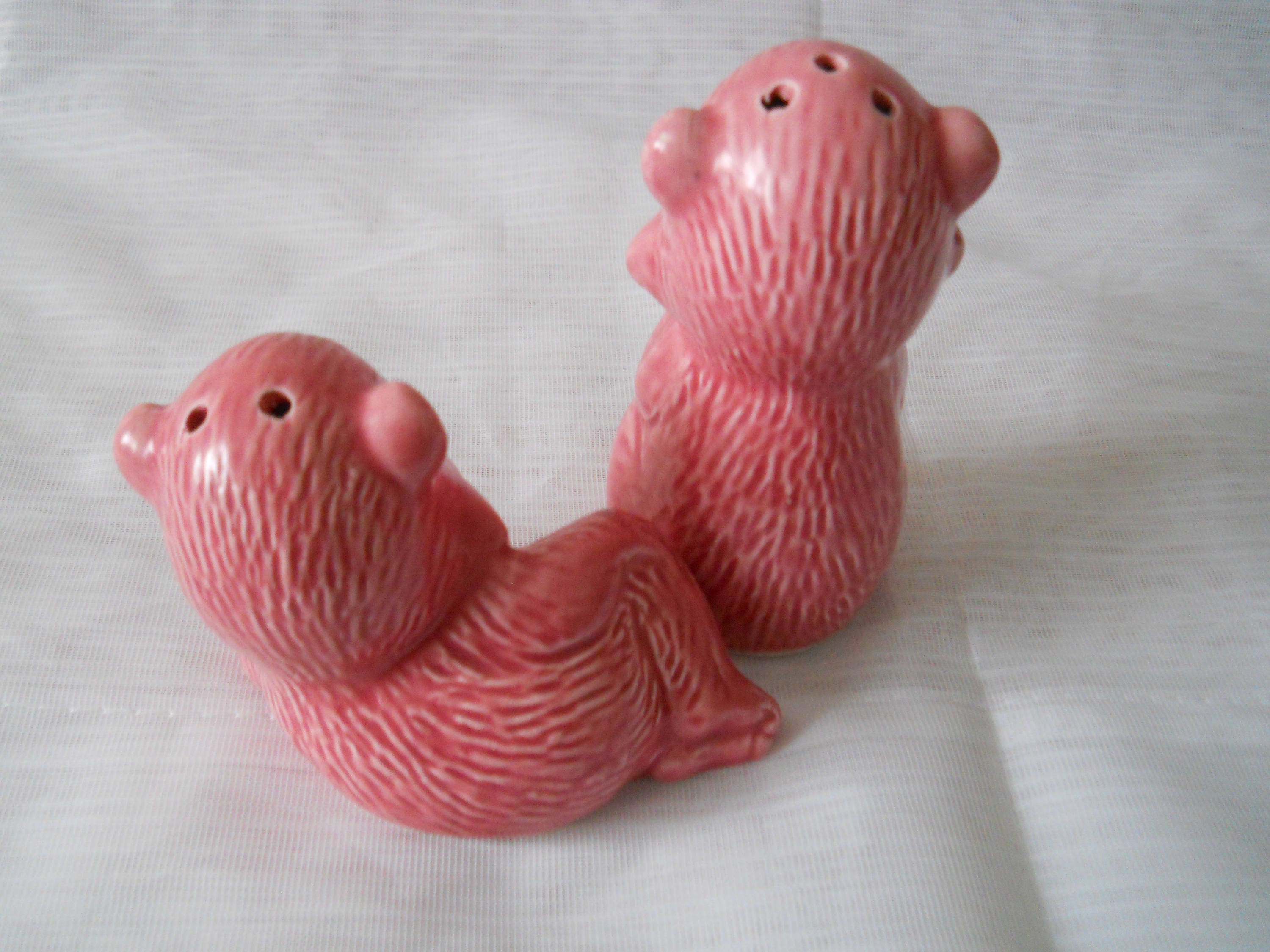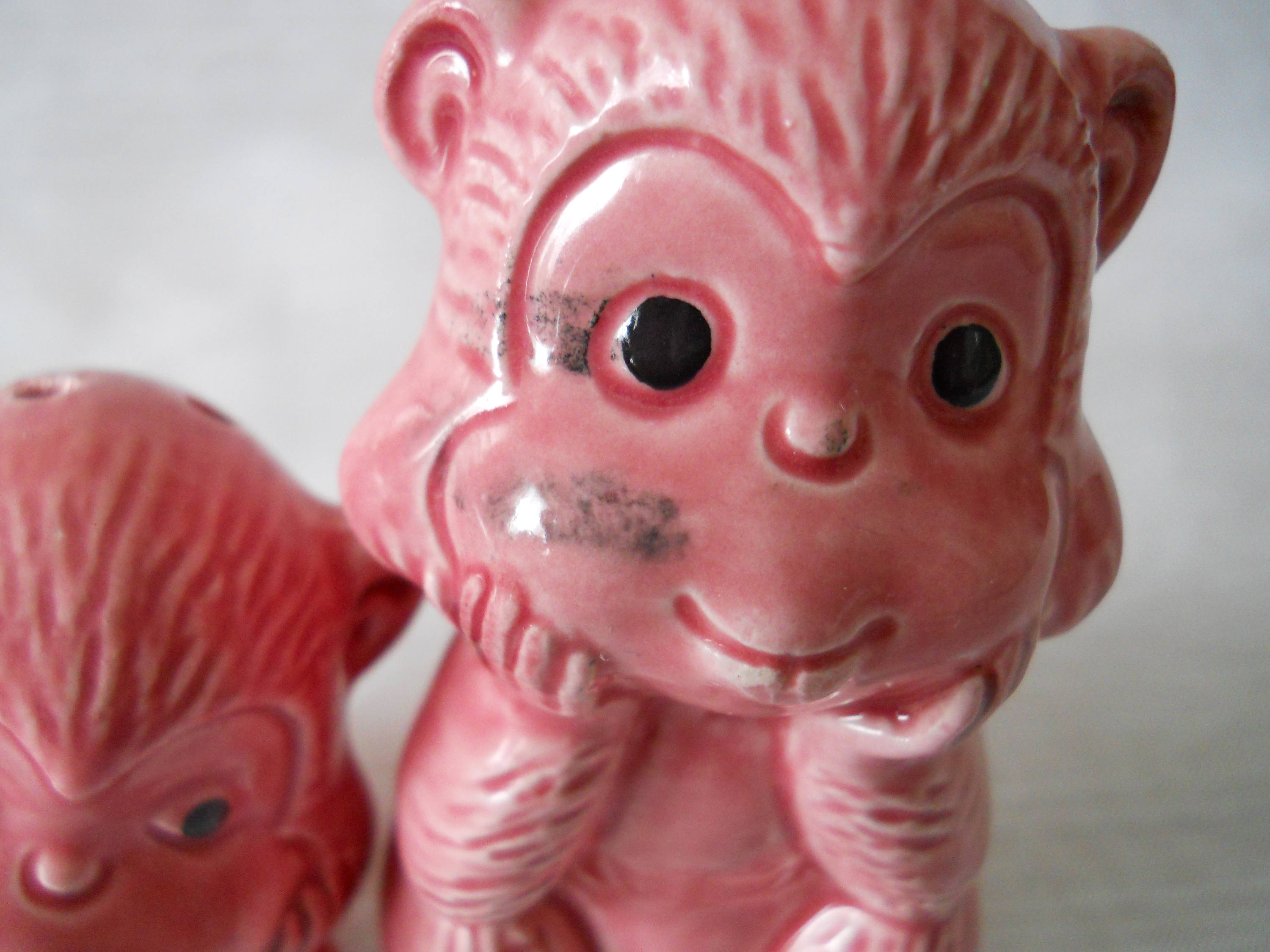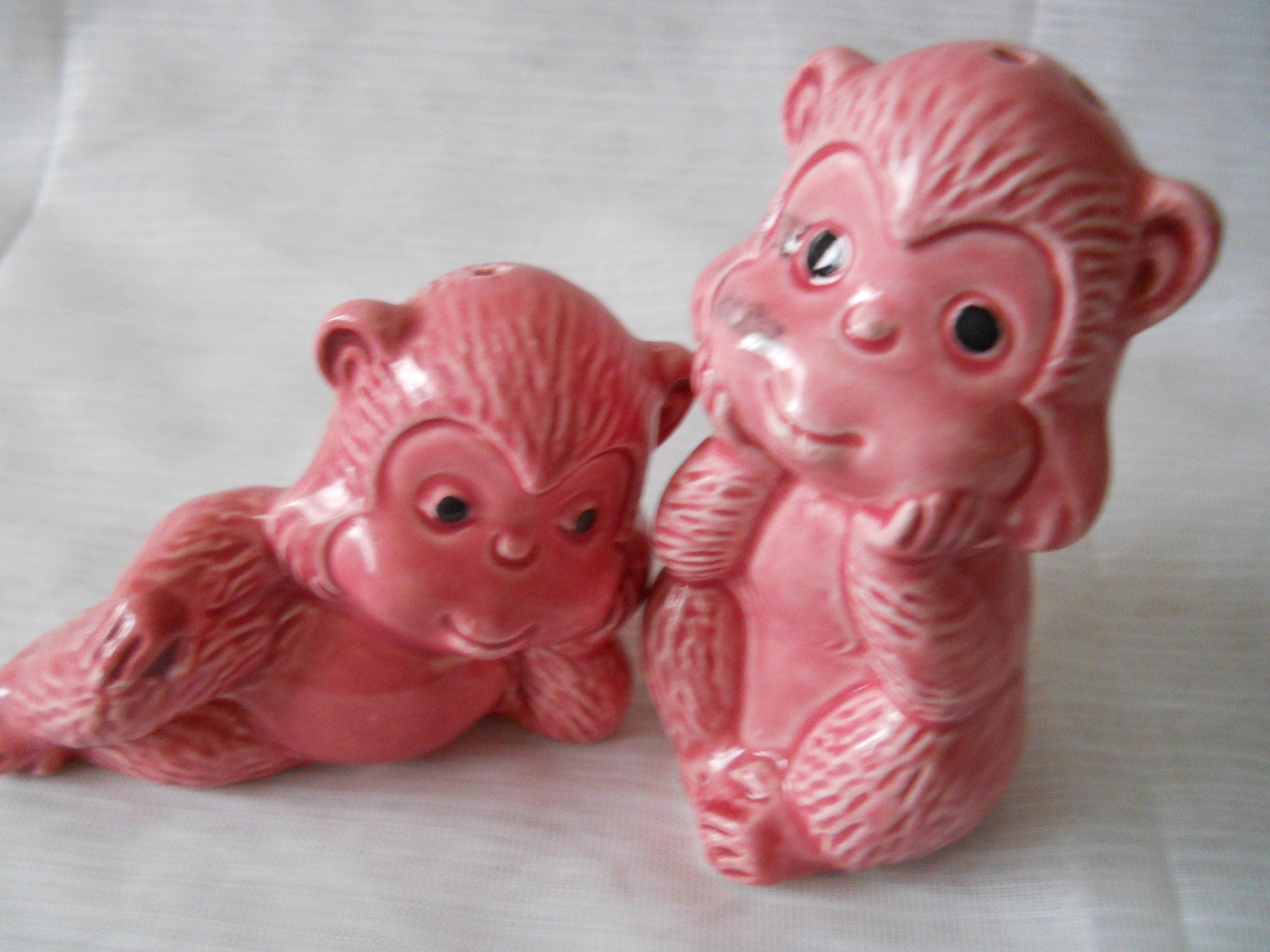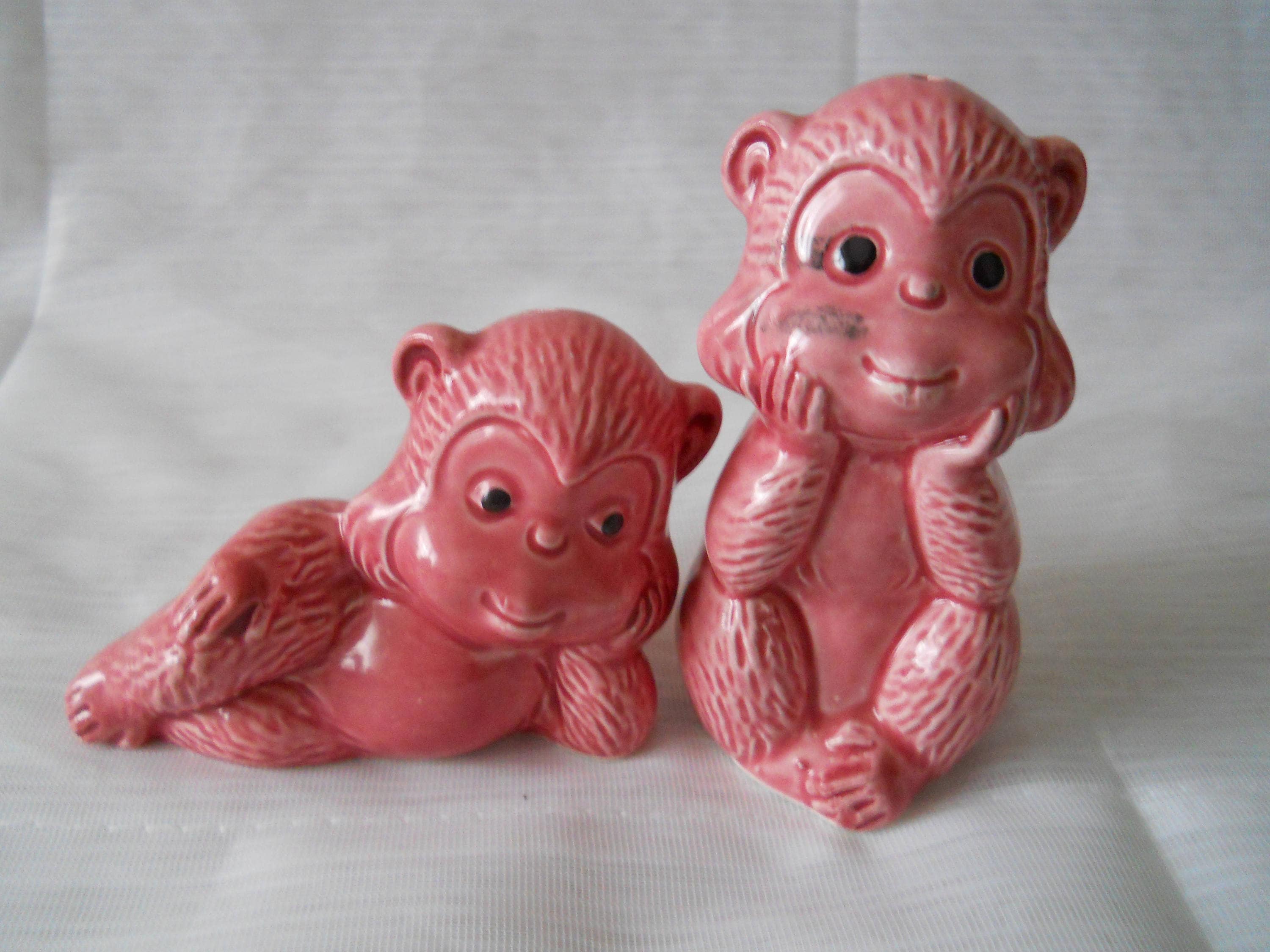 1314 - This set of salt and pepper shakers was purchased at an estate sale. They are used and in good condition. There is a black mark on one of the monkey's faces, but it is in the paint.