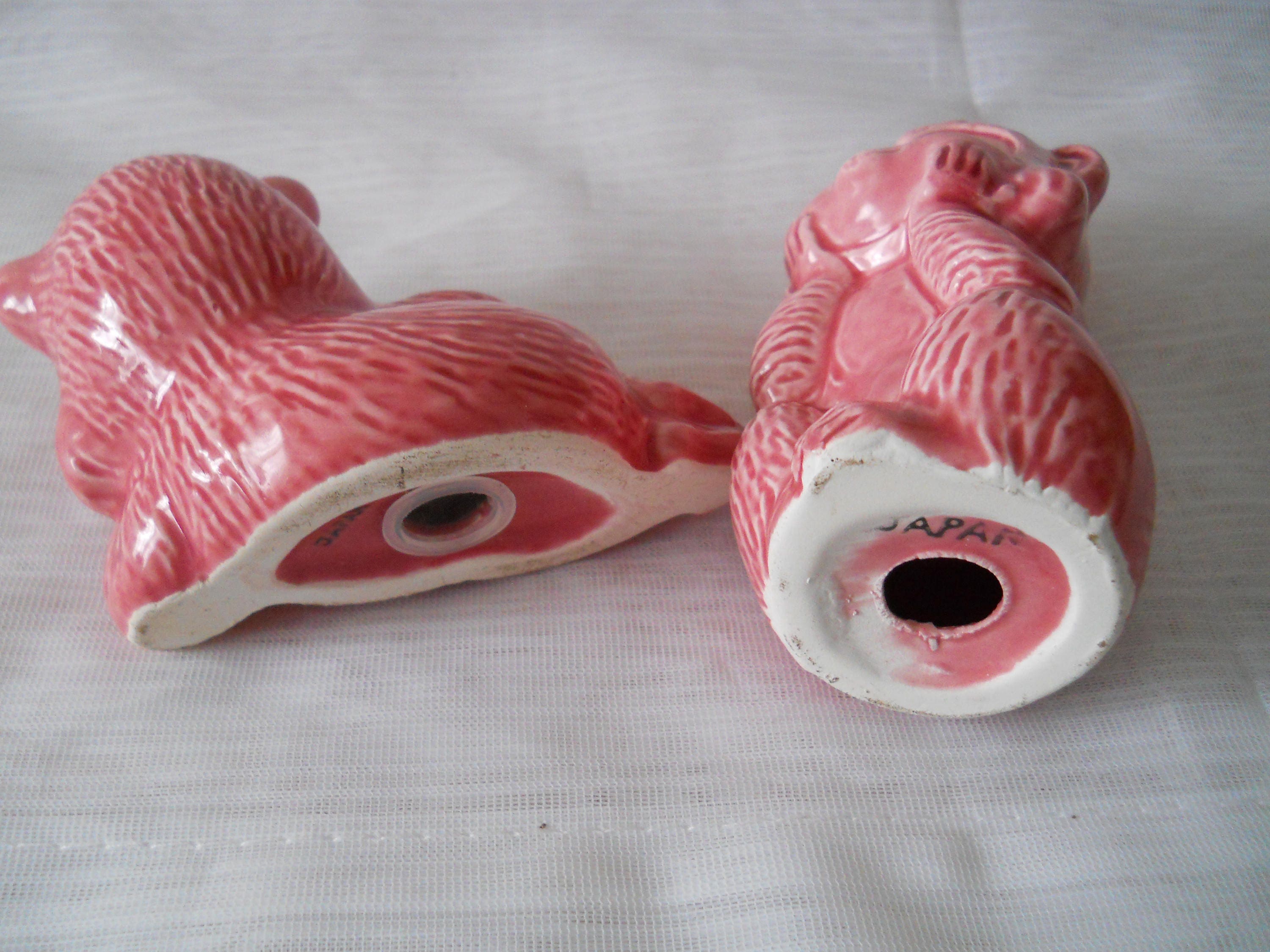 Both monkeys are pink with black eyes. One is in a sitting position with his head in his hands. This shaker is 3 3/4 inches tall, has no stopper and is marked "Japan".