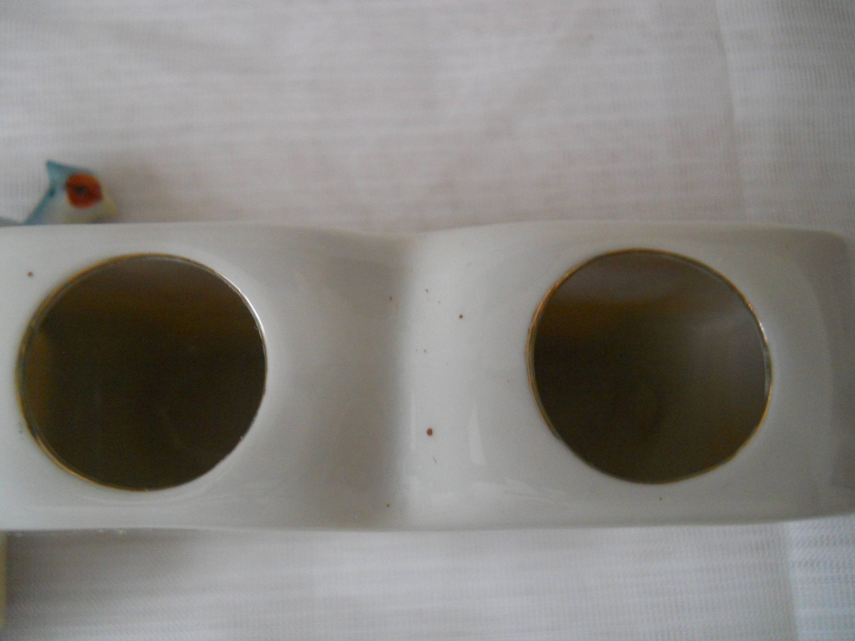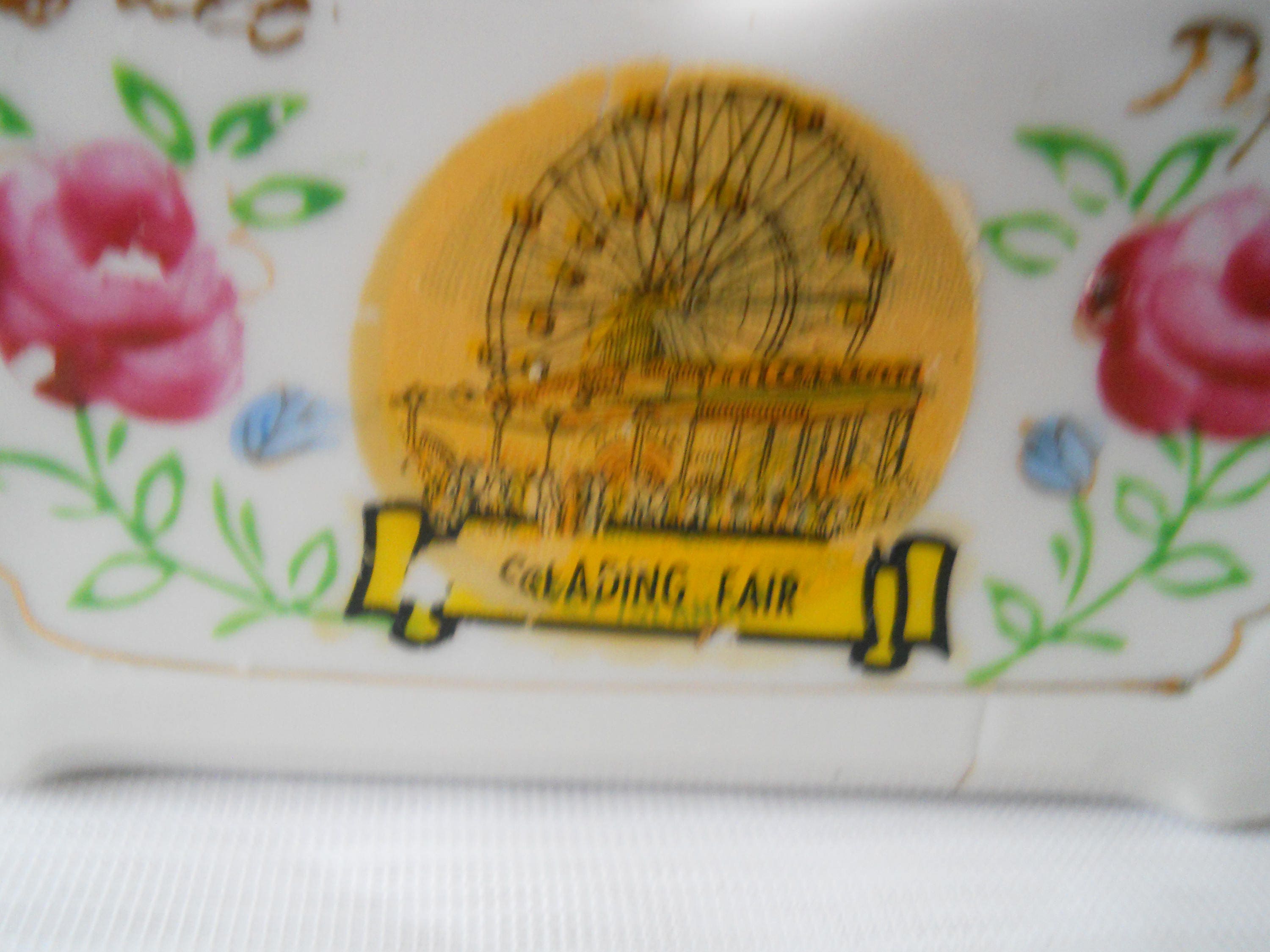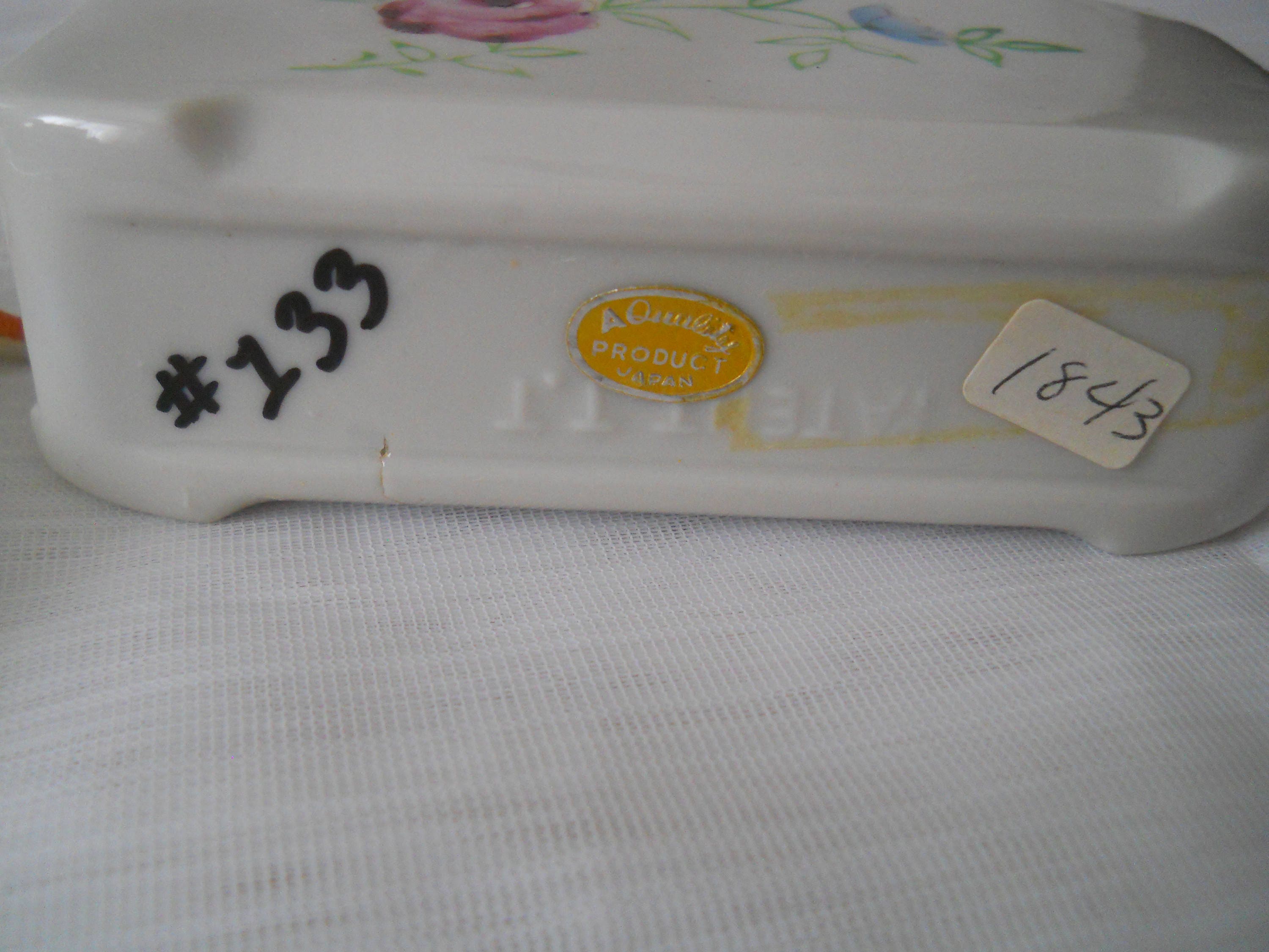The base is white with 14K lines, red roses and green leaves. There is a slight manufacturer crack at the bottom edge of the base. The crack does not go all the way through and it seems that it has been sealed with glaze. The base measures 4 inches long, 1 1/2 inches wide and 2 inches tall. The base has a gold and yellow sticker "A Quality Product Japan" on the bottom.