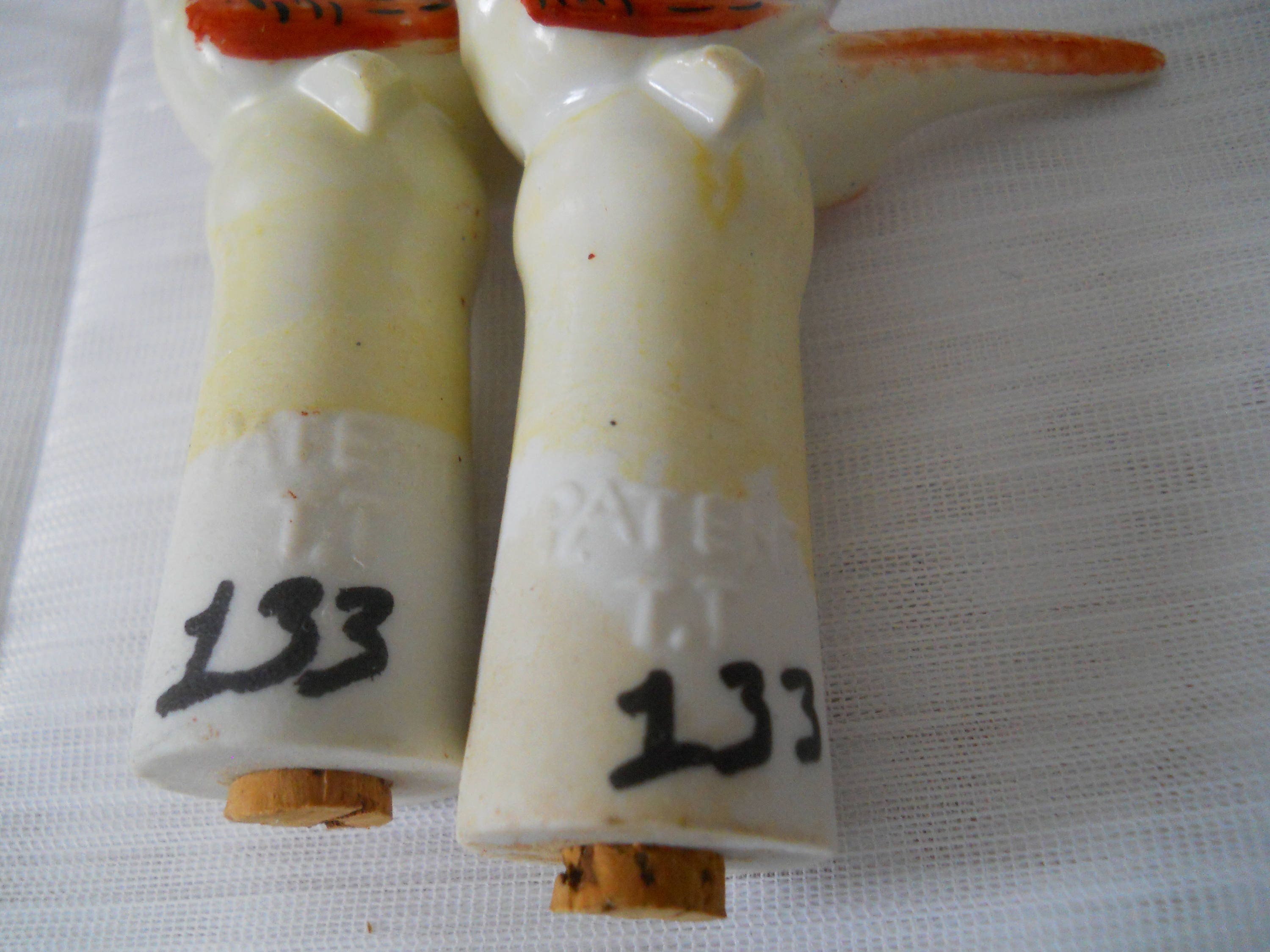The pheasants are colorful. One bird has a black body and orange feathers. This shaker is 2 3/4 inches tall and 2 7/16 inches long. This shaker has a cork stopper and is marked "Patent T.T." on the side.