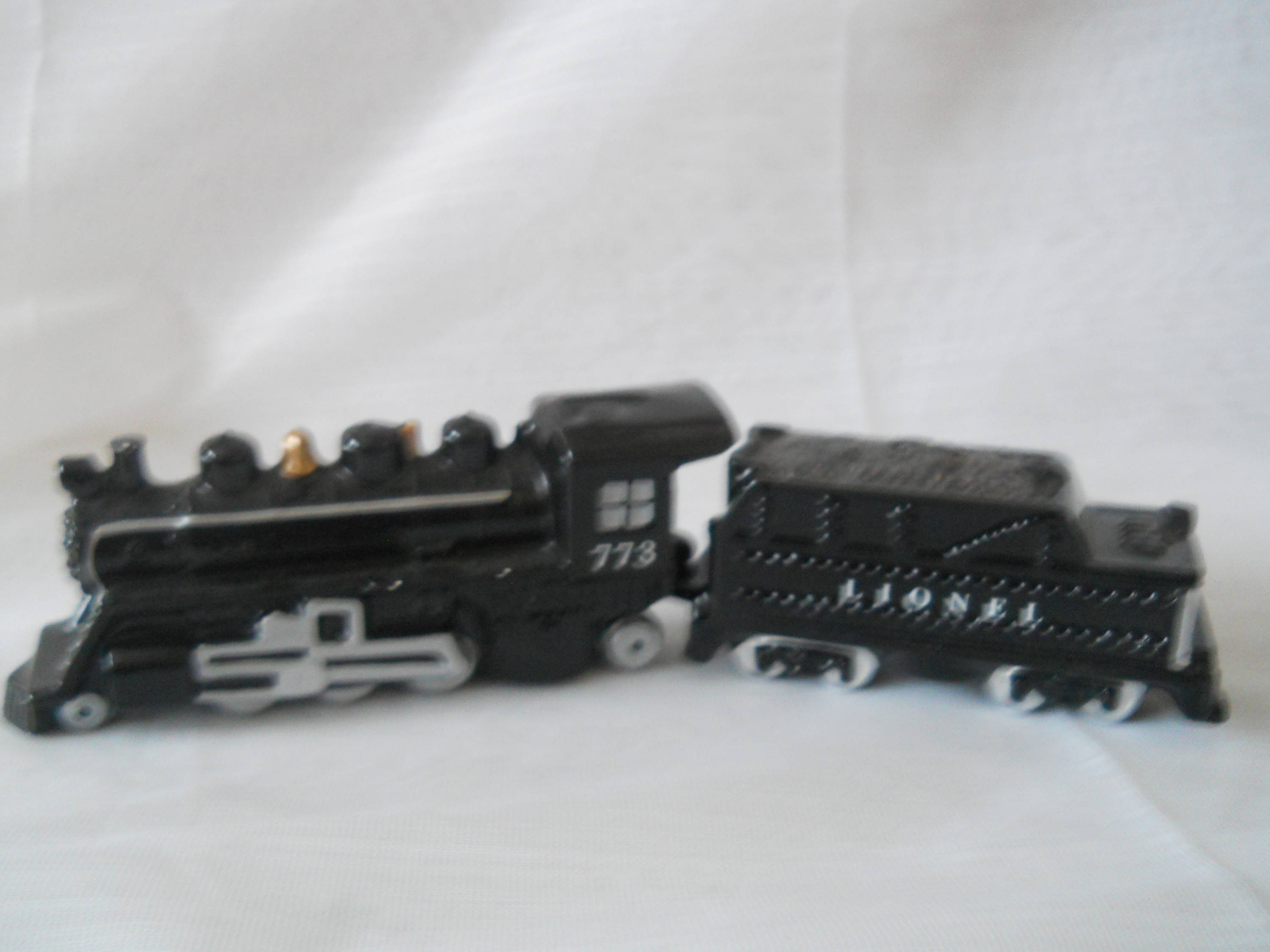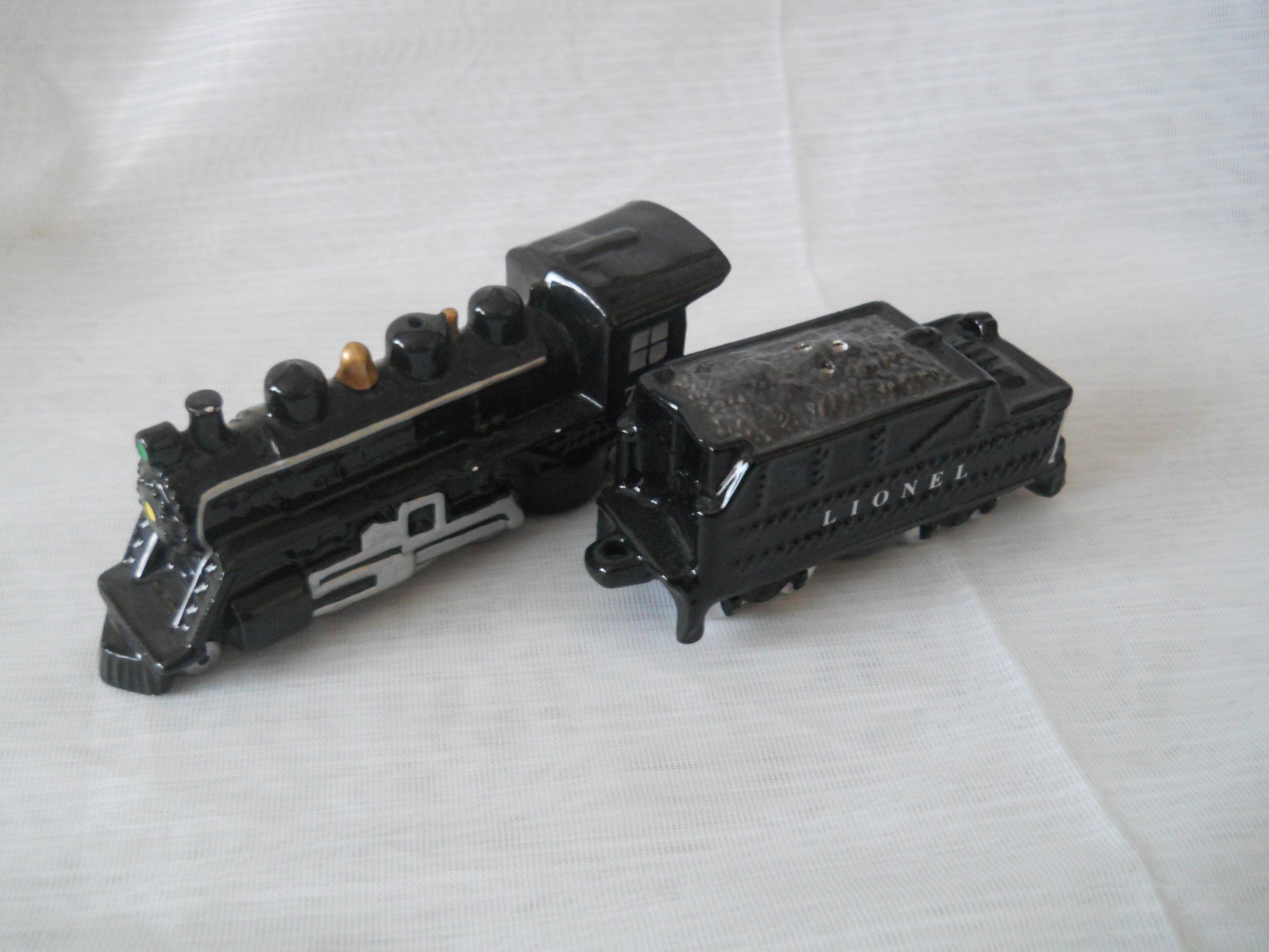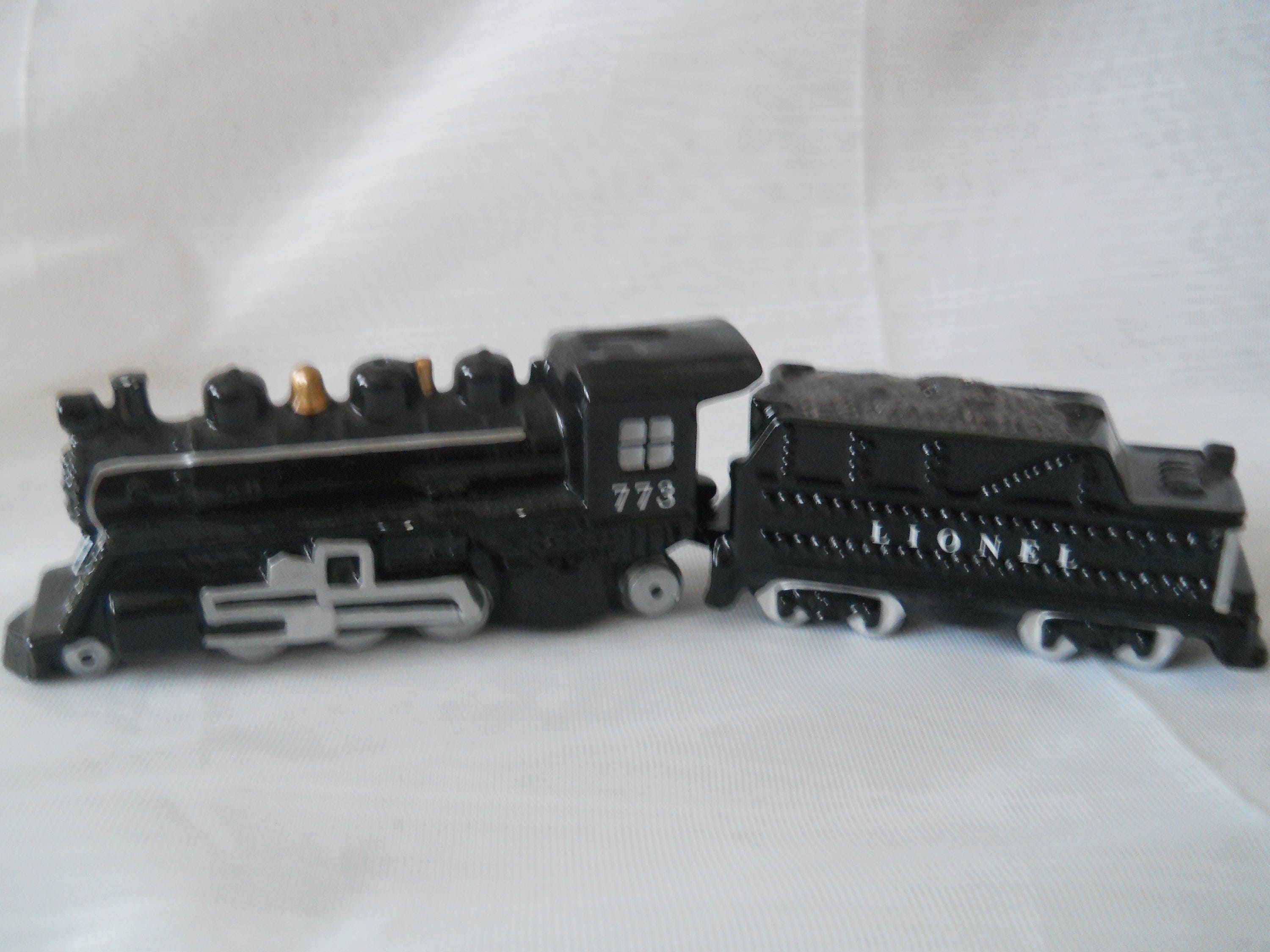 The Lionel engine is black with a gray window and marked "773". The tracks that turn the wheels and the wheels are gray. The top of the engine is equipped with the smoke stacks and gold bell. This shaker is 4 1/2 inches long and 2 inches tall. It has a plastic stopper and marked"480436 Made in China".