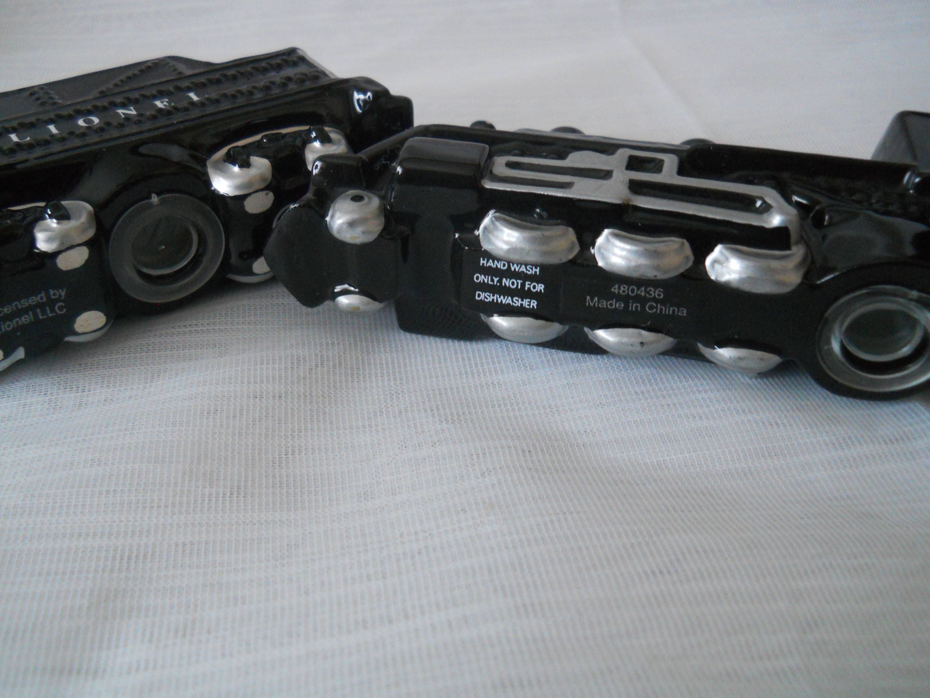 The coal car is black with "LIONEL" on the side. The tracks of the wheels are gray otherwise it is all black. The image of coal is on the top and this car hooks to the back of the engine. This shaker is 3 1/2 inches long and 1 1/2 inches tall. It has a plastic stopper and marked "Licensed by Lionel LLC".