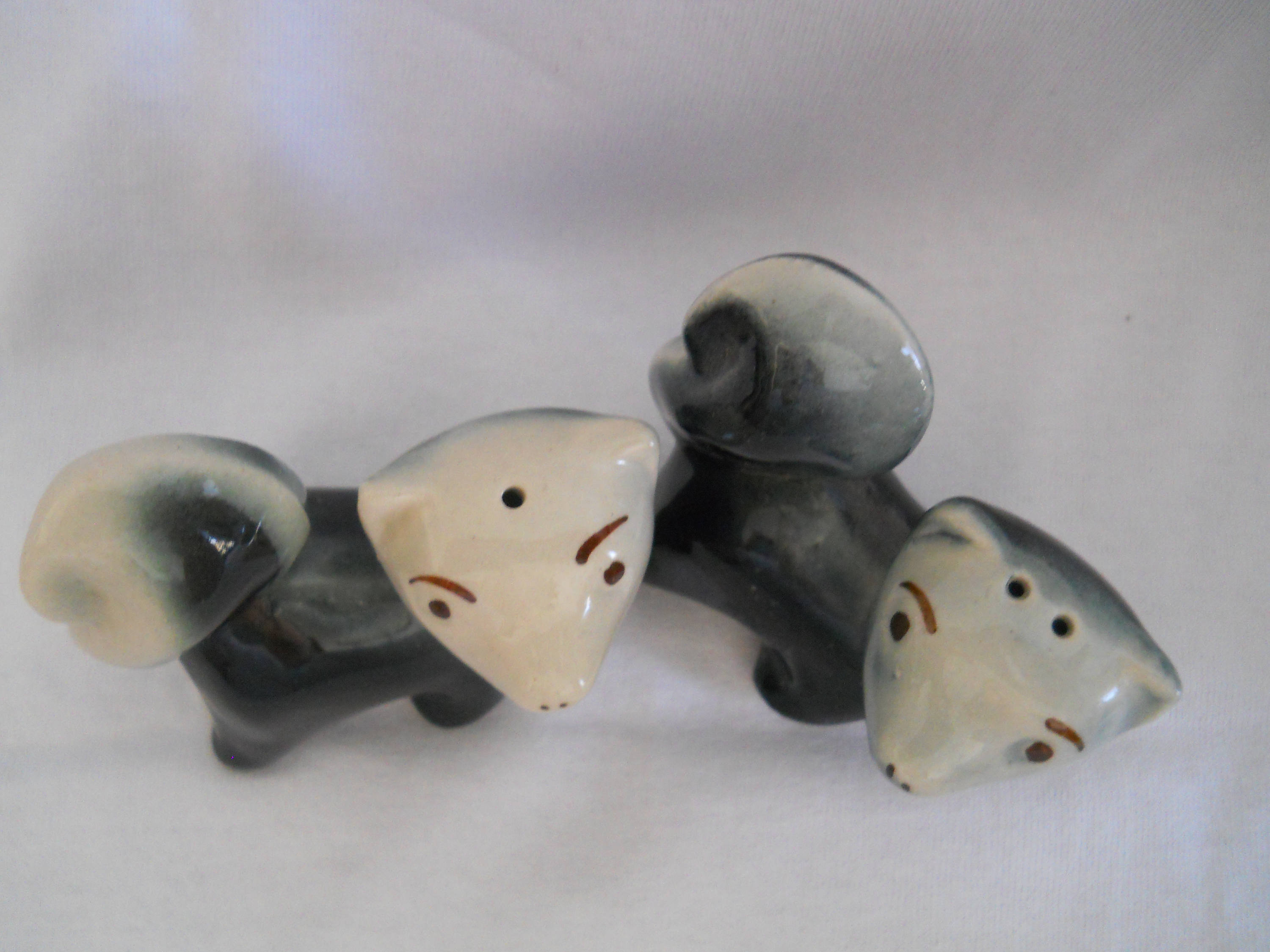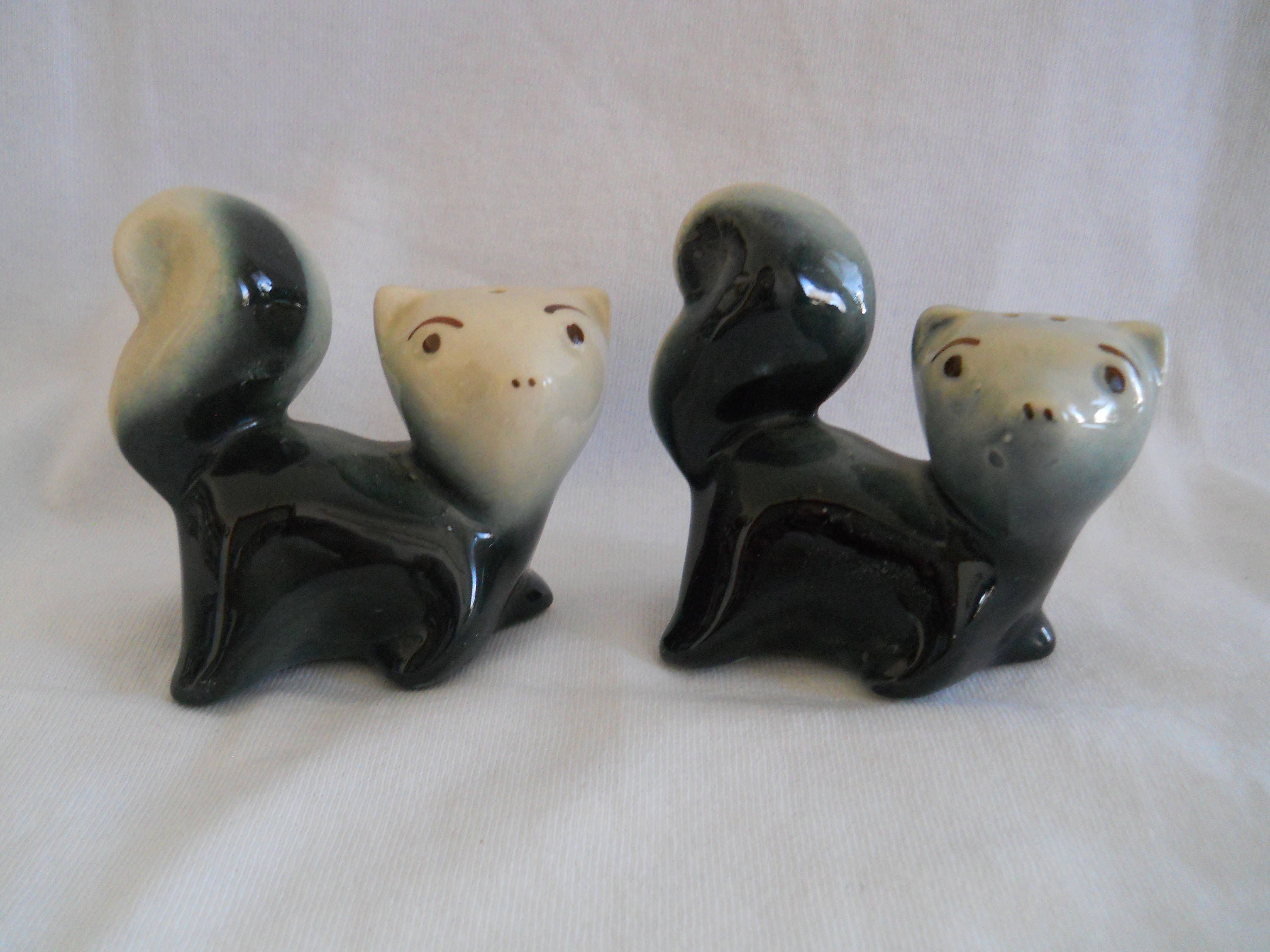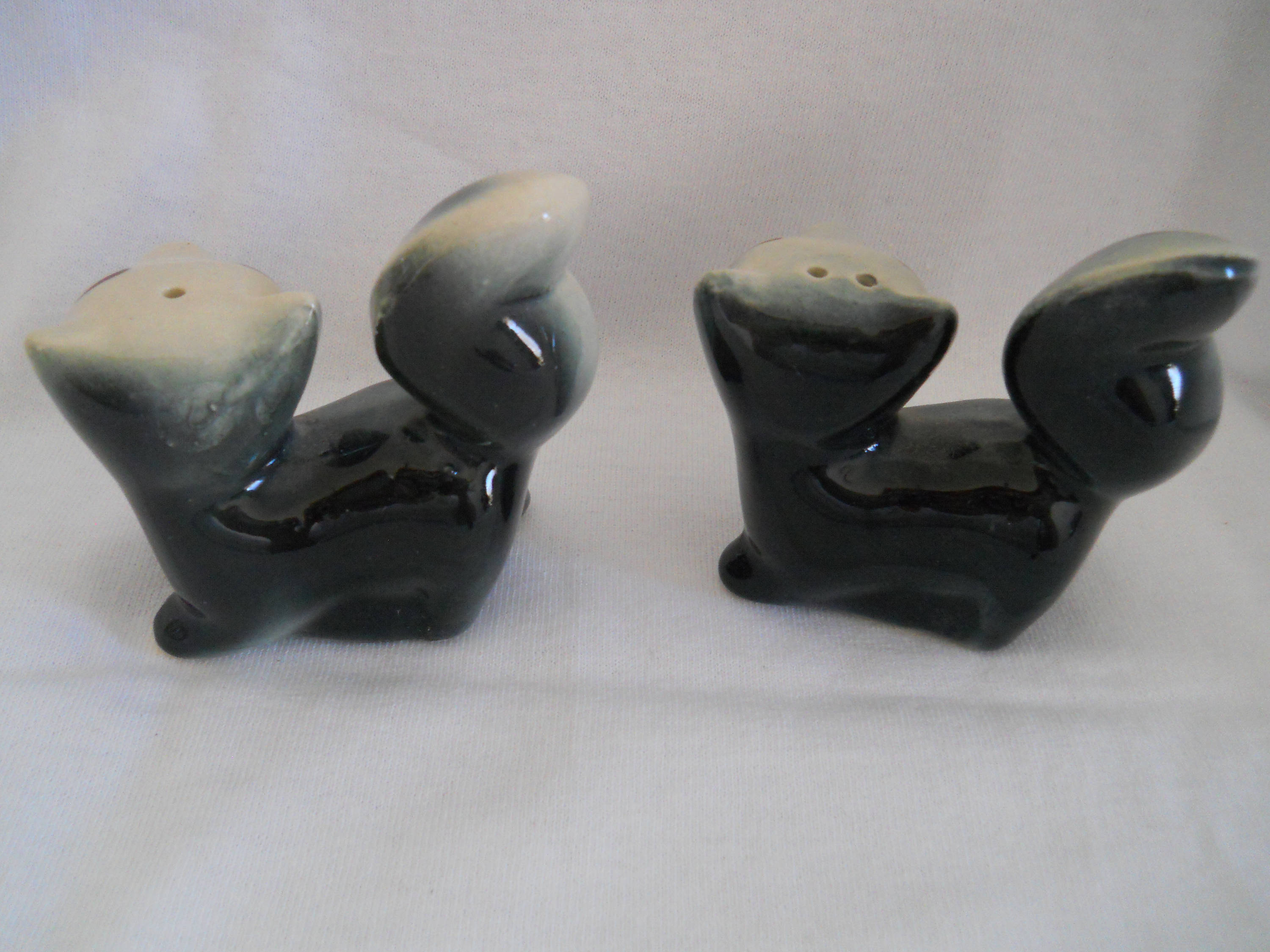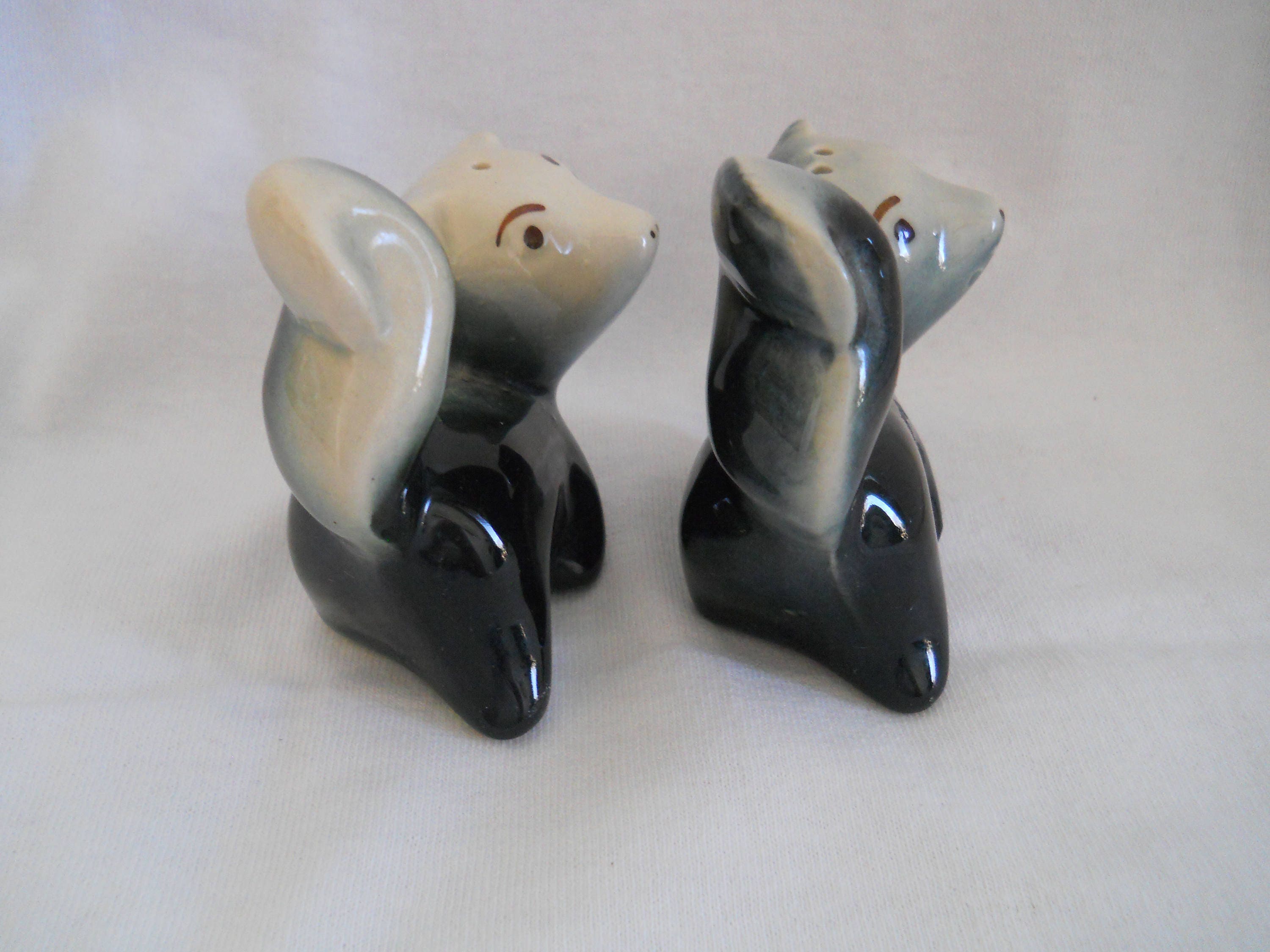 Both skunks are black and white. One skunk has more white on his face and tail than the other. The other one is more gray. Both shakers are 2 3/4 inches tall and 2 1/2 inches long. The shakers have no stoppers and are not marked.