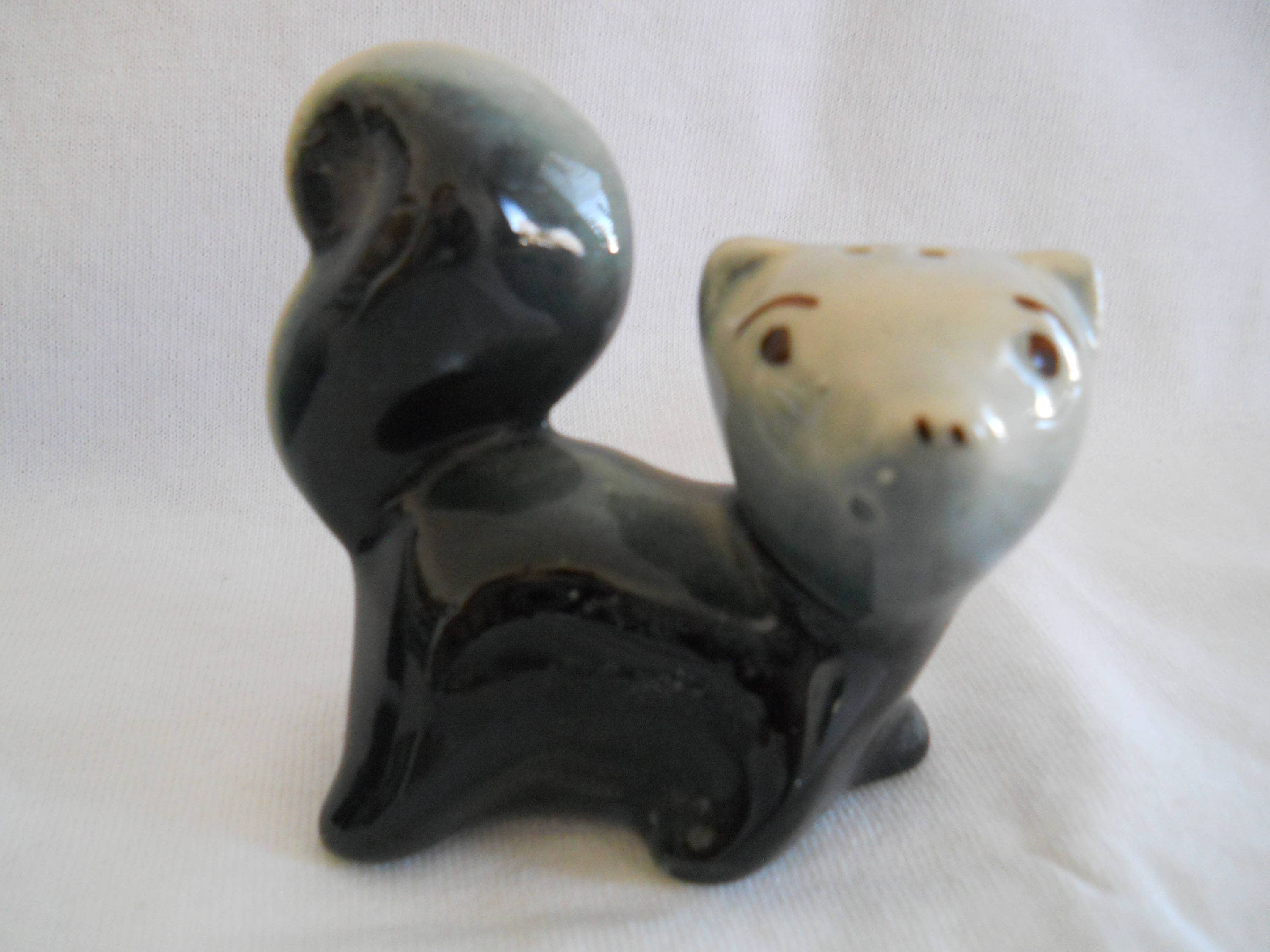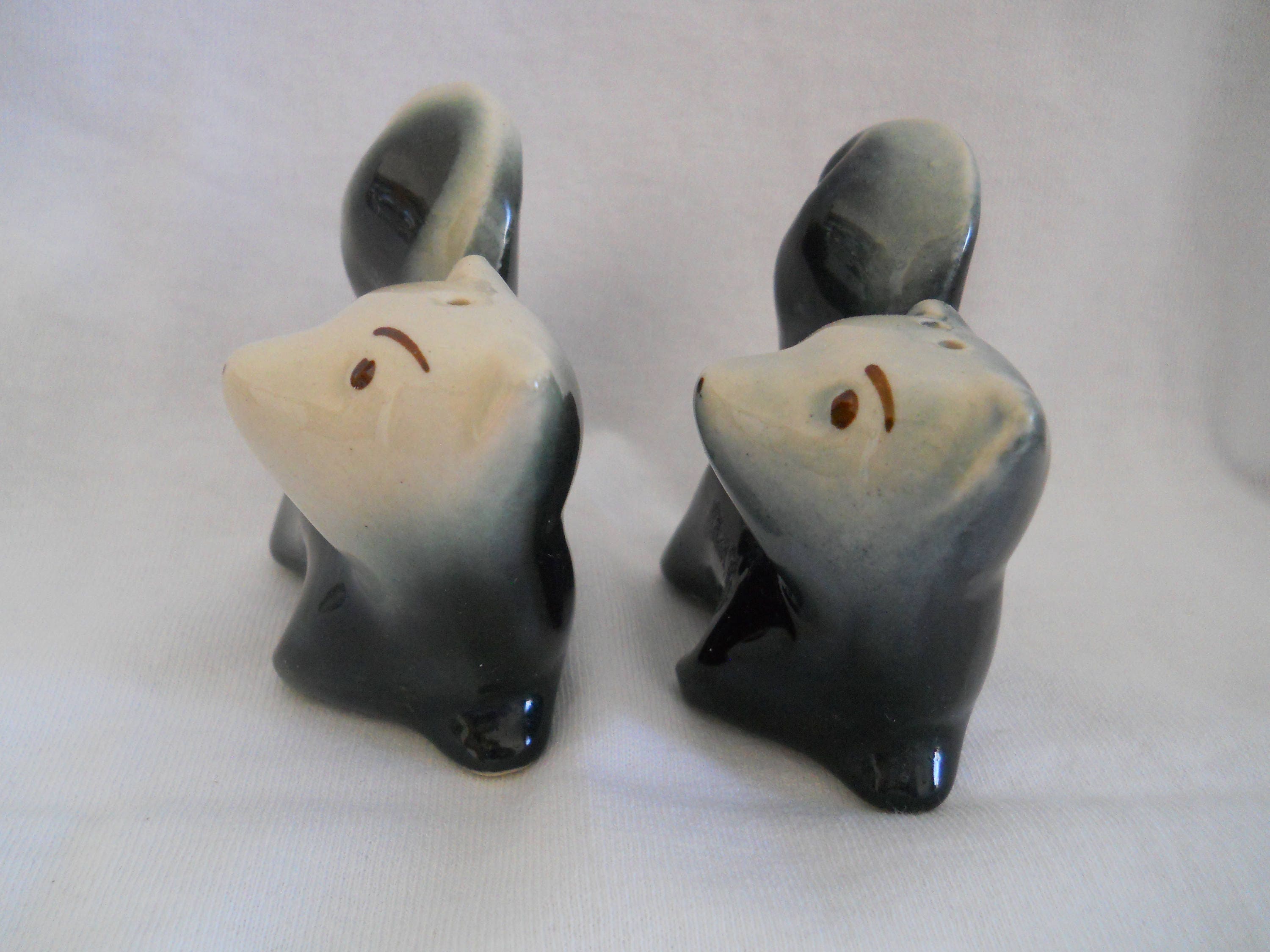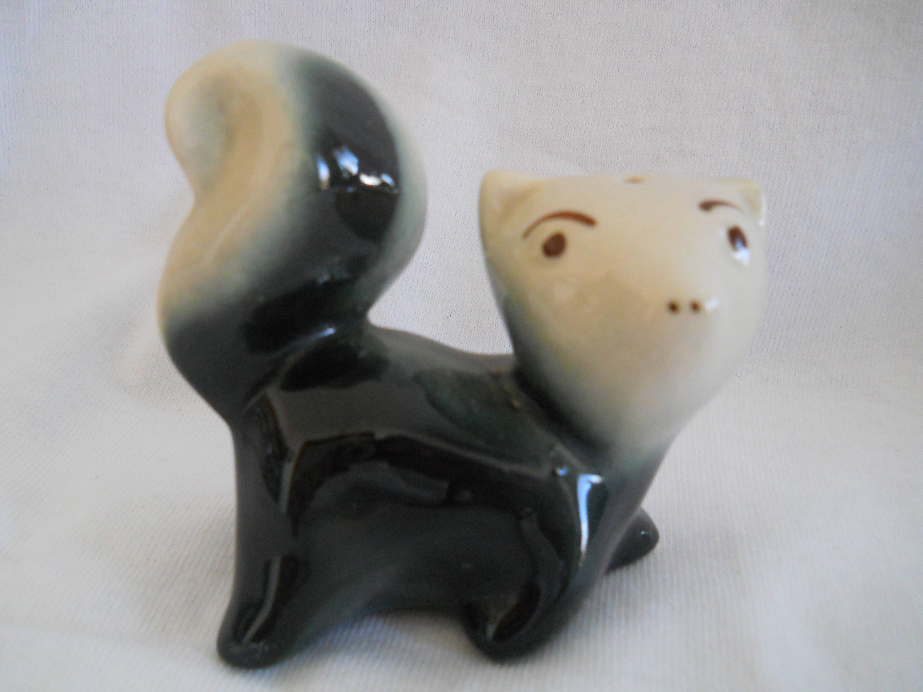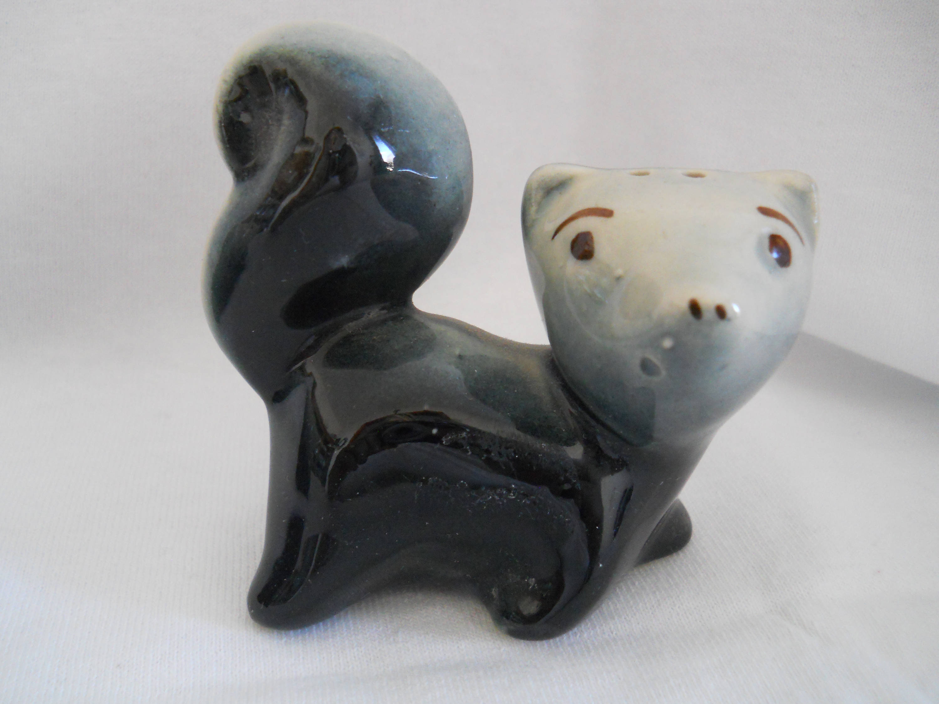 Both skunks are black and white. One skunk has more white on his face and tail than the other. The other one is more gray. Both shakers are 2 3/4 inches tall and 2 1/2 inches long. The shakers have no stoppers and are not marked.