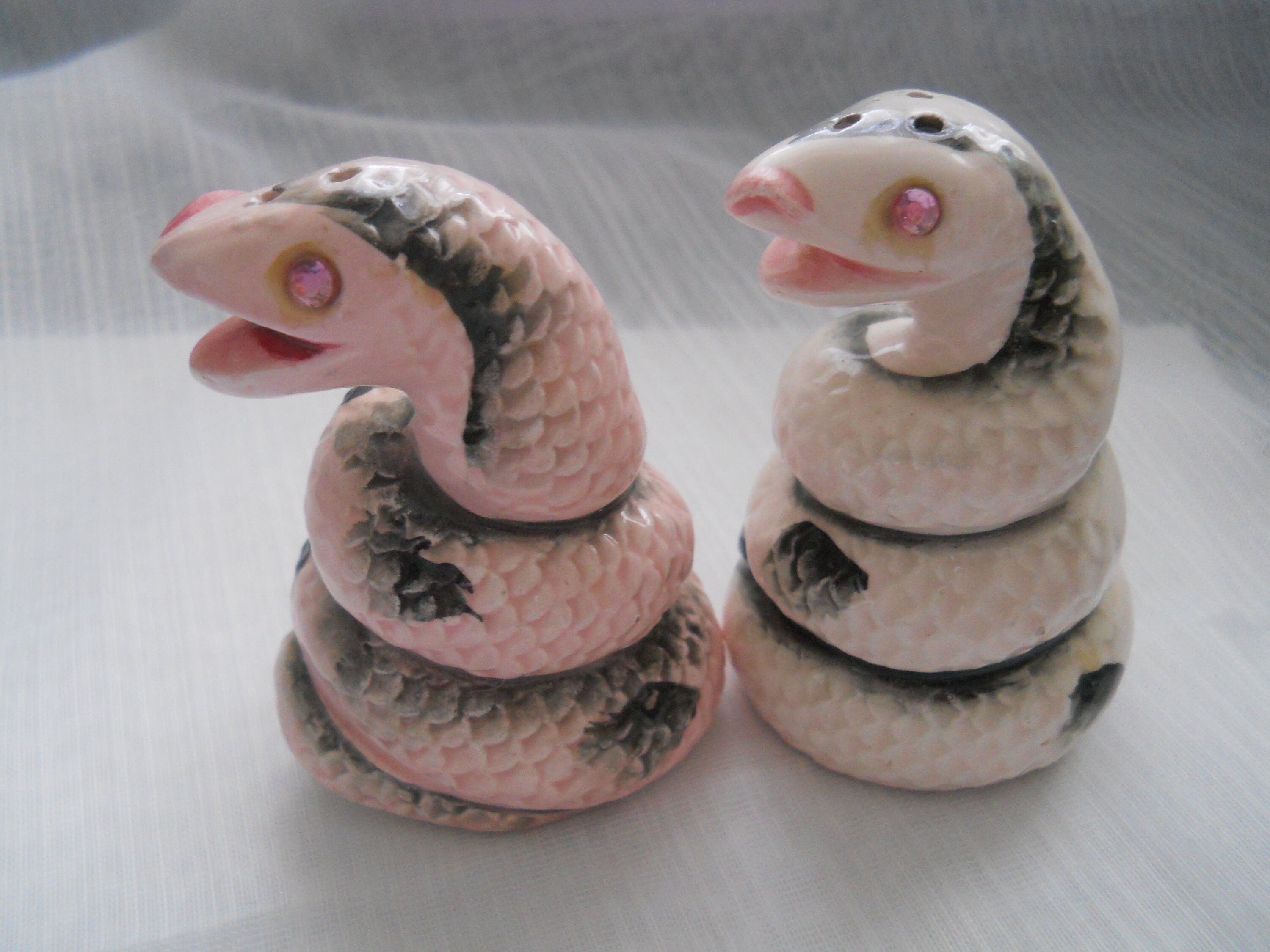 One snake is a pink color with black markings. The eyes are pink stones and the tongue is red. This shaker measures 3 inches, has a plastic stopper and marked Japan on the bottom.