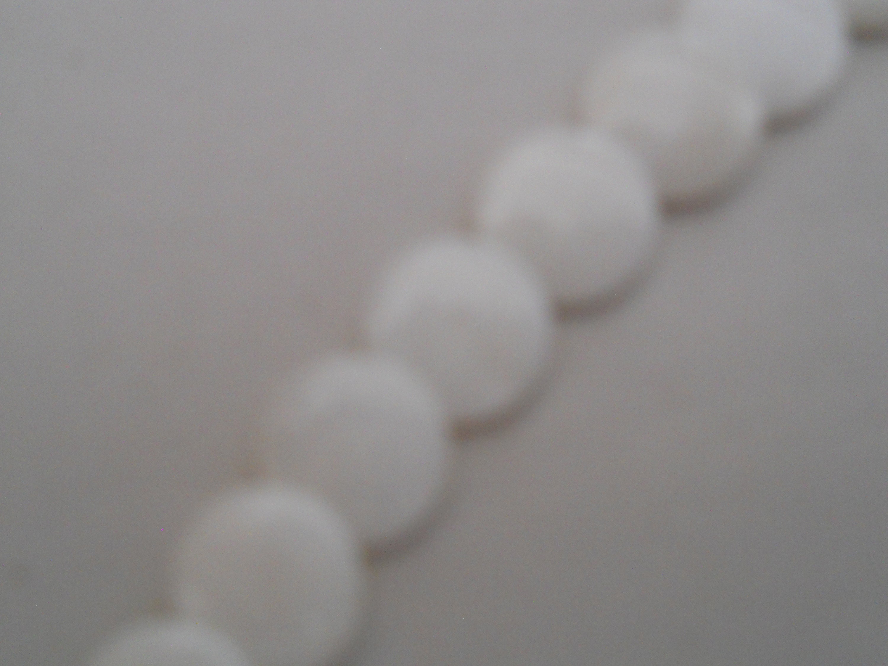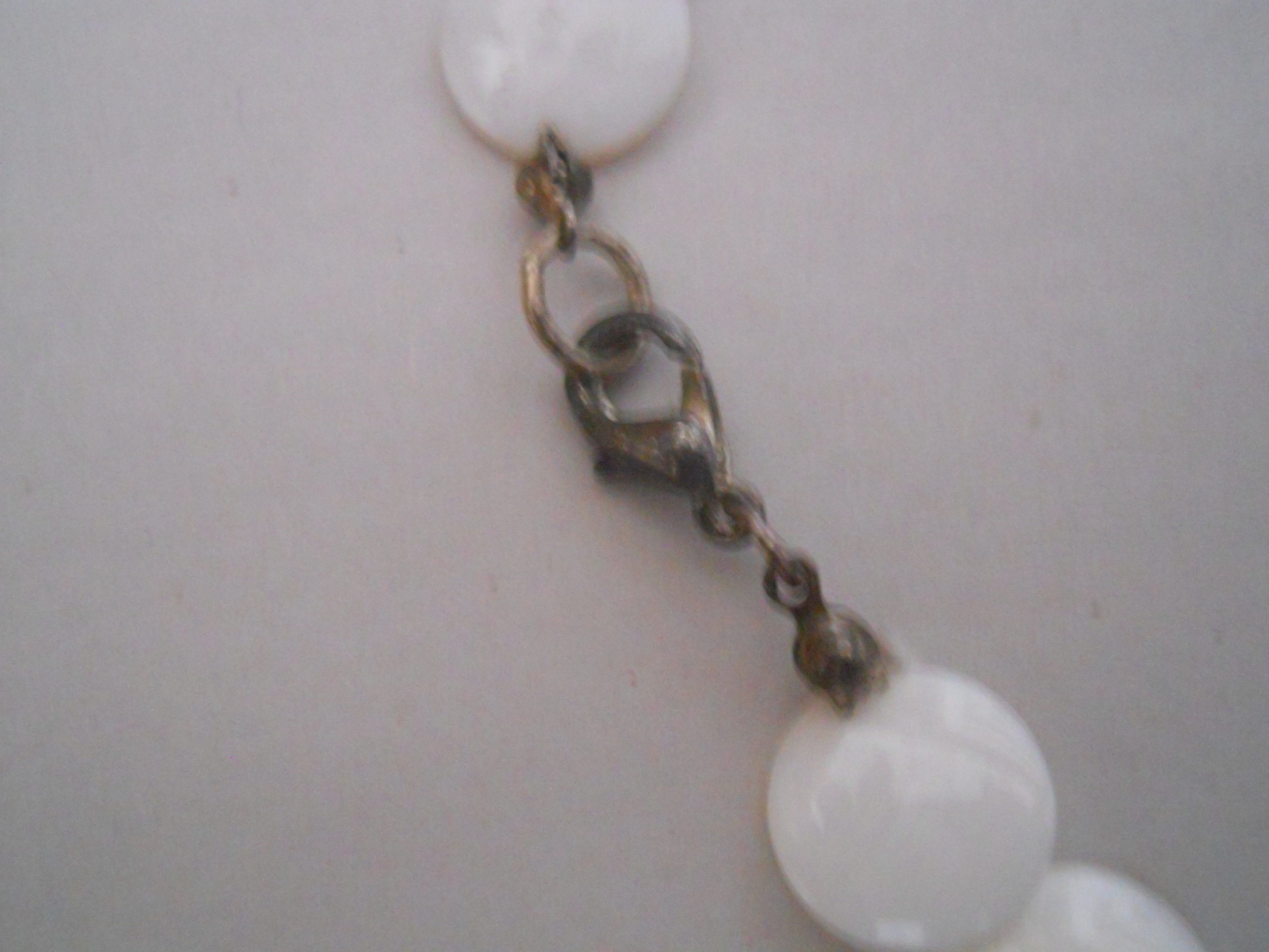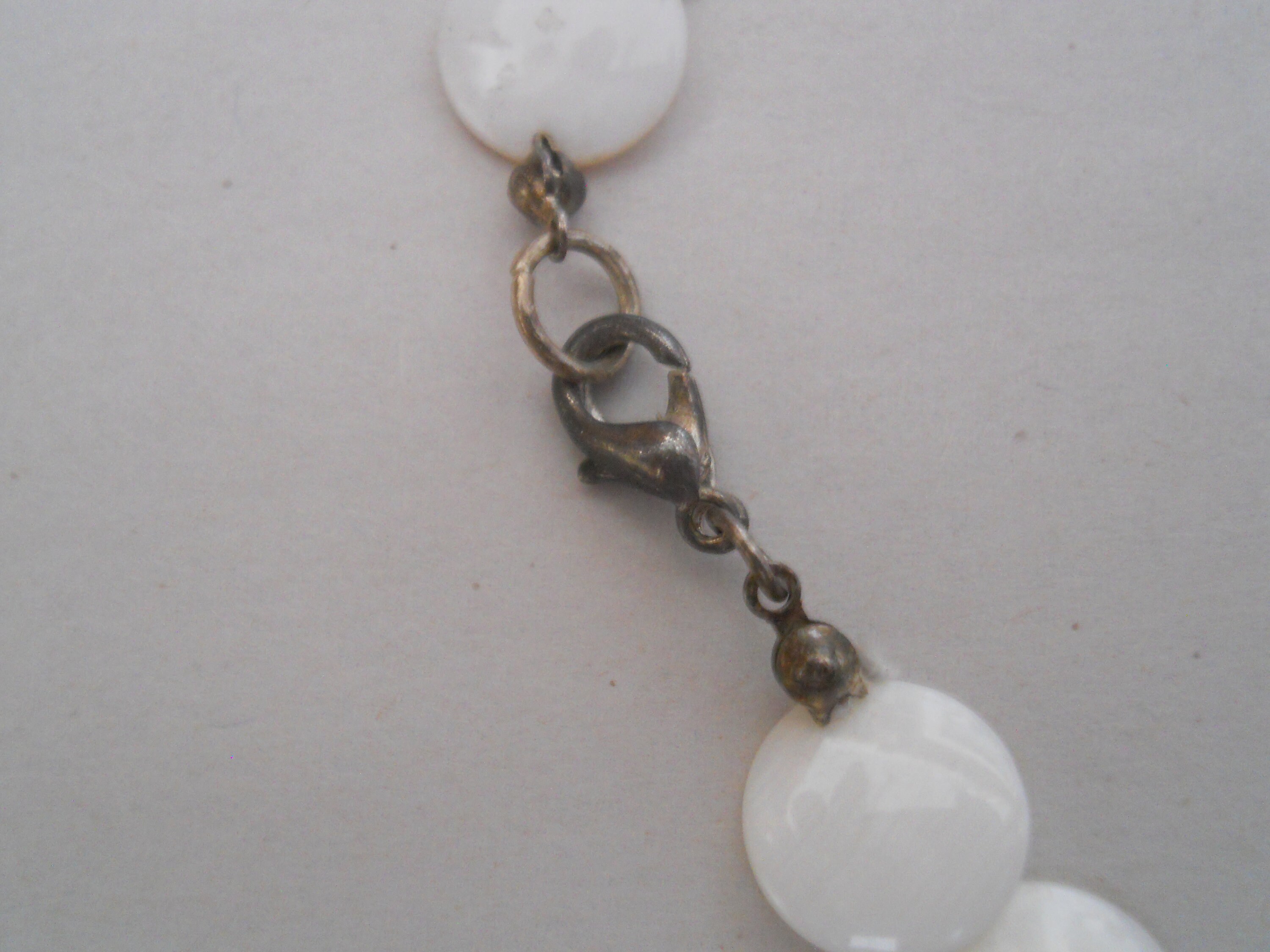 This necklace is made from white flat shell beads. It's overall length is 19 inches from clasp to fastener. There is no identification tag on the necklace and it has a claw clasp.