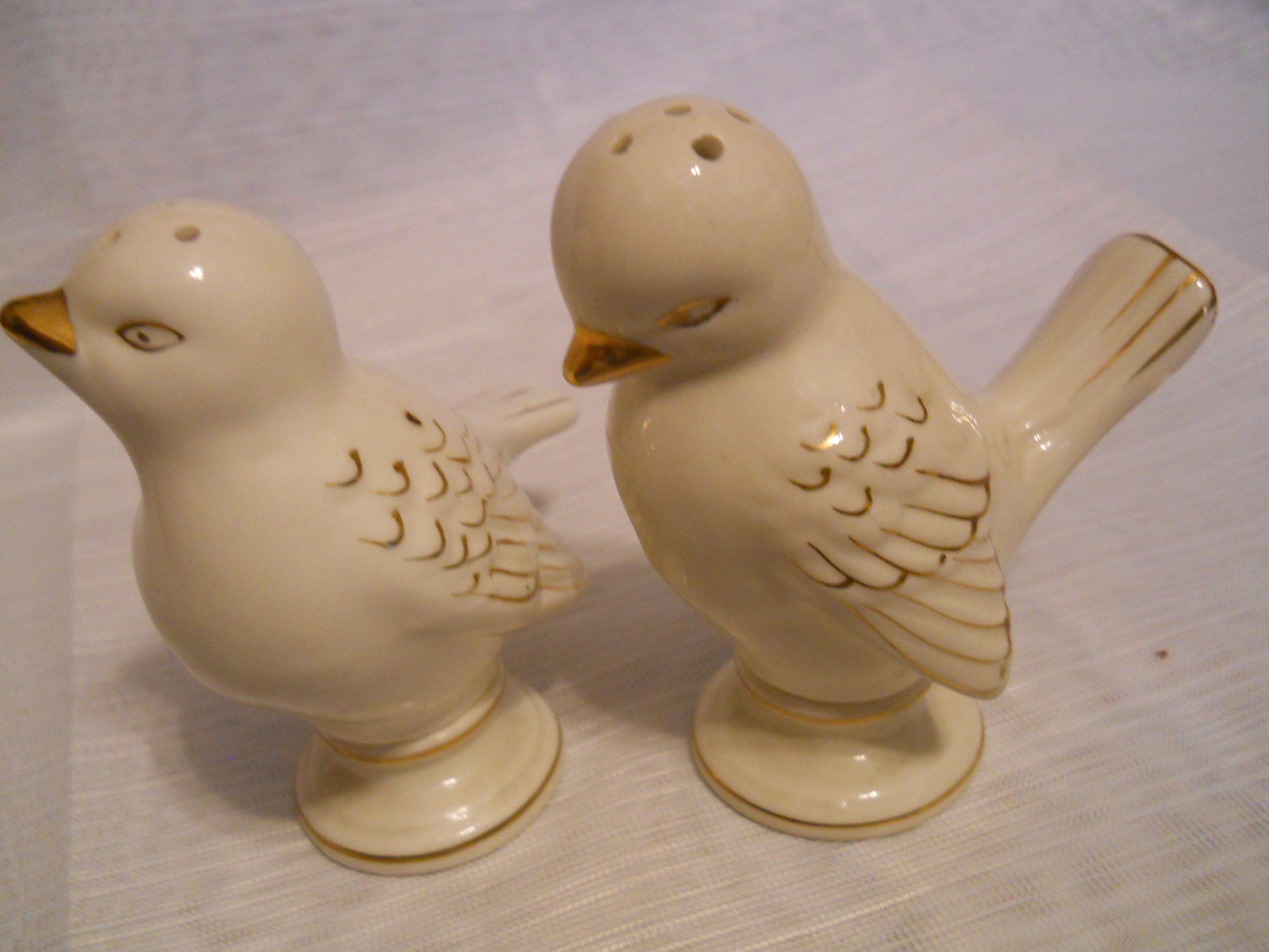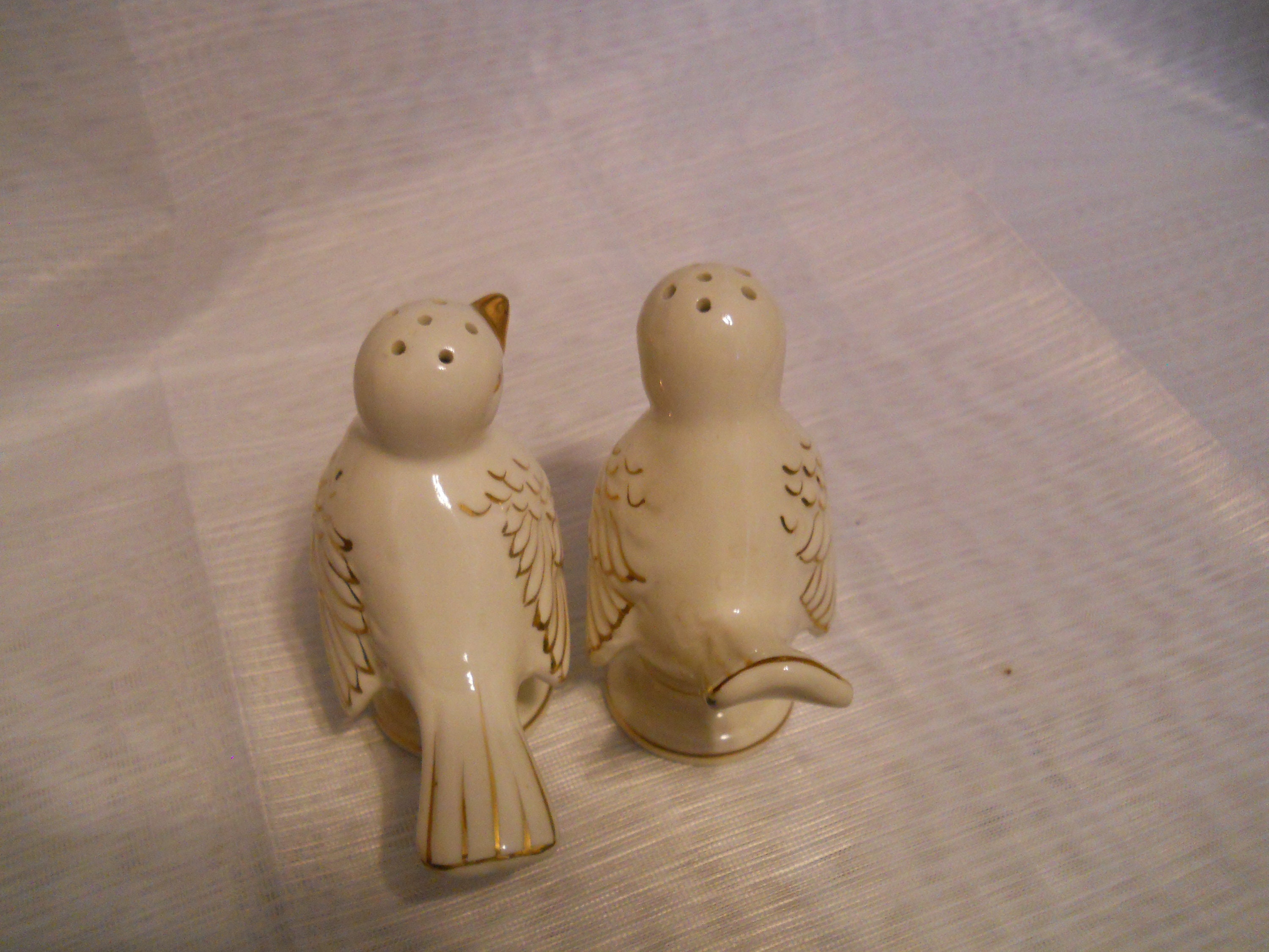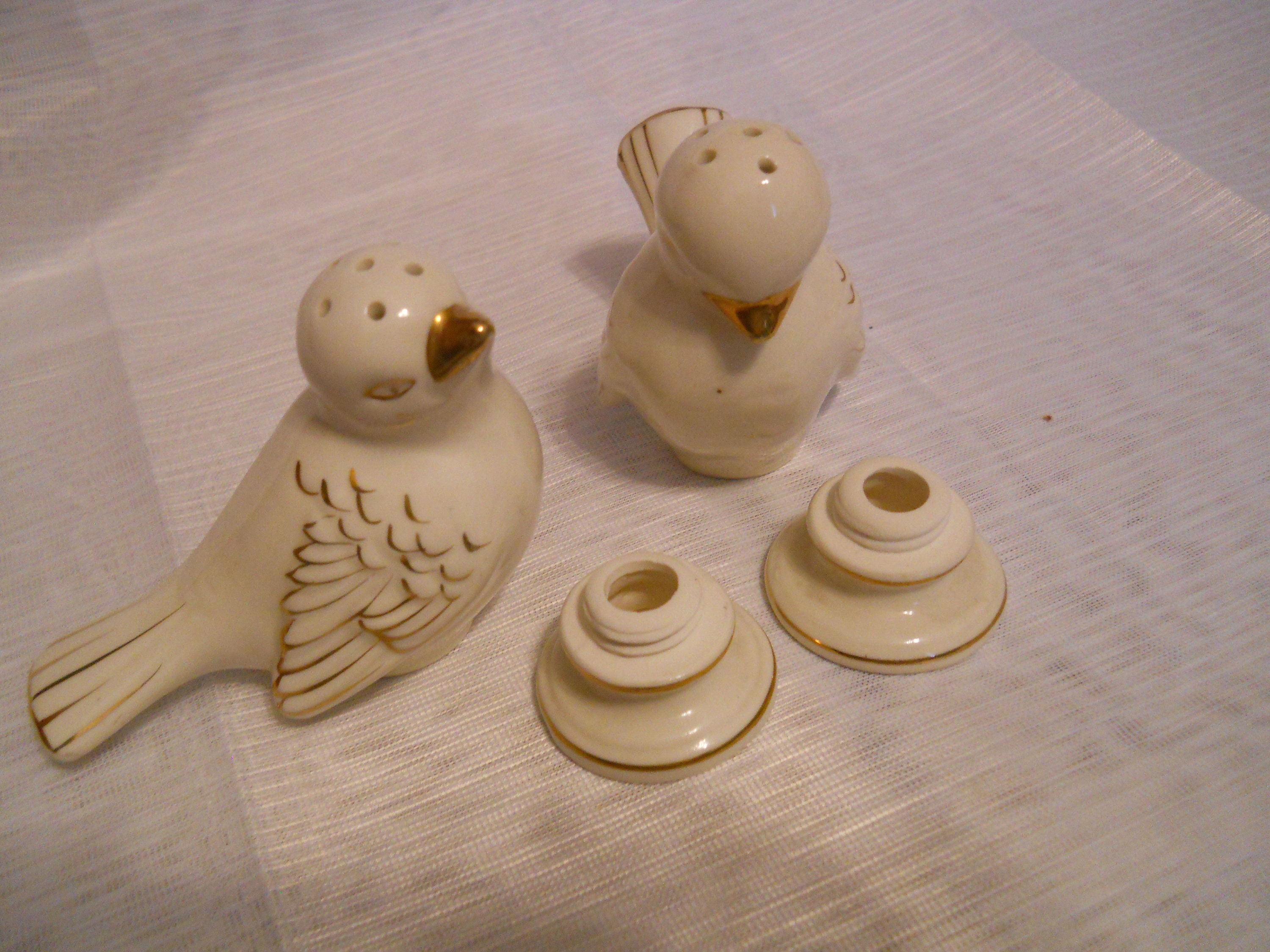 Both birds are china with 14K gold trim on the wings tail, beak and around the base. This set is unique as the bottom unscrews for filling (see photos). Each bird is 3 1/2 inches tall and marked Japan on the bottom.