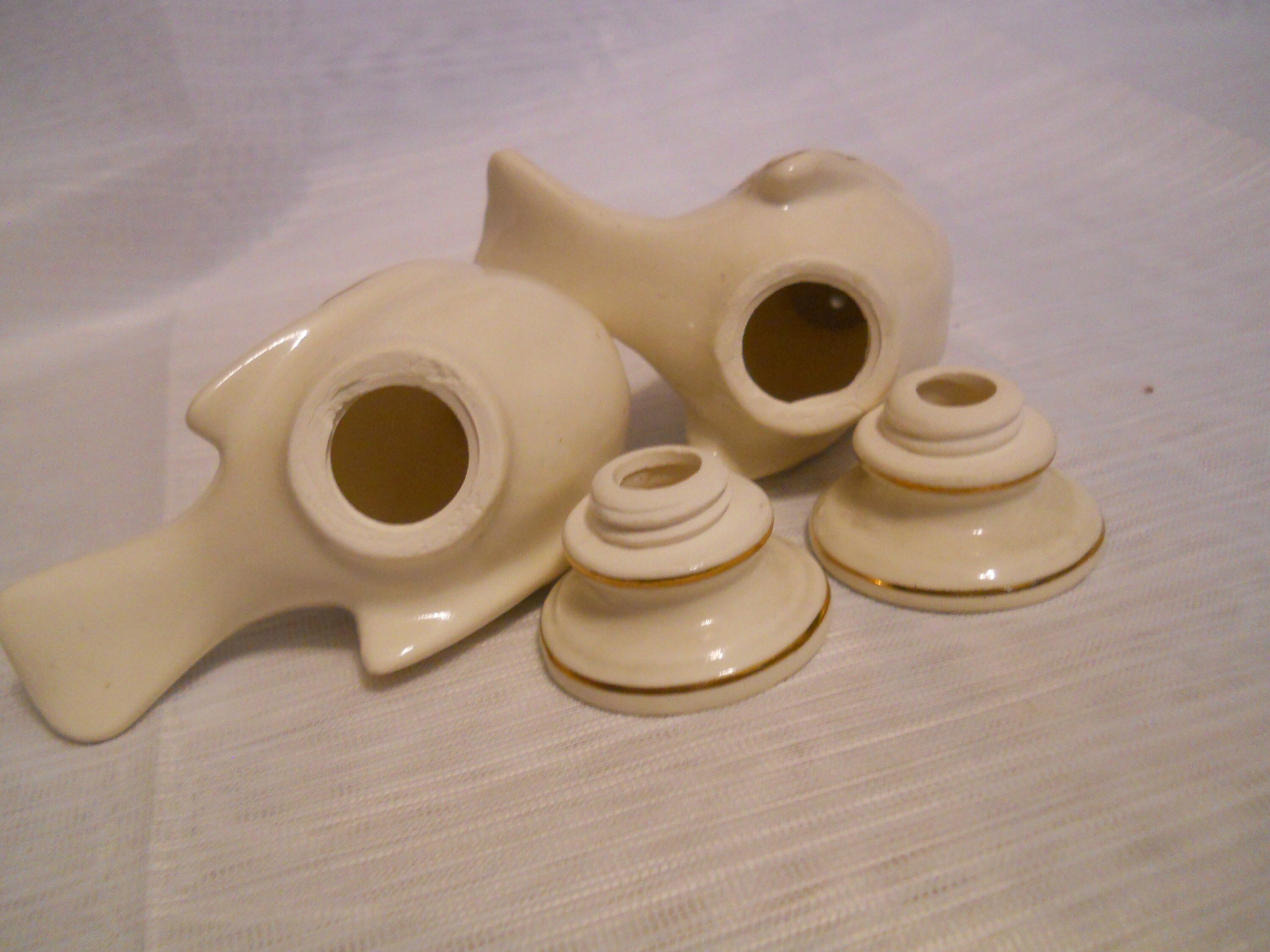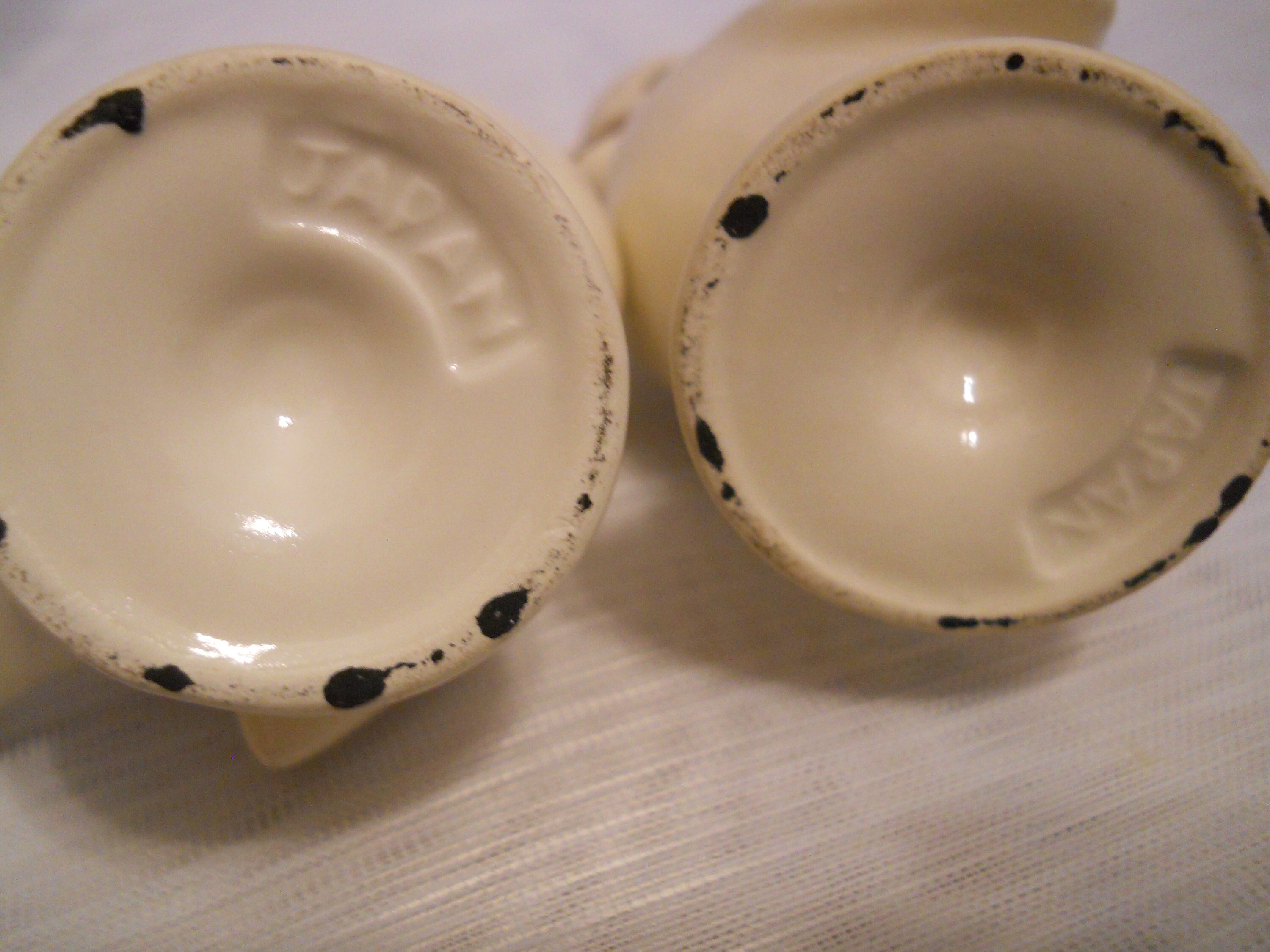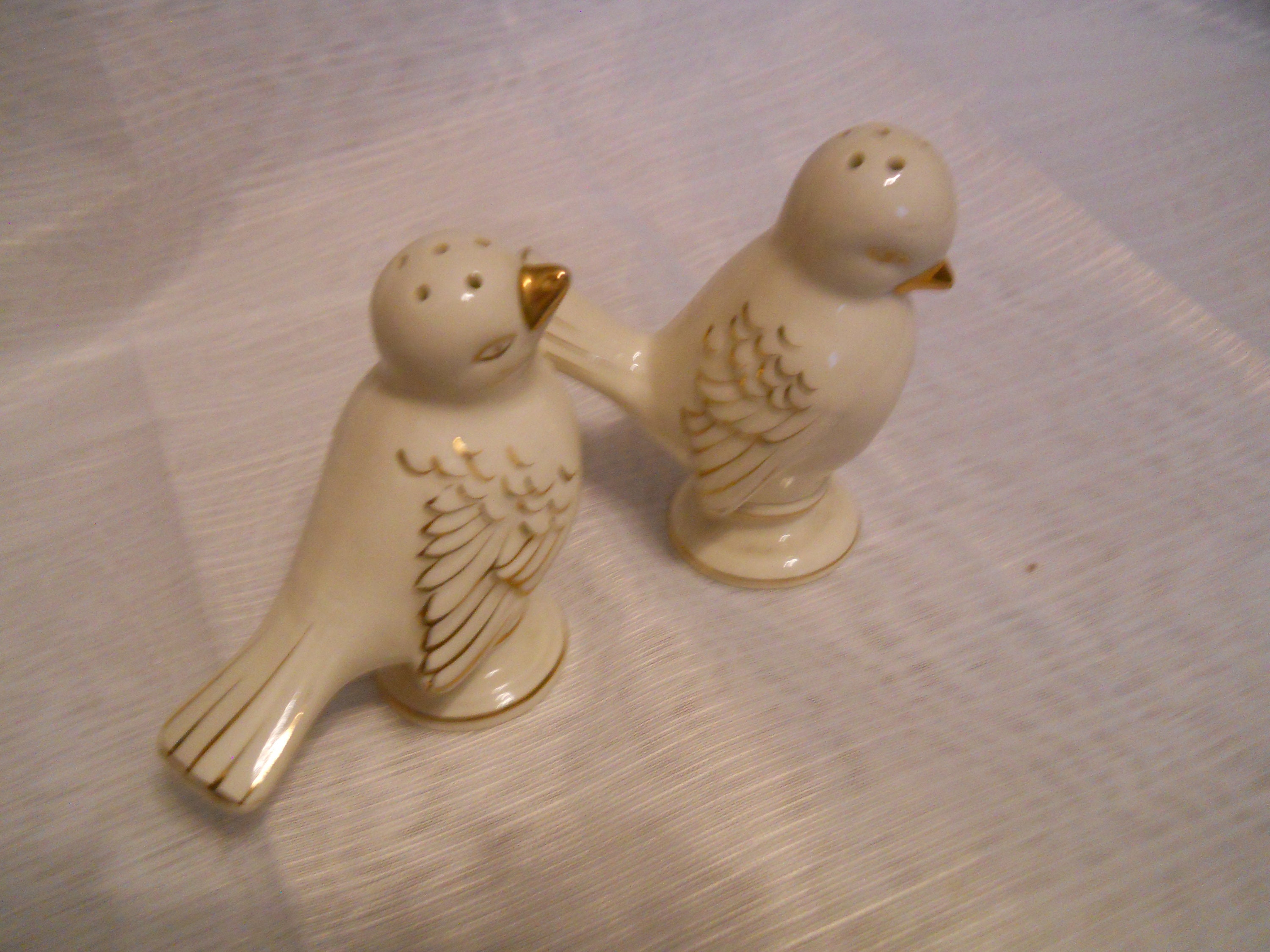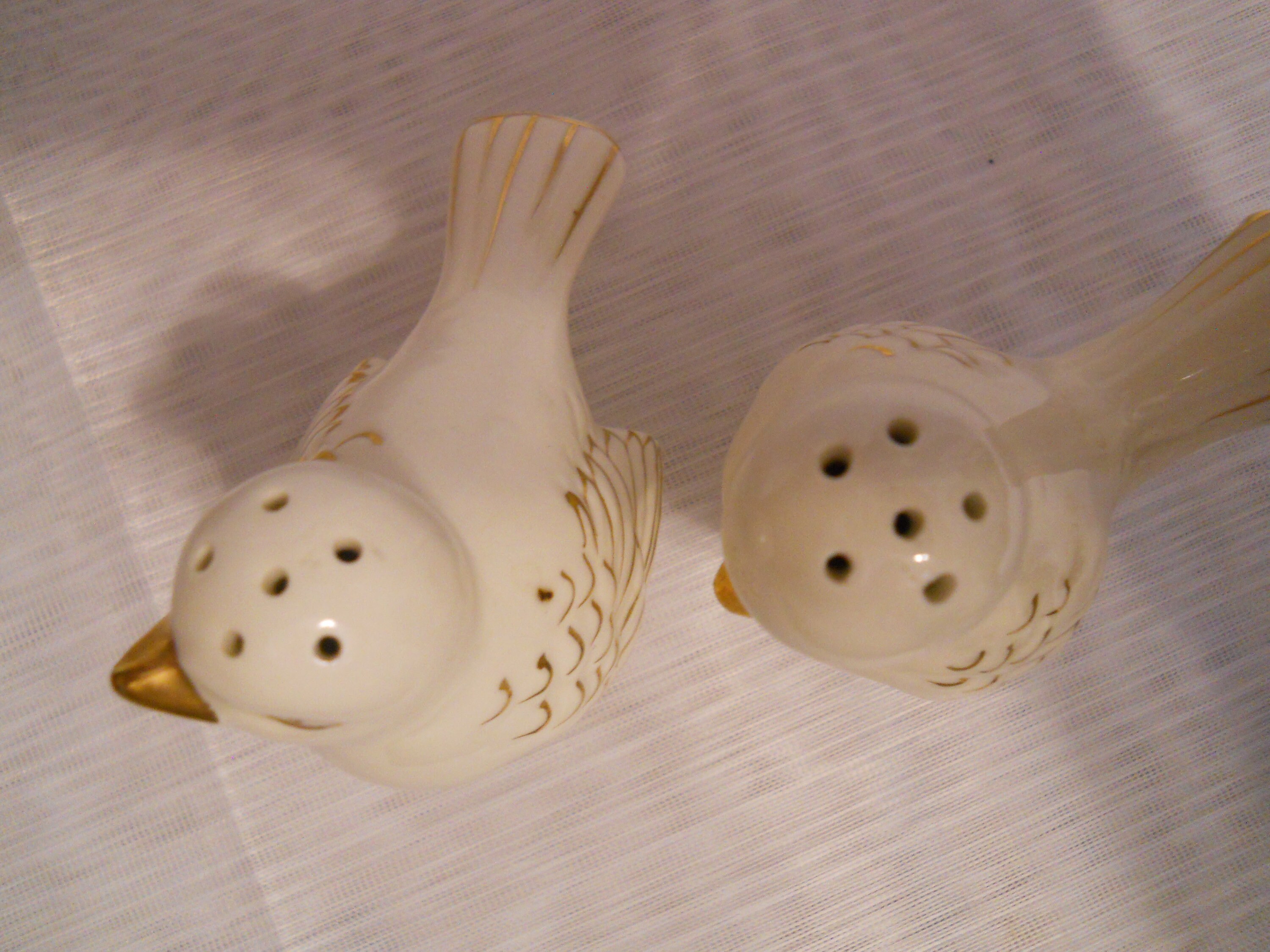 Both birds are china with 14K gold trim on the wings tail, beak and around the base. This set is unique as the bottom unscrews for filling (see photos). Each bird is 3 1/2 inches tall and marked Japan on the bottom.