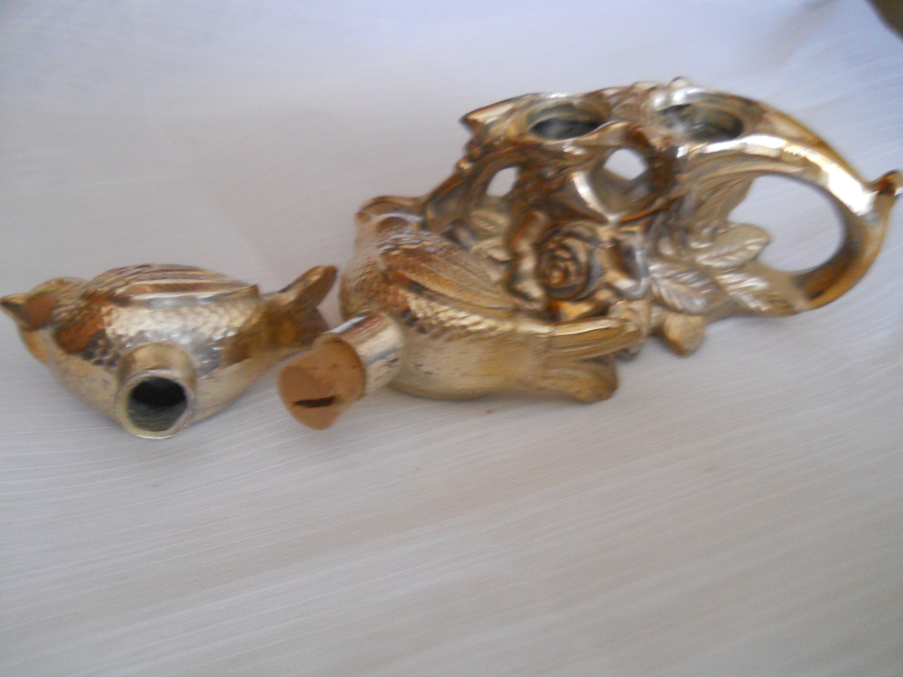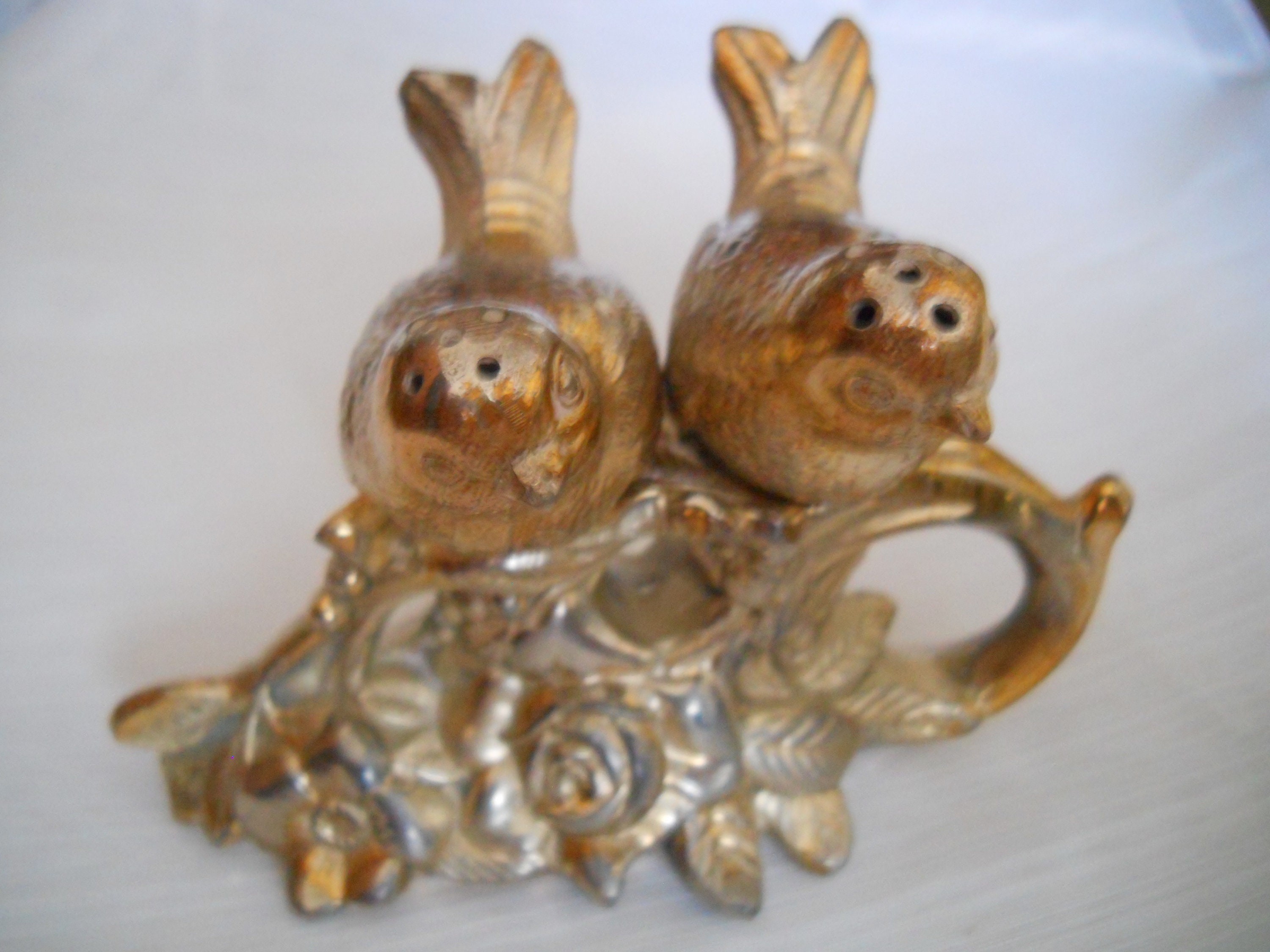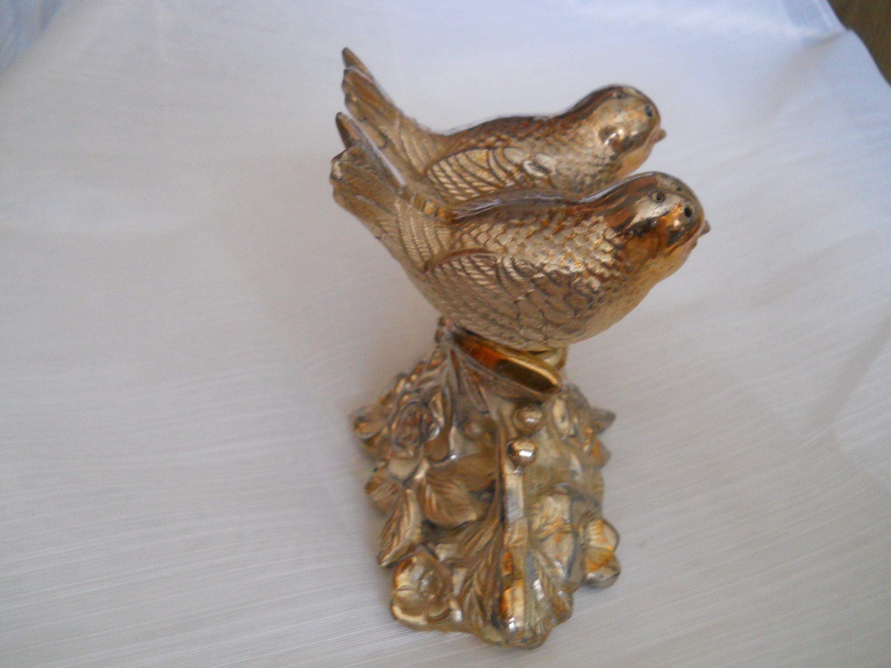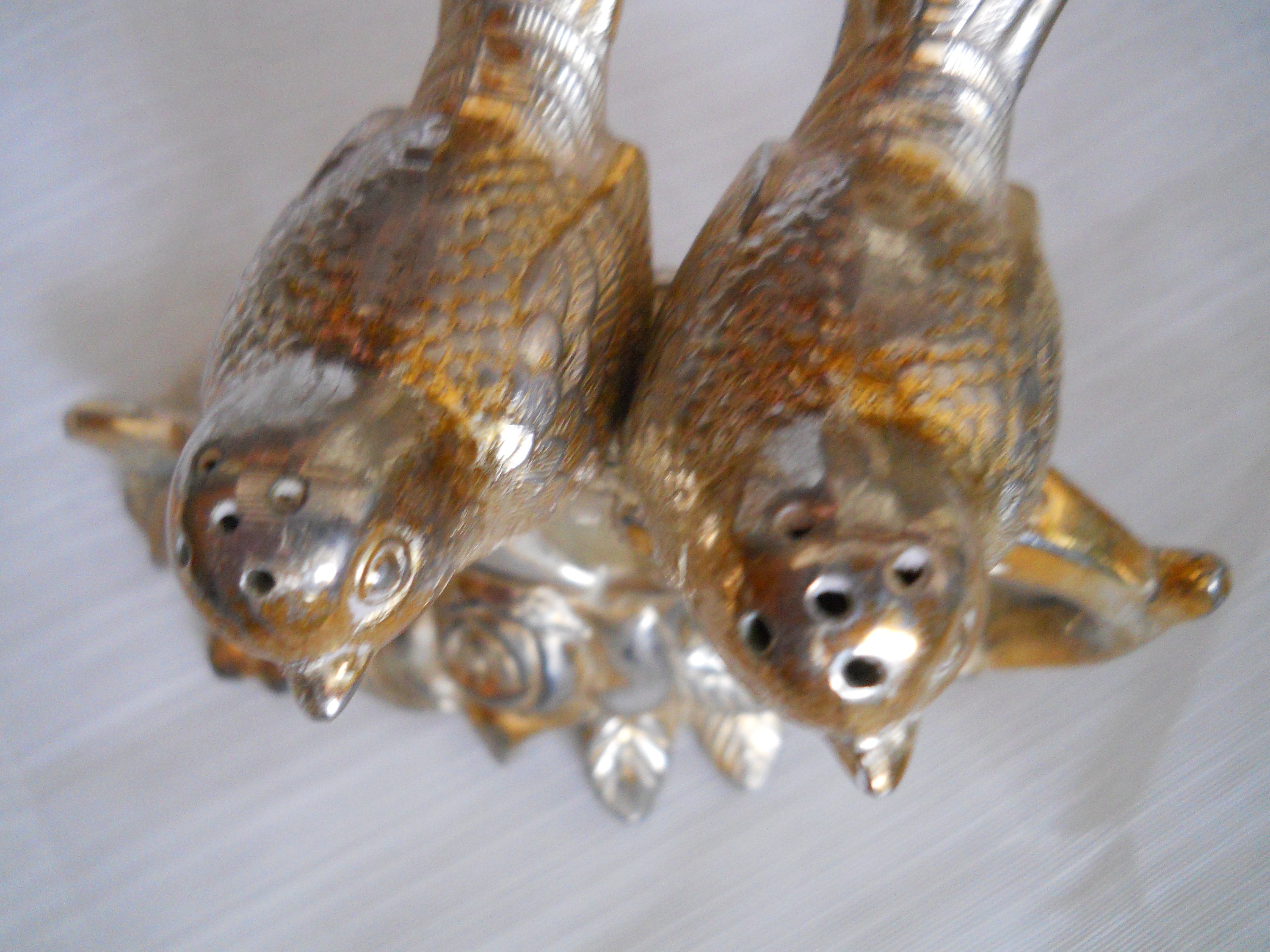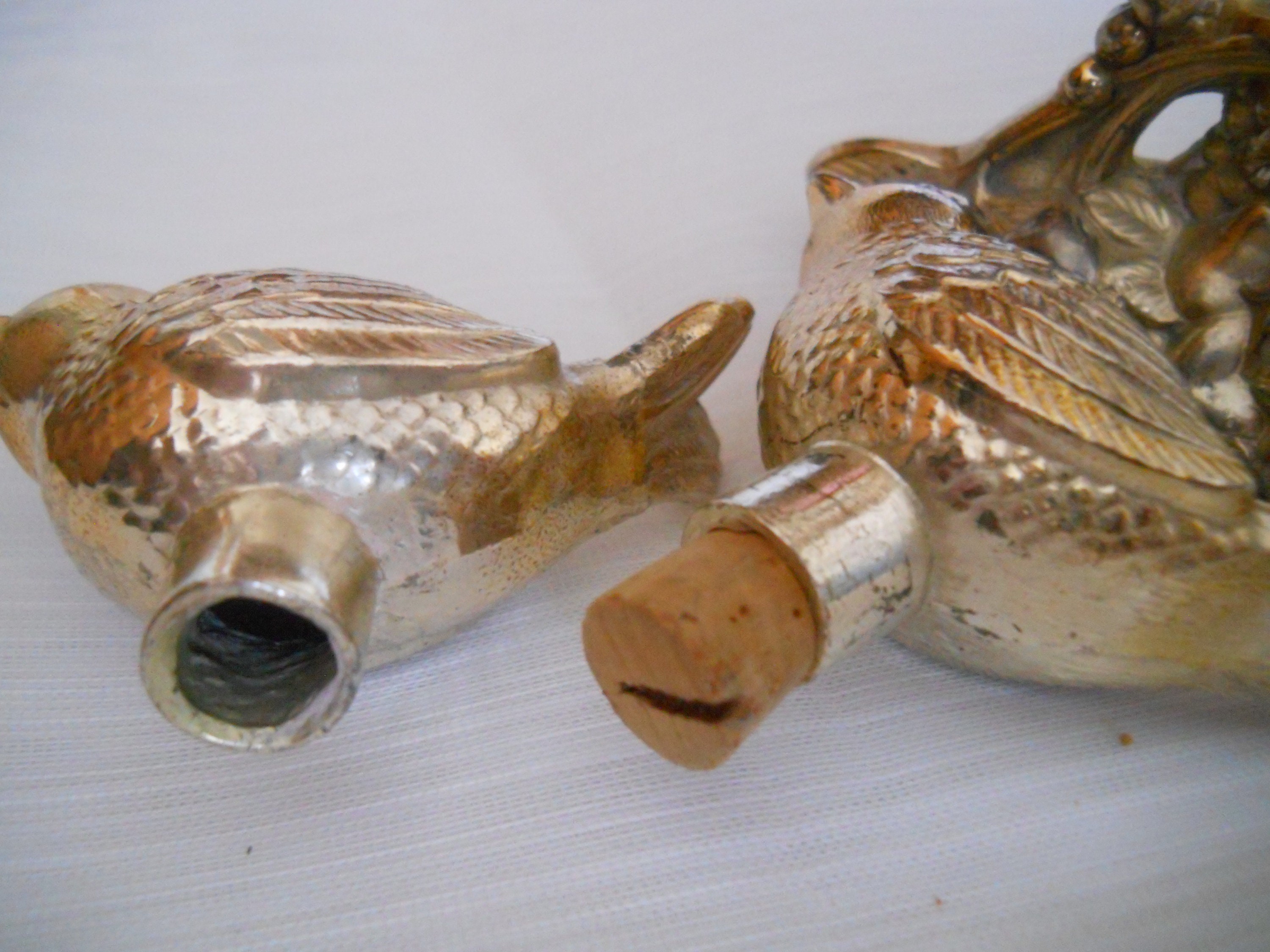 The birds are nestled in branch of a tree. Each bird is 2 1/2 inches long and they both have cork stoppers. The branch of the tree is 4 inches long and 2 inches tall, making the overall height at 3 inches. The birds are not marked but the branch is marked "made in Japan".