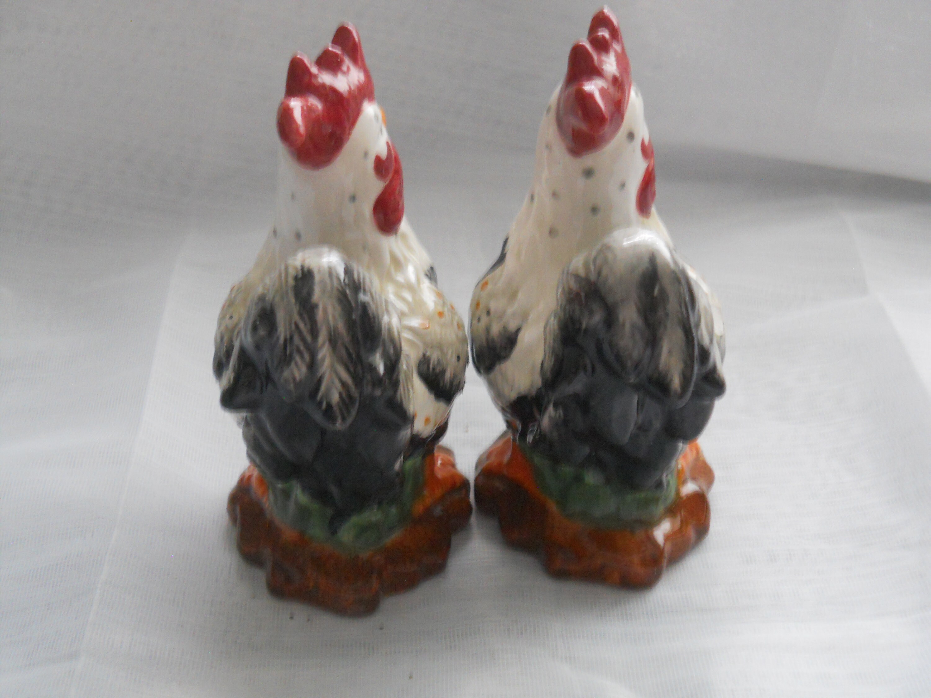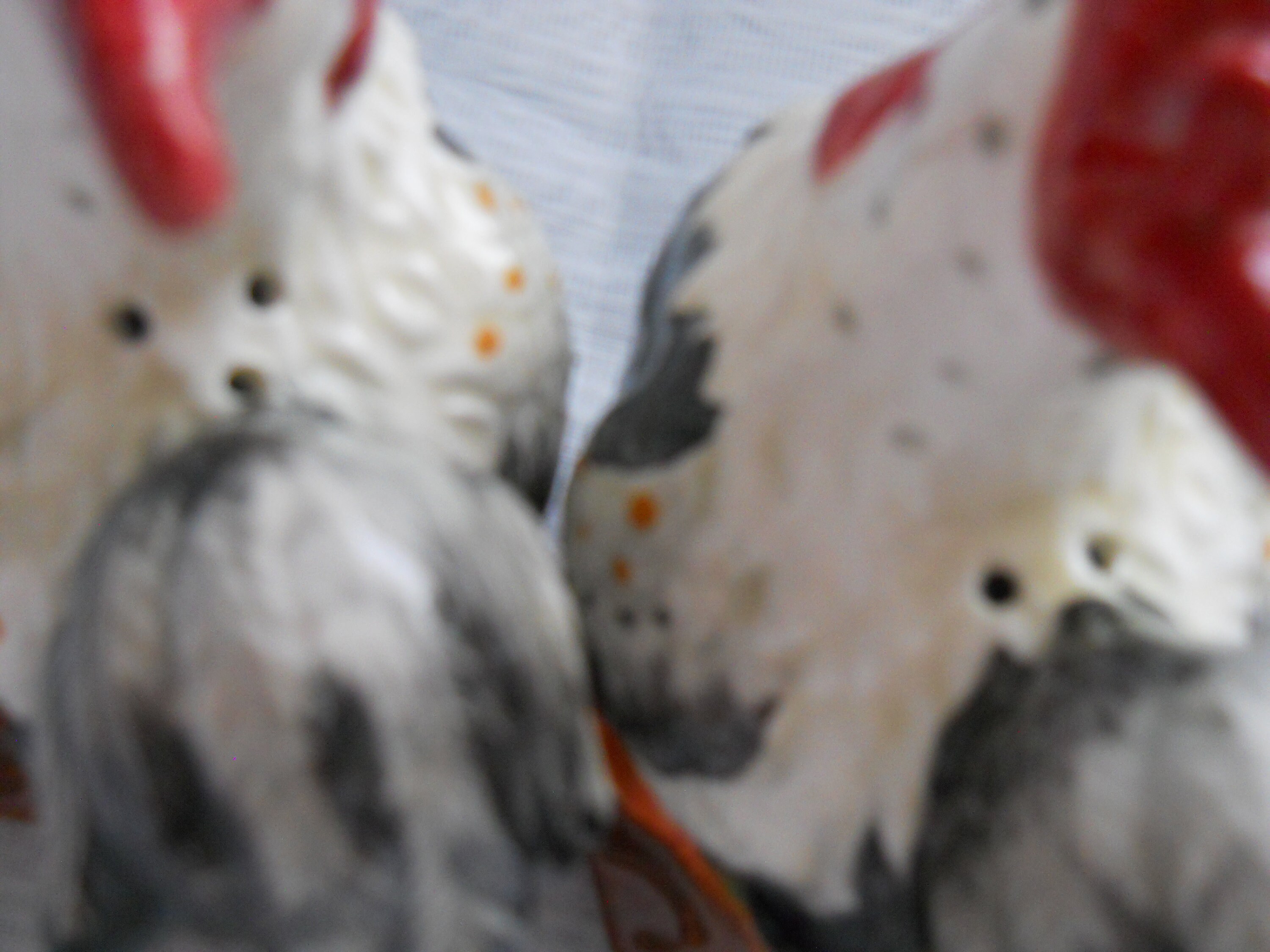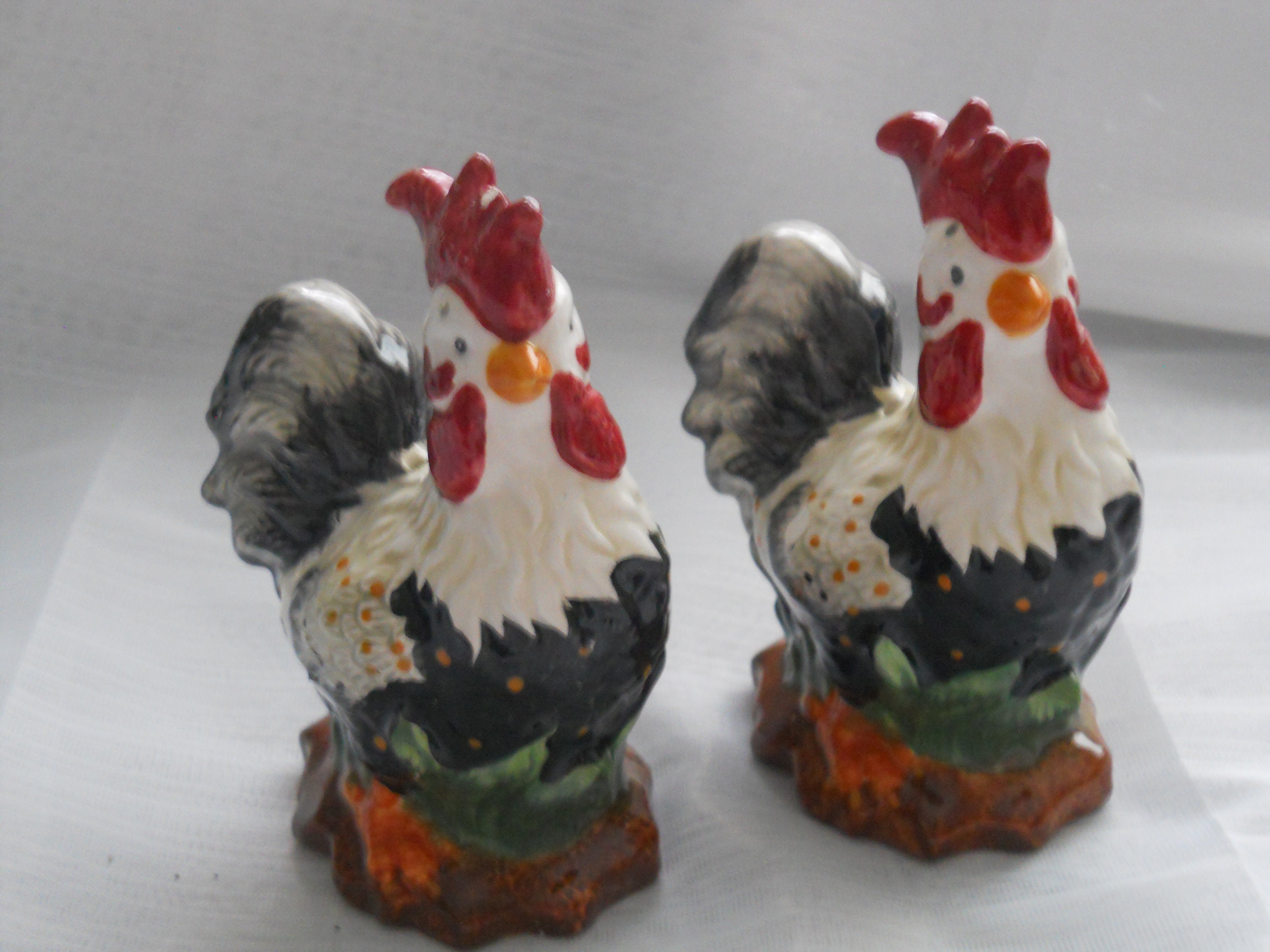 Both chickens are very colorful with red combs and waddles, black and gray tail feathers, white body with black breast and brown feet. The body also has yellow dots throughout. There is a small chip on the top of the comb of one of the chickens.