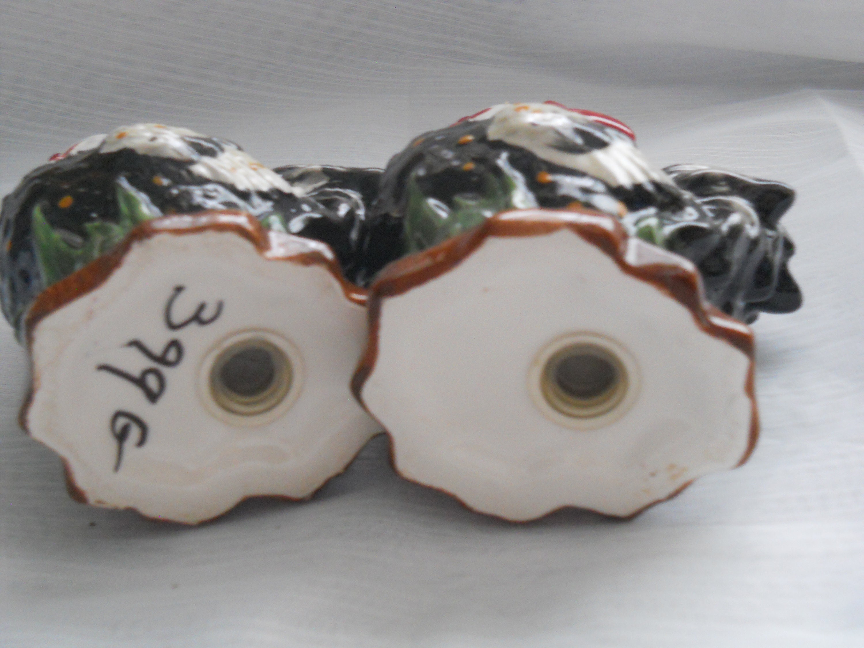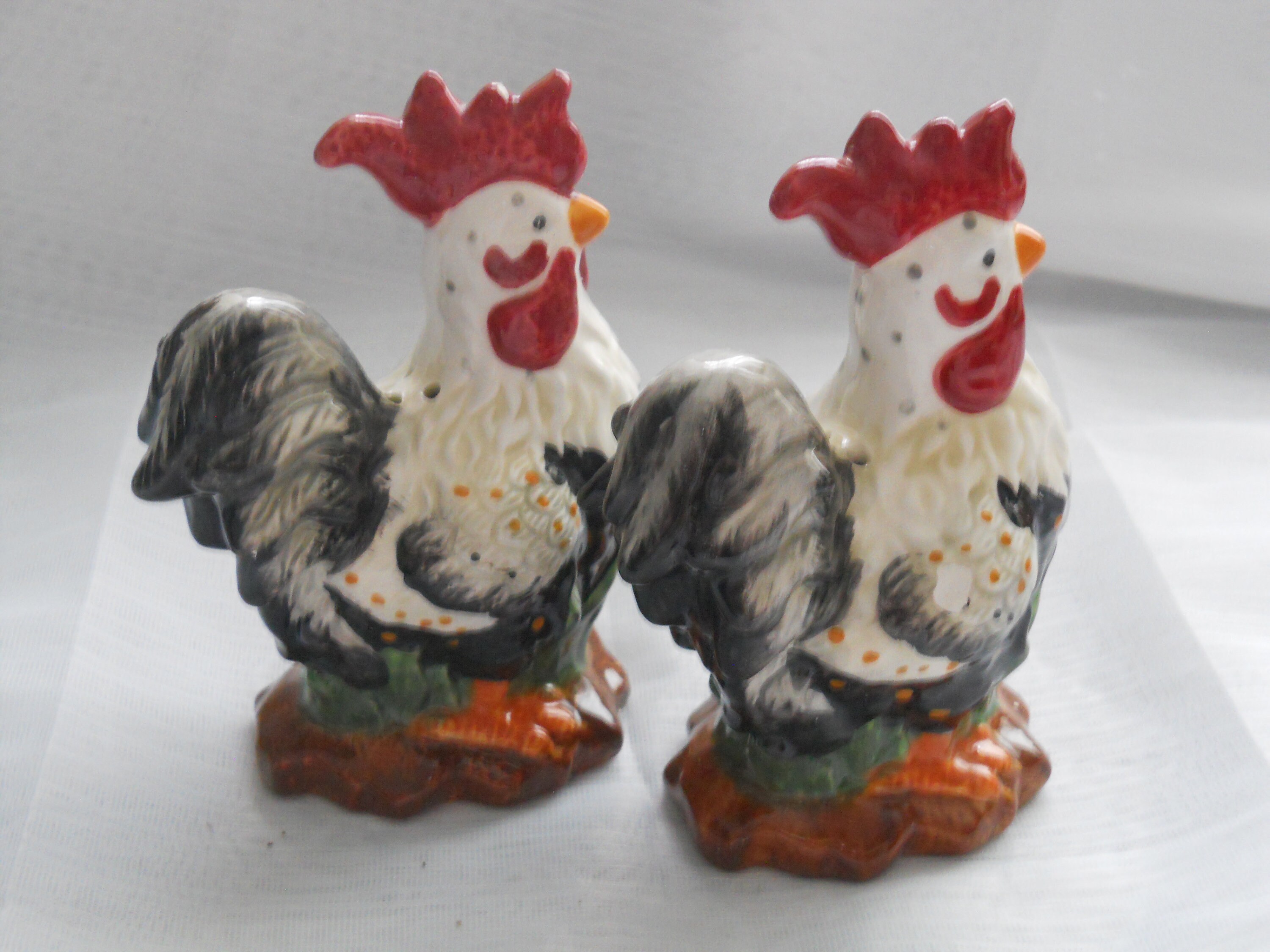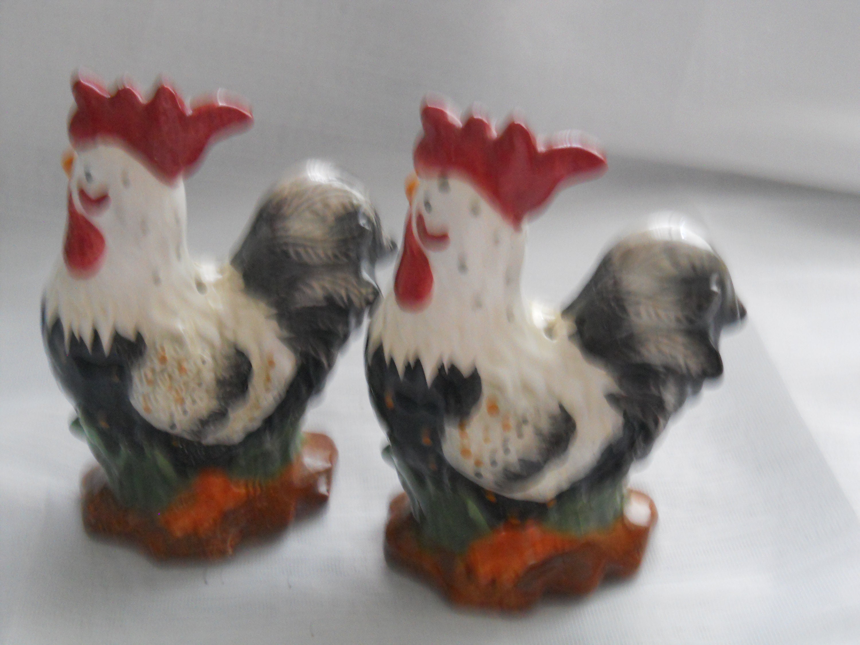 Both chickens are very colorful with red combs and waddles, black and gray tail feathers, white body with black breast and brown feet. The body also has yellow dots throughout. There is a small chip on the top of the comb of one of the chickens.