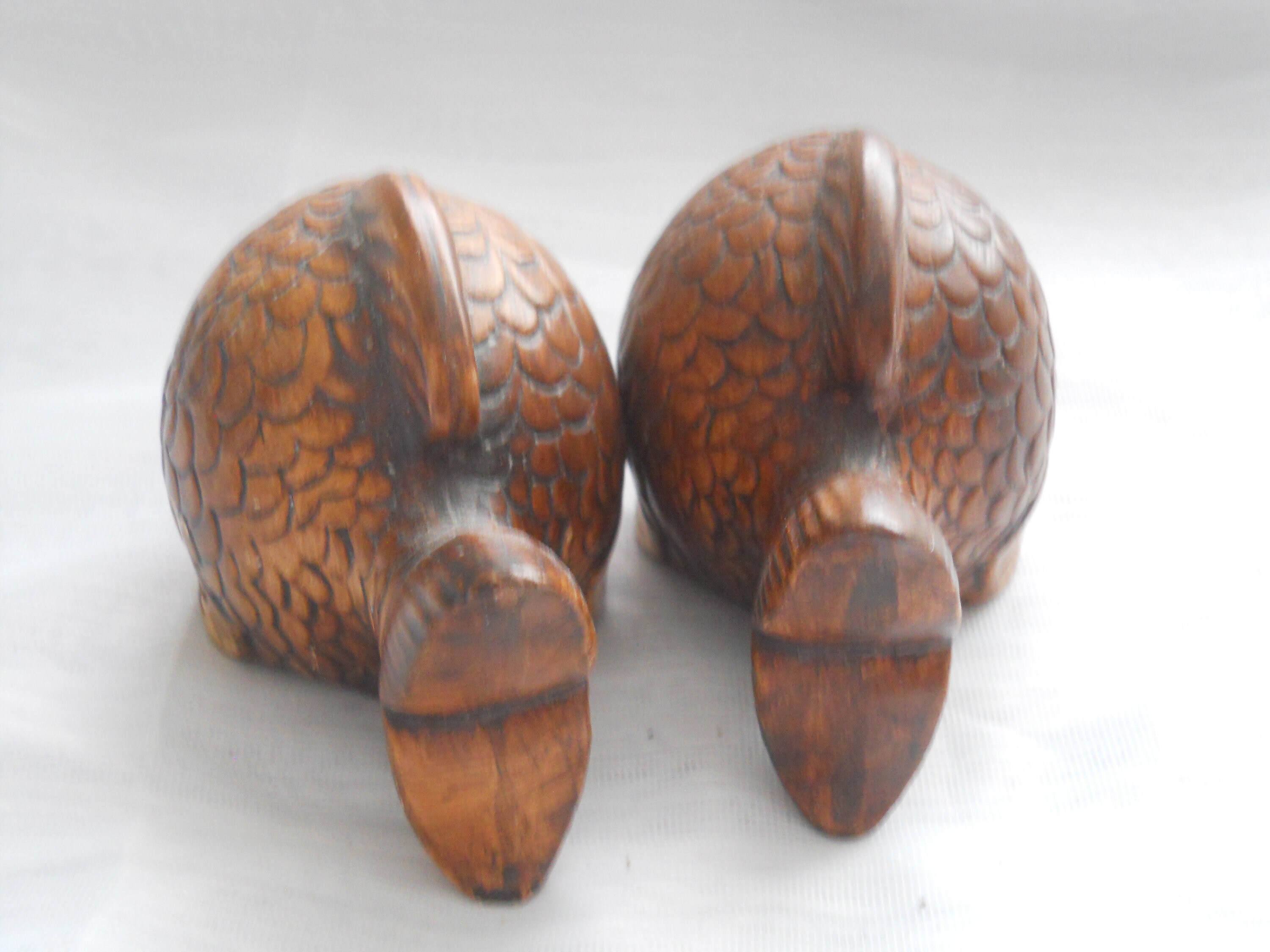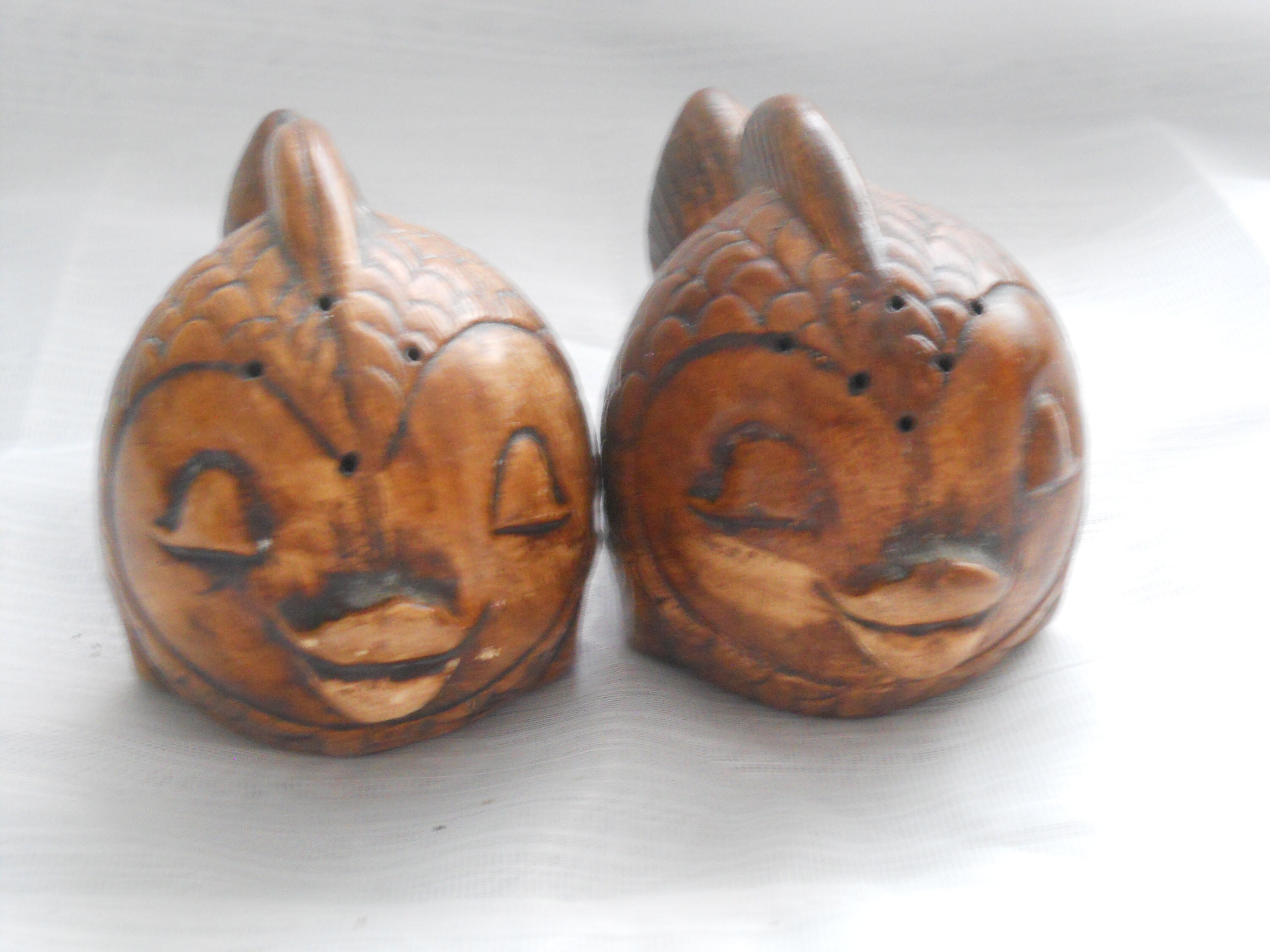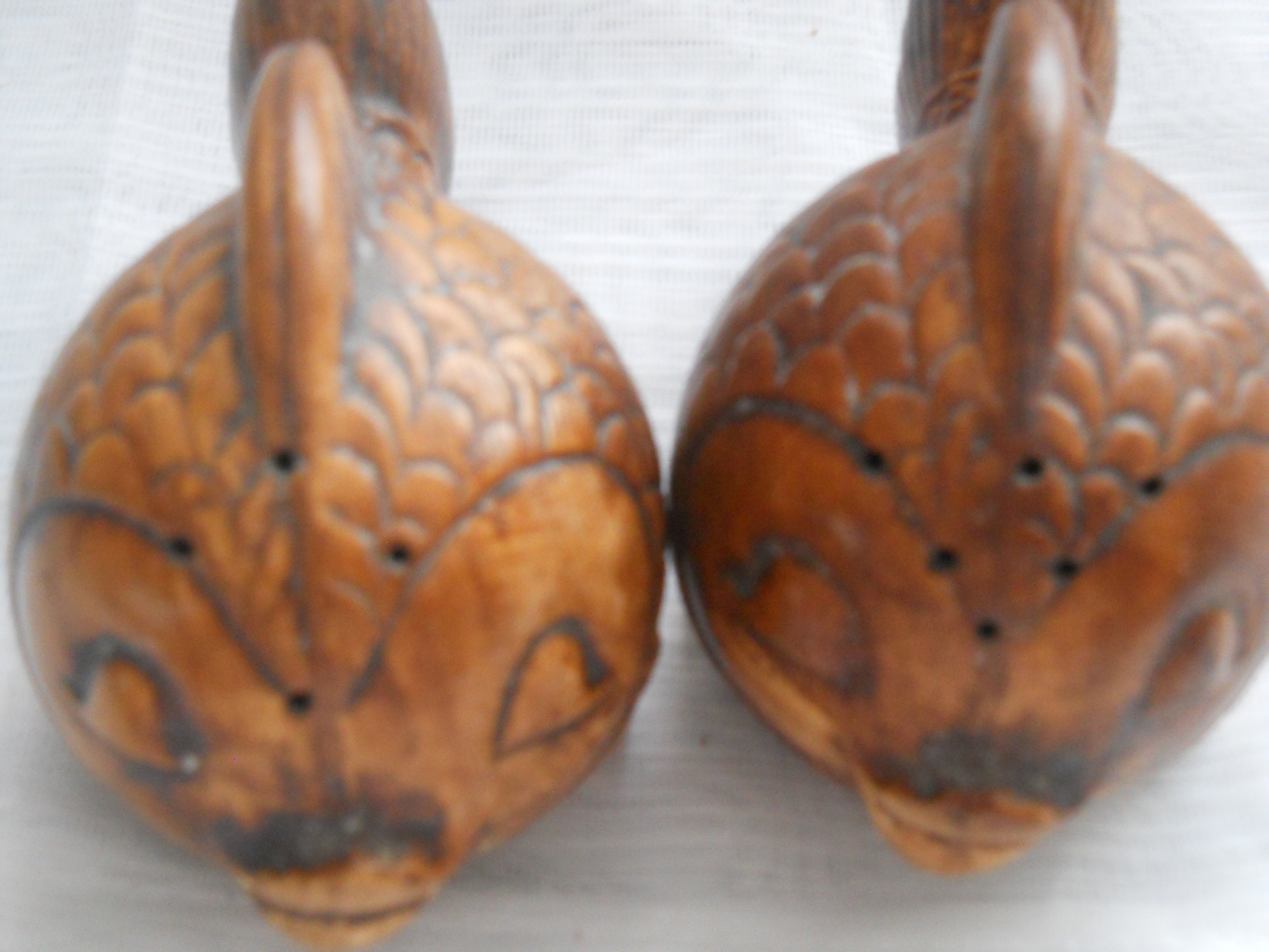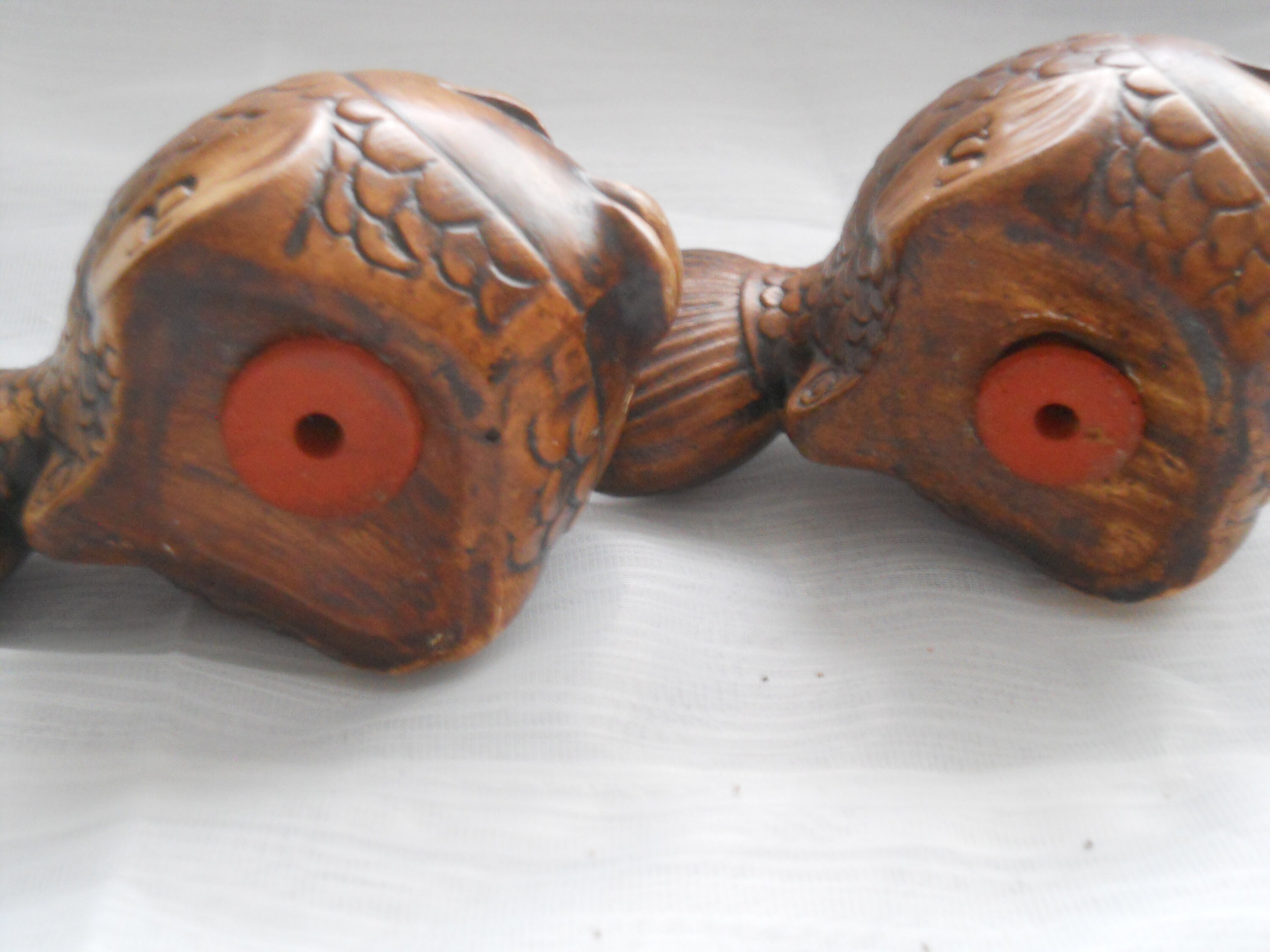 Both Fish are brown with the "P" and "S" on the bottom of each fish. There is a few minor paint imperfections, but no cracks. Both fish are 3 inches tall and 4 inches long. They both have rubber stoppers. There is a small marking on the side of each of the fish "T.C.".