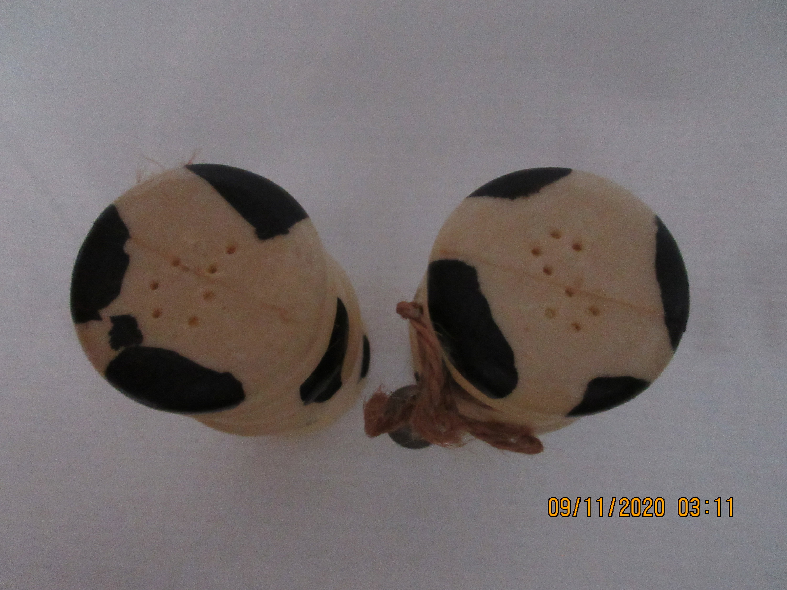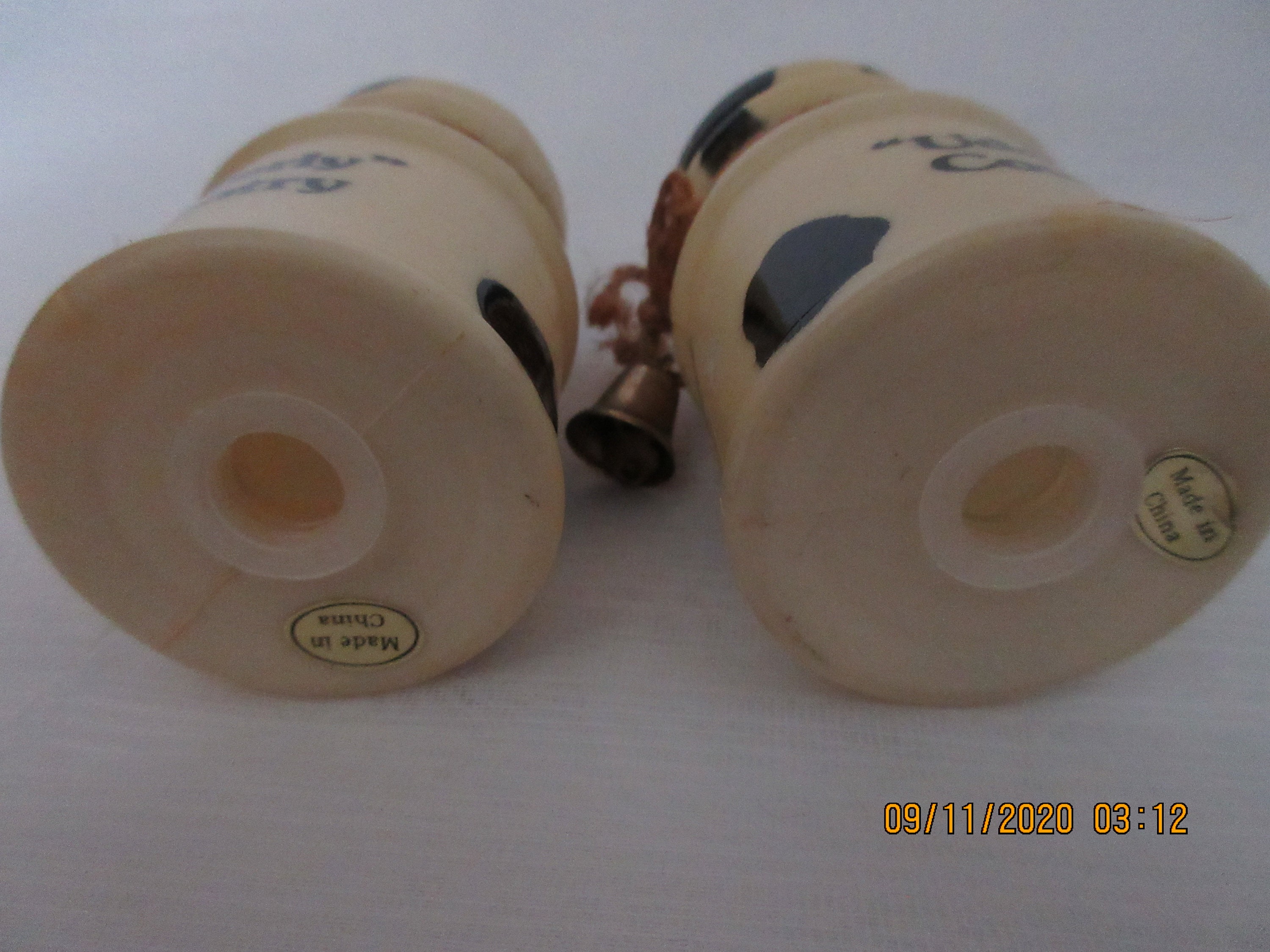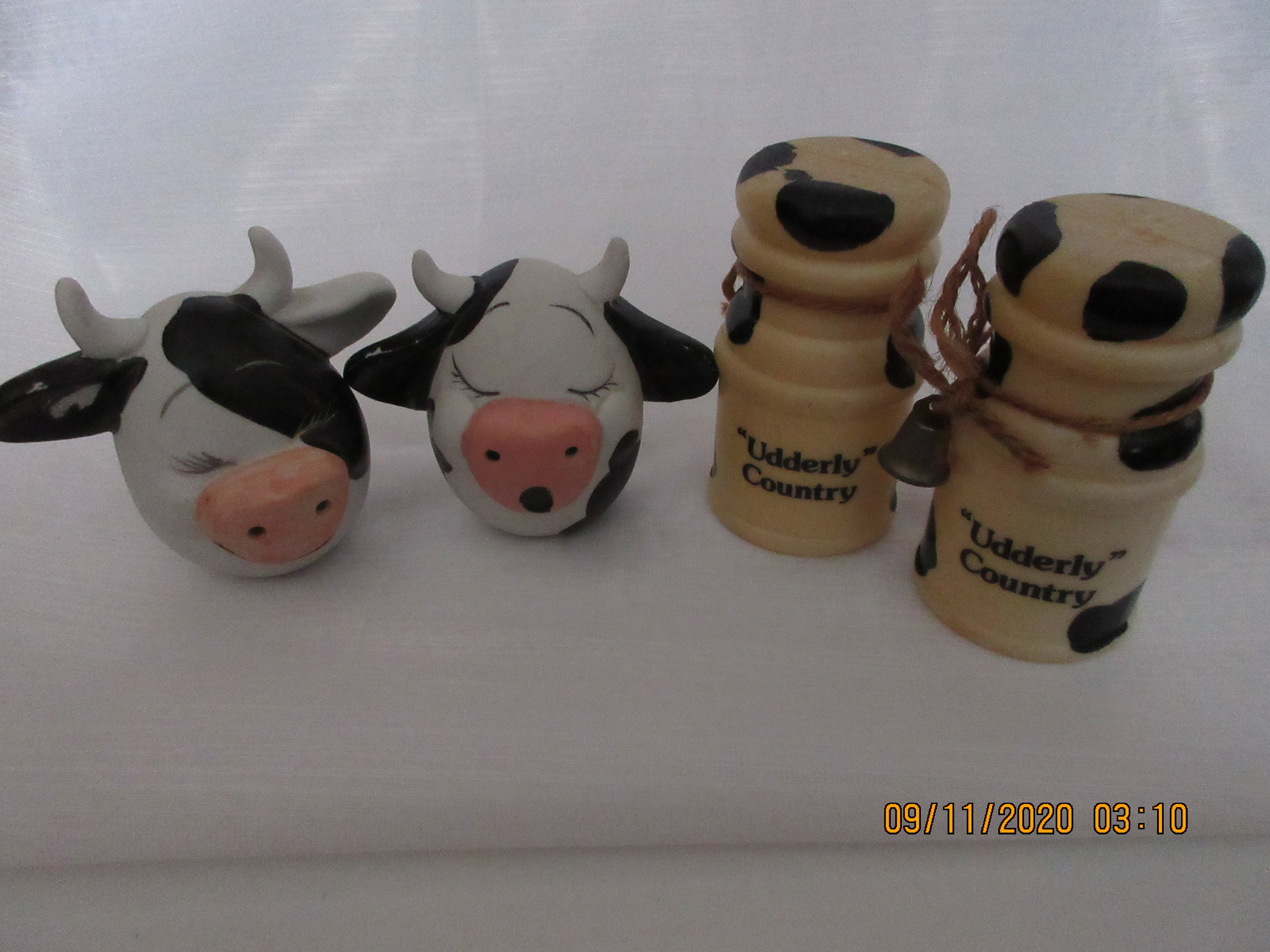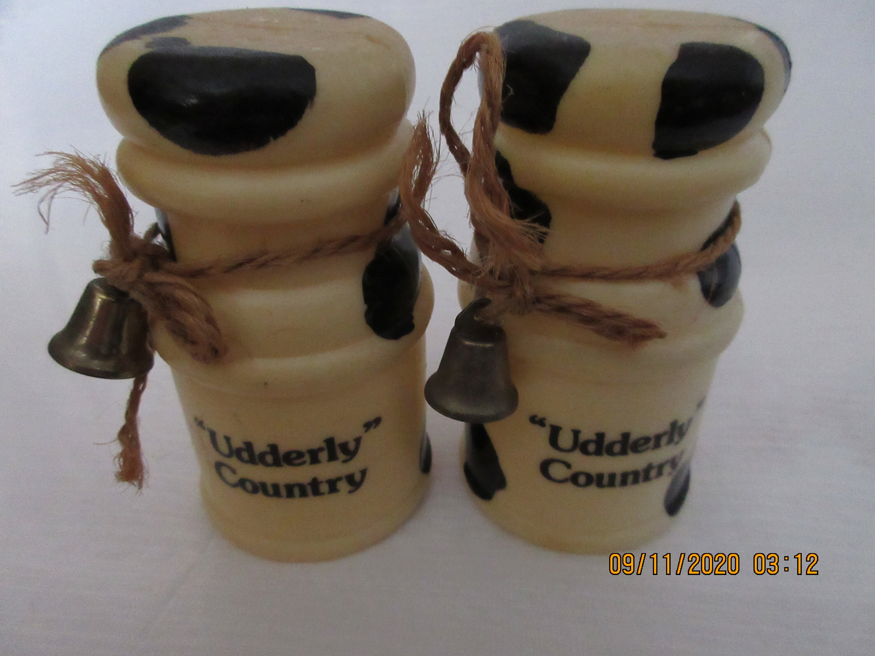 The other set is plastic. Each shaker has a thin rope liked tie around the top with a tiny bell. The front of the shakers has "Udderly Country". The shakers are 3 1/4 inches tall, have plastic stoppers and gold labels "Made in China".