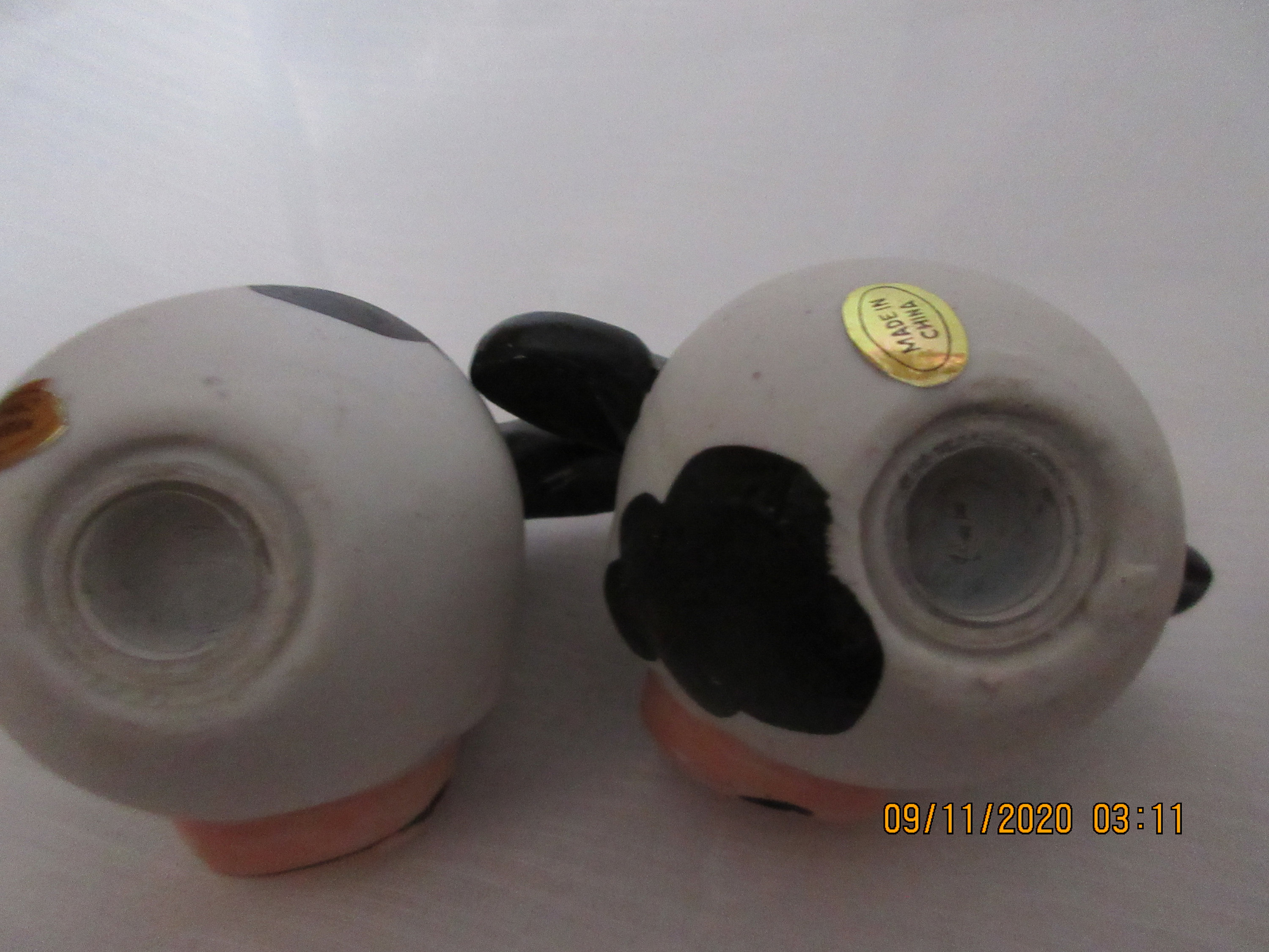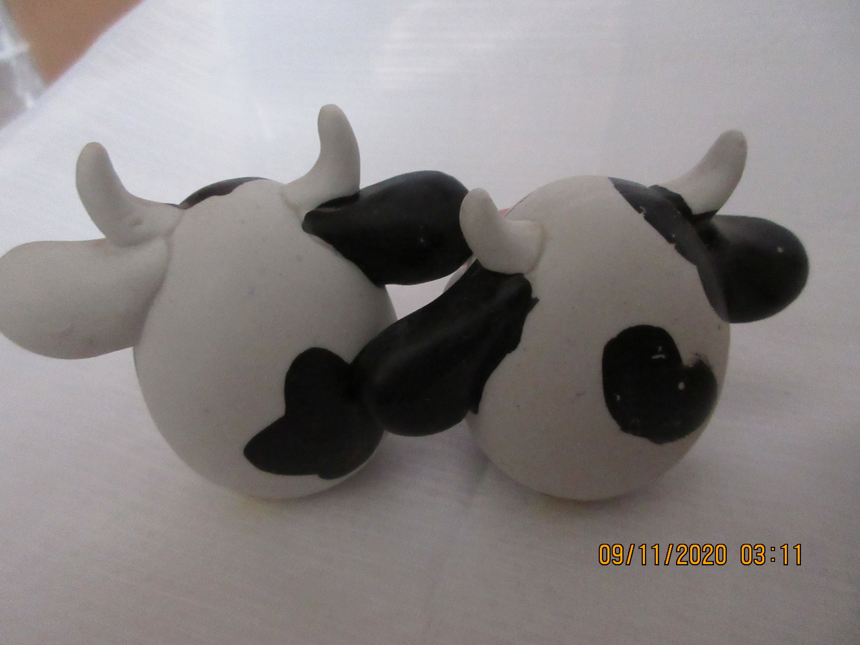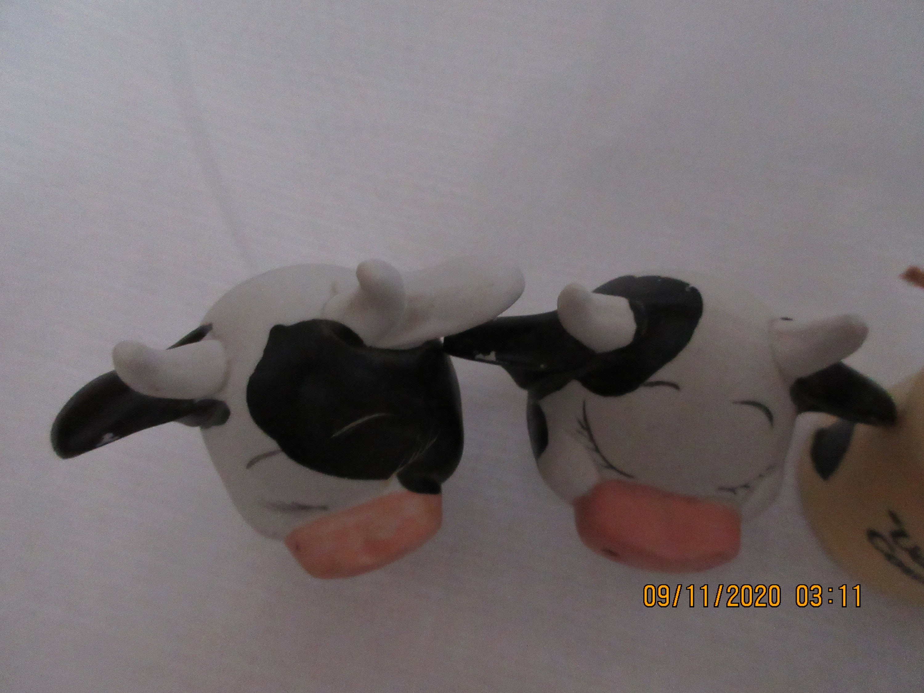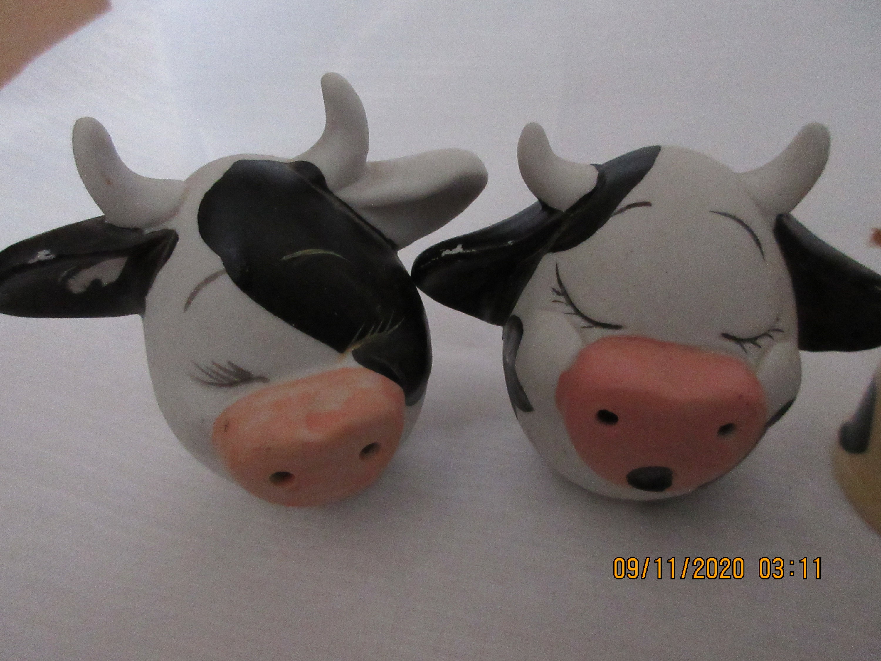 The cows are white and black with white horns and pink snout and black mouth. Their eyes are closed and painted with long lashes. Each shaker is 3 inches tall, has a plastic stopper and marked with gold label "Made in China".