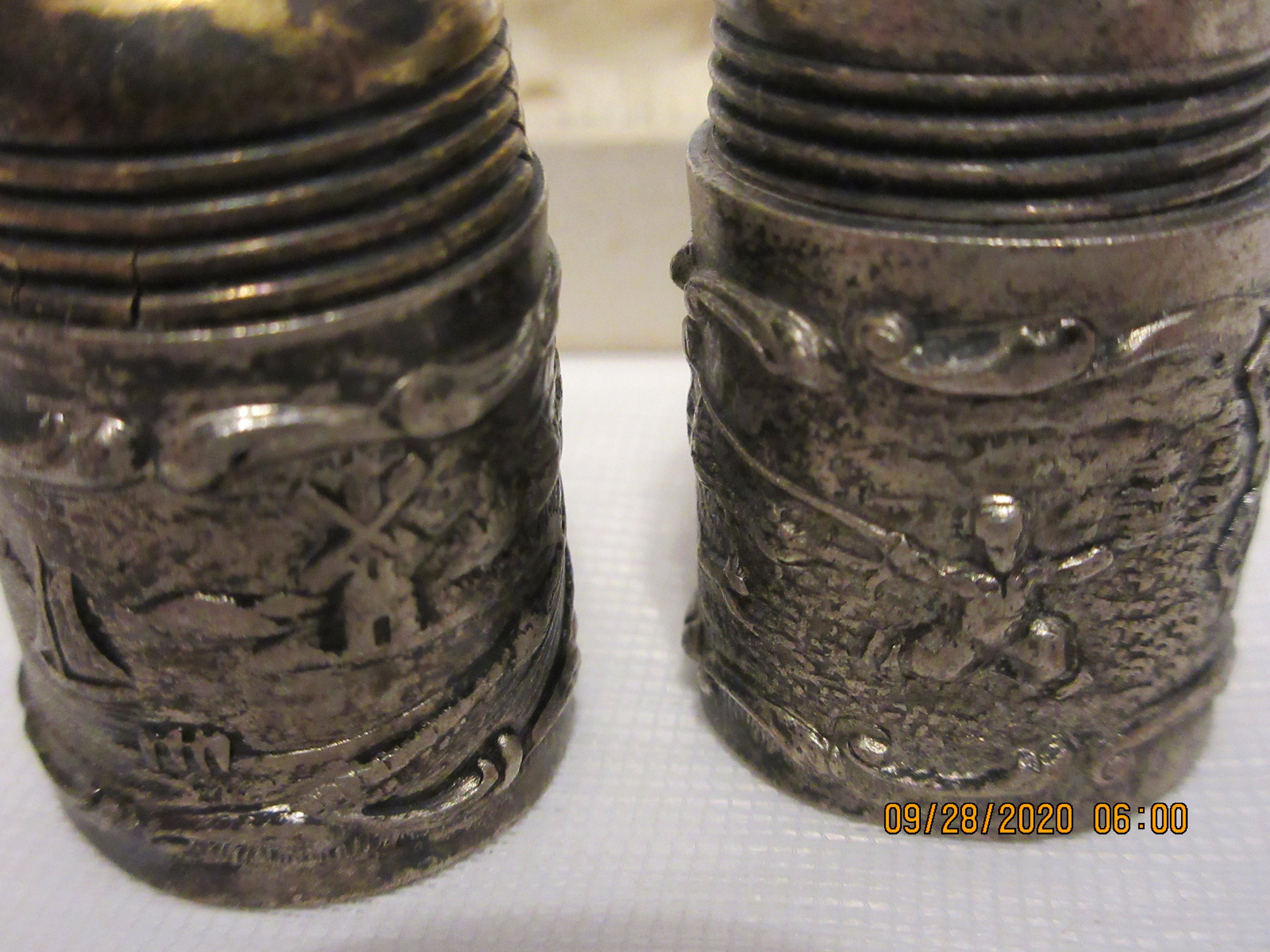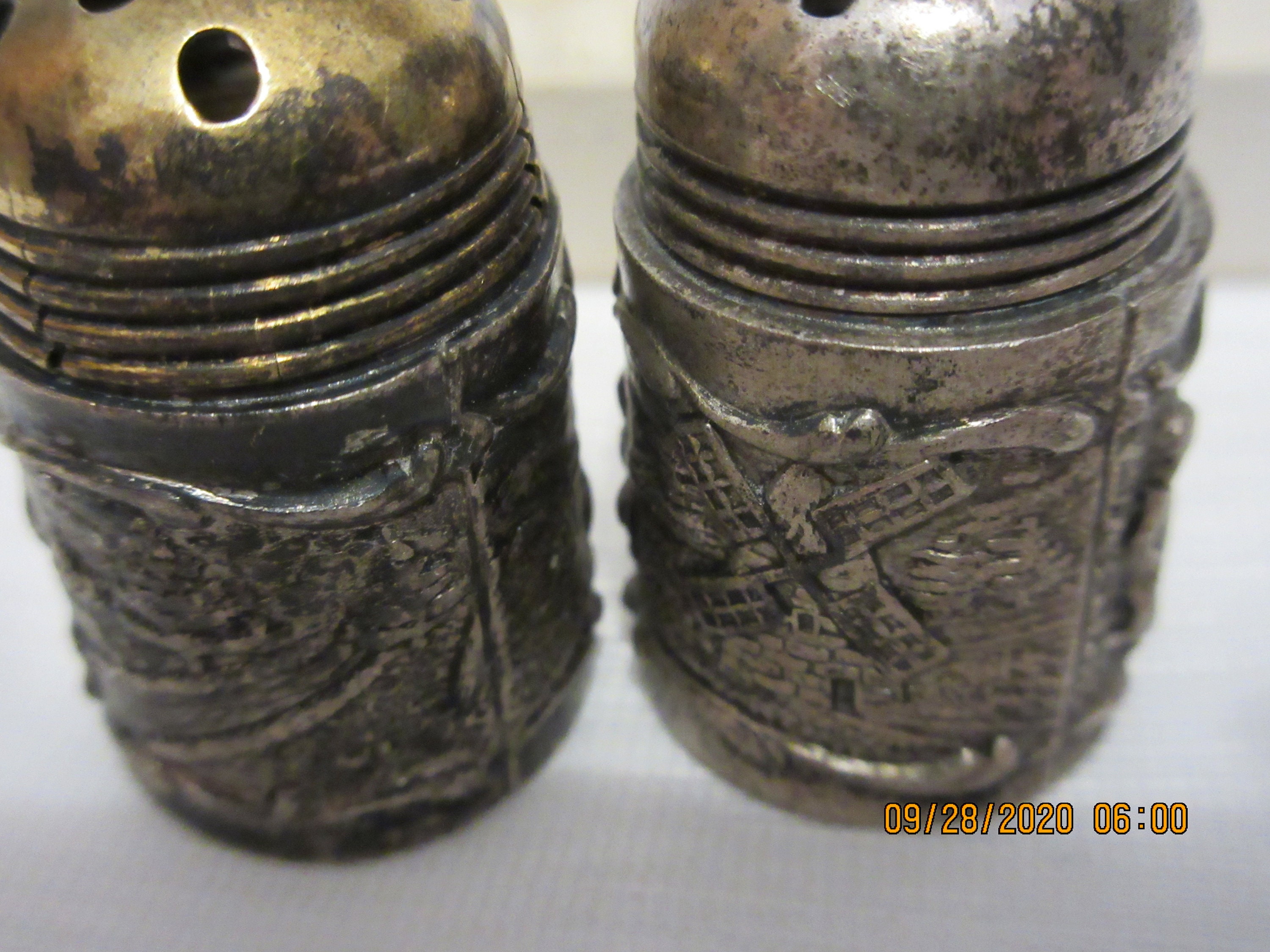 Both shakers have scenes of a windmill and boats. Each is a little different from the other. Both shakers are filled by unscrewing the tops of the shakers. Each shaker is 1 1/2 inches tall and no markings.