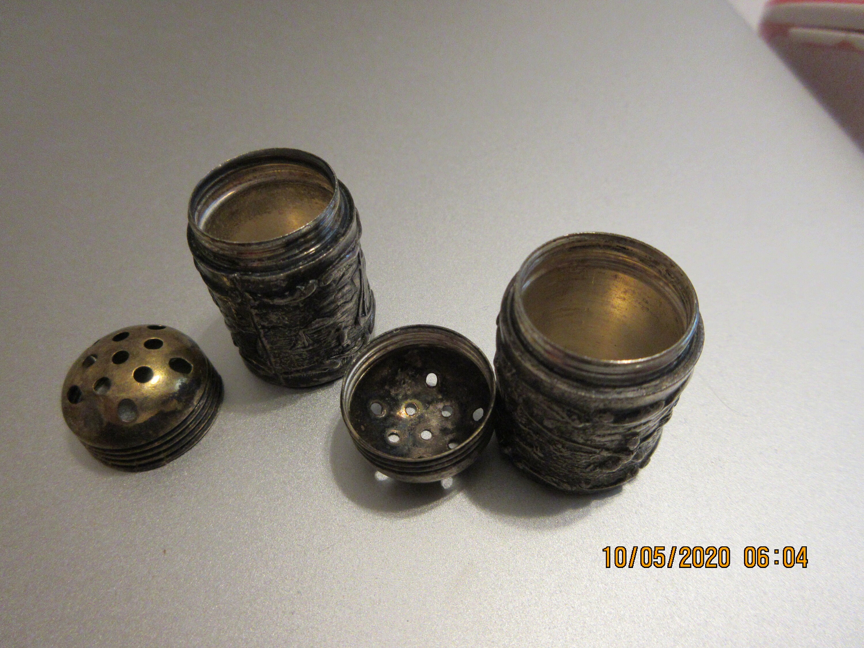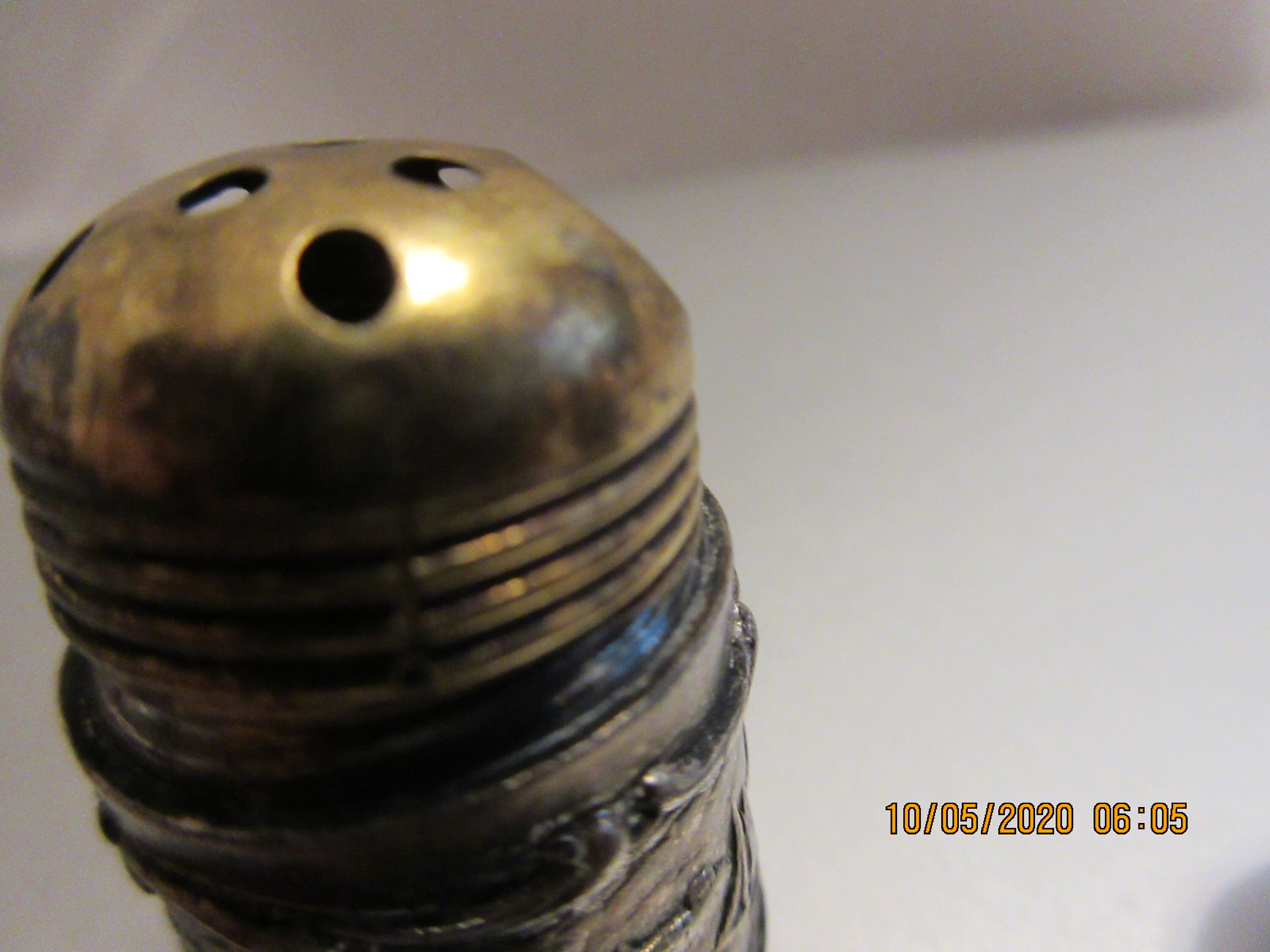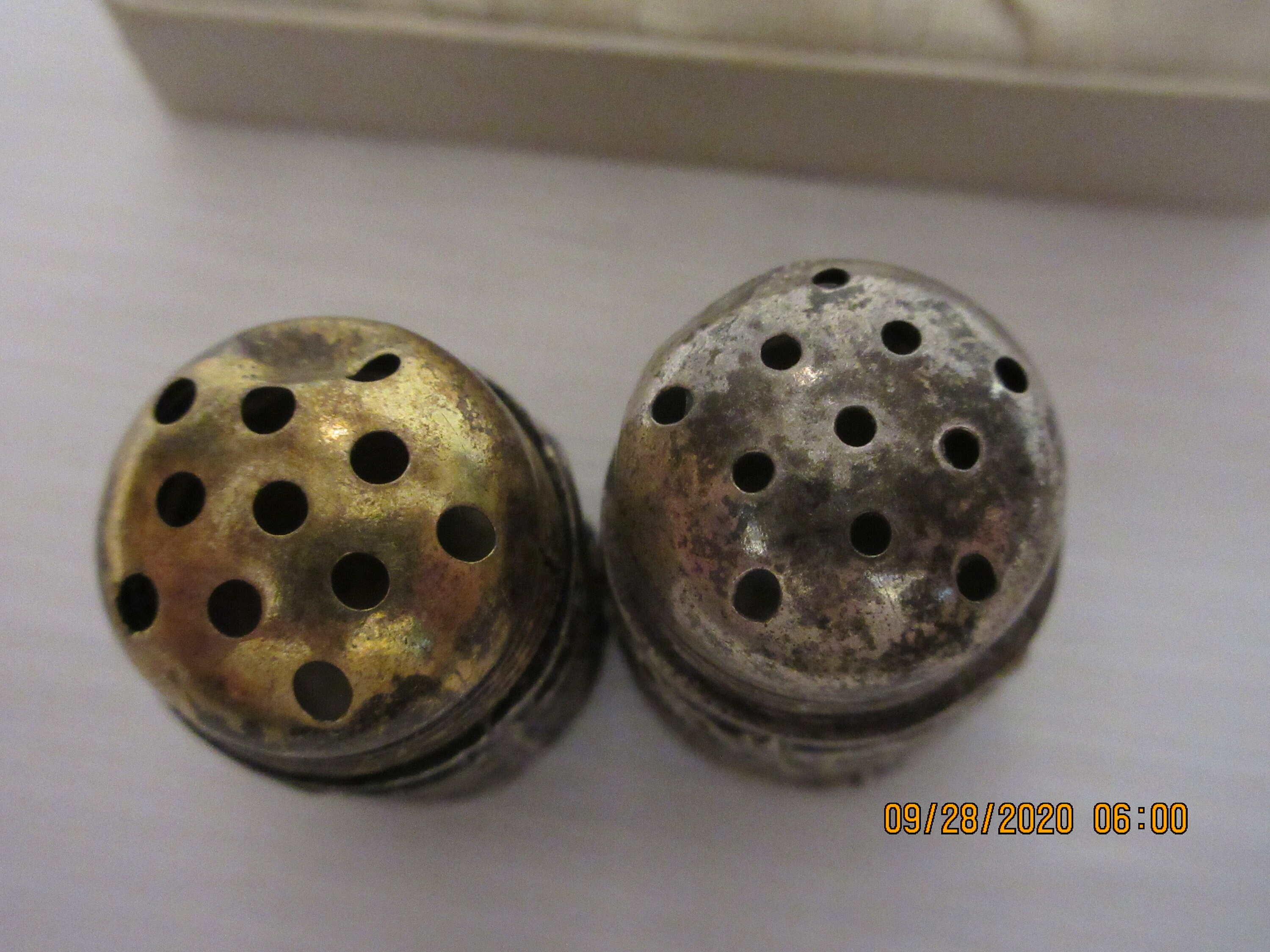 1219 - These shakers are used and in fair condition. There are two cracks on the lid of the gold lid (see photos).